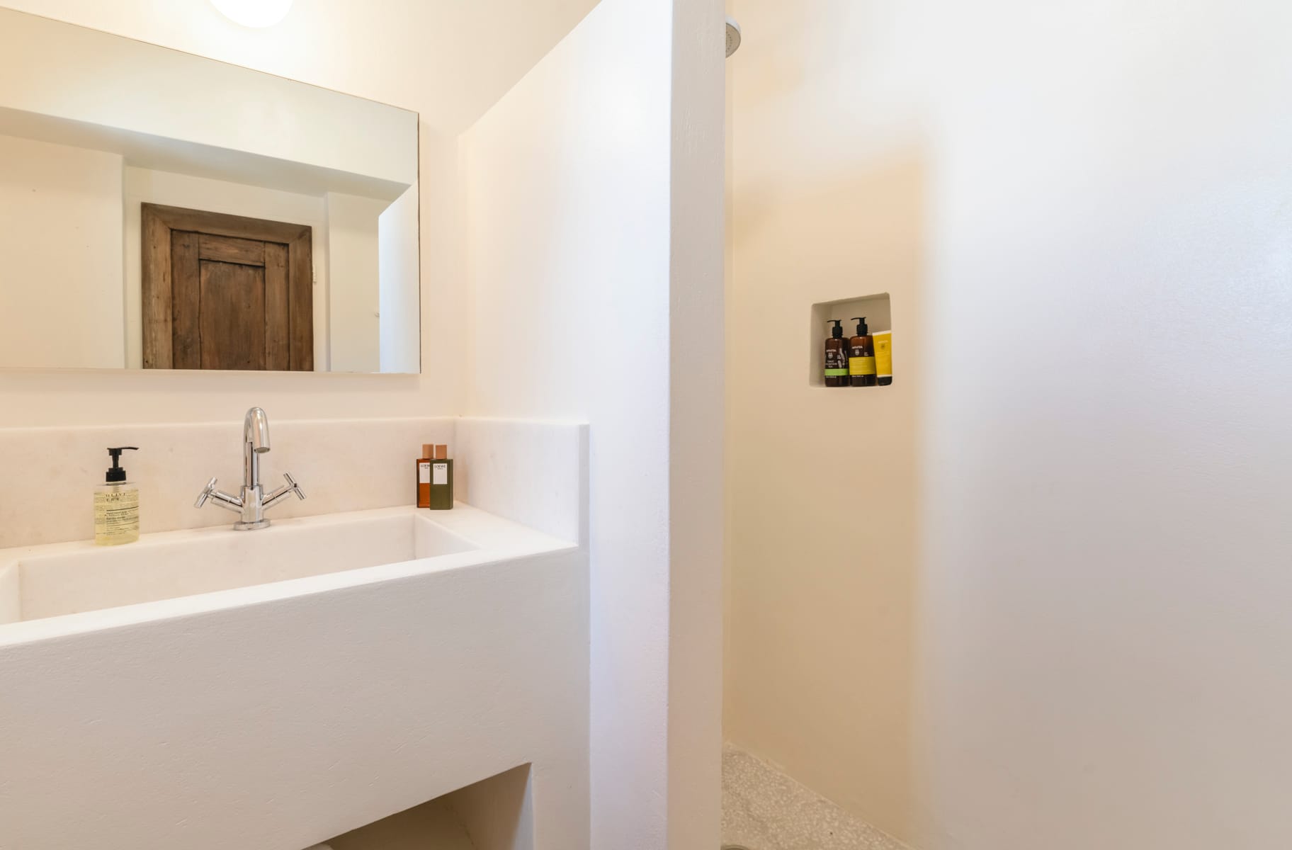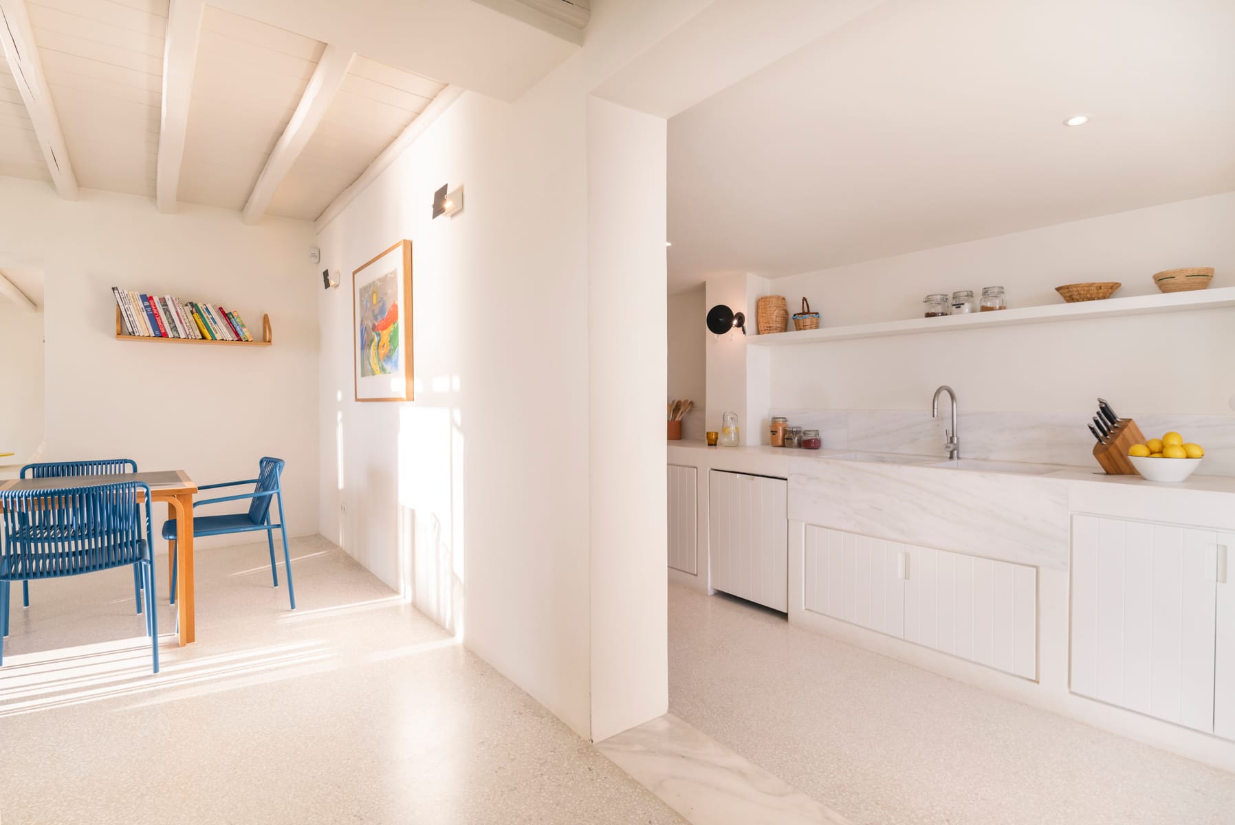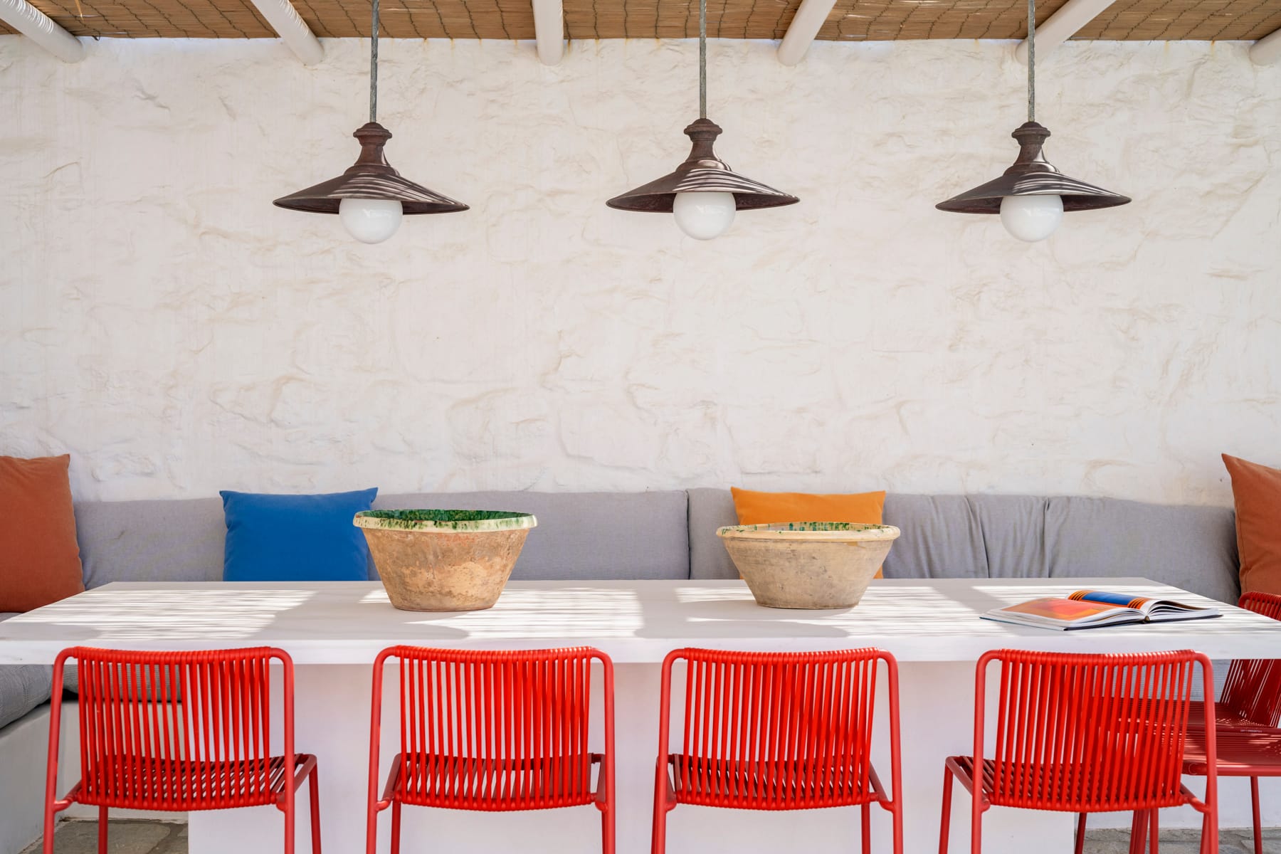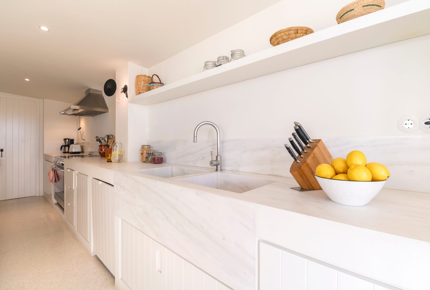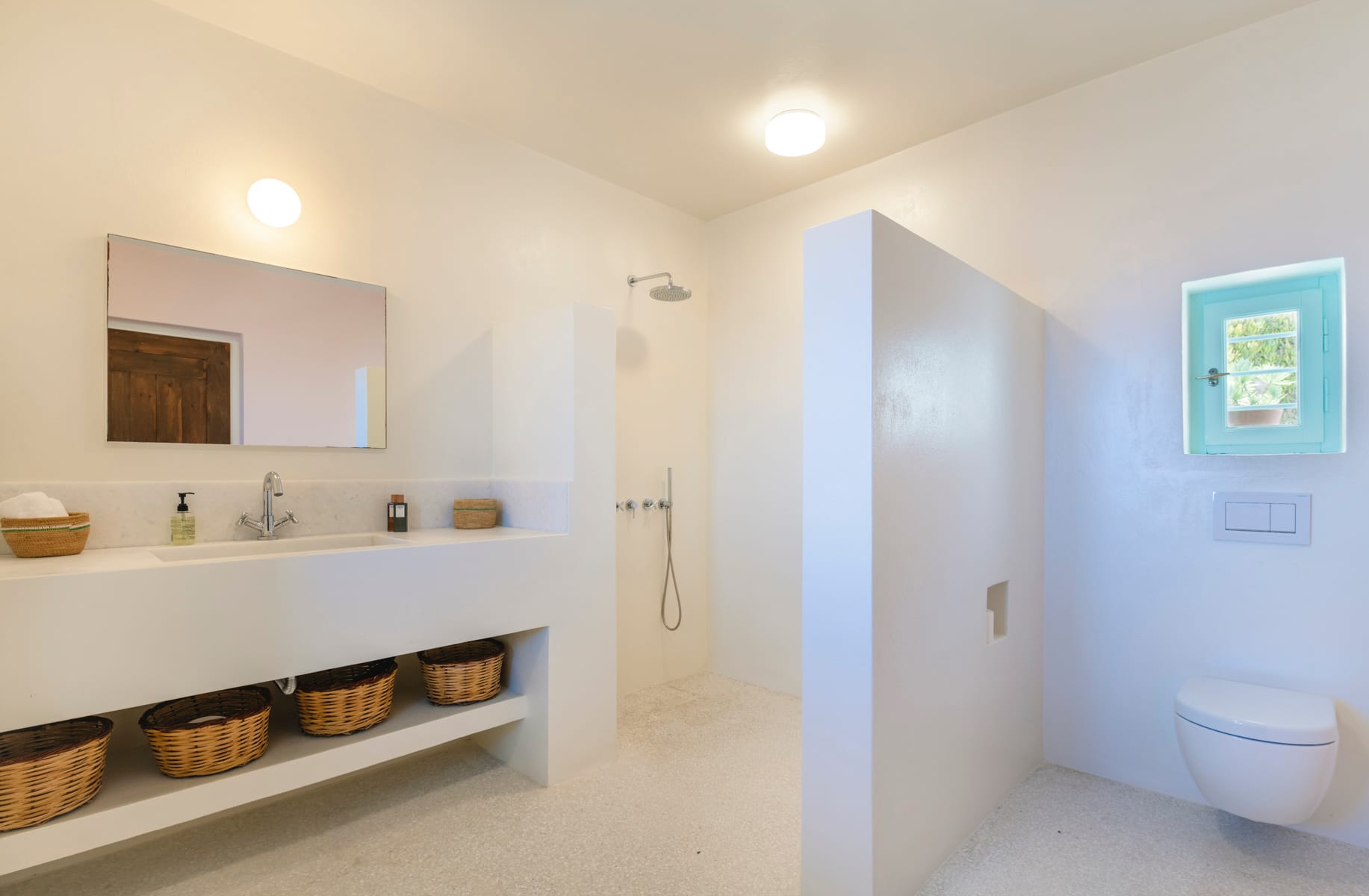 The villa’s cool interiors feature pristine terrazzo floors throughout, rustic wood-carved doors, traditional ceramic tiles and superior local marble for the bathrooms and kitchen. Outside, a variety of terraces, balconies and niches distributed around the property allow for increased privacy even among a large group of guests.