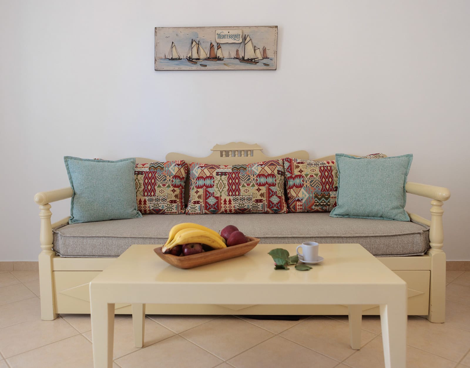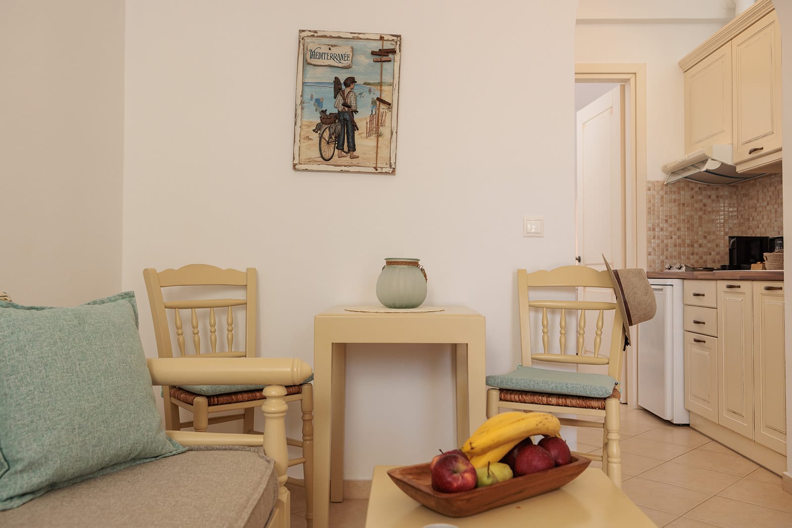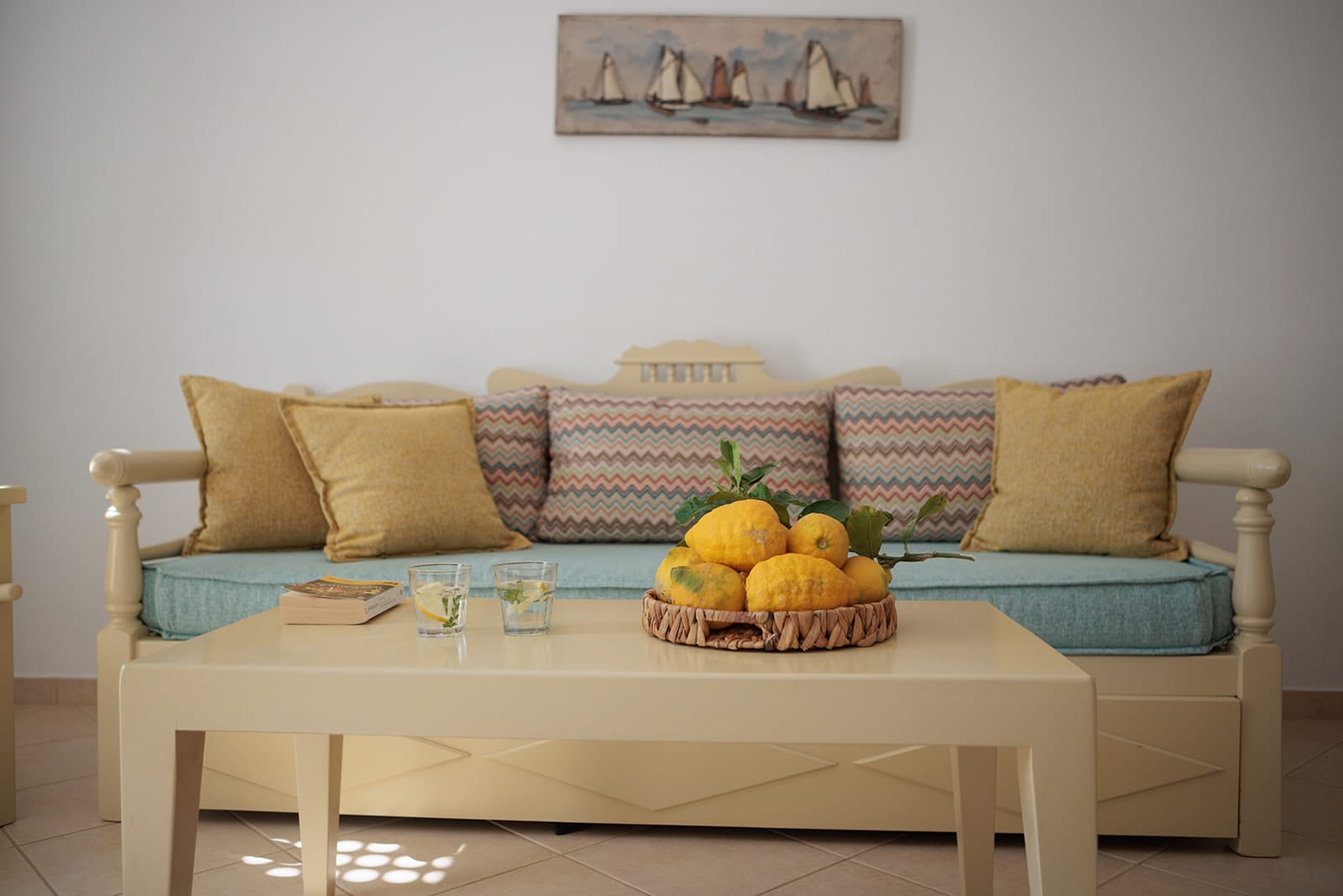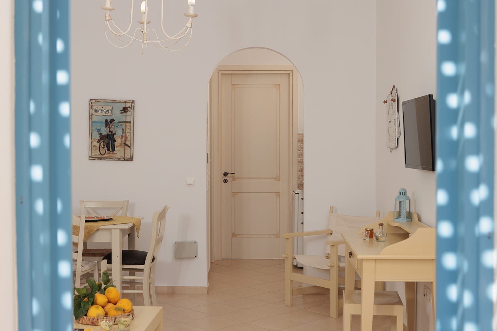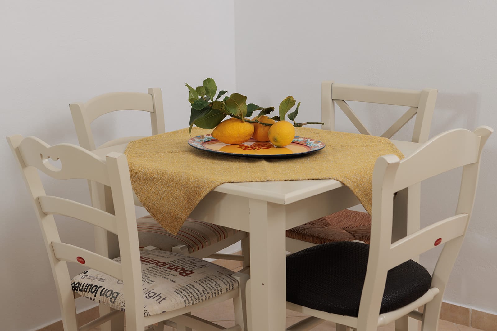 The apartment features one bedroom with a double bed, a living room with two single sofa beds, a fully equipped kitchen, a bathroom with shower, and a private veranda. The apartment also offers a shared courtyard with a barbeque area and shared tables and seating, ideal for enjoying the evening with friends. It is also sunny and airy, providing stunning views of the garden and sunlight.