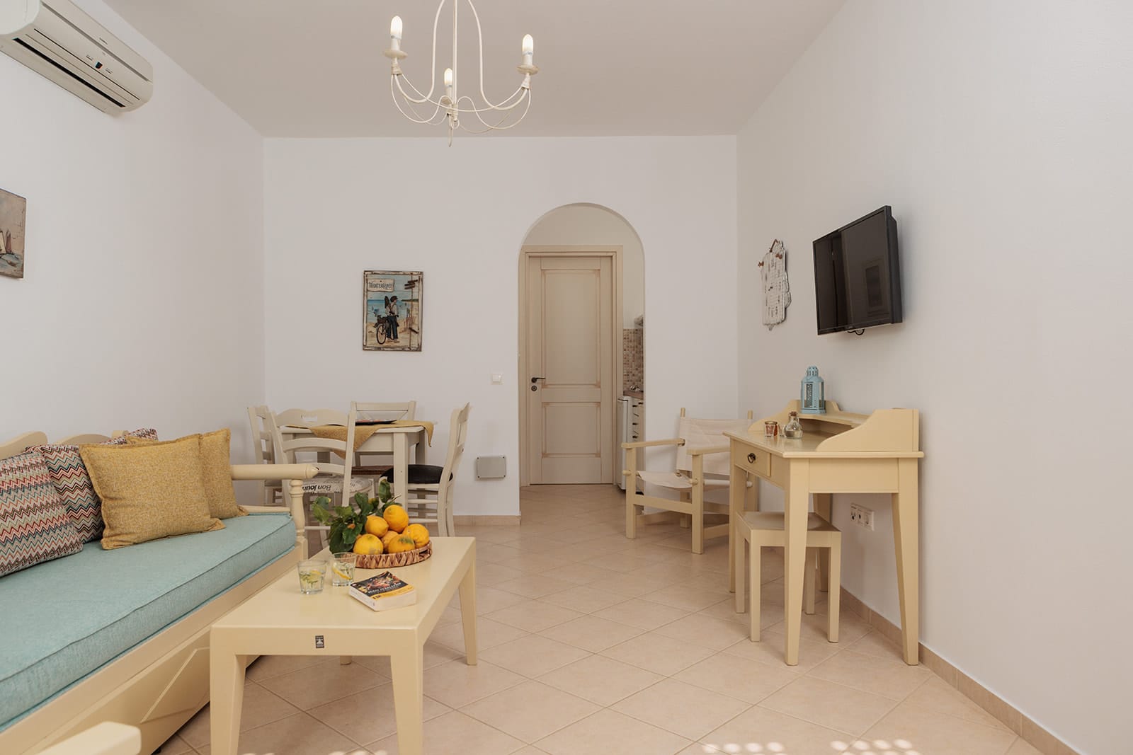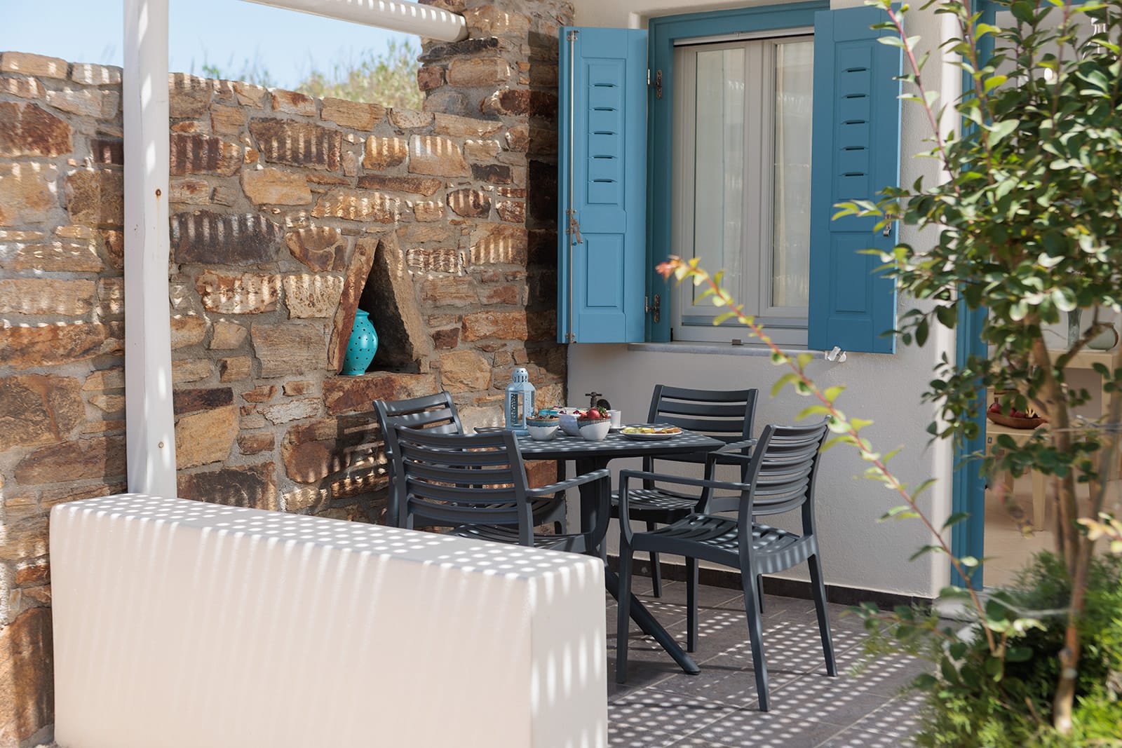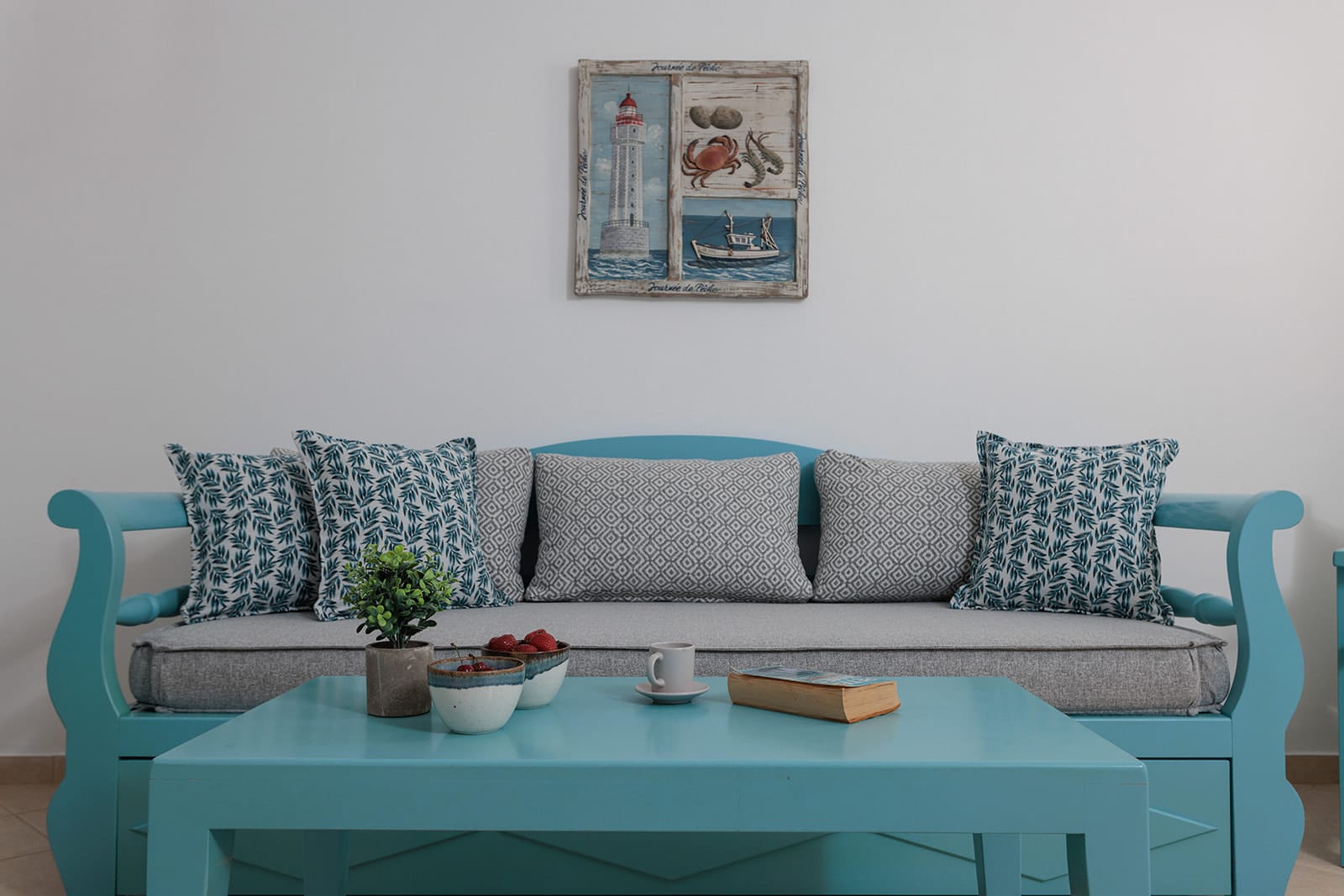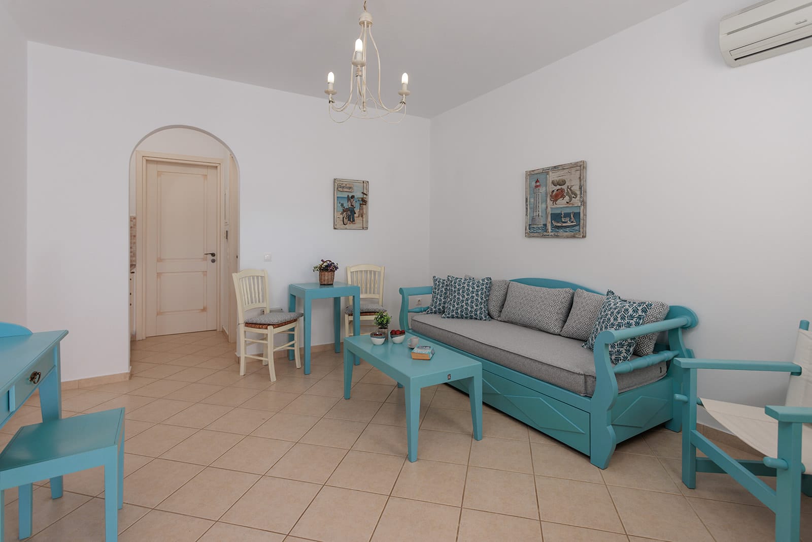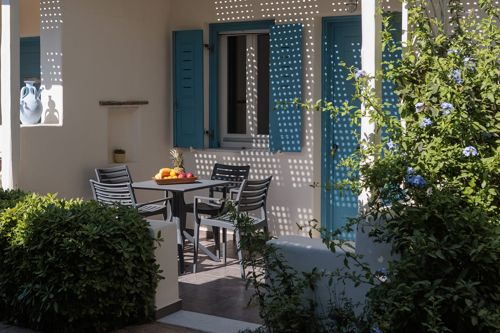 The apartment features one bedroom with a double bed, a living room with two single sofa beds, a fully equipped kitchen, a bathroom with shower, and a private veranda. The apartment also offers a shared courtyard with a barbeque area and shared tables and seating, ideal for enjoying the evening with friends. It is also sunny and airy, providing stunning views of the garden and sunlight.
