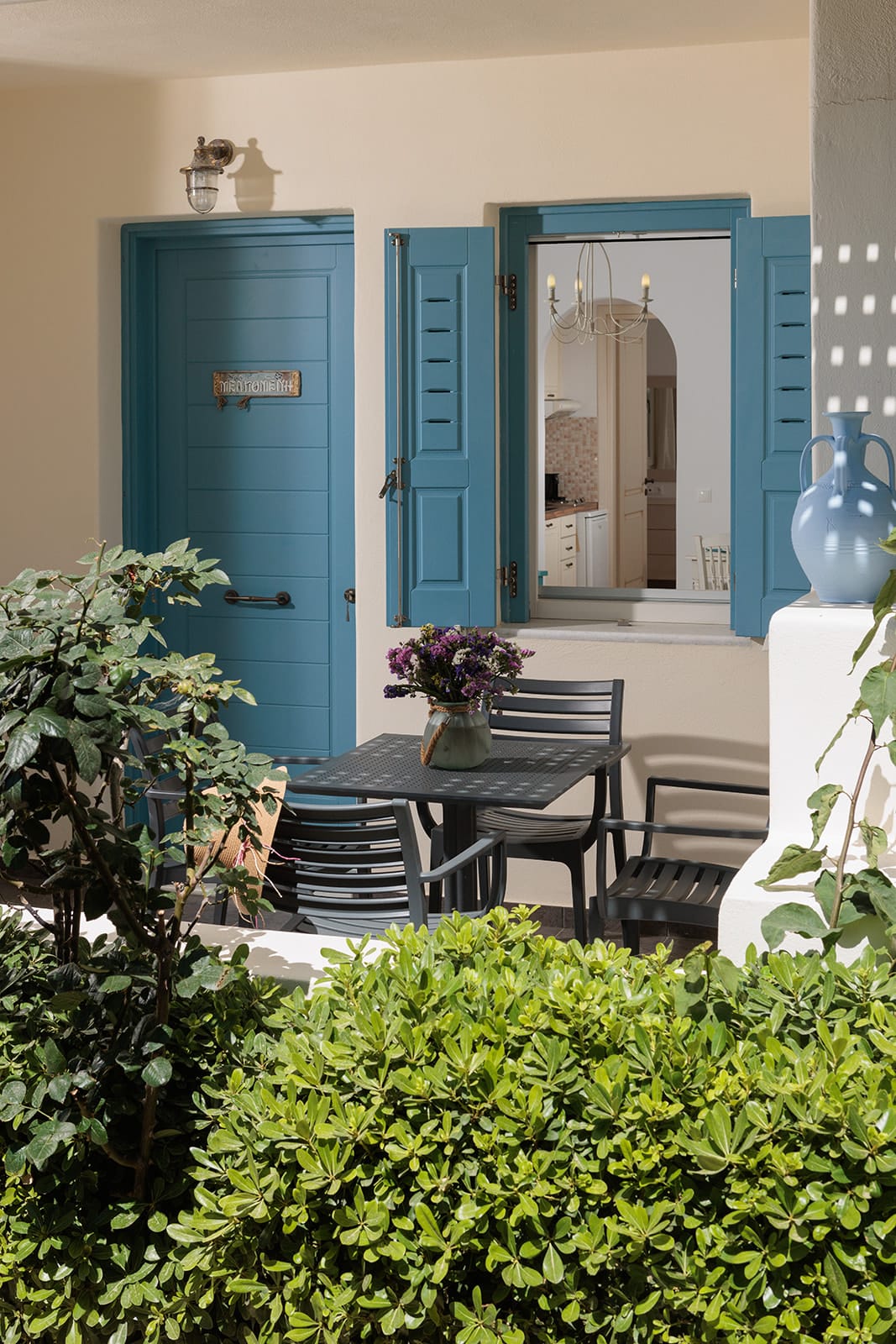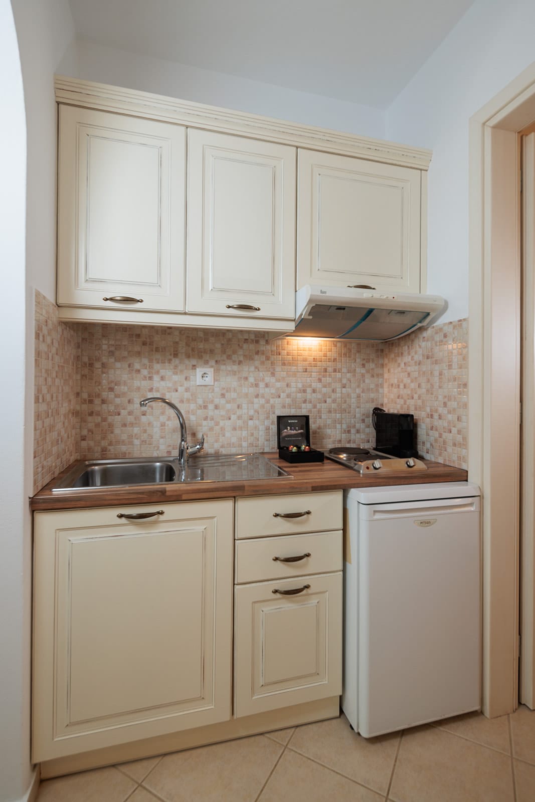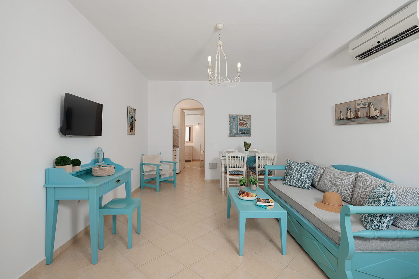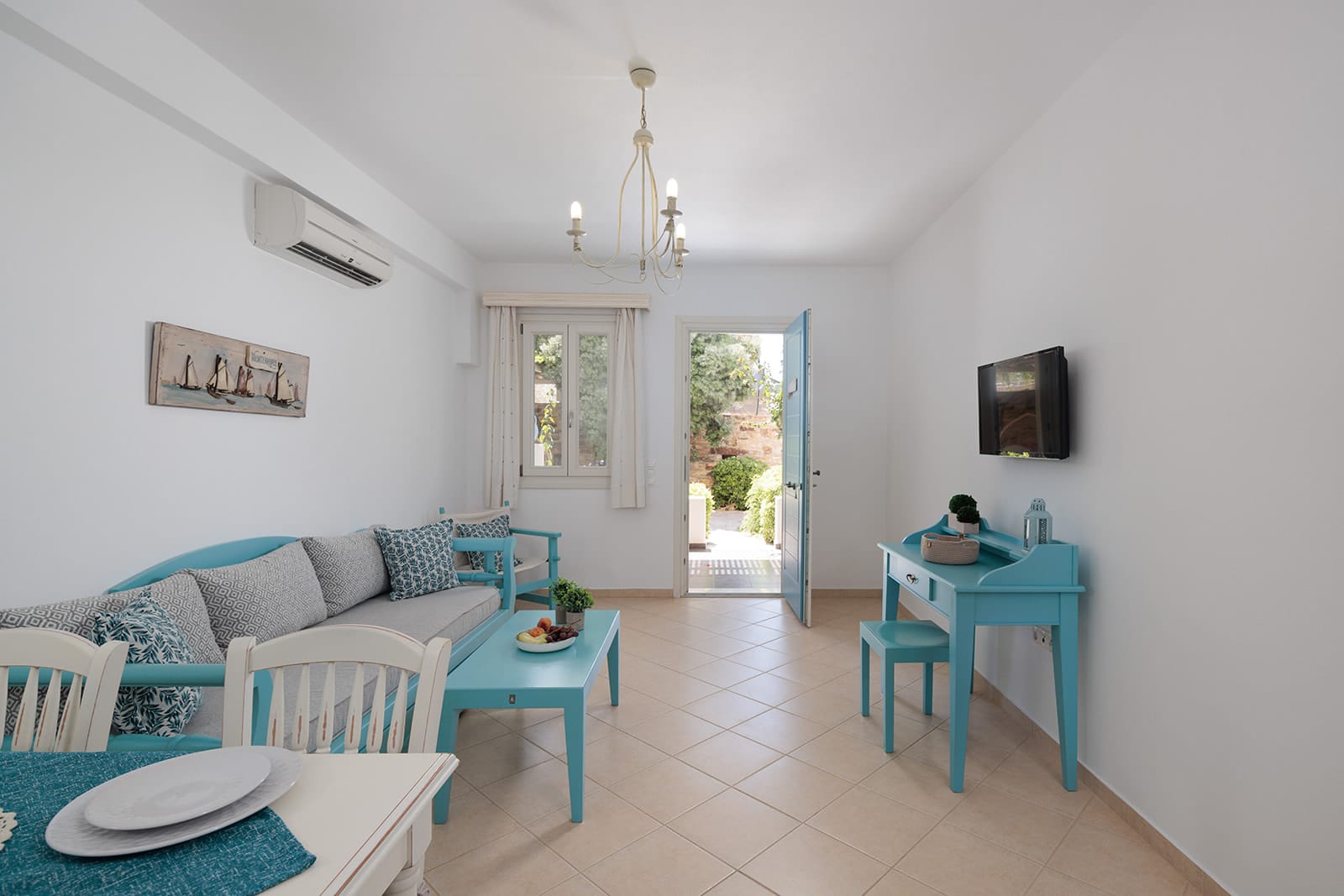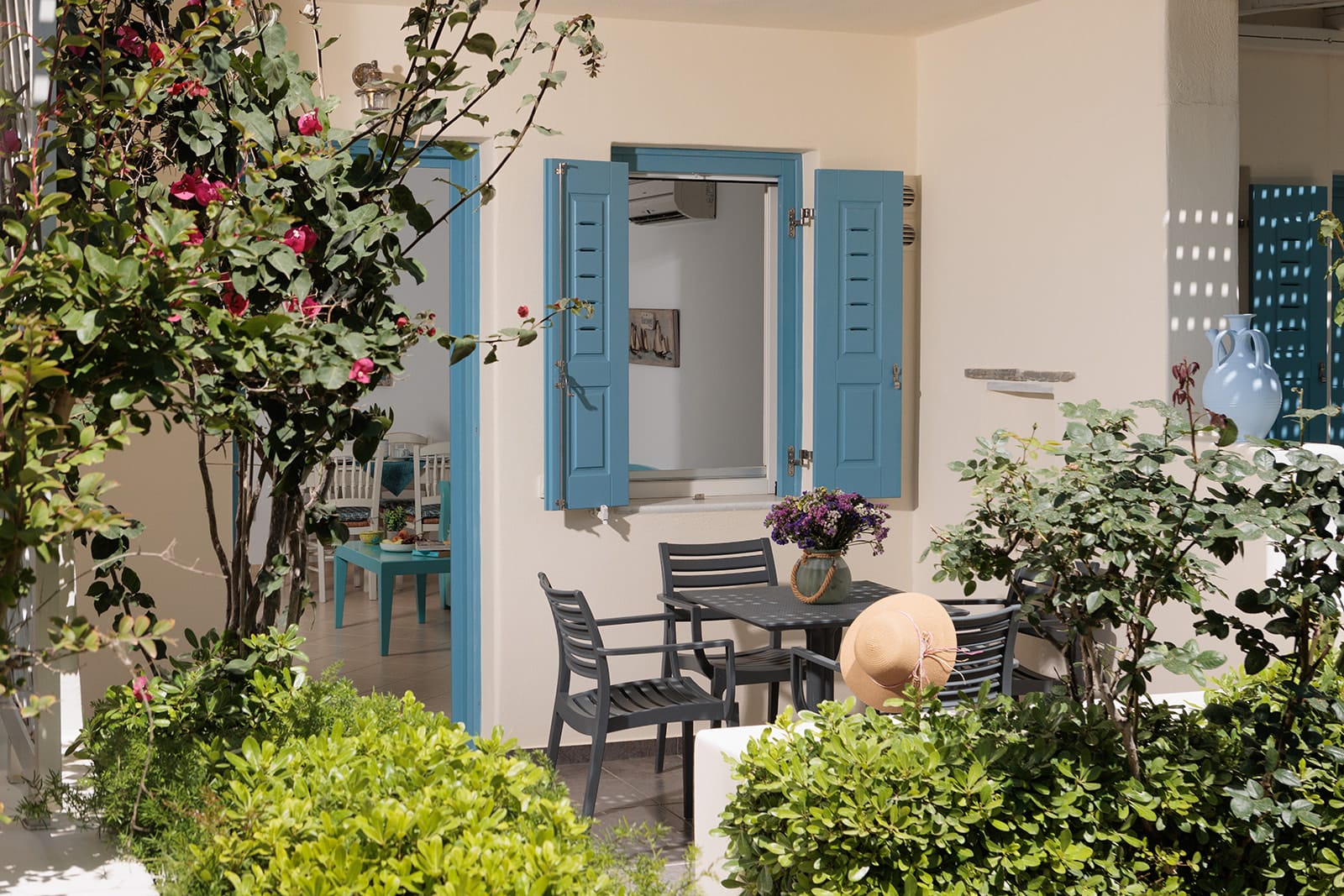 The apartment features one bedroom with a double bed, a living room with two single sofa beds, a fully equipped kitchen, a bathroom with shower, and a private veranda. The apartment also offers a shared courtyard with a barbeque area and shared tables and seating, ideal for enjoying the evening with friends. It is also sunny and airy, providing stunning views of the garden and sunlight.