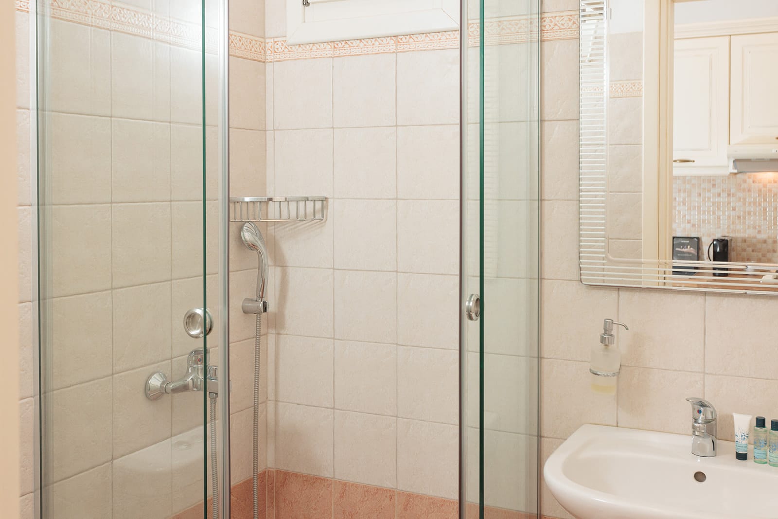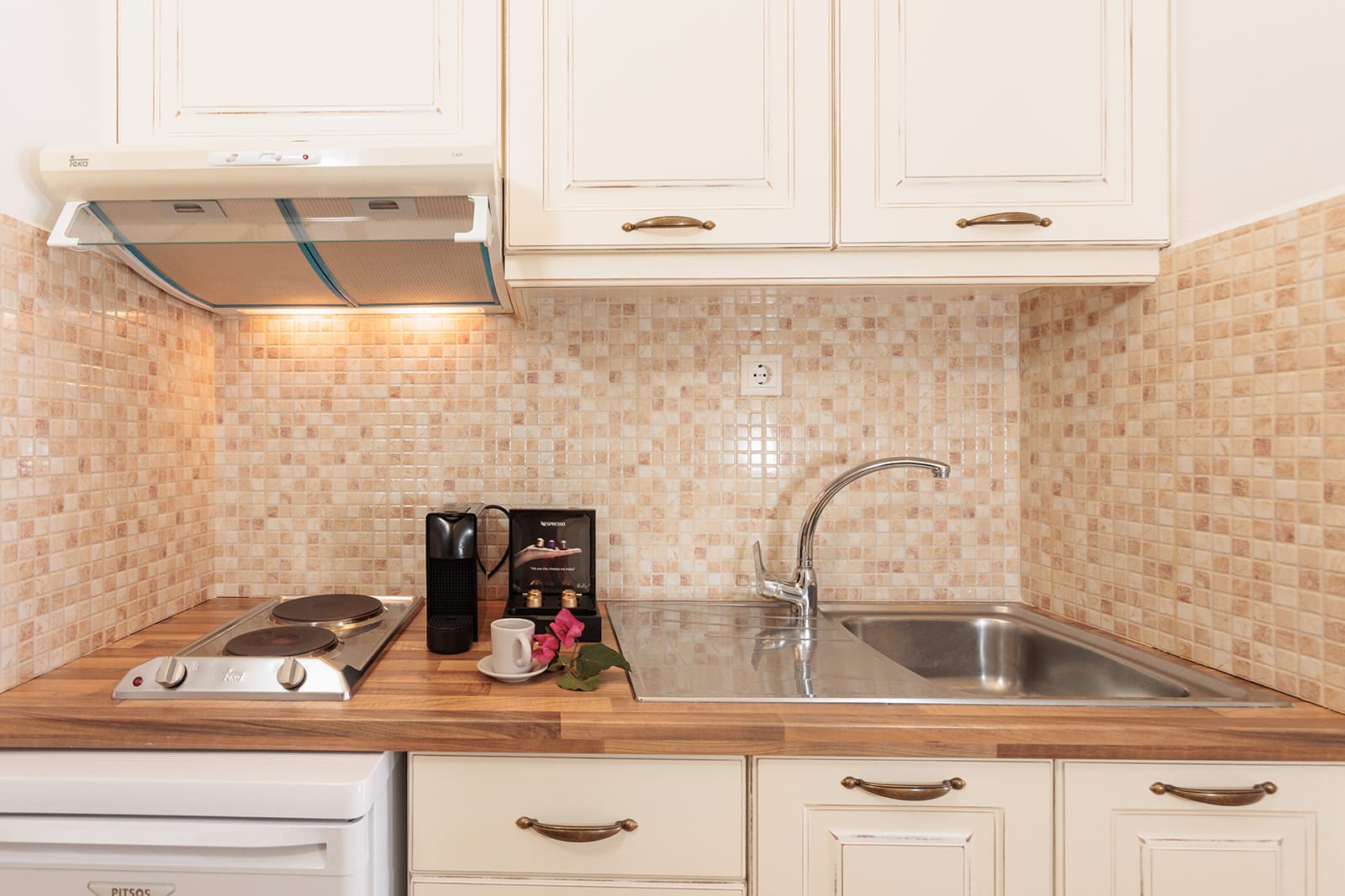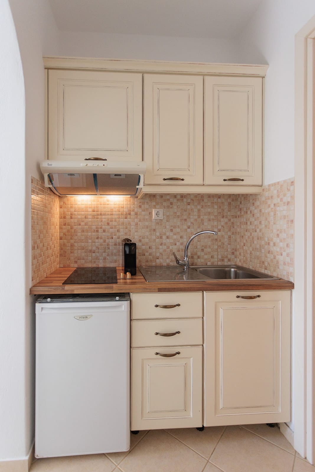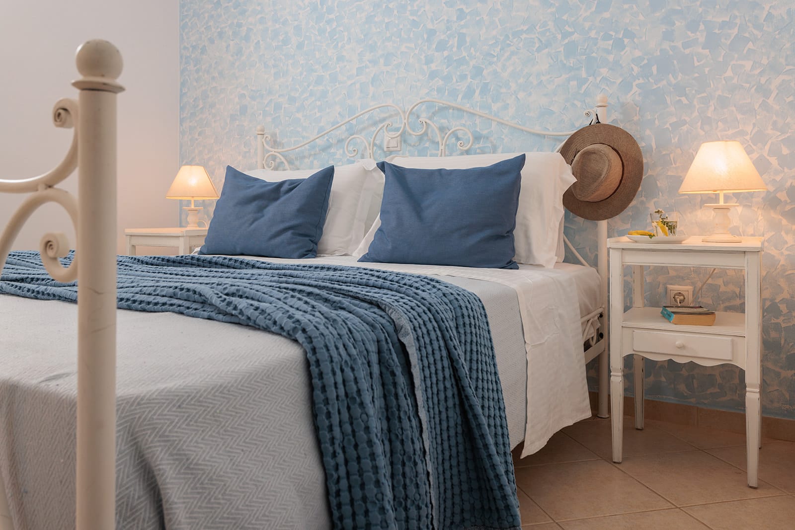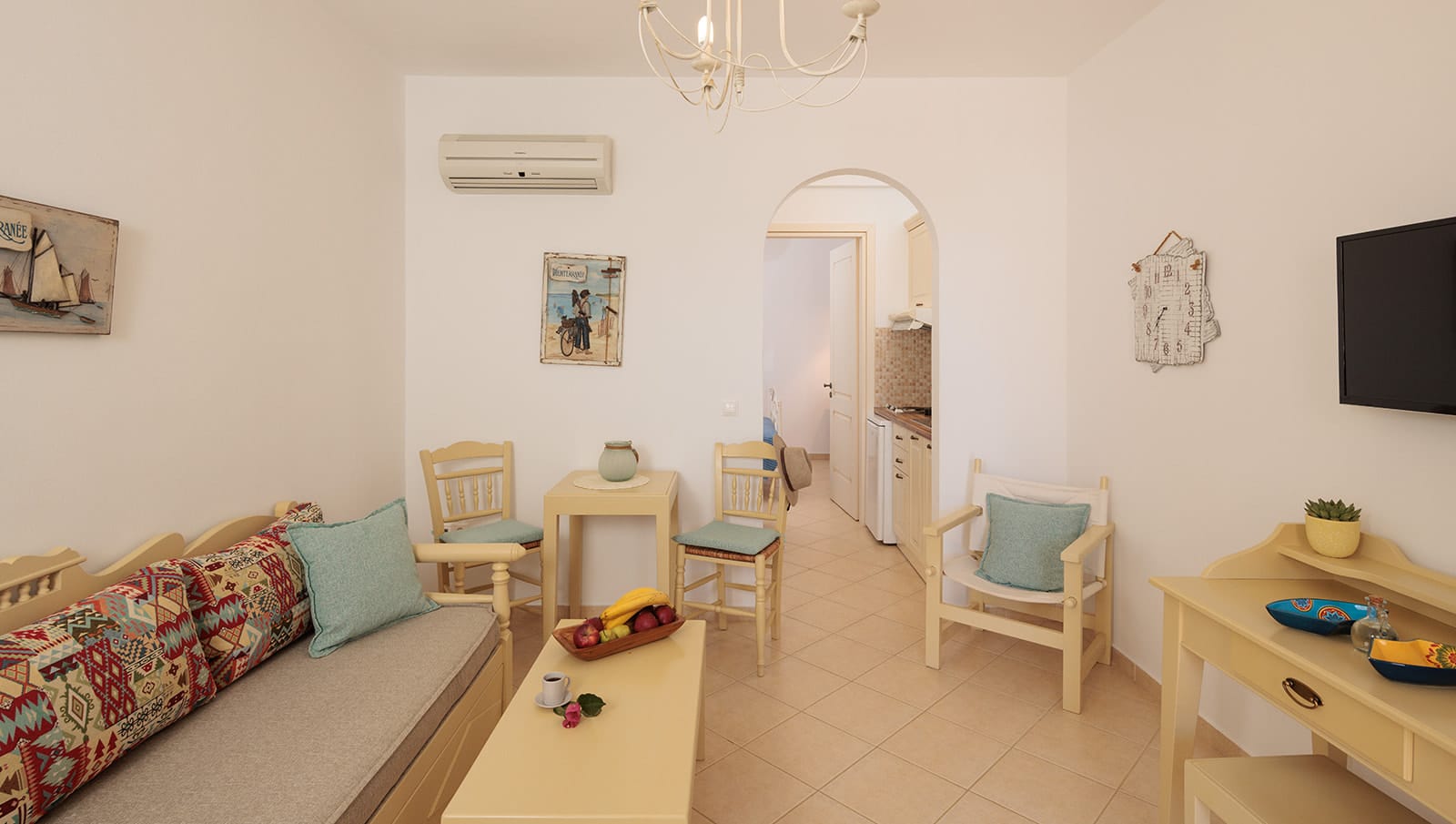 The apartment features one bedroom with a double bed, a living room with two single sofa beds, a fully equipped kitchen, a bathroom with shower, and a private veranda. The apartment also offers a shared courtyard with a barbeque area and shared tables and seating, ideal for enjoying the evening with friends. It is also sunny and airy, providing stunning views of the garden and sunlight.