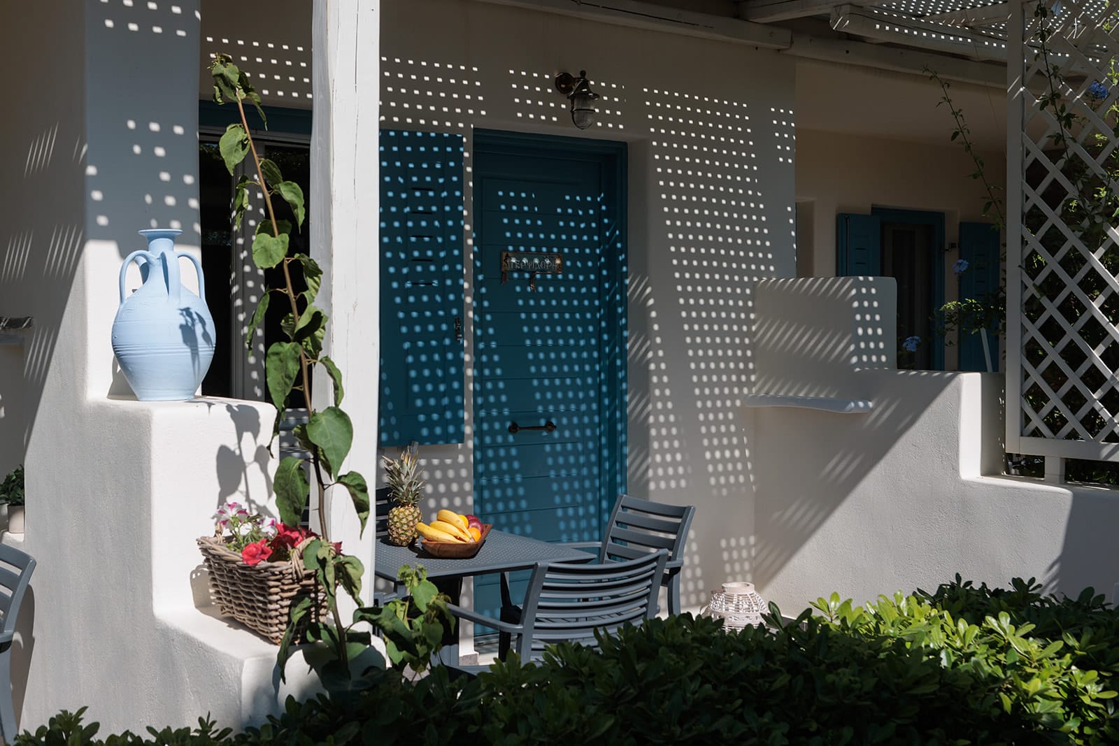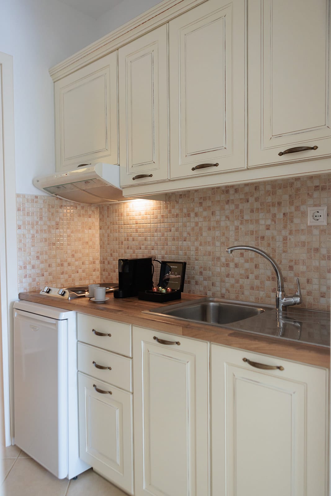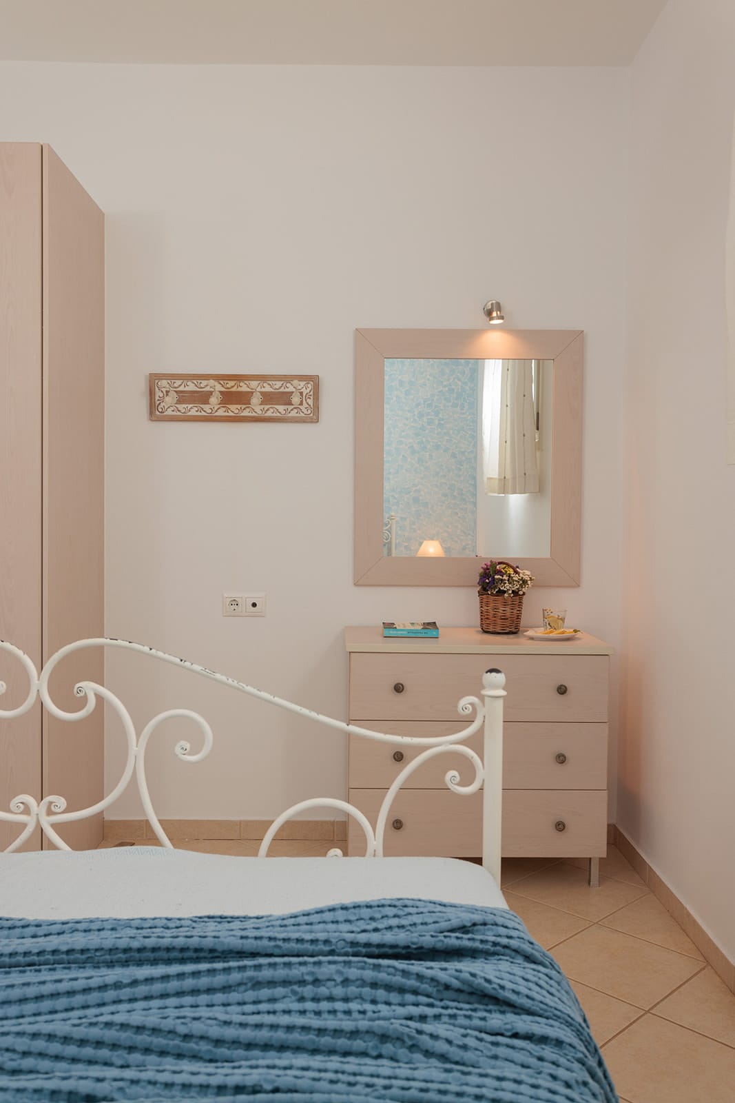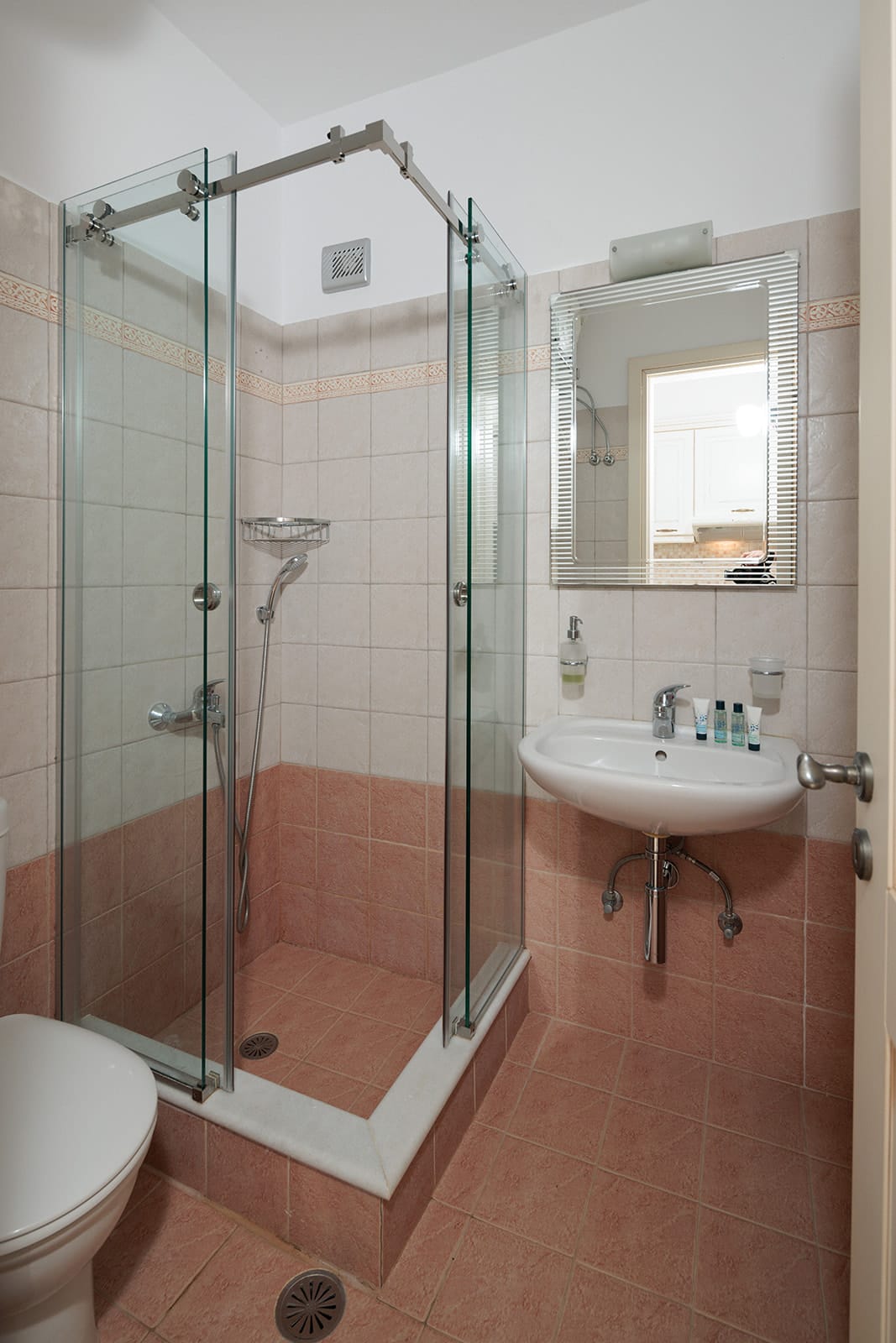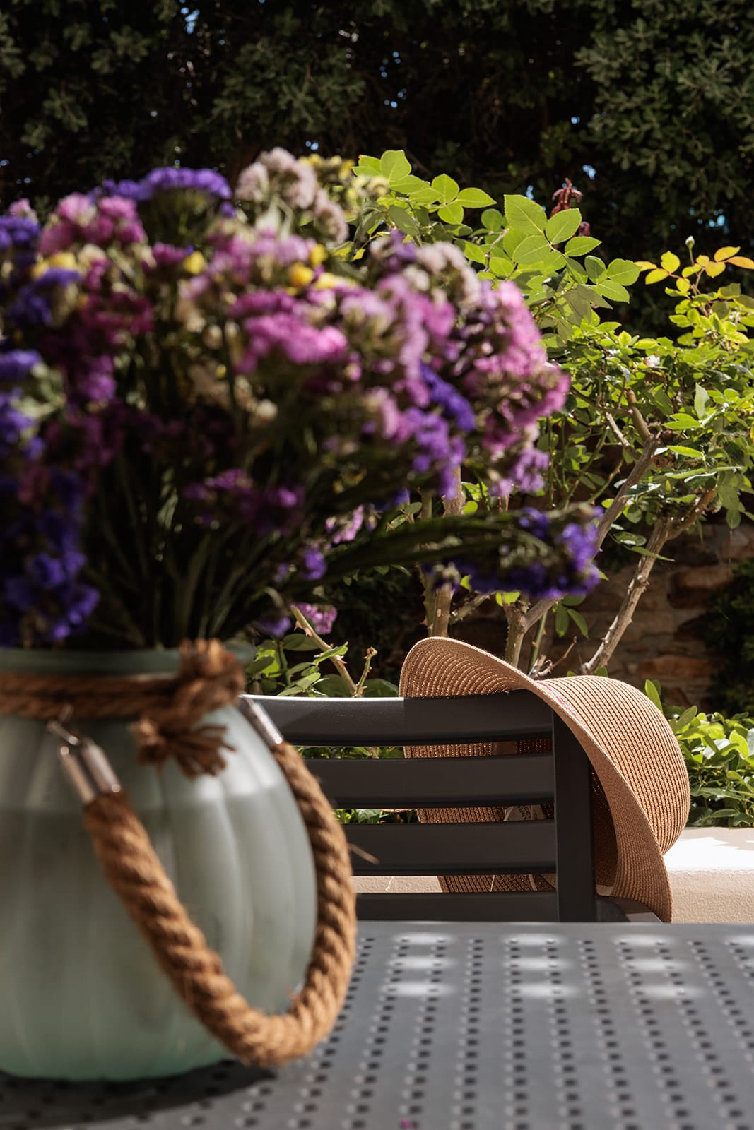 The apartment features one bedroom with a double bed, a living room with two single sofa beds, a fully equipped kitchen, a bathroom with shower, and a private veranda. The apartment also offers a shared courtyard with a barbeque area and shared tables and seating, ideal for enjoying the evening with friends. It is also sunny and airy, providing stunning views of the garden and sunlight.