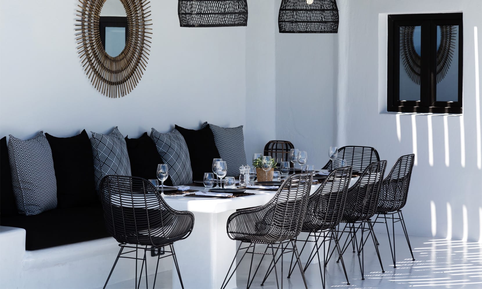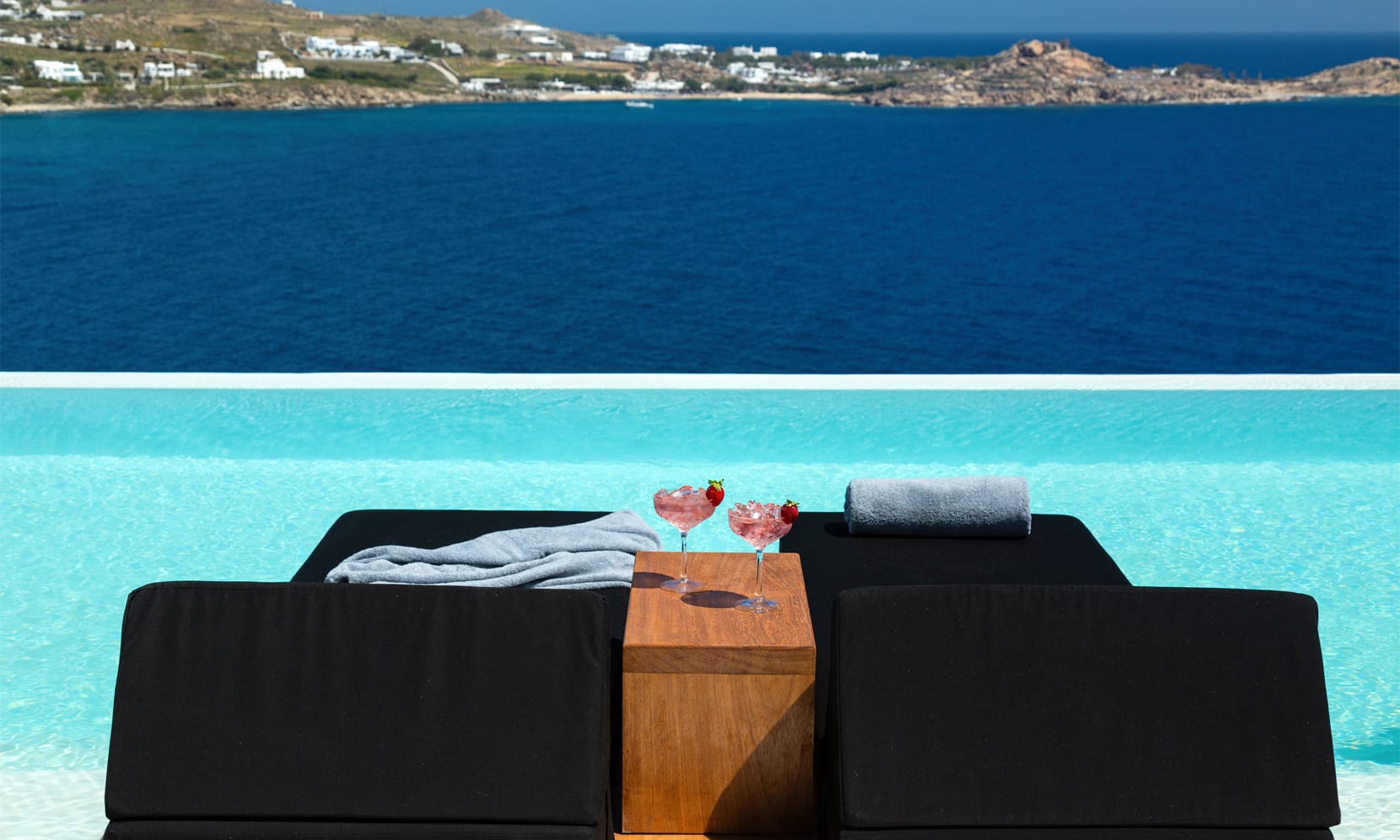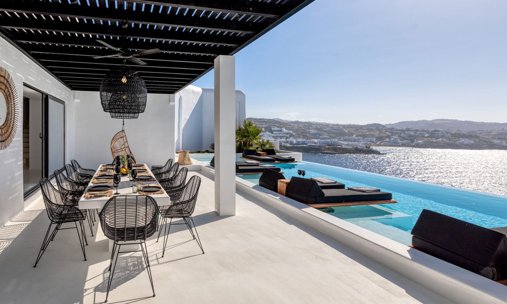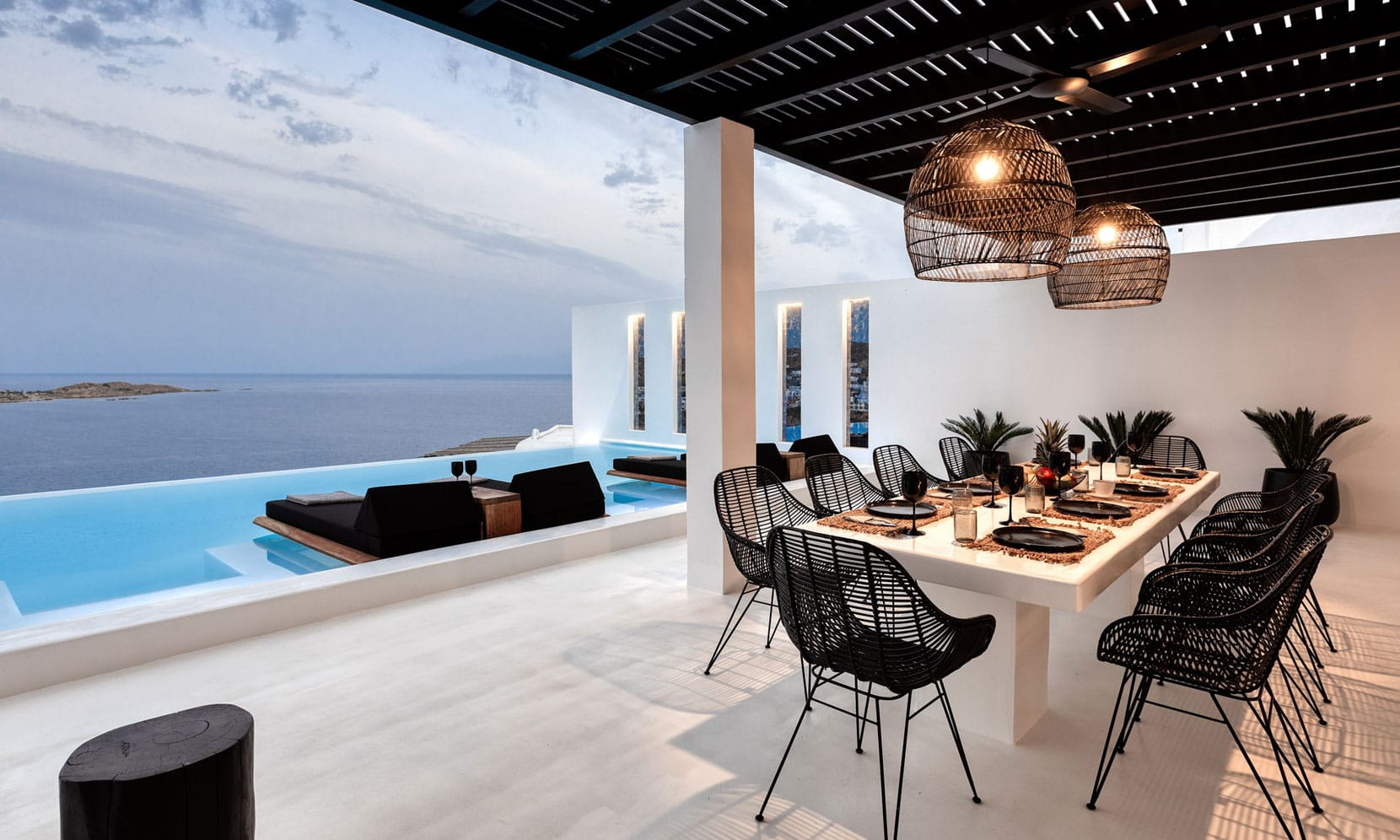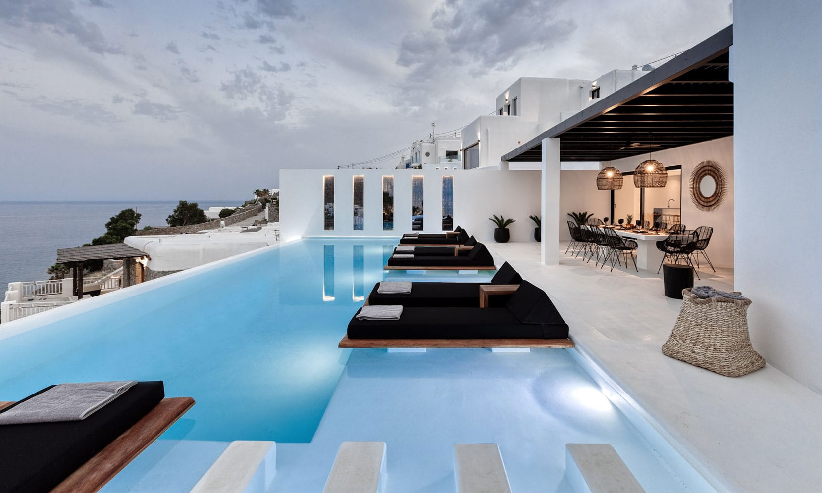 Alfresco areas are designed for ultimate relaxation, with pergola-shaded dining spaces, lounging areas, in-pool sunbeds, and intimate jacuzzi moments—all overlooking the sea. Wake to the sound of waves, sunbathe in the infinity pools, or stroll along the private path to Psarou Beach in just 4 minutes.