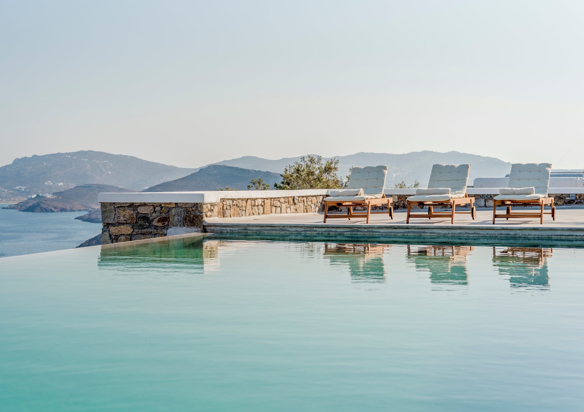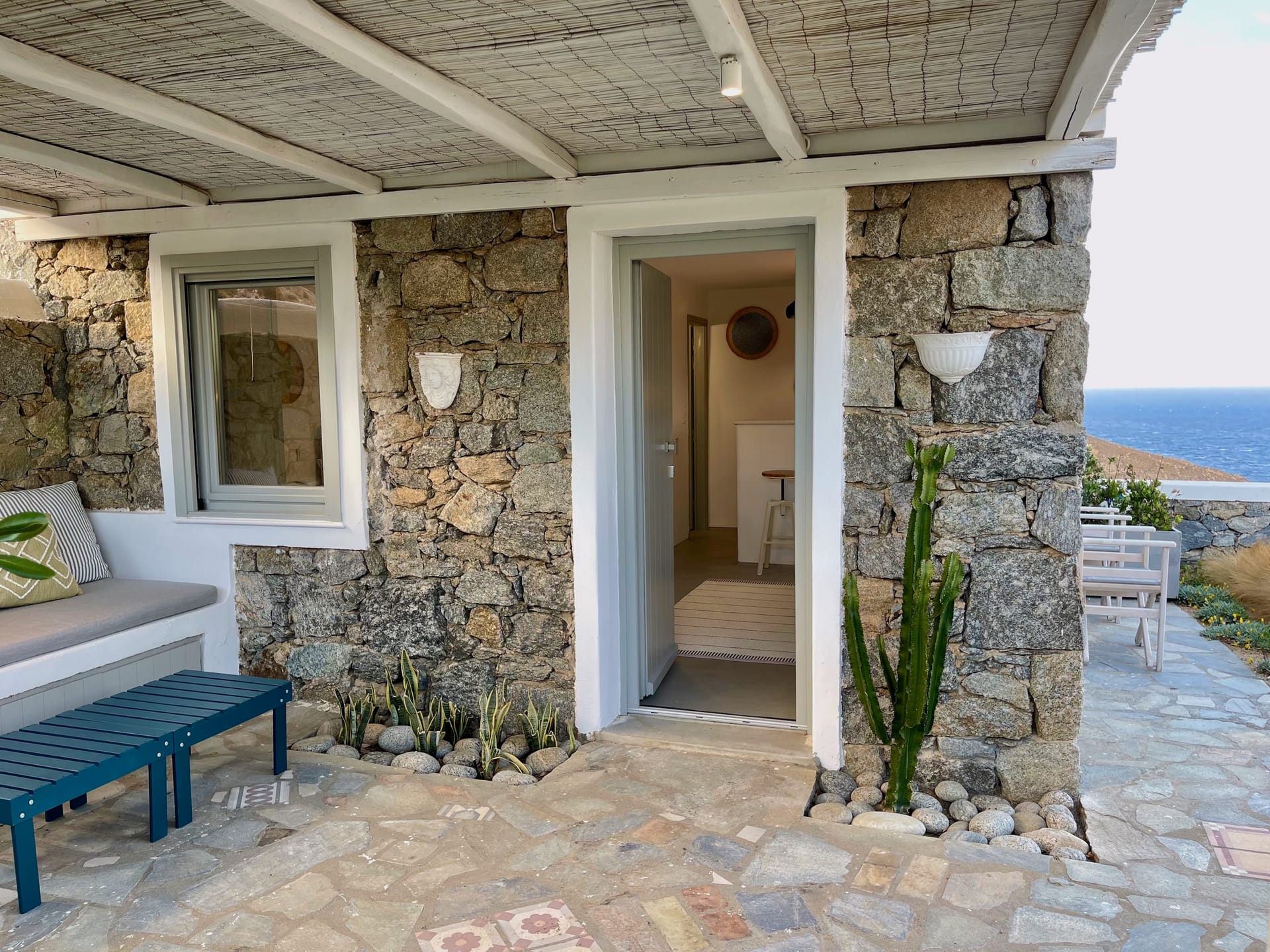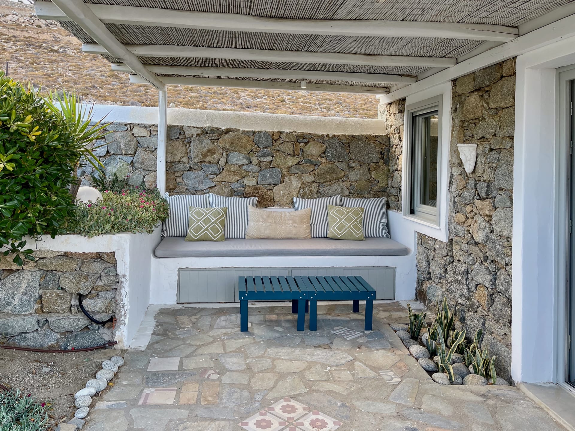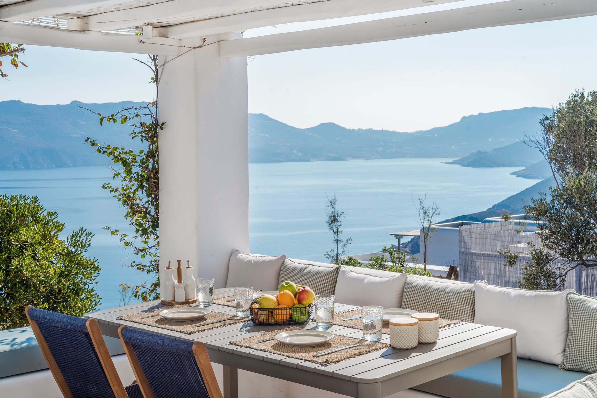 Villa Agios Sostis is situated on a hillside above Agios Sostis beach, a privileged location which provides ultimate privacy. It offers to its guests an unobstructed sea view of “Panormos” bay and “Agios Sostis” beach and within a 2-minute walk they can enjoy the crystal-clear waters of the beach.