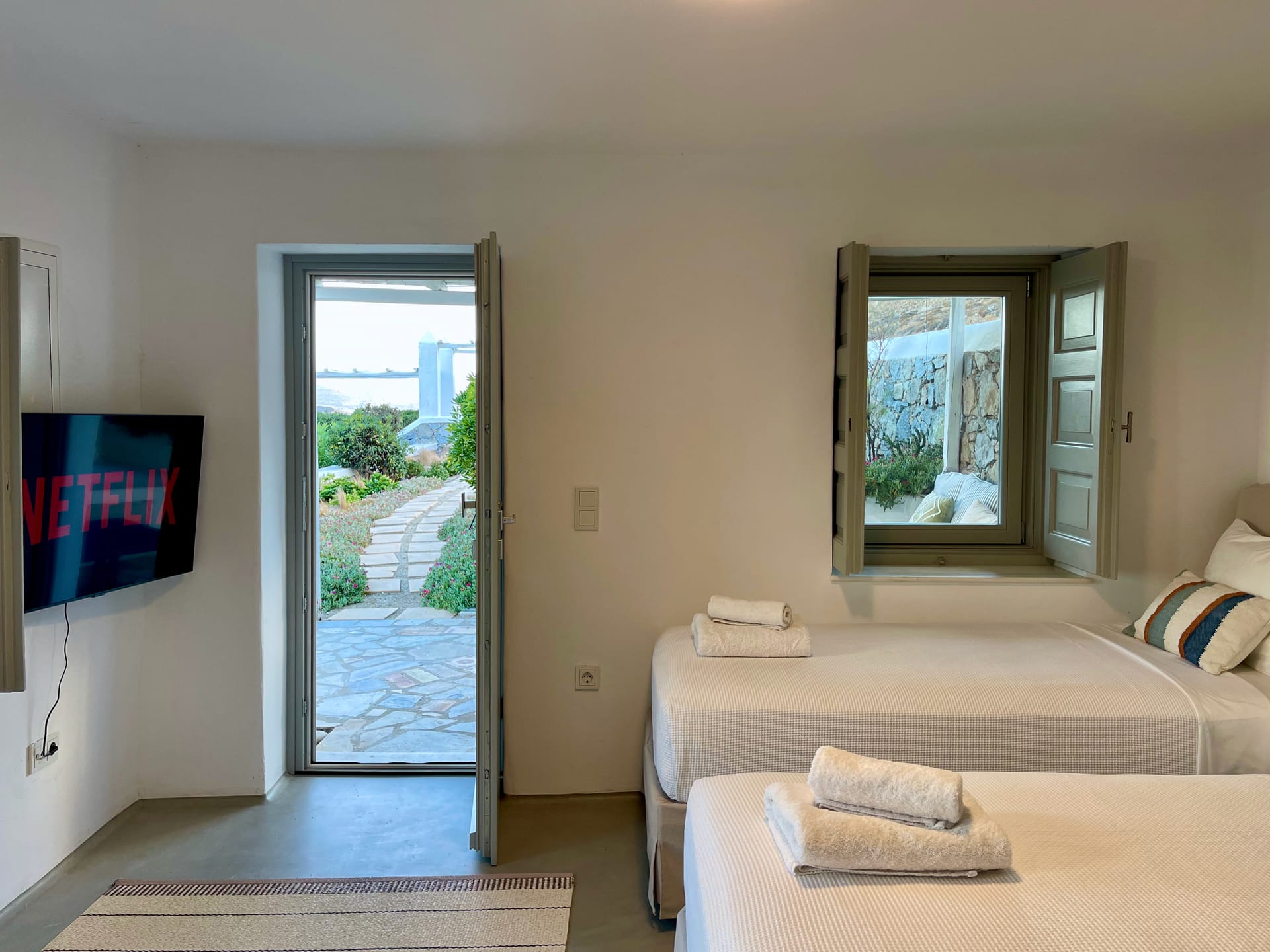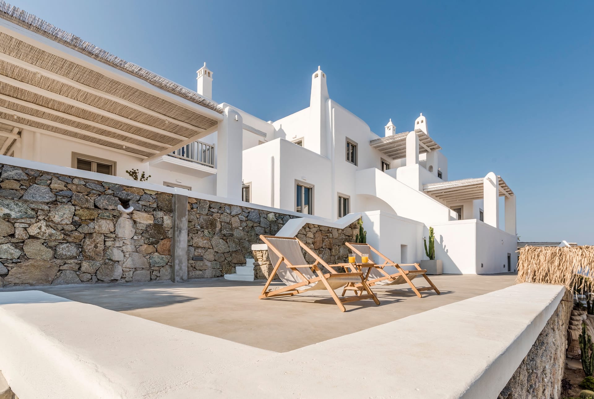 The villa is 435m2 and extends on a plot of 4.000m2. It has been fully renovated in 2019 and consists of 3 levels, providing in total 7 en-suite bedrooms accommodating up to 14 people. All bedrooms, except 1 have sea and/or garden view.