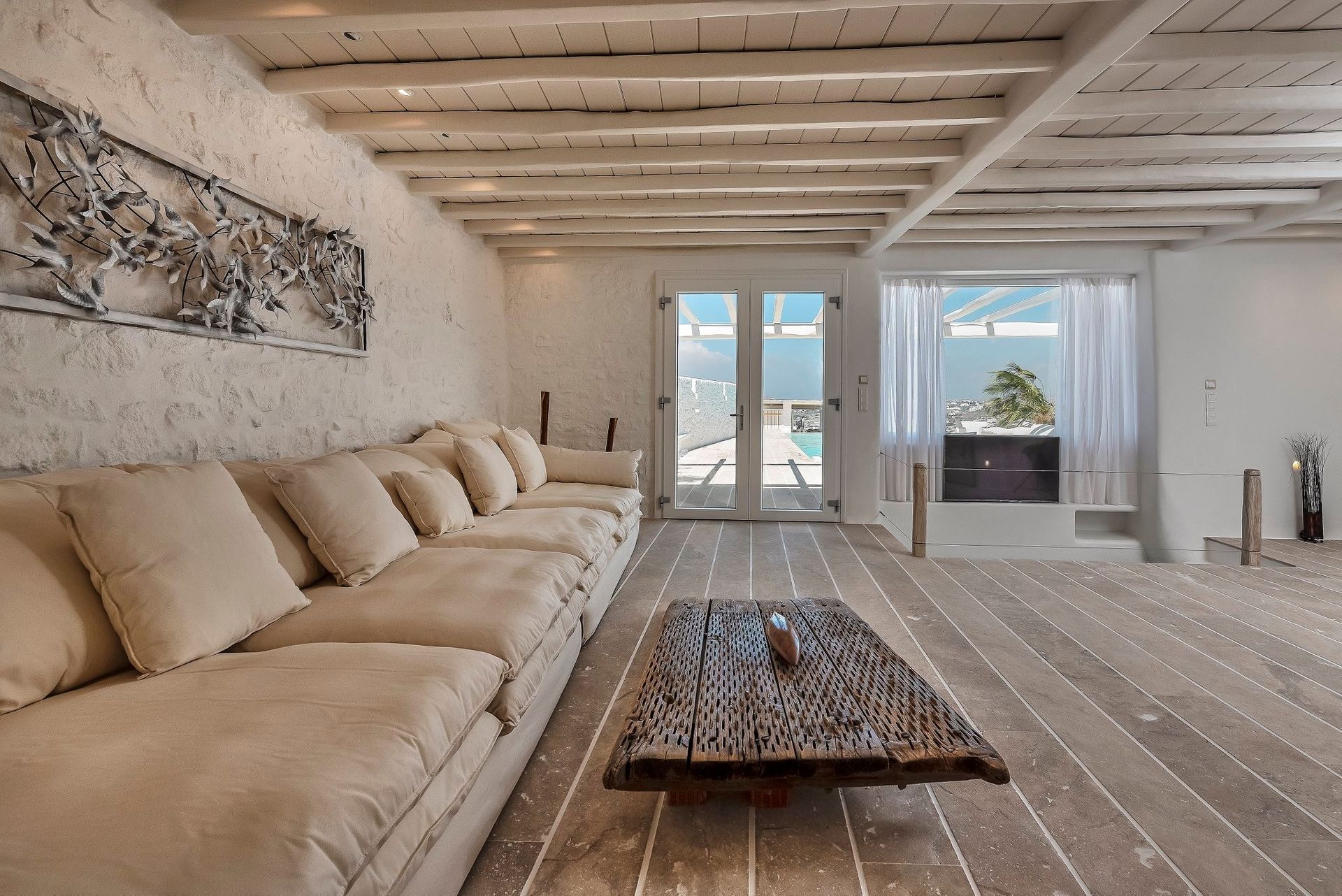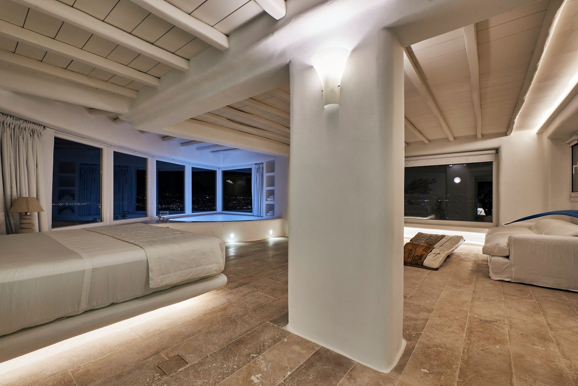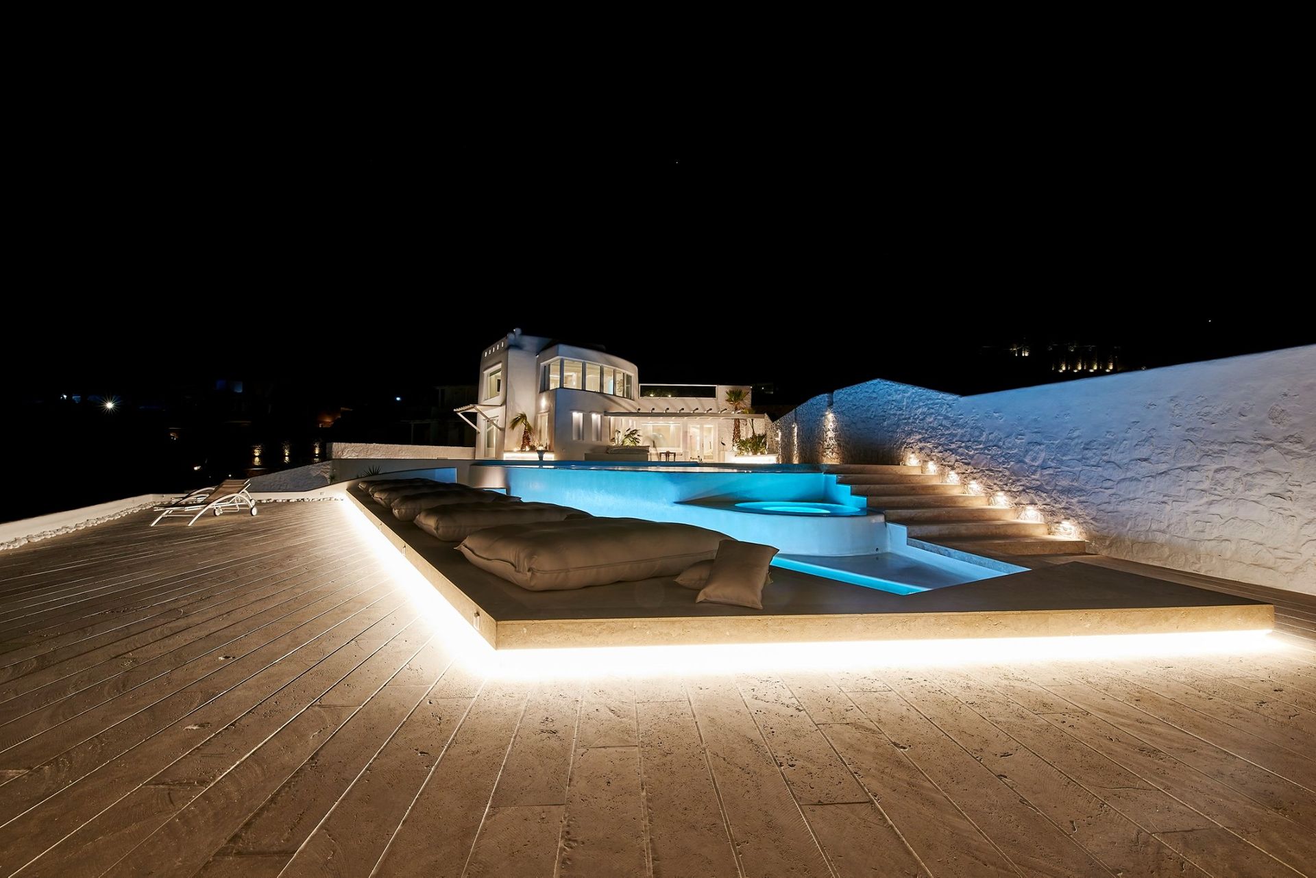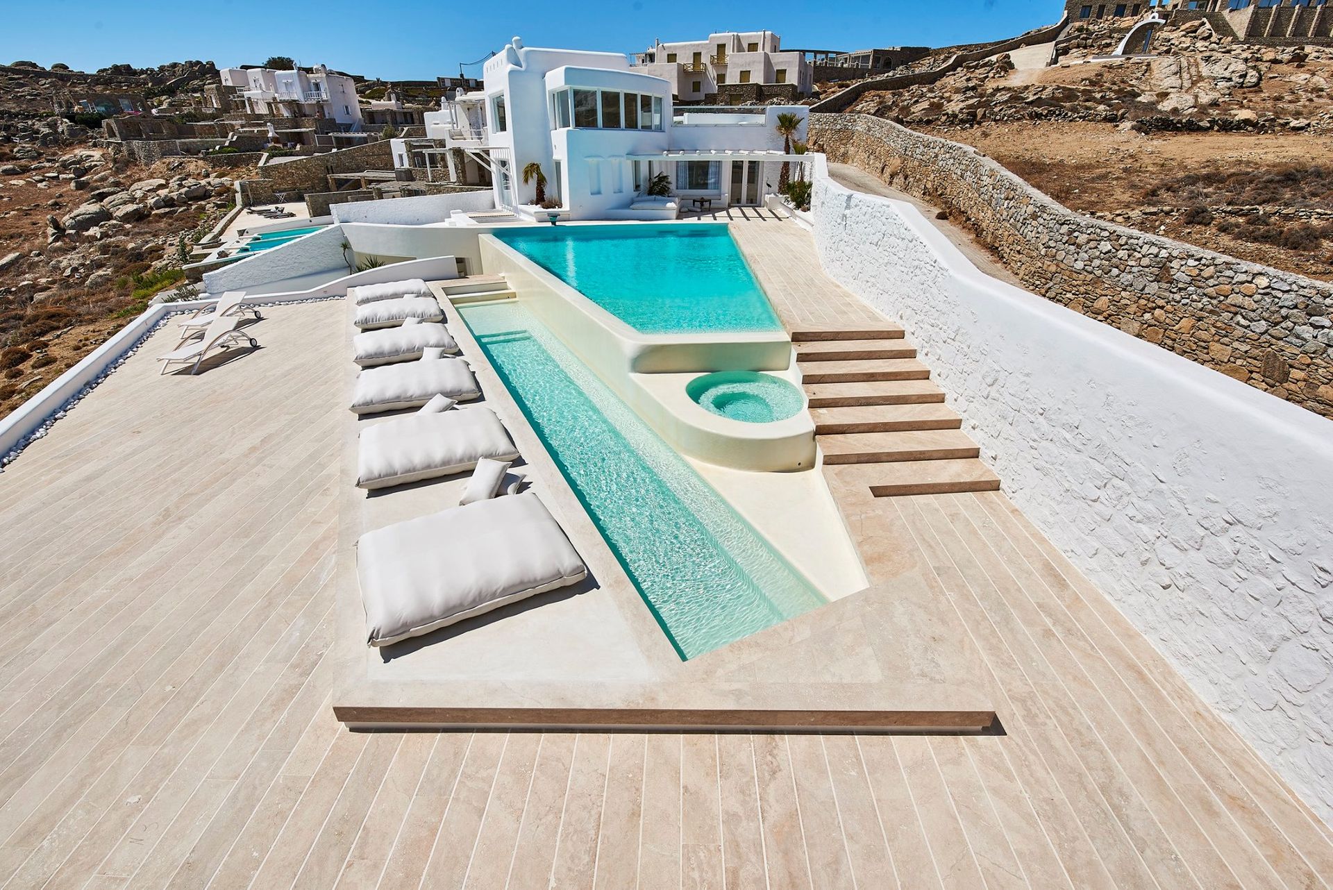 The villa’s main swimming pool 150 sq.m overflows with perimeter waterfalls in two smaller pools and a hot tub for 6 people. These two are below the main pool and at different levels. The main poolis located at the middle level in the center of the courtyard and is surrounded by marble floors of 500 square meters, with 3 large built-in outdoor living rooms with lovely pillows and panoramic views of the bay and the island of Mykonos.