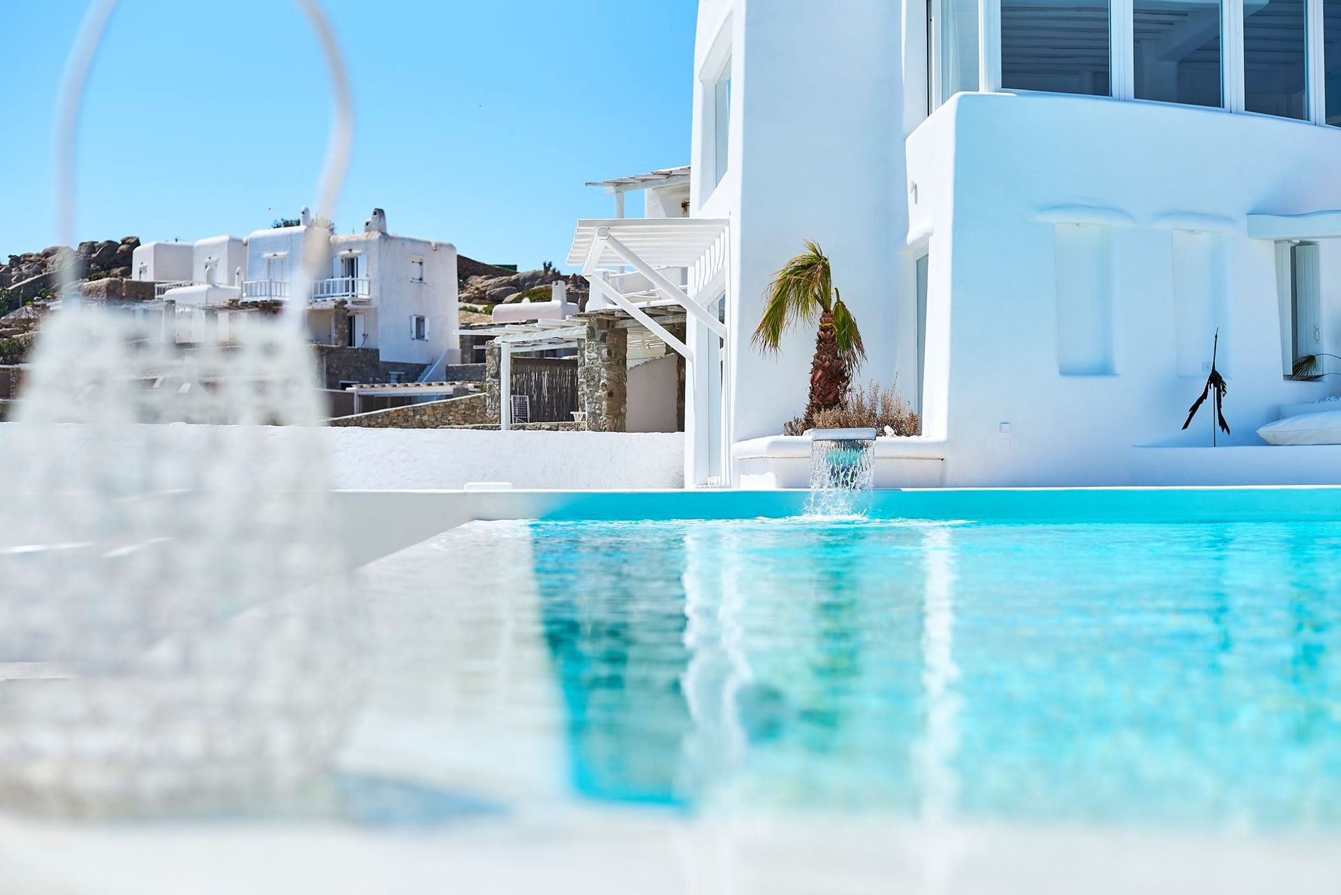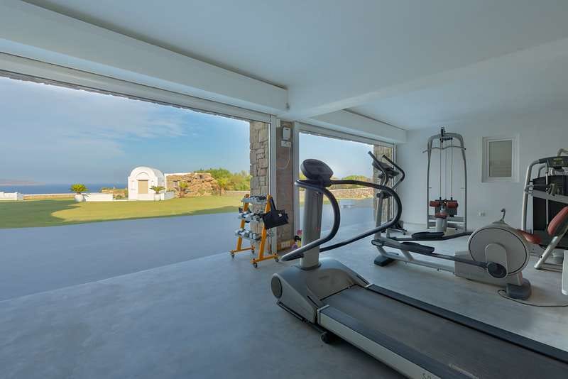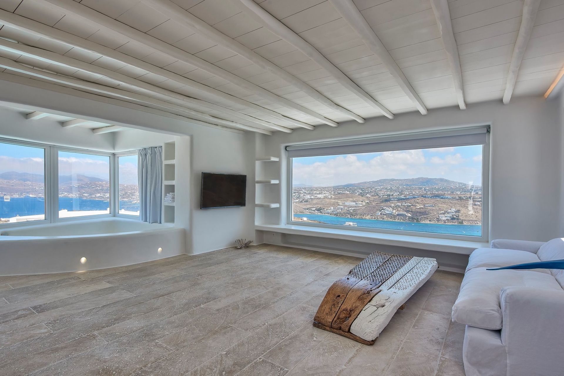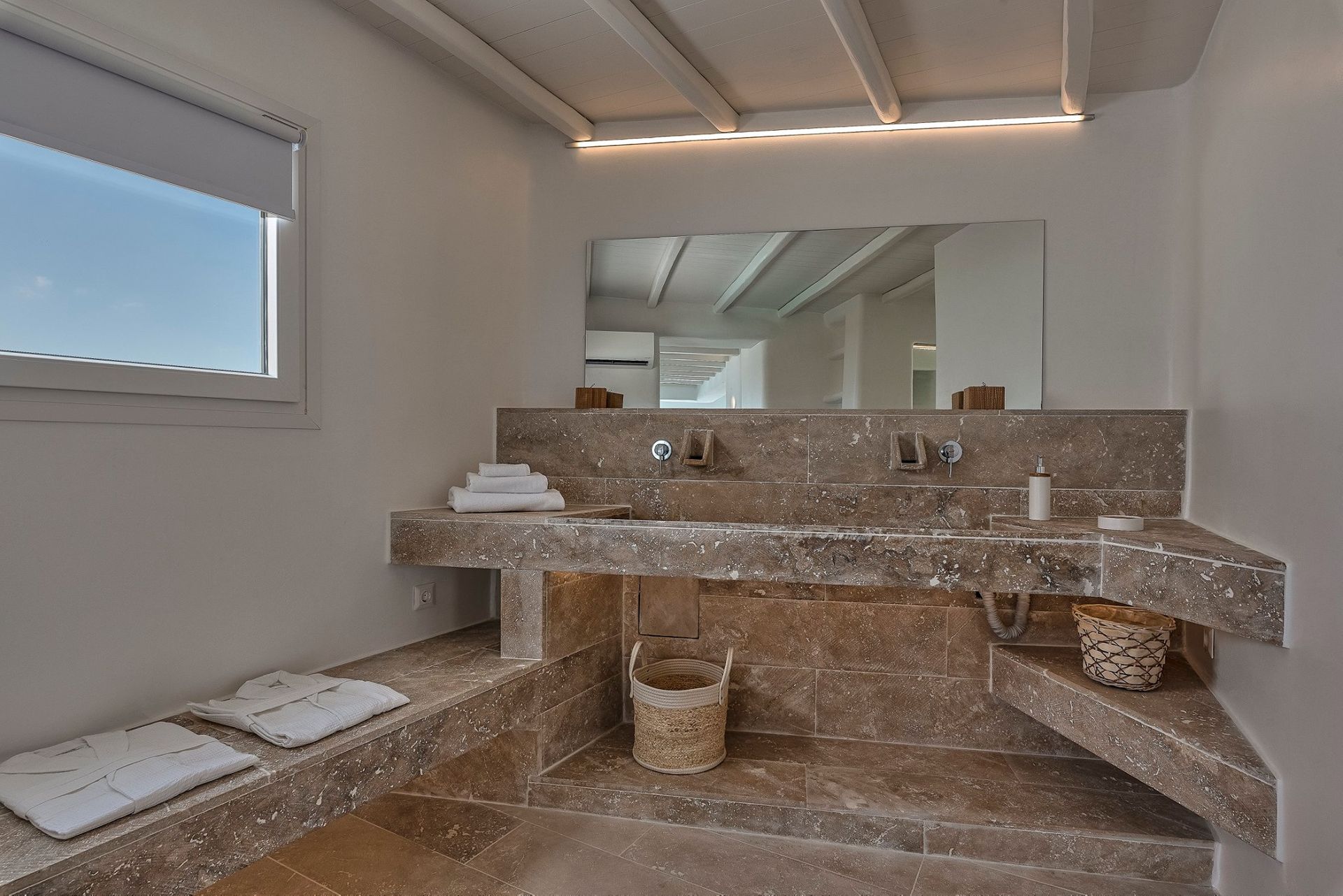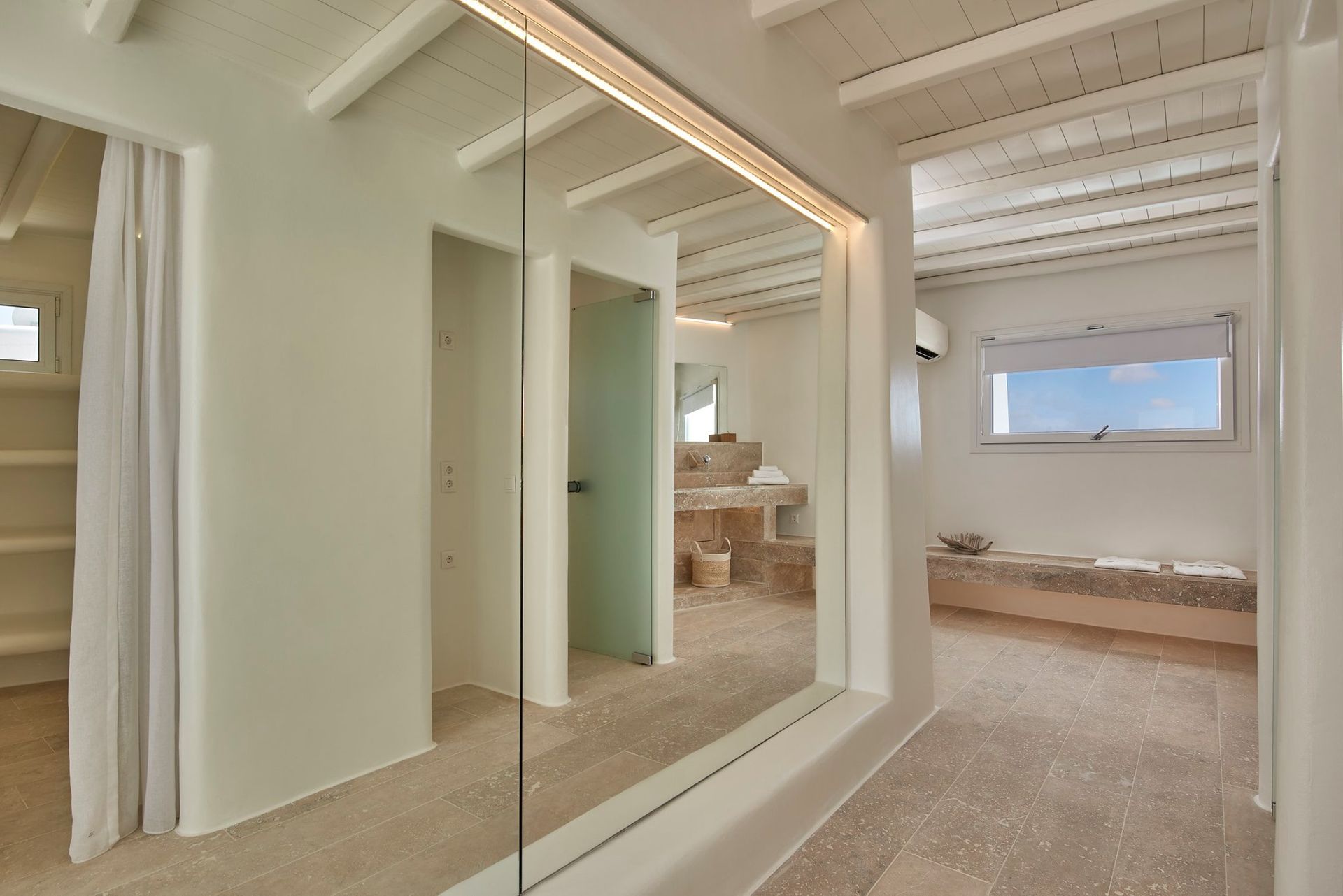 The villa’s main swimming pool 150 sq.m overflows with perimeter waterfalls in two smaller pools and a hot tub for 6 people. These two are below the main pool and at different levels. The main poolis located at the middle level in the center of the courtyard and is surrounded by marble floors of 500 square meters, with 3 large built-in outdoor living rooms with lovely pillows and panoramic views of the bay and the island of Mykonos.