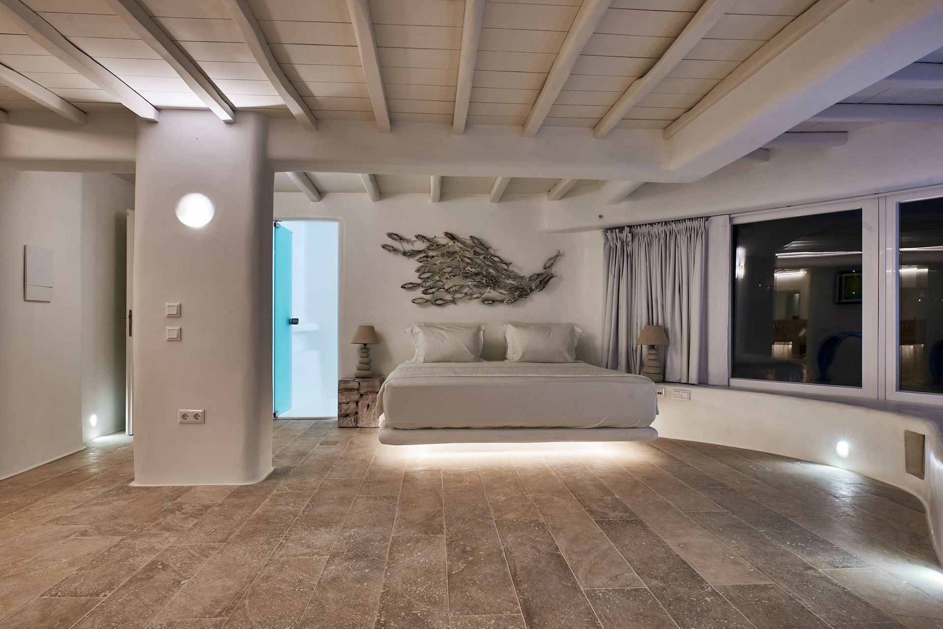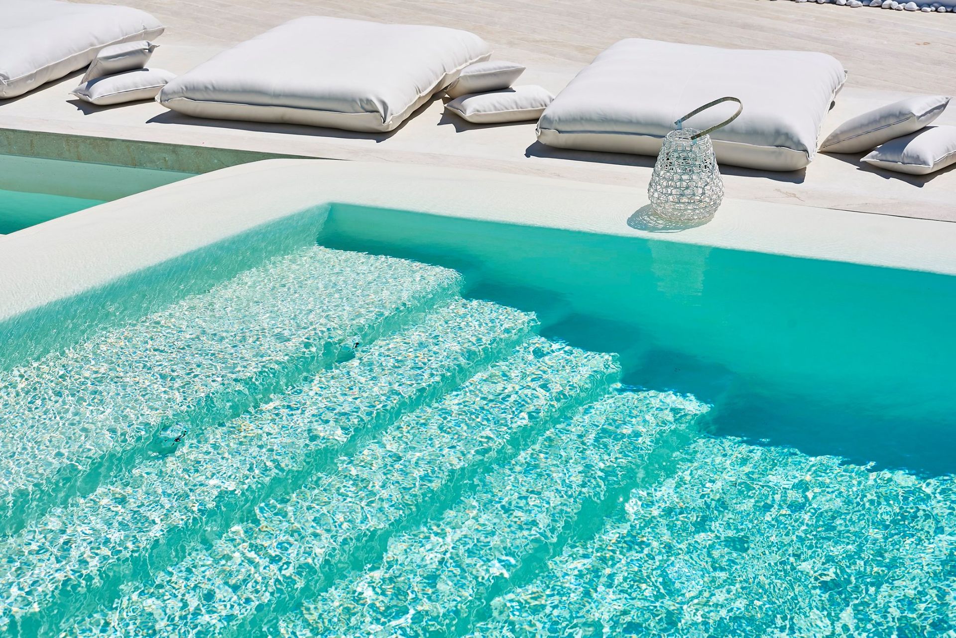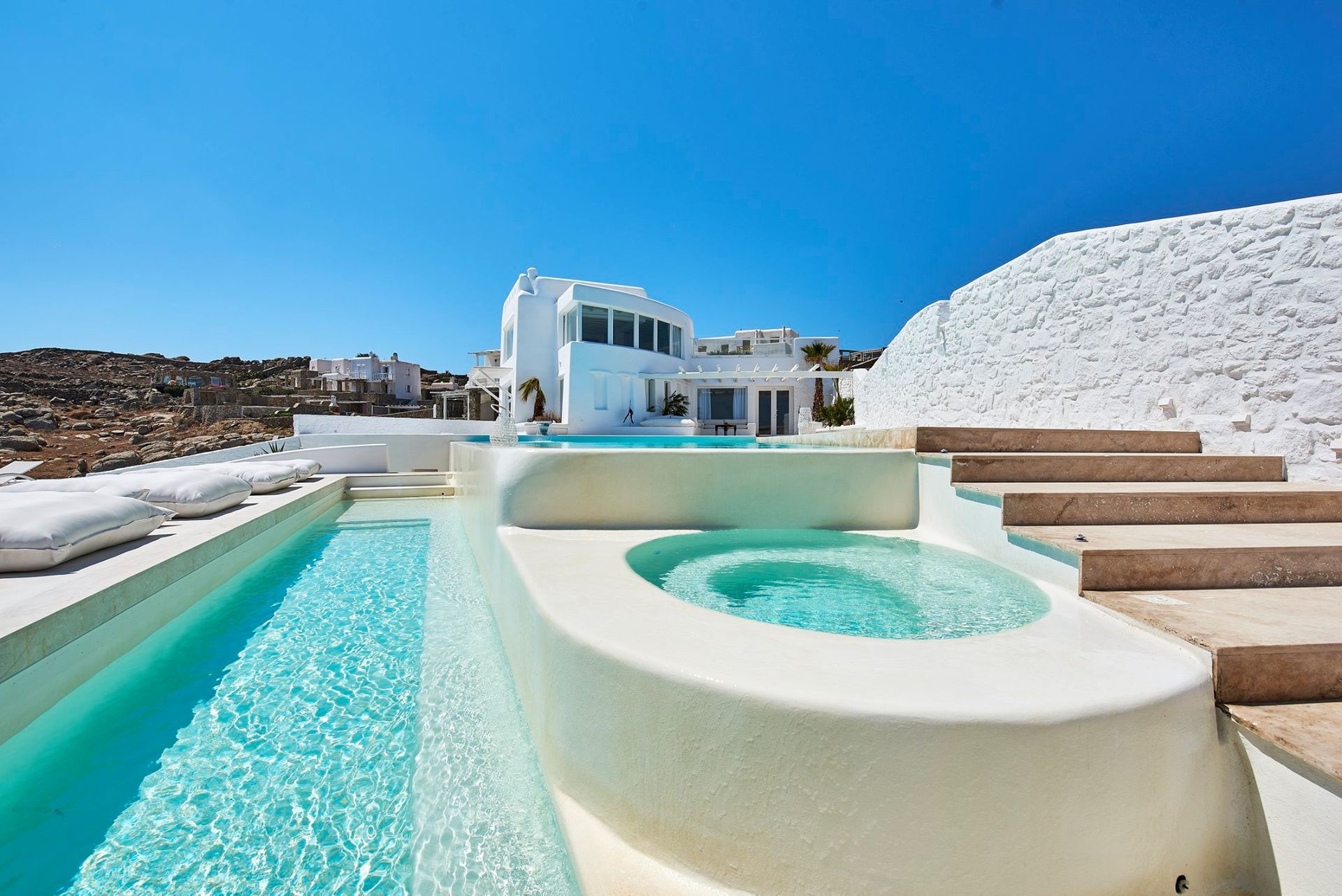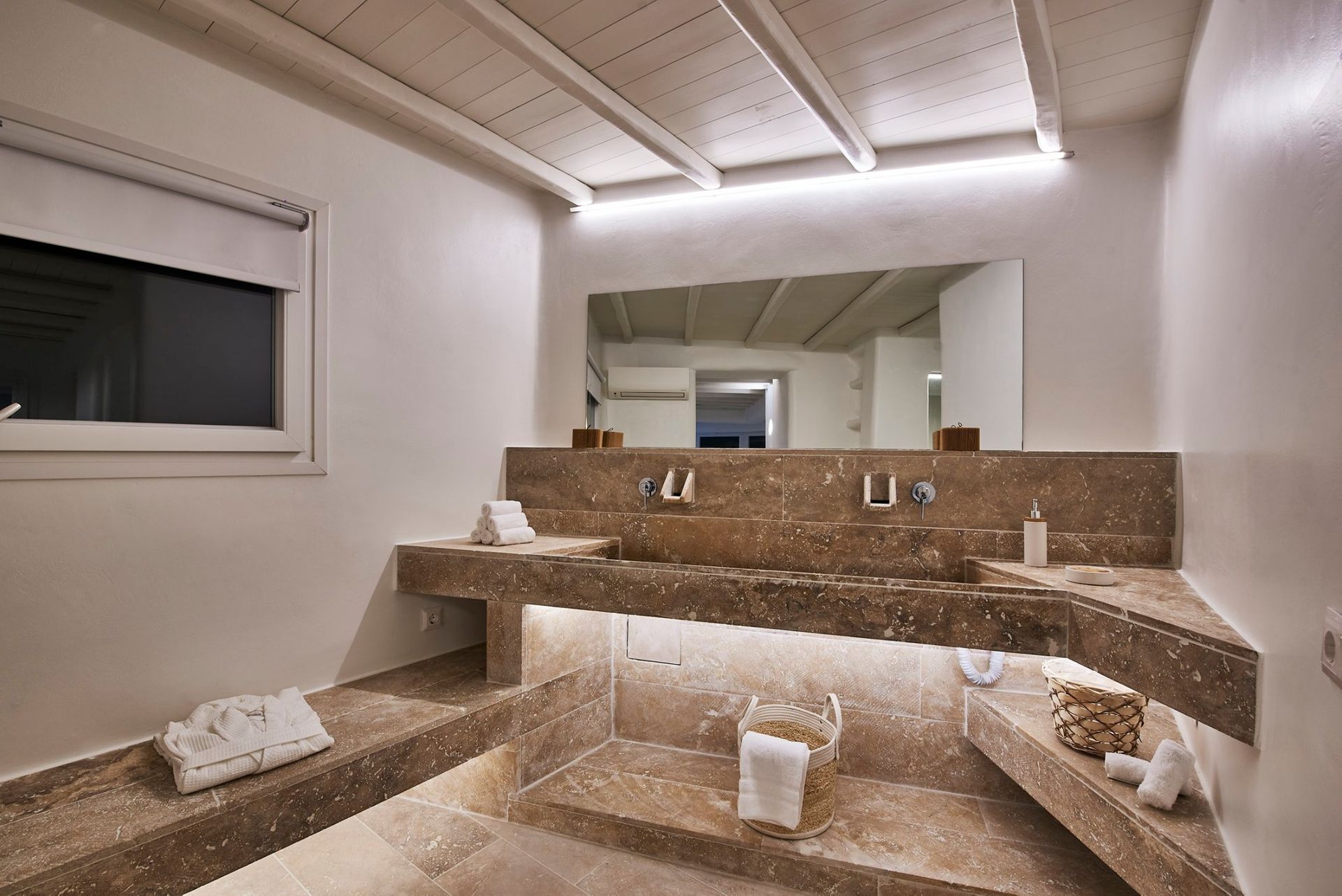 The villa’s main swimming pool 150 sq.m overflows with perimeter waterfalls in two smaller pools and a hot tub for 6 people. These two are below the main pool and at different levels. The main poolis located at the middle level in the center of the courtyard and is surrounded by marble floors of 500 square meters, with 3 large built-in outdoor living rooms with lovely pillows and panoramic views of the bay and the island of Mykonos.