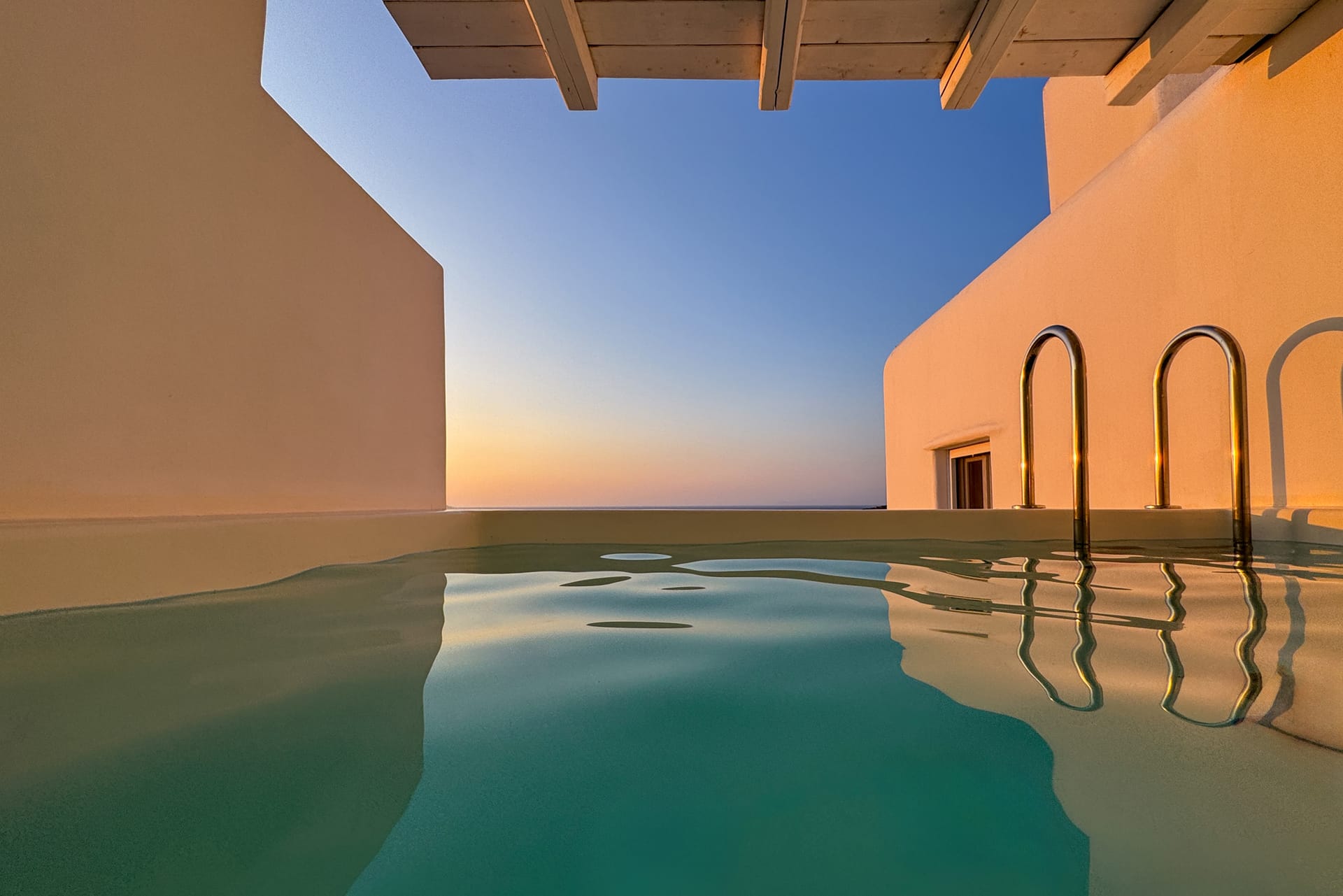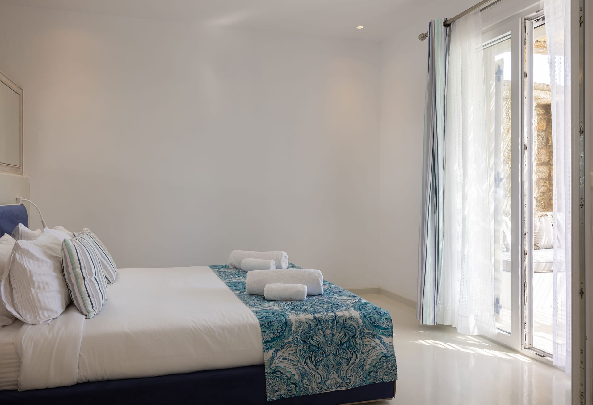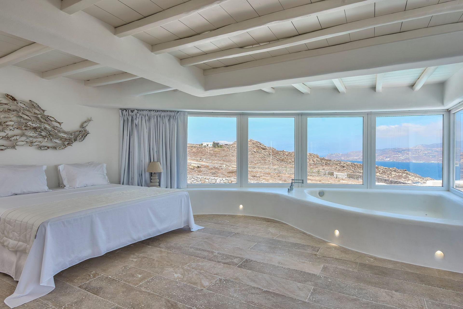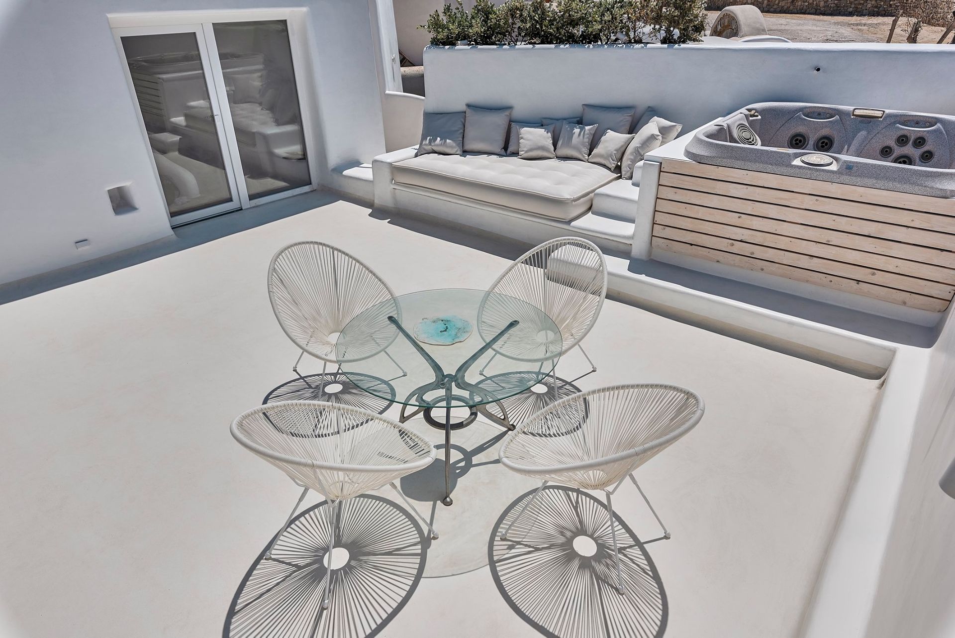 The villa’s main swimming pool 150 sq.m overflows with perimeter waterfalls in two smaller pools and a hot tub for 6 people. These two are below the main pool and at different levels. The main poolis located at the middle level in the center of the courtyard and is surrounded by marble floors of 500 square meters, with 3 large built-in outdoor living rooms with lovely pillows and panoramic views of the bay and the island of Mykonos.