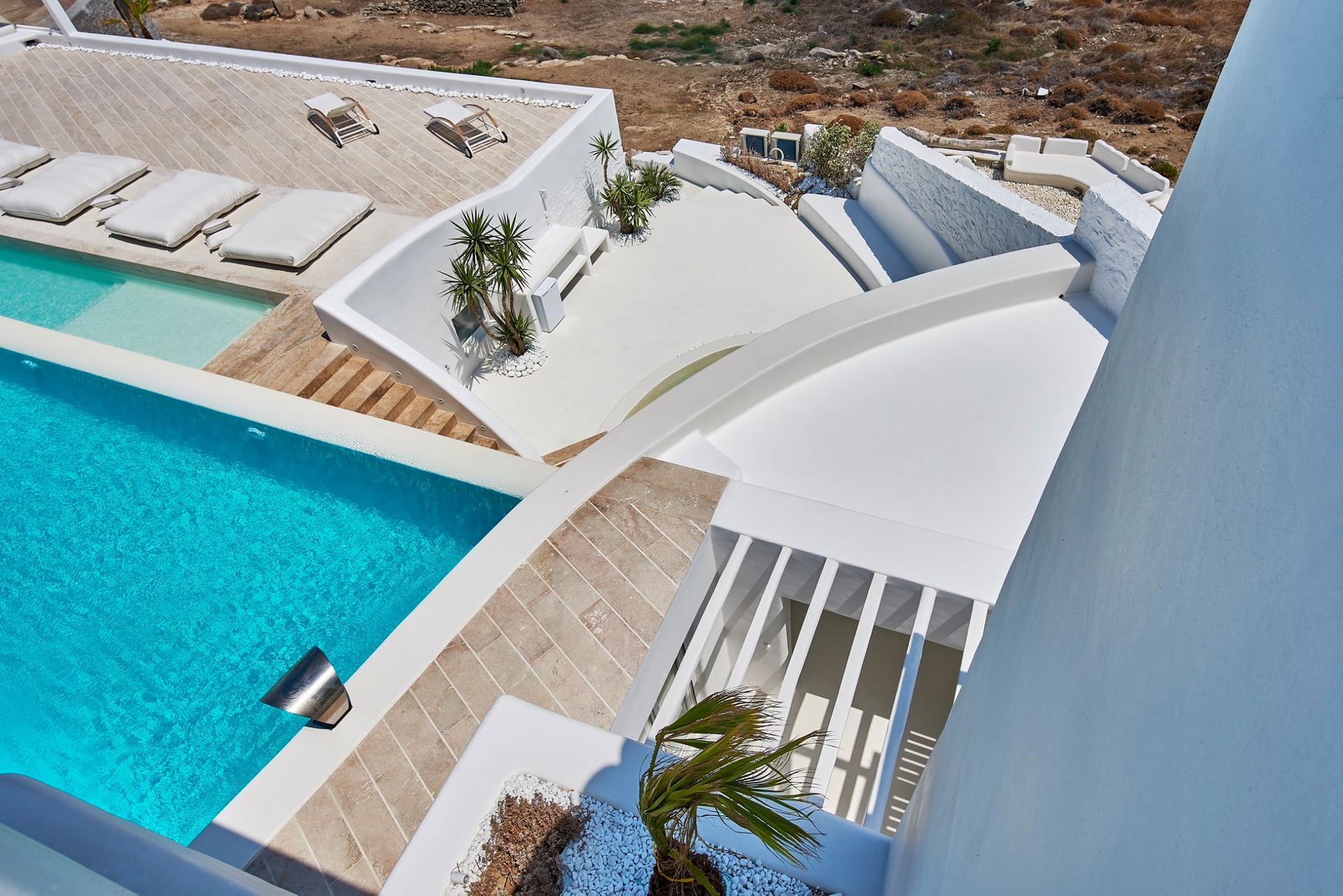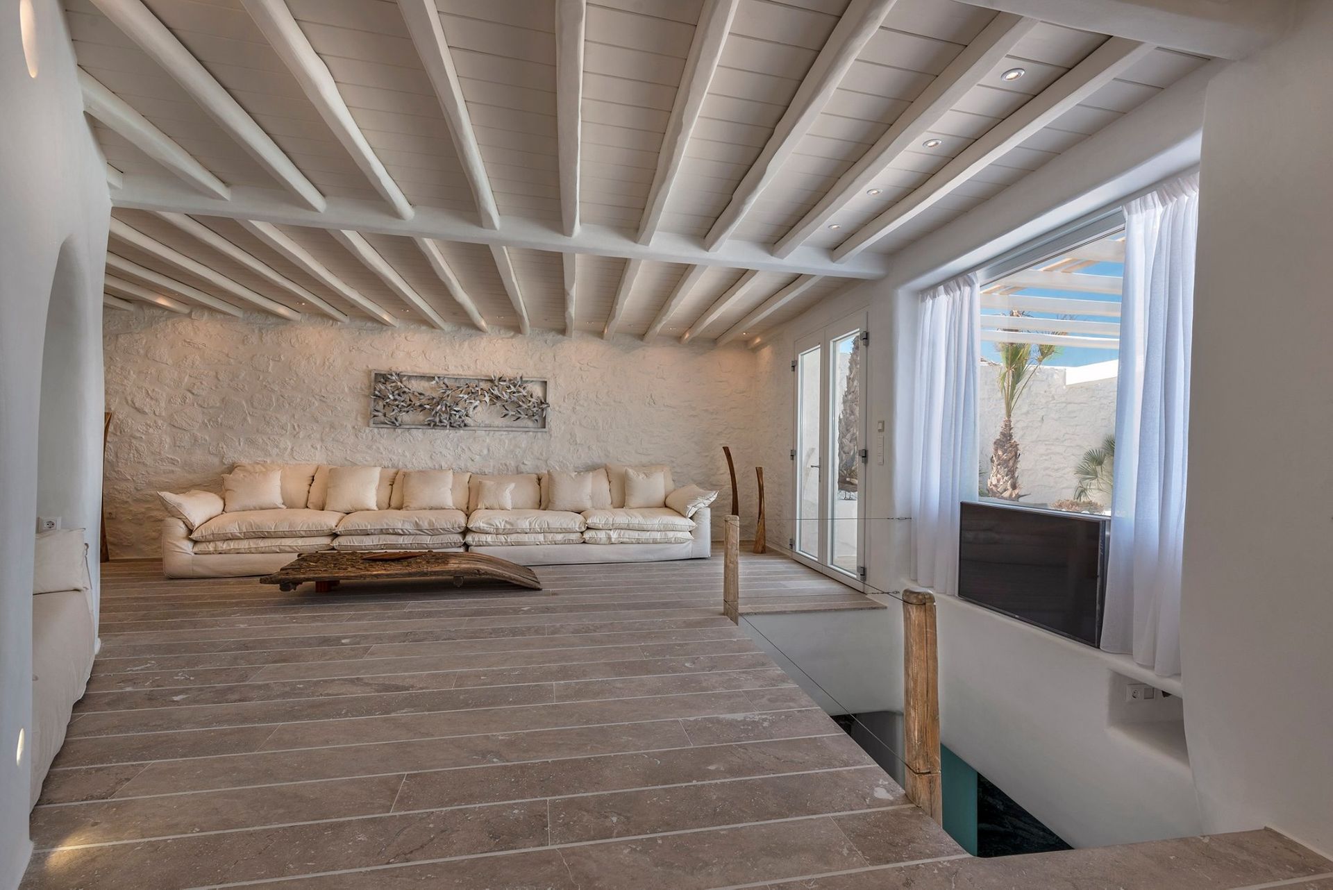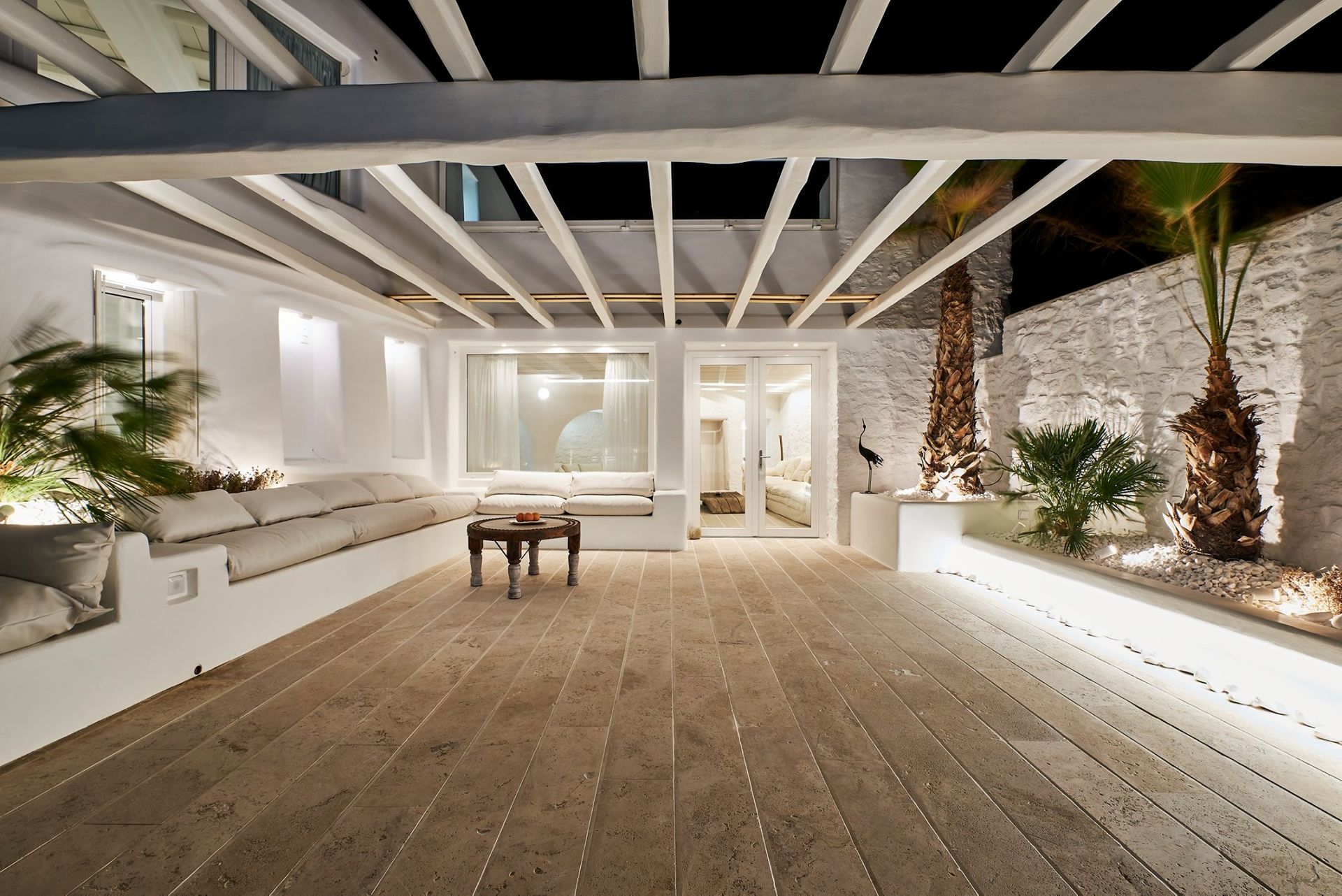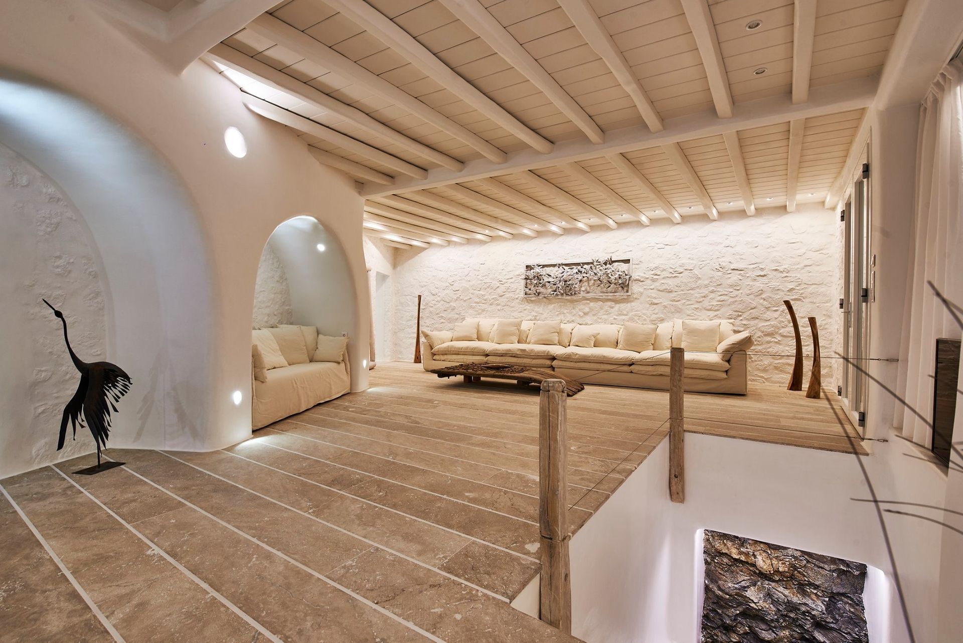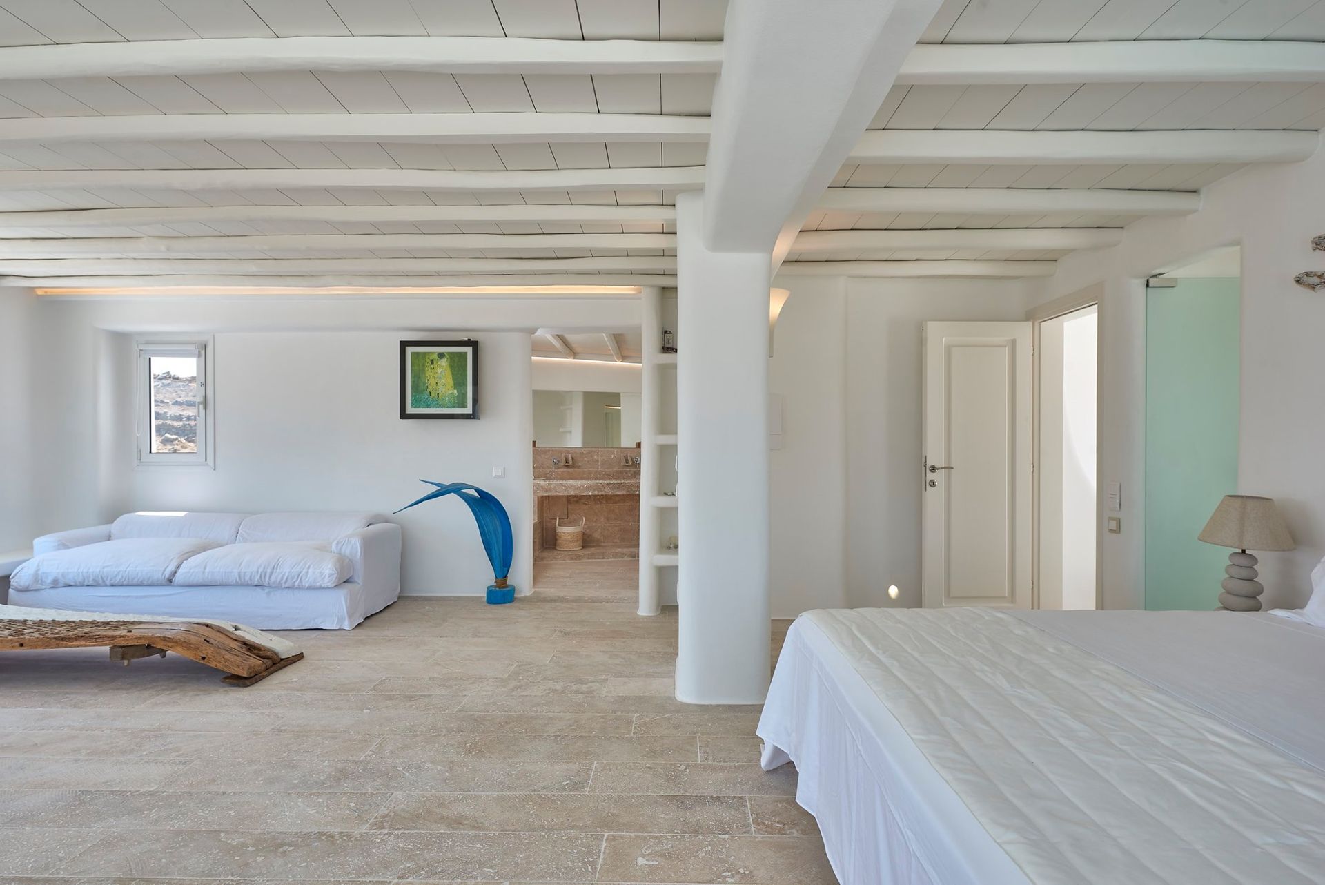 The plot, on which the villa is built, is 1.200 sq.m and it is fully configured at different levels which are oriented towards the stunning view of the island. The predominant colours are white and the beige tones of raw limestone ‘travertino’. The amazing architecture of the villa is characterized by a strong sculptural style with predominantly elements of Mykonian tradition, in combination with art and minimal influences. This creates an exotic and dreamy elegant atmosphere.