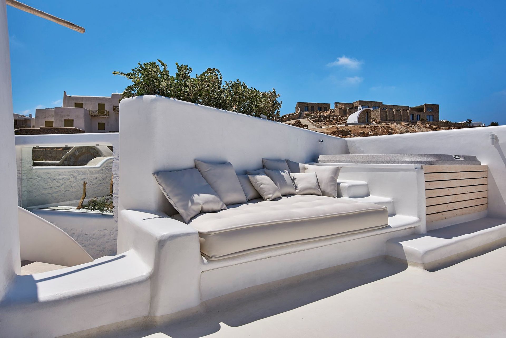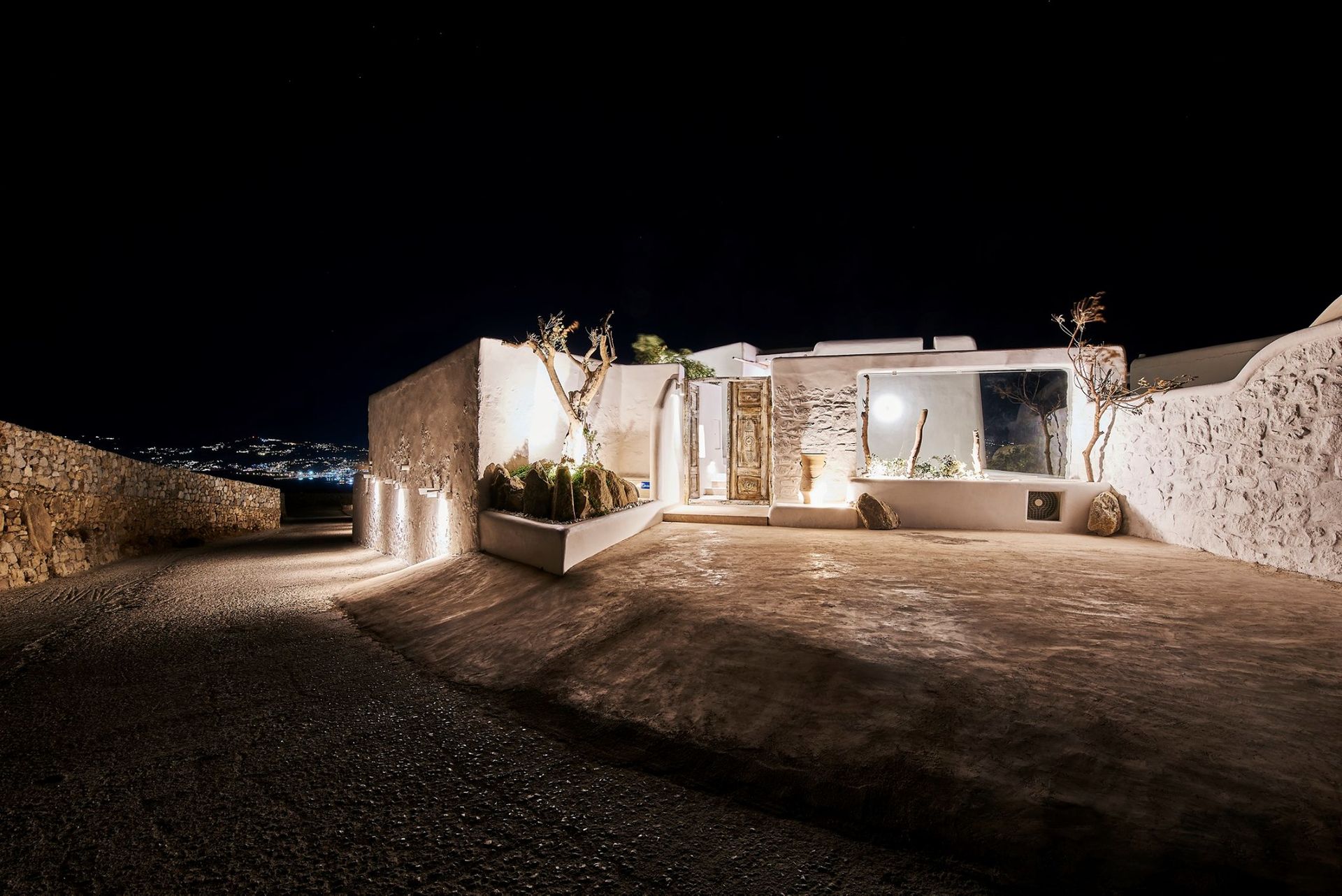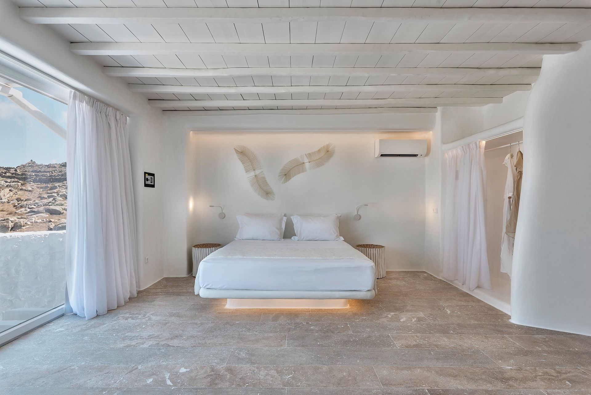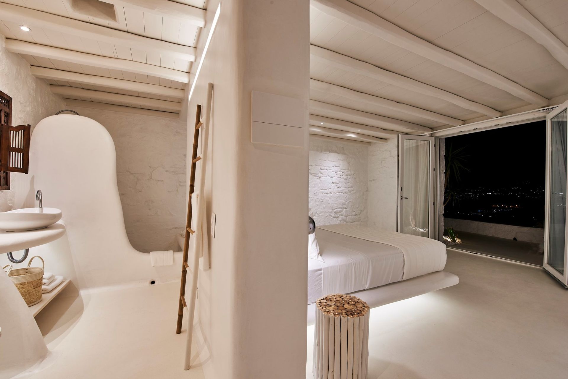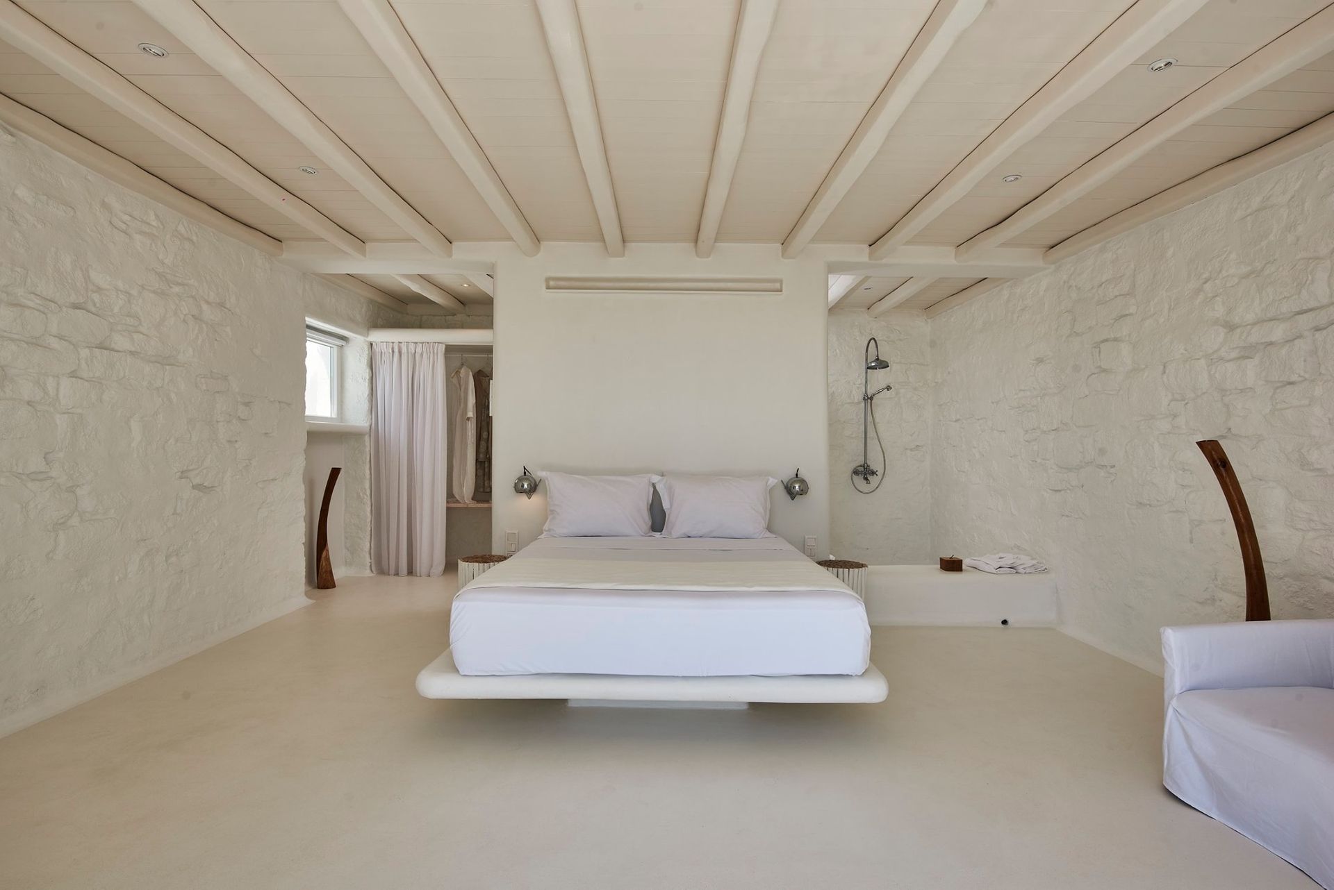 The plot, on which the villa is built, is 1.200 sq.m and it is fully configured at different levels which are oriented towards the stunning view of the island. The predominant colours are white and the beige tones of raw limestone ‘travertino’. The amazing architecture of the villa is characterized by a strong sculptural style with predominantly elements of Mykonian tradition, in combination with art and minimal influences. This creates an exotic and dreamy elegant atmosphere.