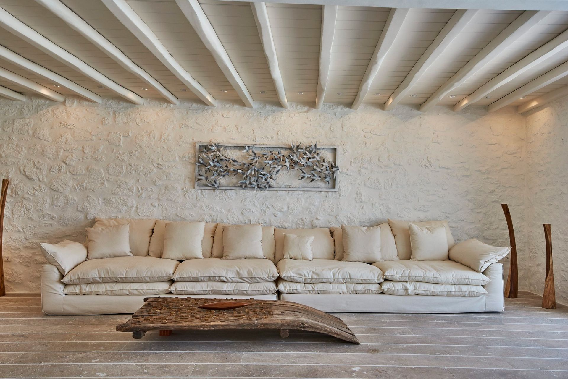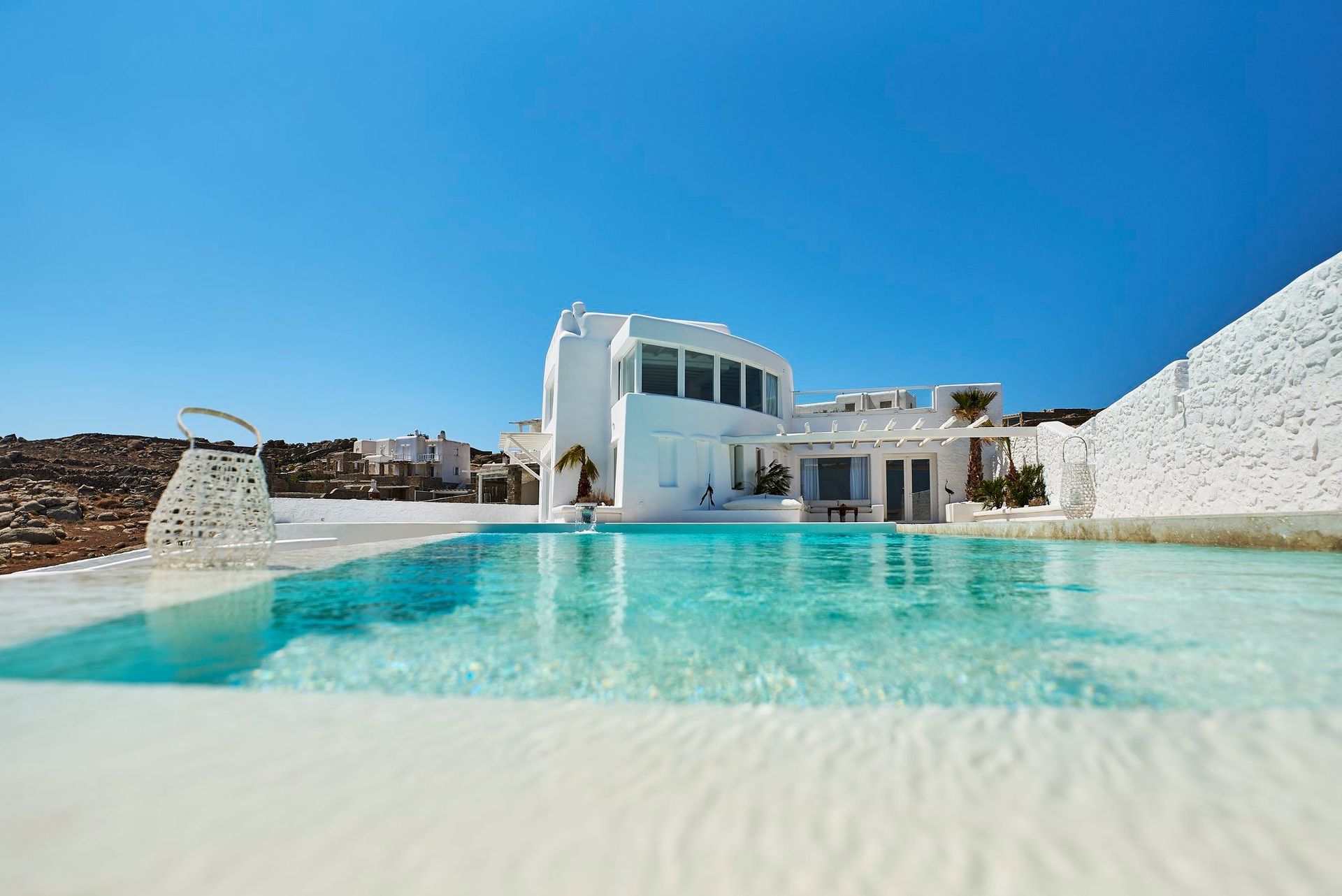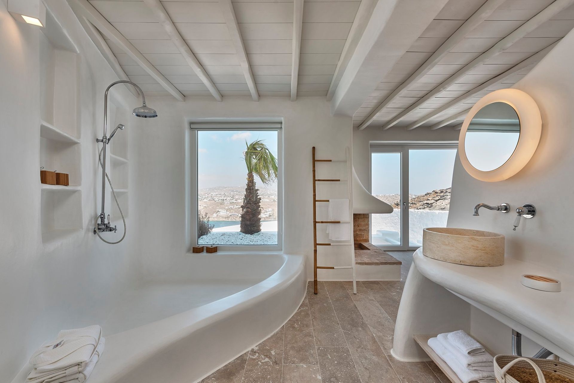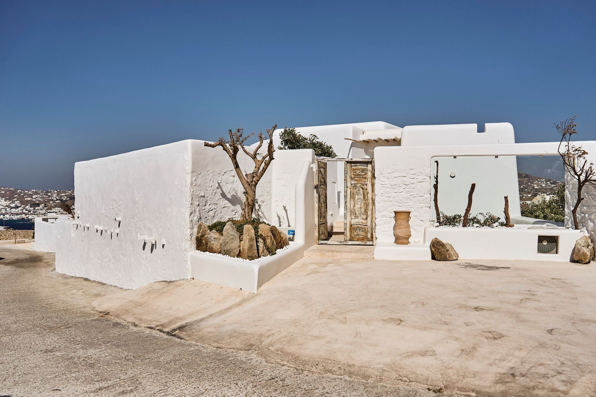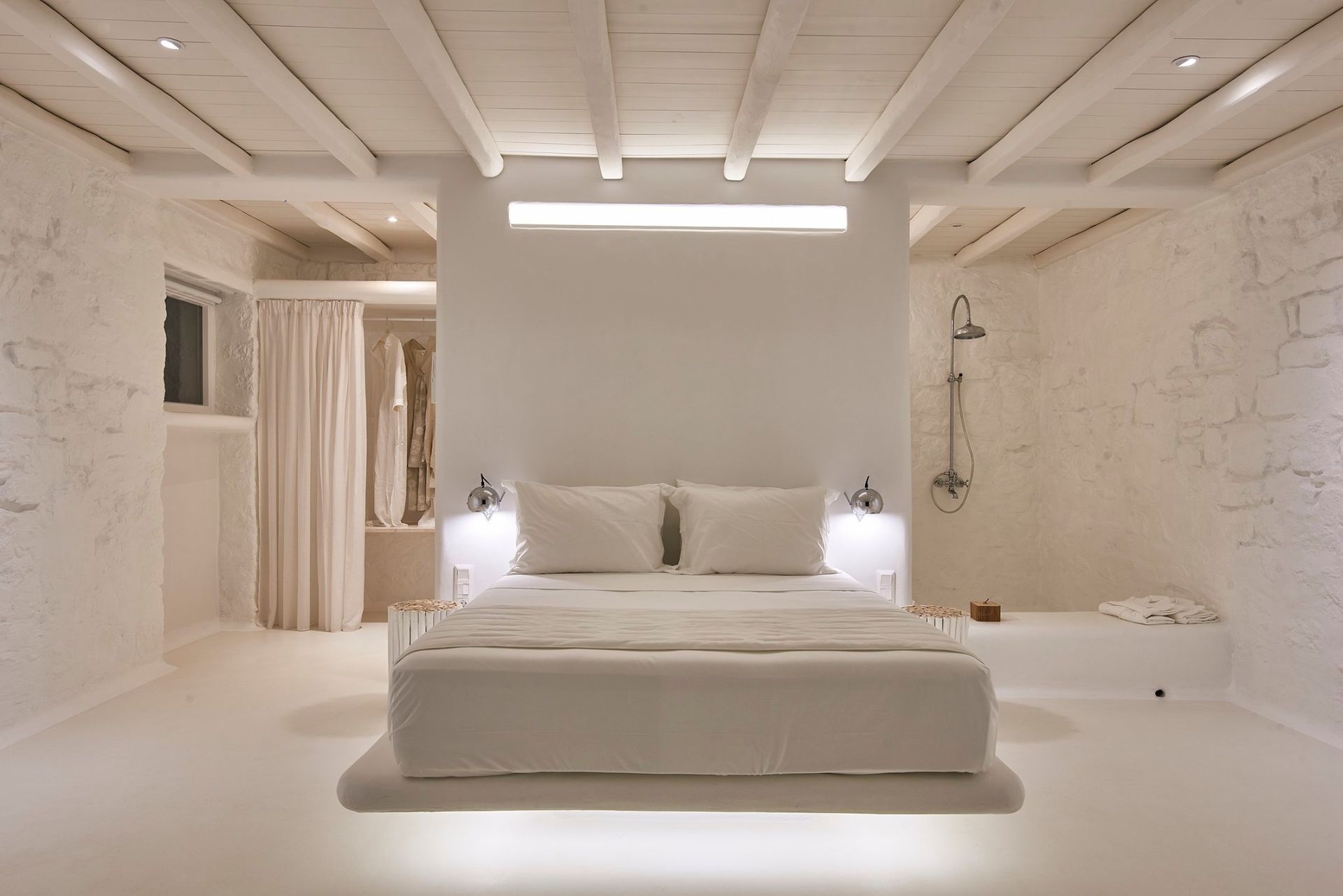The plot, on which the villa is built, is 1.200 sq.m and it is fully configured at different levels which are oriented towards the stunning view of the island. The predominant colours are white and the beige tones of raw limestone ‘travertino’. The amazing architecture of the villa is characterized by a strong sculptural style with predominantly elements of Mykonian tradition, in combination with art and minimal influences. This creates an exotic and dreamy elegant atmosphere.
