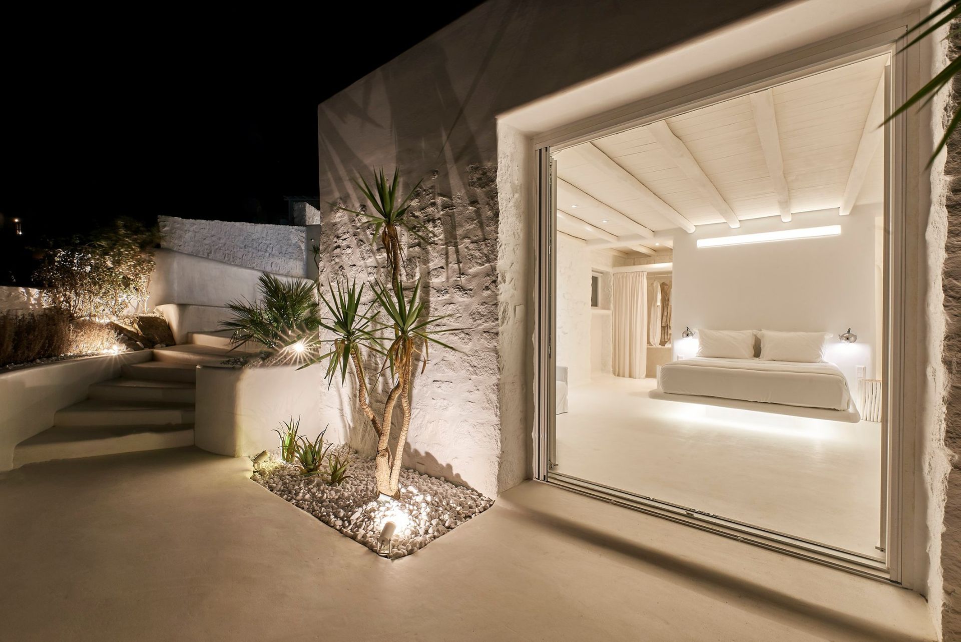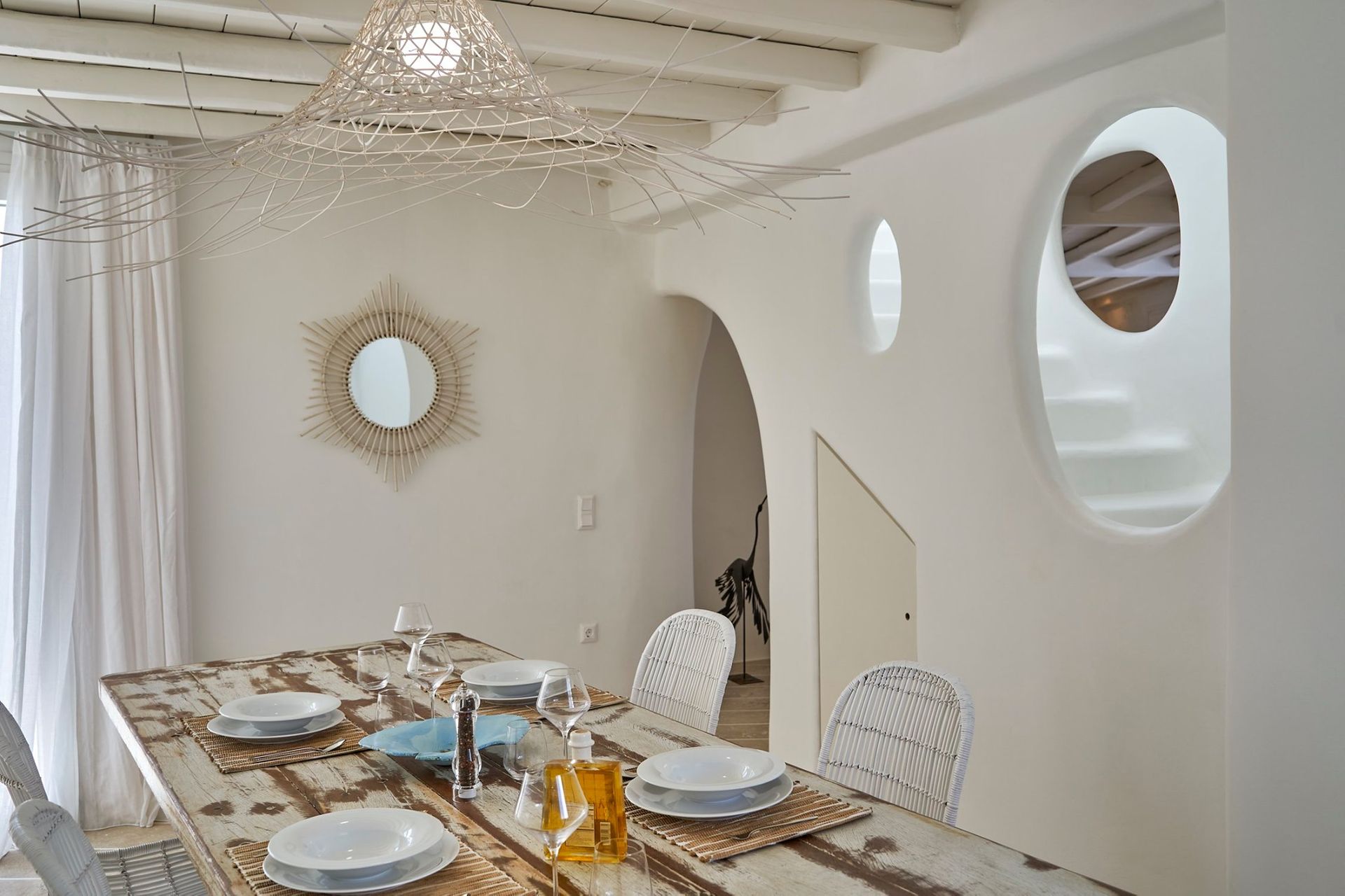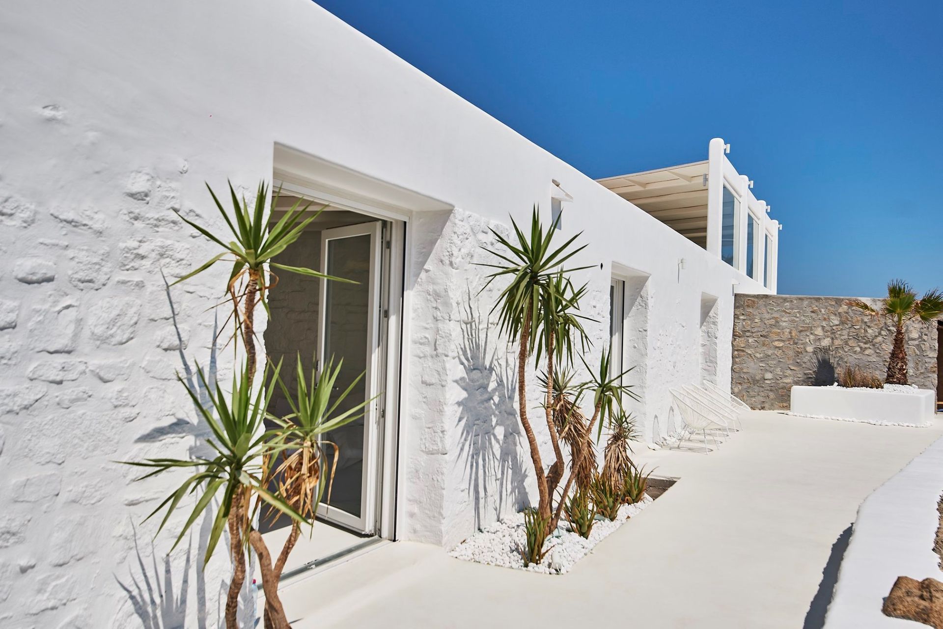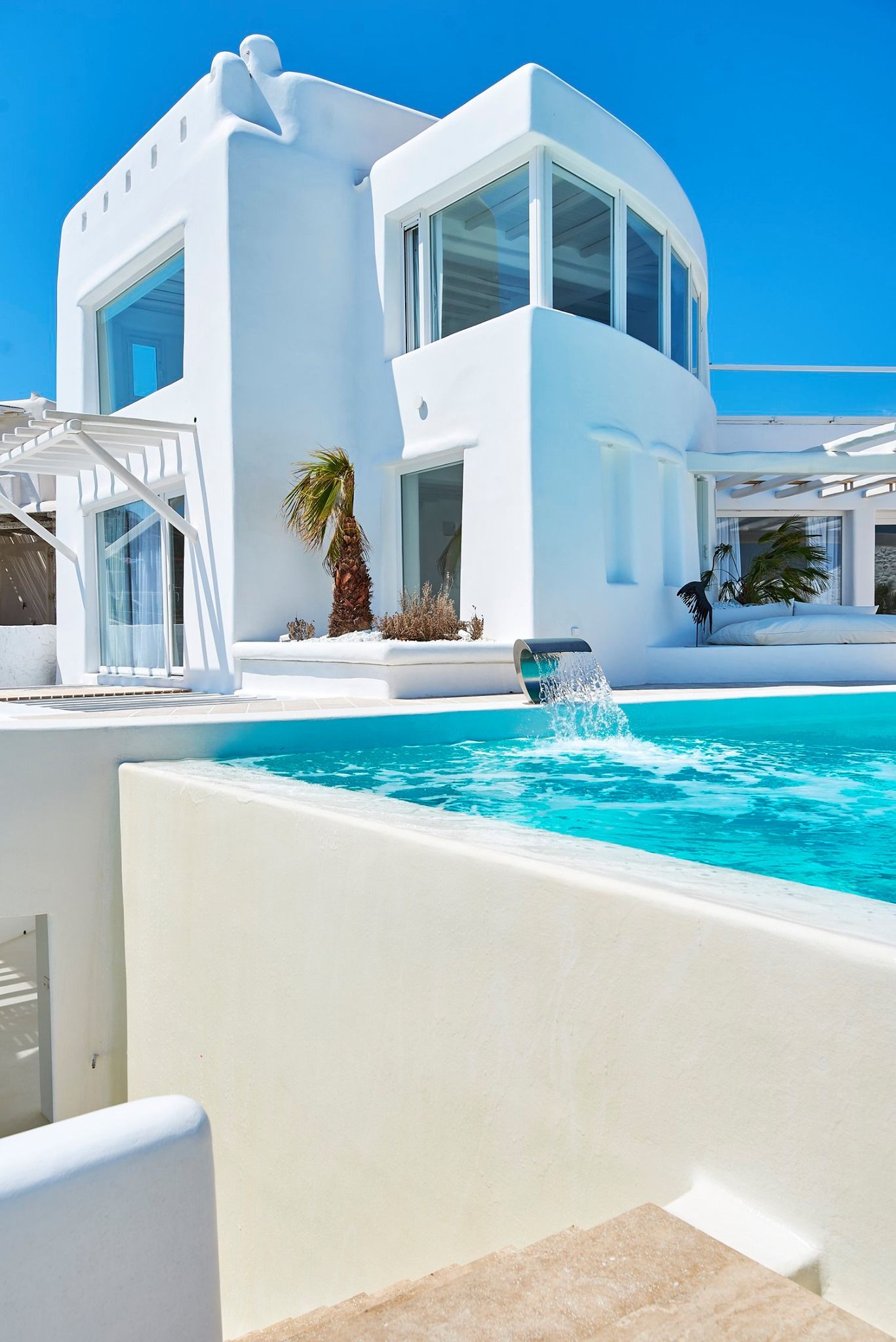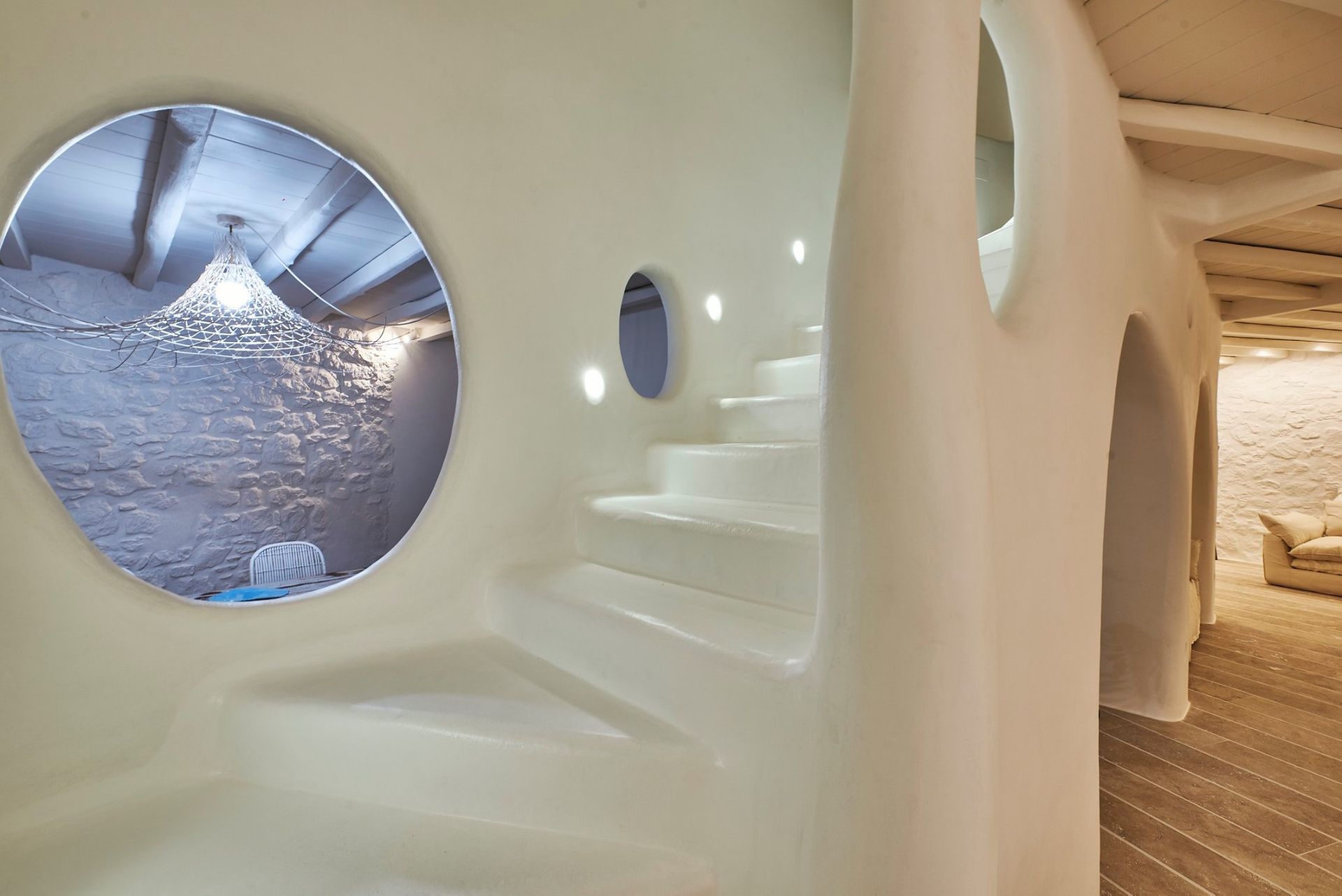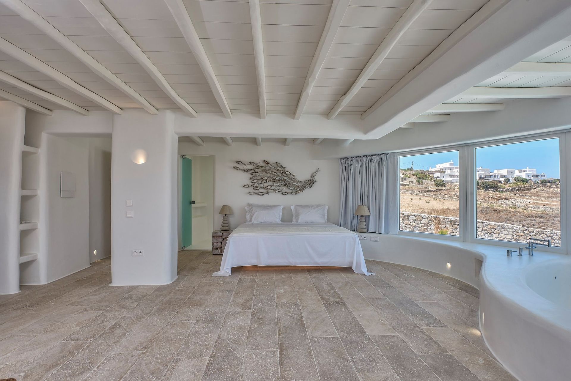 The plot, on which the villa is built, is 1.200 sq.m and it is fully configured at different levels which are oriented towards the stunning view of the island. The predominant colours are white and the beige tones of raw limestone ‘travertino’. The amazing architecture of the villa is characterized by a strong sculptural style with predominantly elements of Mykonian tradition, in combination with art and minimal influences. This creates an exotic and dreamy elegant atmosphere.
