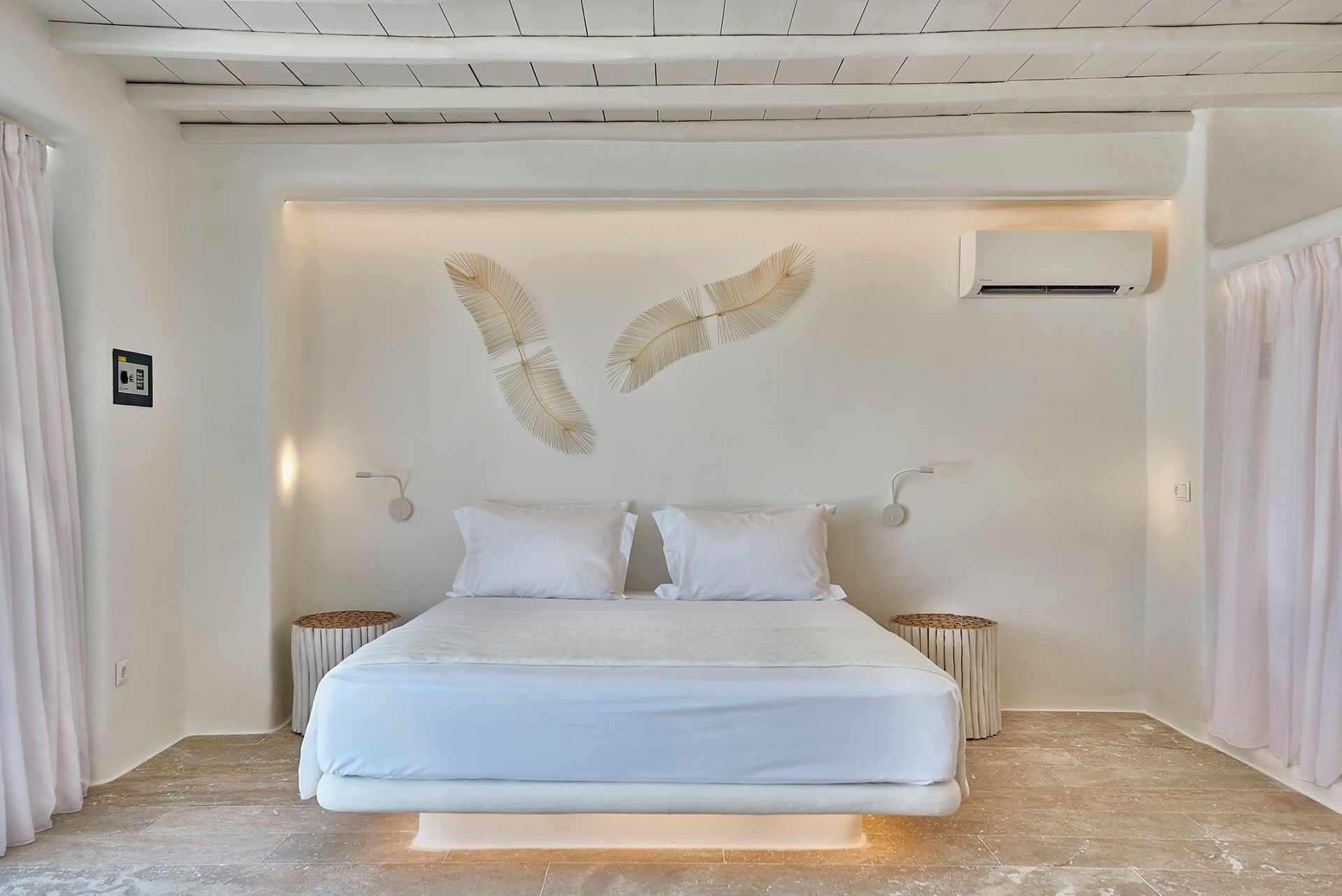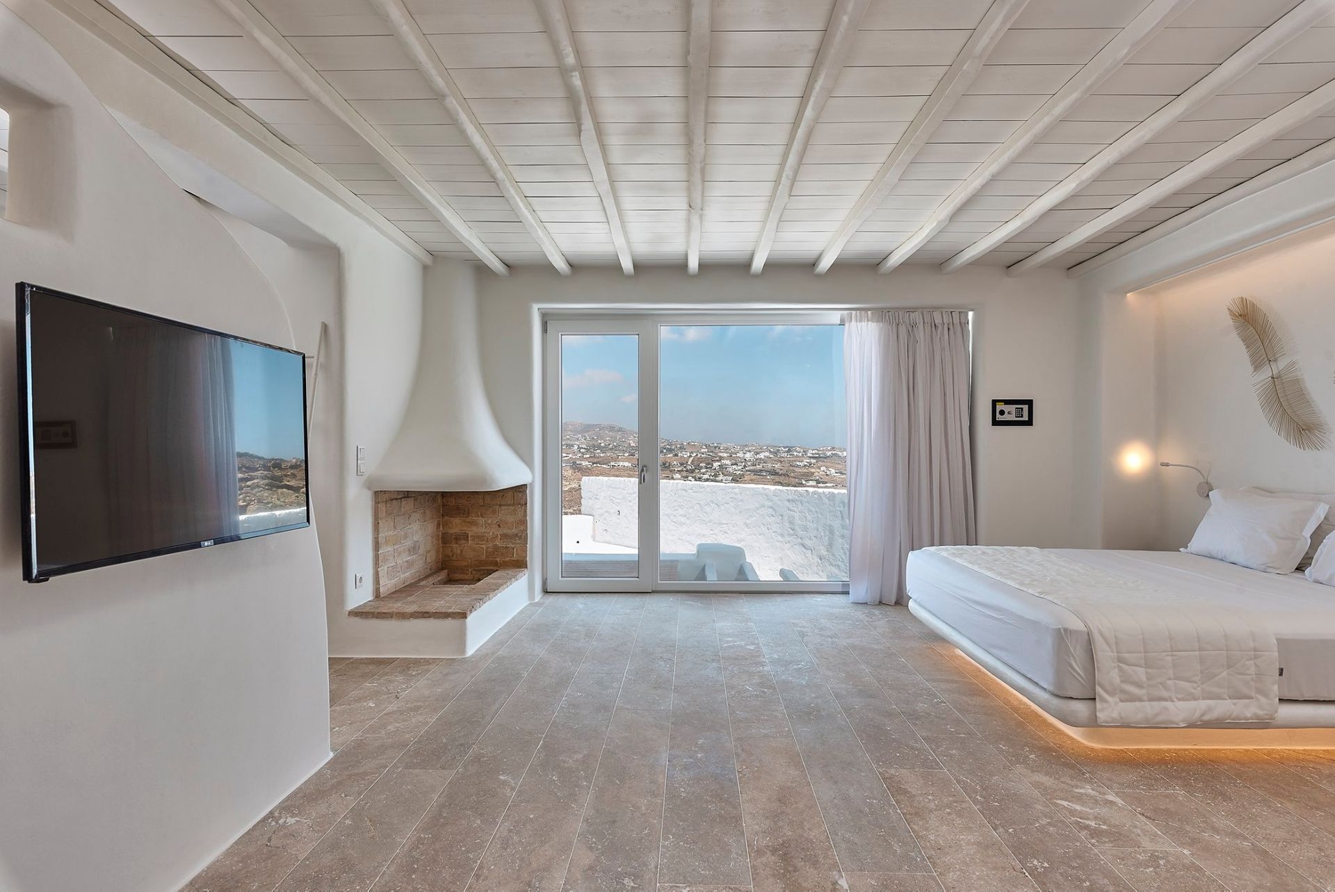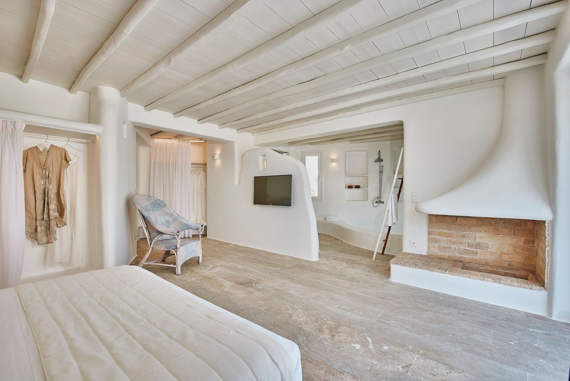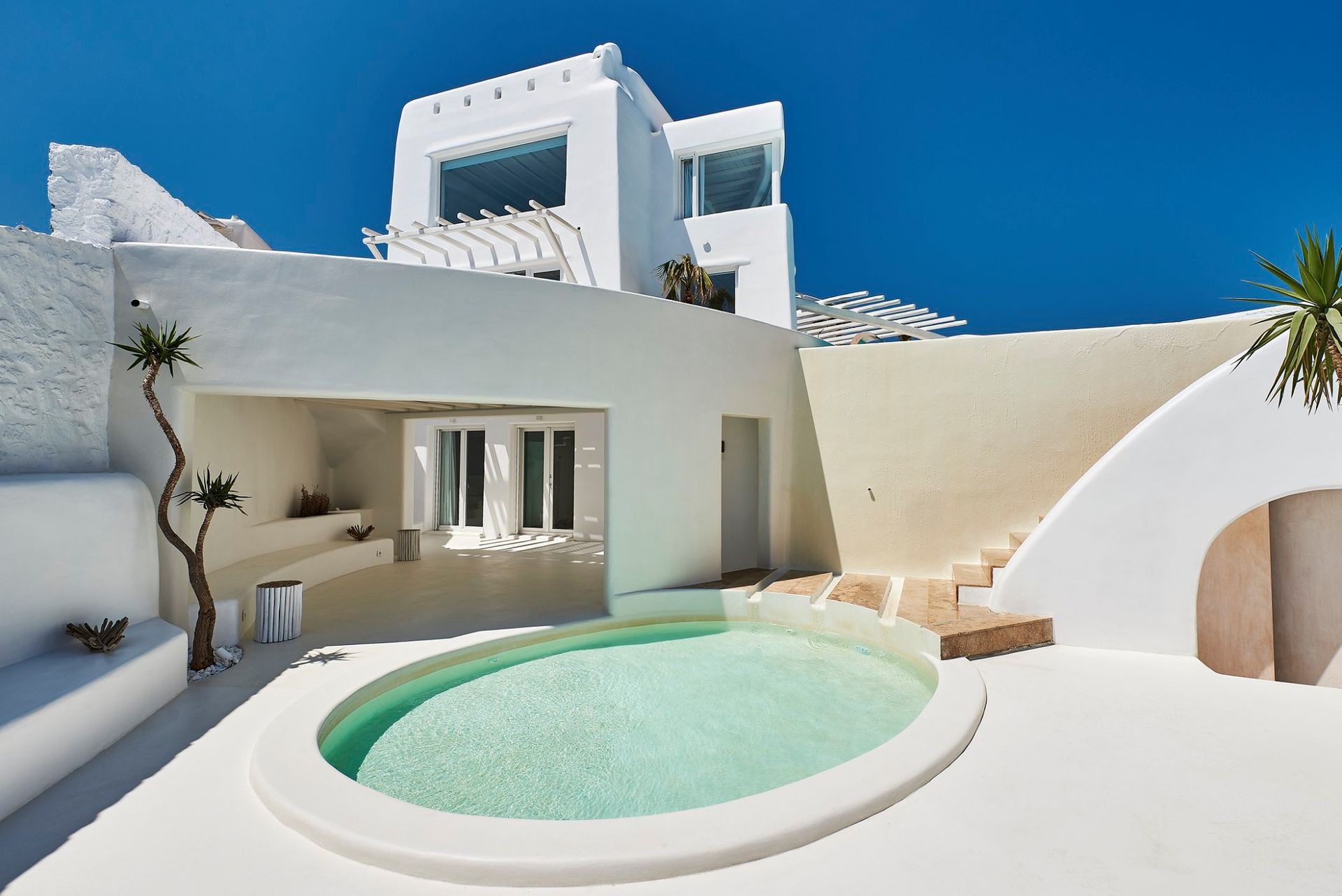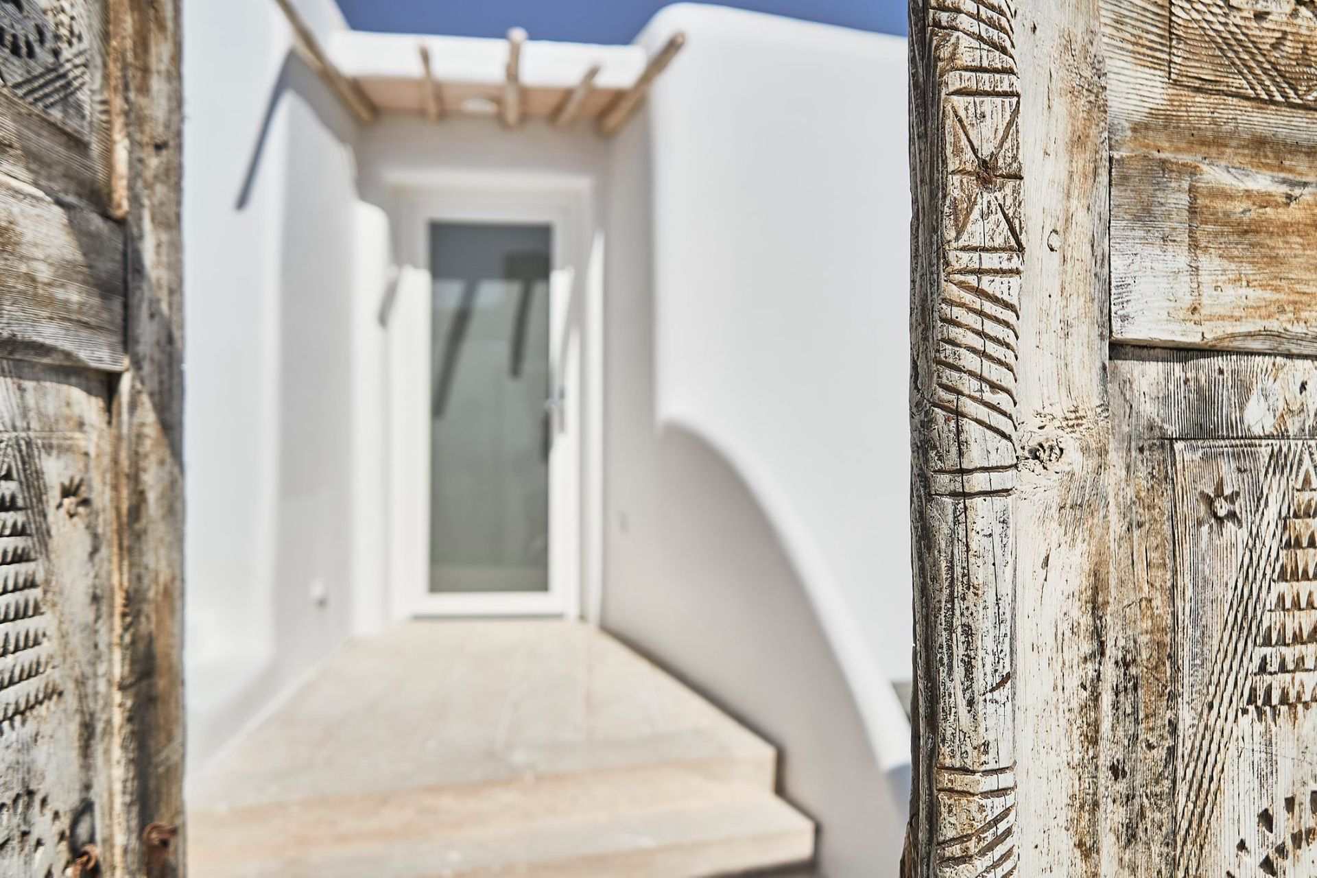 The plot, on which the villa is built, is 1.200 sq.m and it is fully configured at different levels which are oriented towards the stunning view of the island. The predominant colours are white and the beige tones of raw limestone ‘travertino’. The amazing architecture of the villa is characterized by a strong sculptural style with predominantly elements of Mykonian tradition, in combination with art and minimal influences. This creates an exotic and dreamy elegant atmosphere.