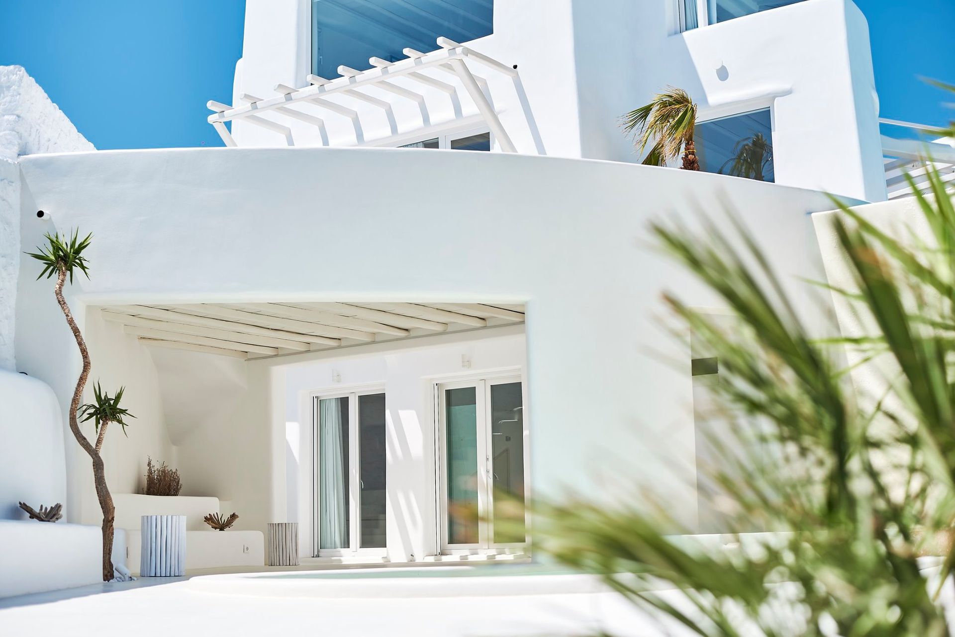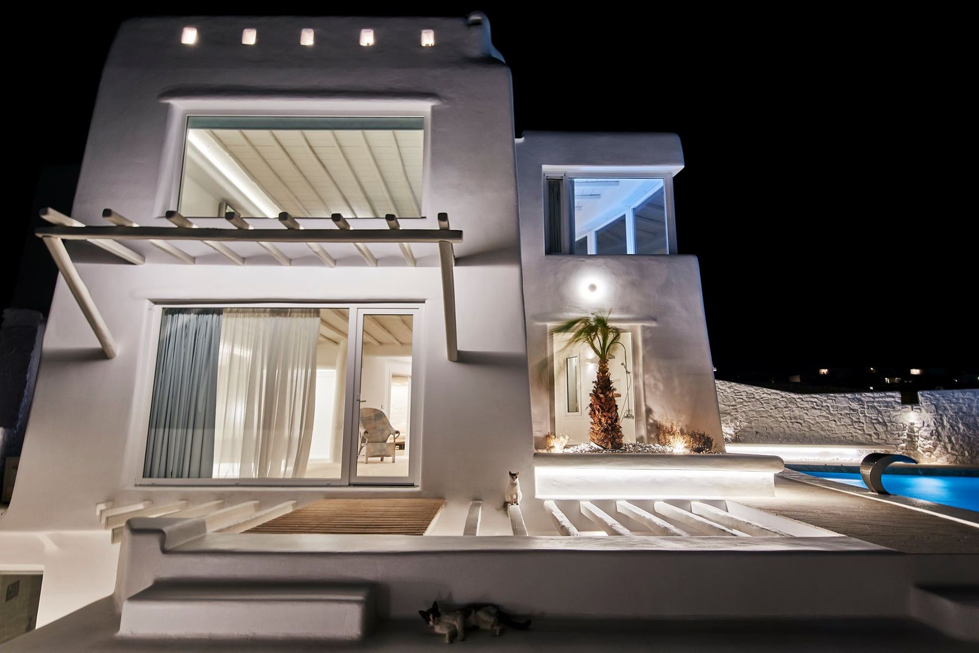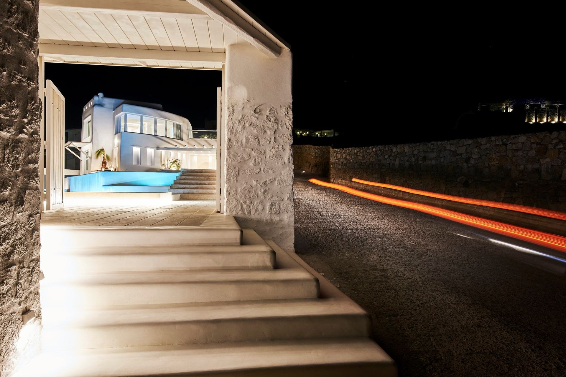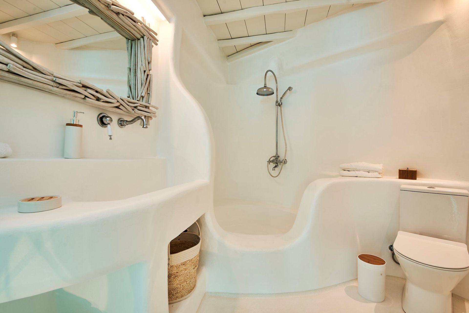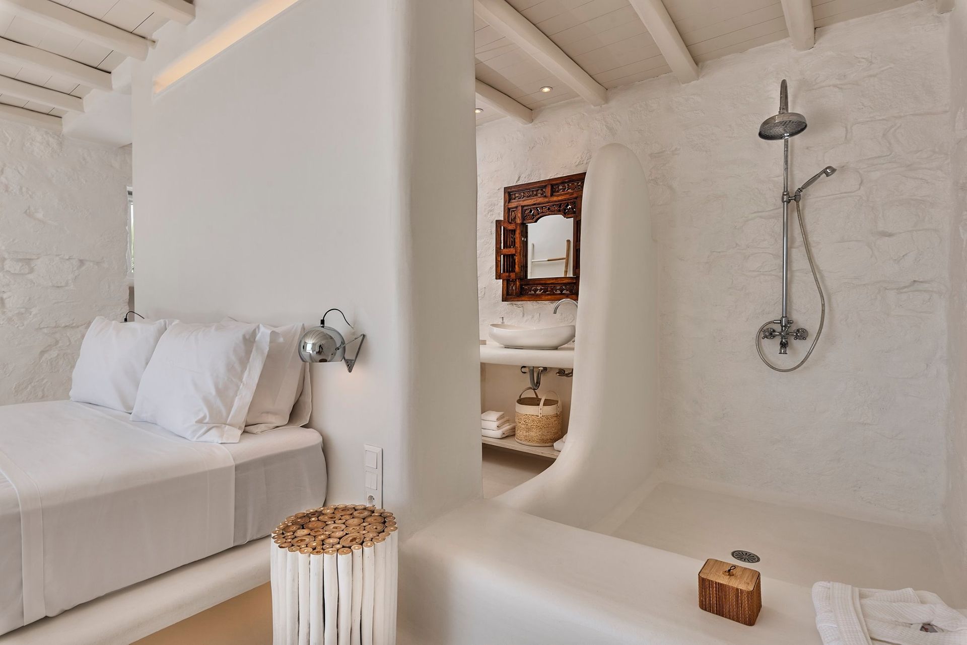 The plot, on which the villa is built, is 1.200 sq.m and it is fully configured at different levels which are oriented towards the stunning view of the island. The predominant colours are white and the beige tones of raw limestone ‘travertino’. The amazing architecture of the villa is characterized by a strong sculptural style with predominantly elements of Mykonian tradition, in combination with art and minimal influences. This creates an exotic and dreamy elegant atmosphere.