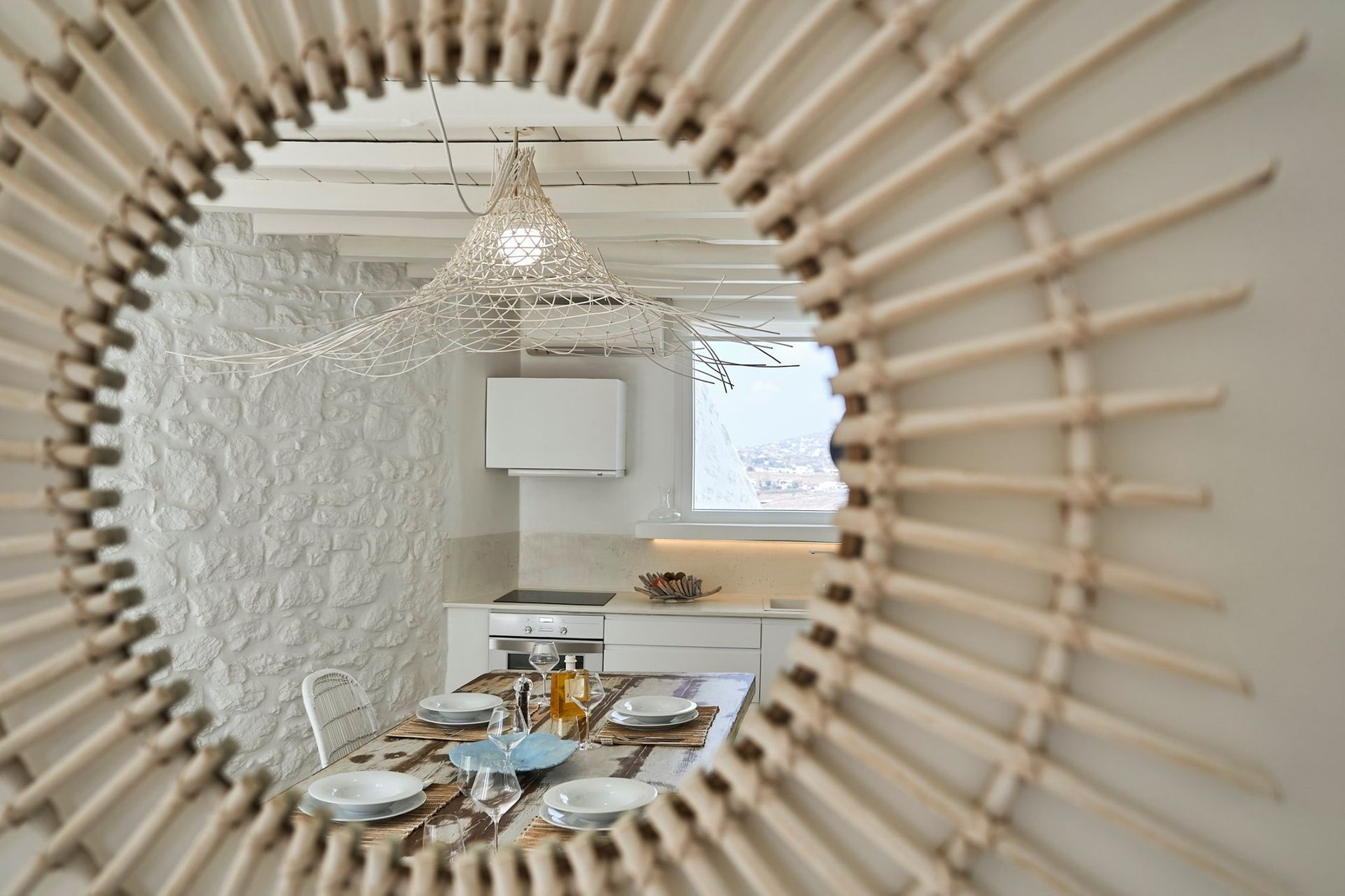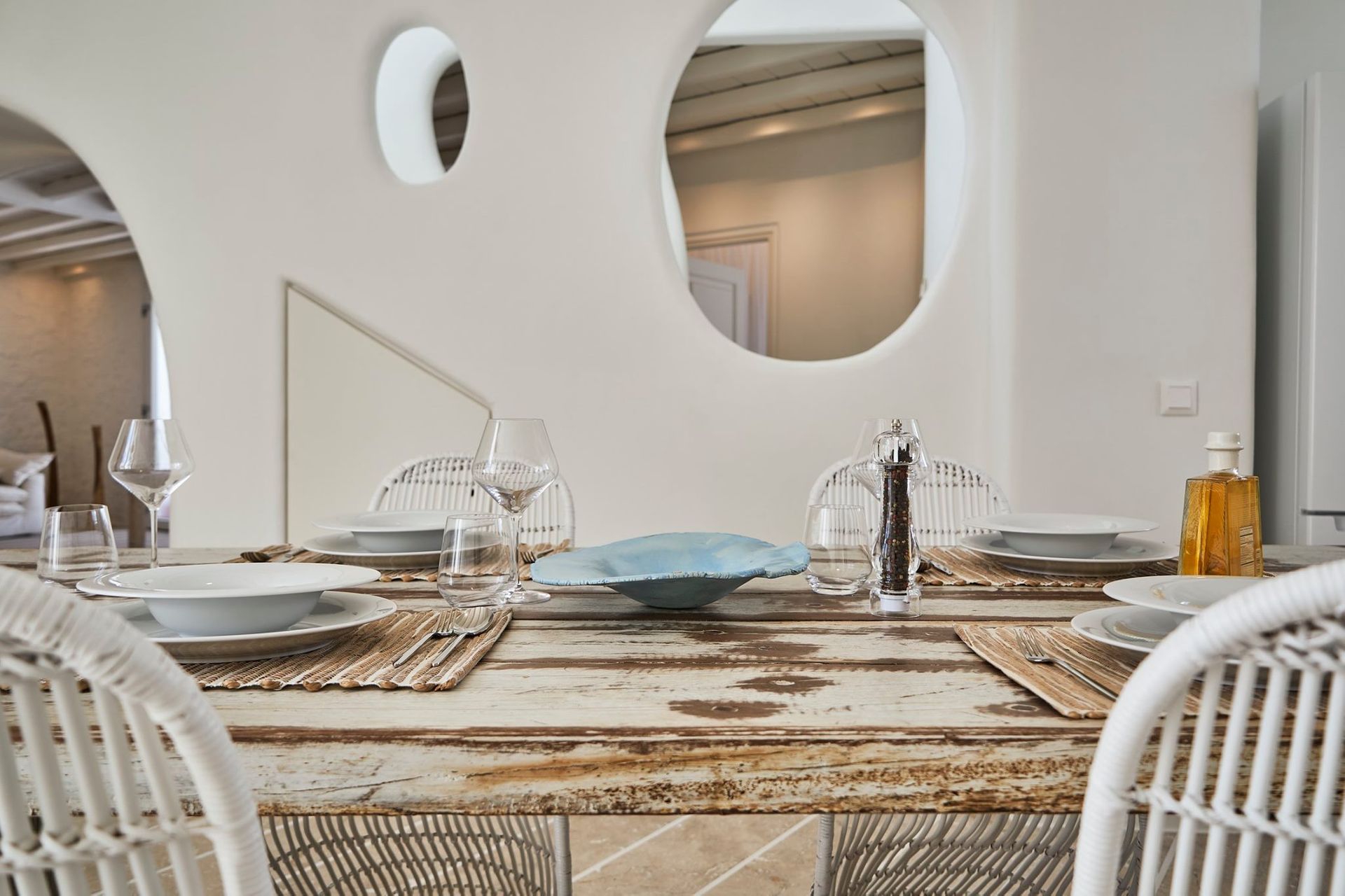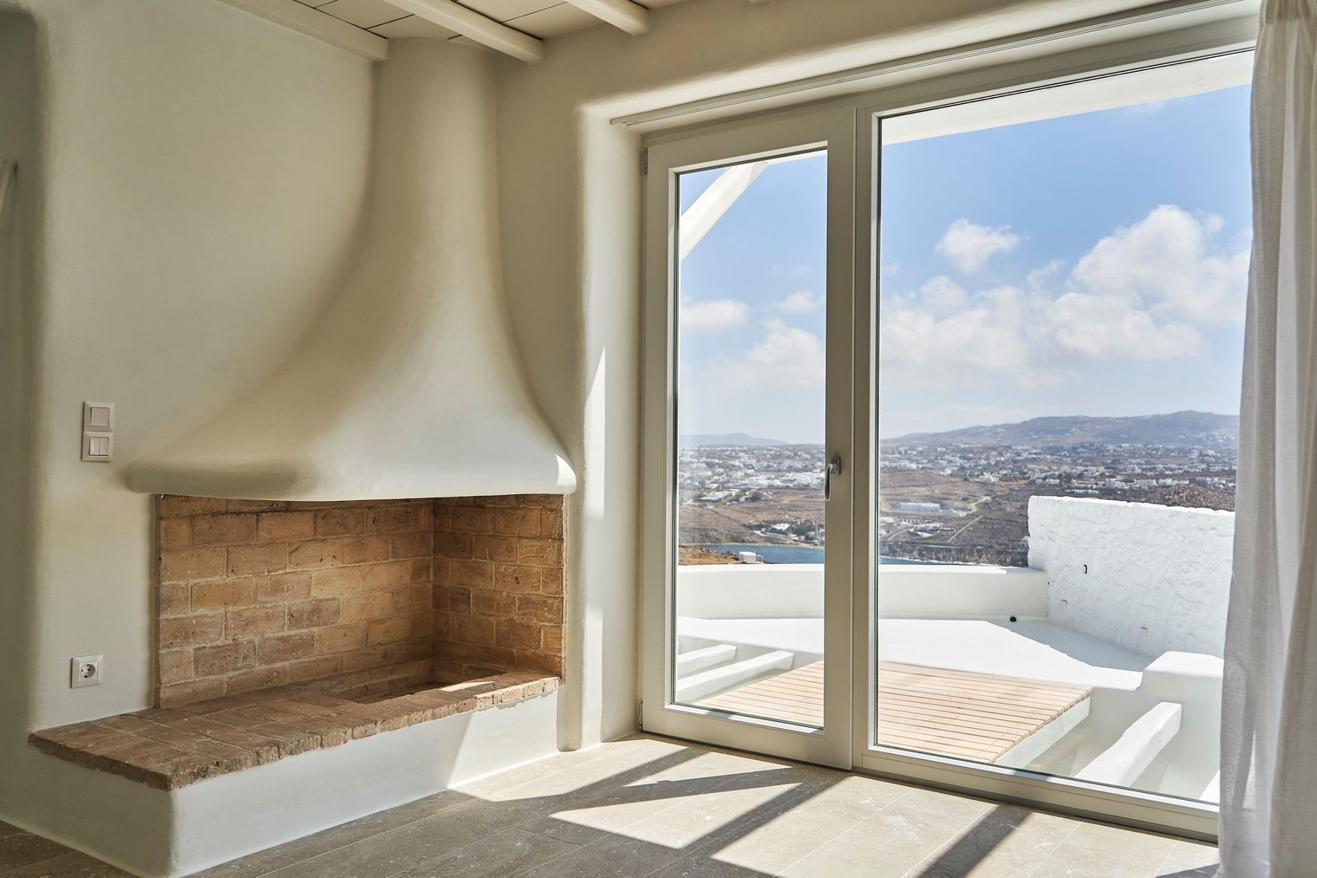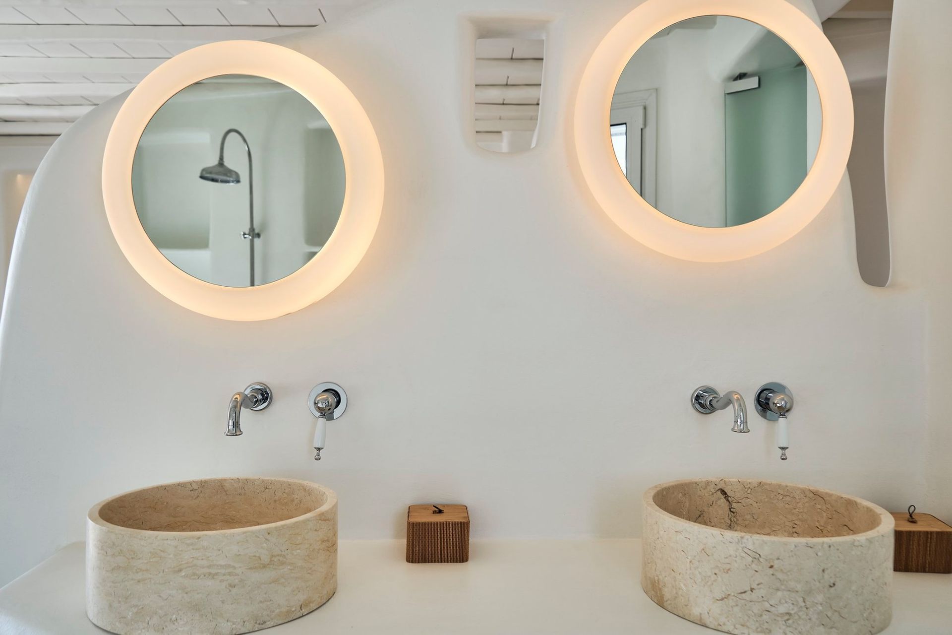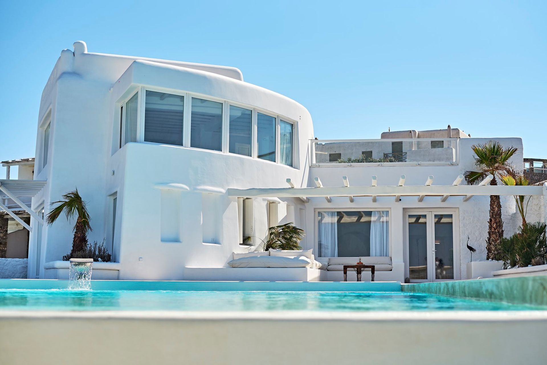 The plot, on which the villa is built, is 1.200 sq.m and it is fully configured at different levels which are oriented towards the stunning view of the island. The predominant colours are white and the beige tones of raw limestone ‘travertino’. The amazing architecture of the villa is characterized by a strong sculptural style with predominantly elements of Mykonian tradition, in combination with art and minimal influences. This creates an exotic and dreamy elegant atmosphere.