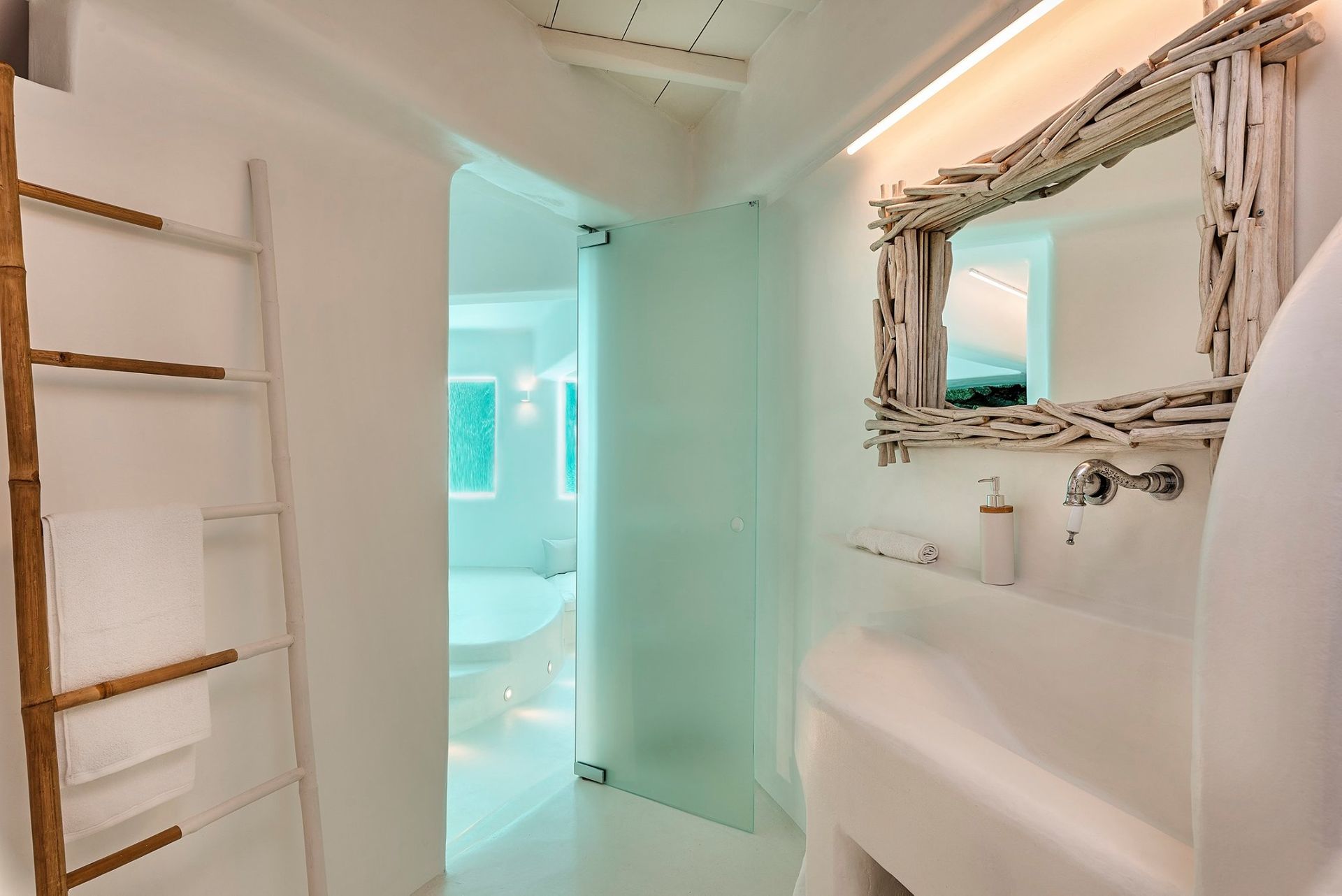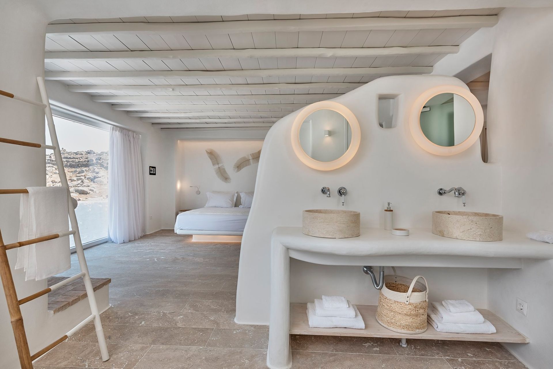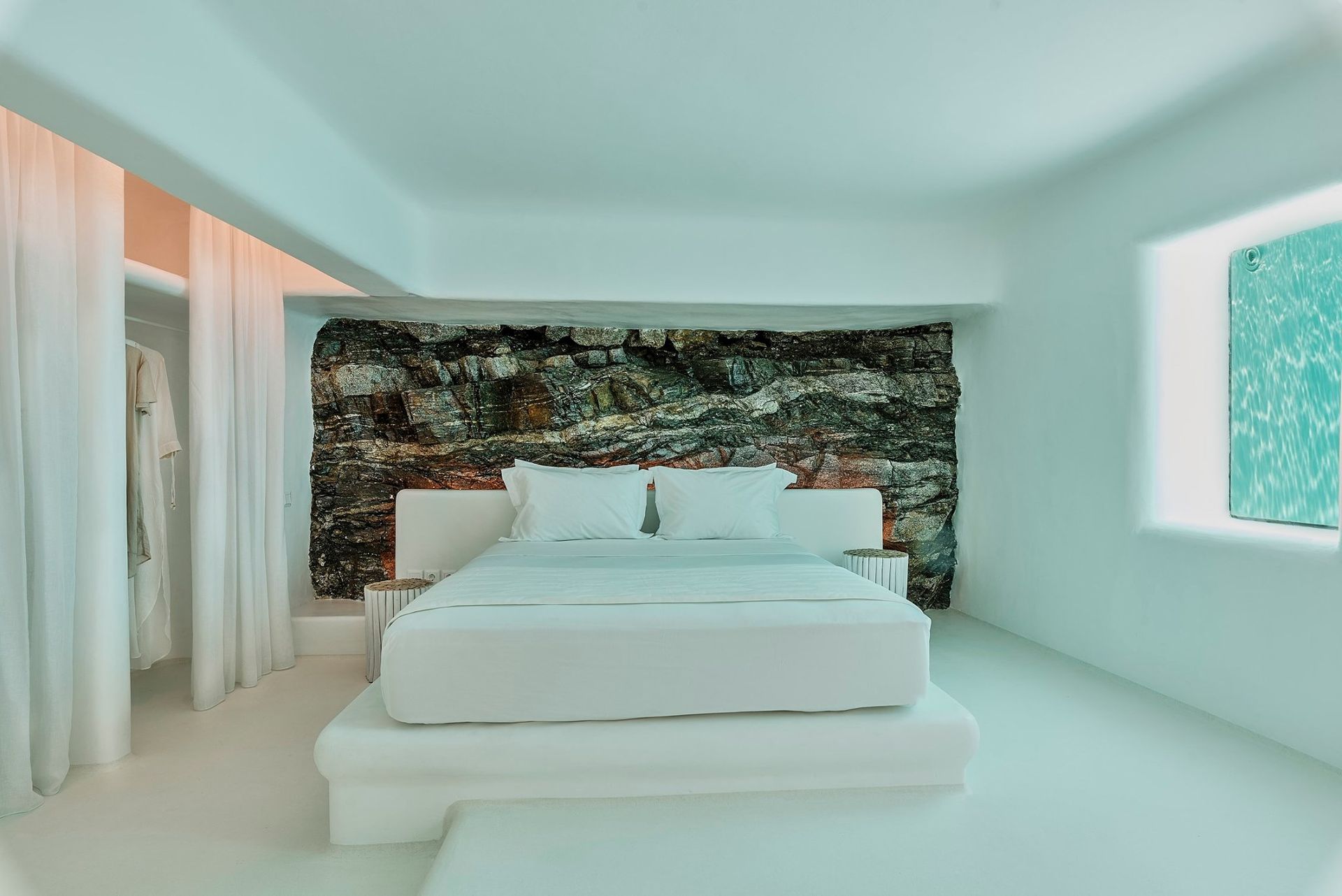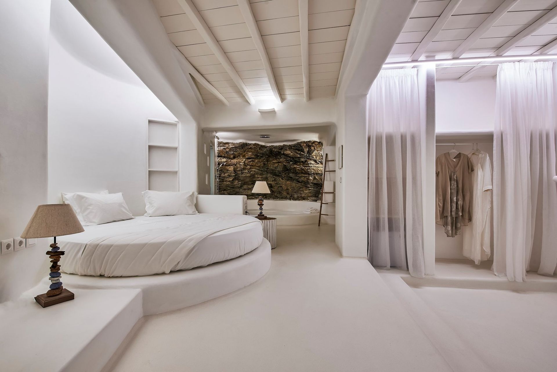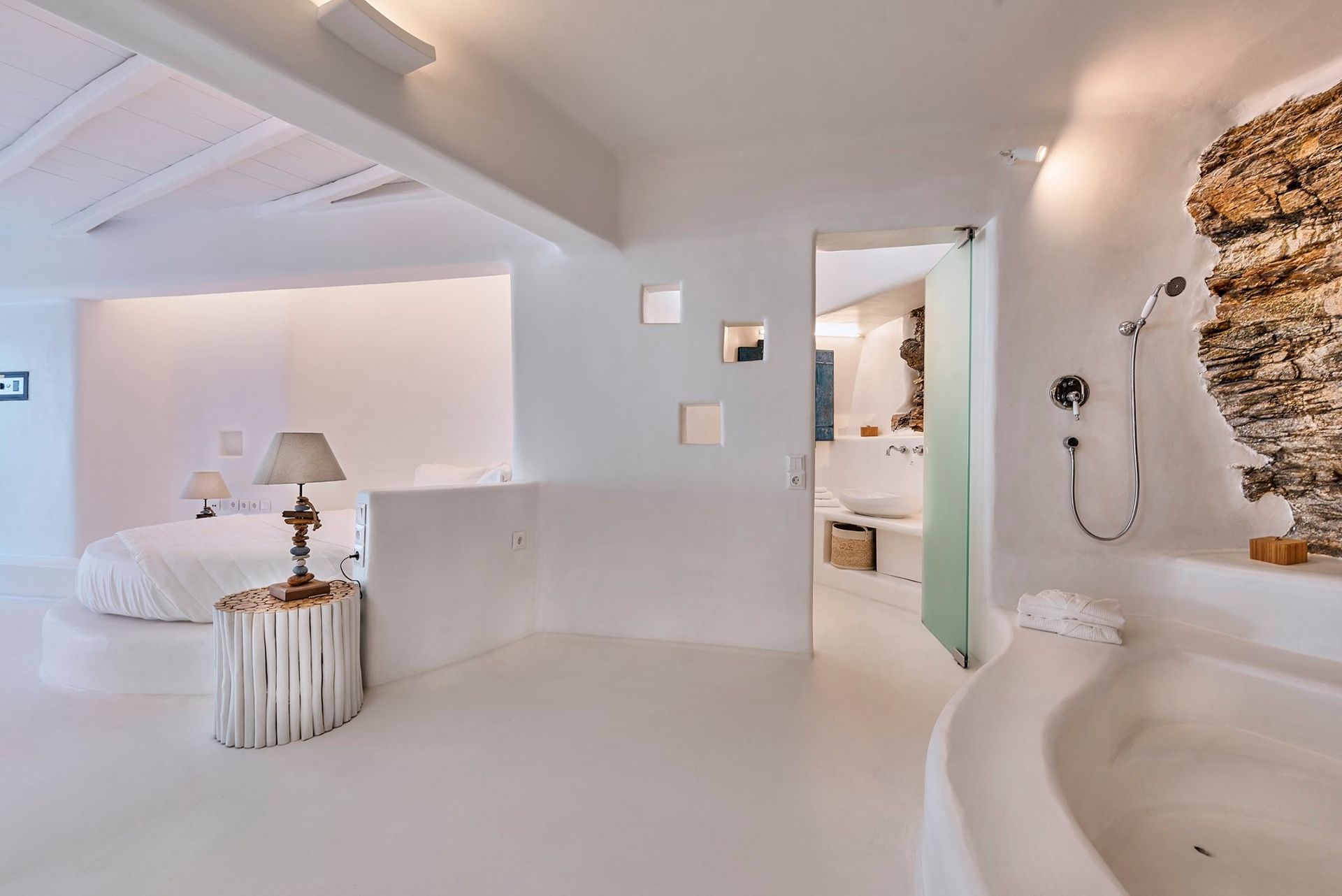 b) the Rock Room (50 sq.m)with a large built-in bathtub formed in the rock and a round bed and sea view