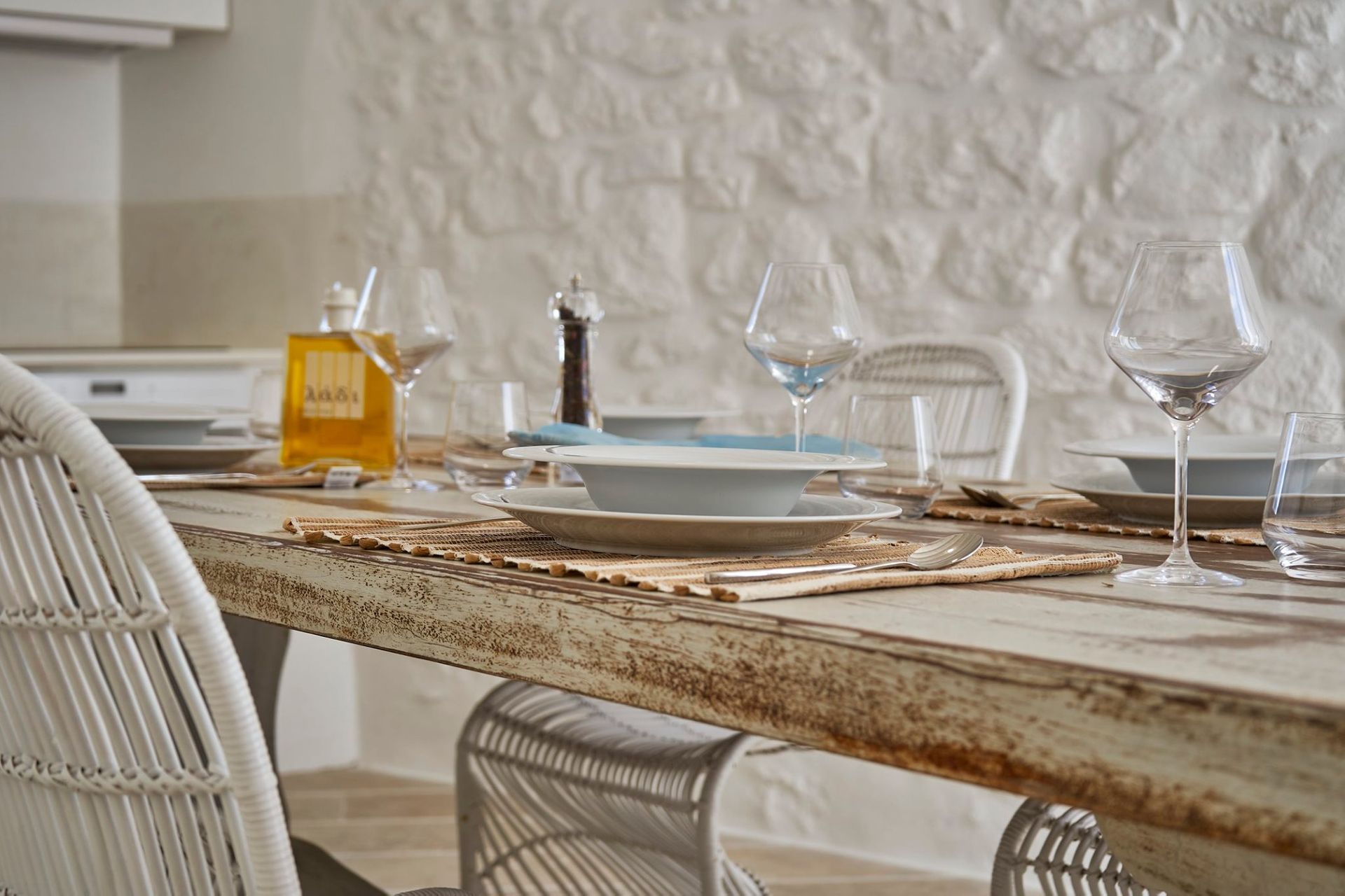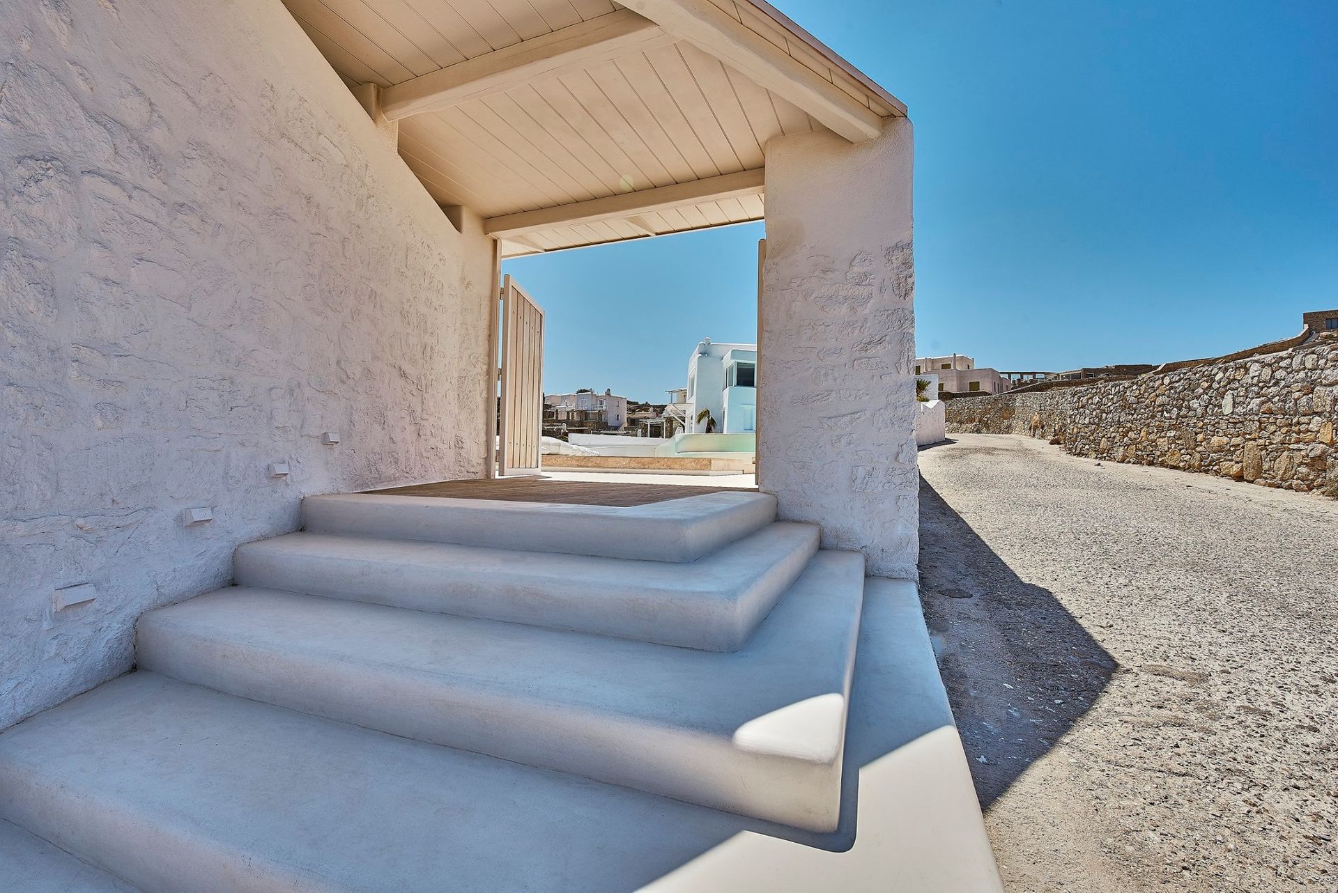 Tall, round white stone walls define it and ensure its privacy. It has 2 external entrances, the main one leading to the central level withthe pools and the covered outdoor dining area – barbecue, while the second entrance is on the highest level and serves the Top Master Suite.Outside these entrances are 5 outdoor parking spaces.