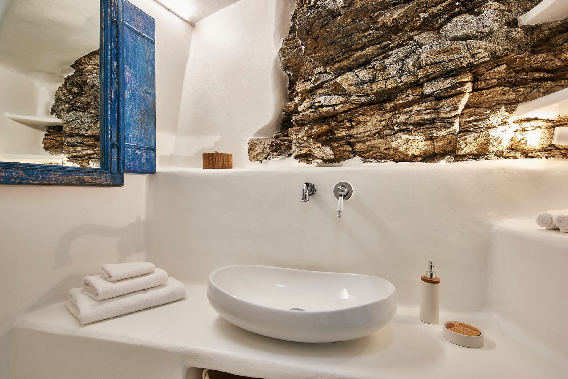 c) 3 independent, whitewashed stone guesthouses (45sq.m each) with open baths and stunning sea view, located on the lowest level of the courtyard
