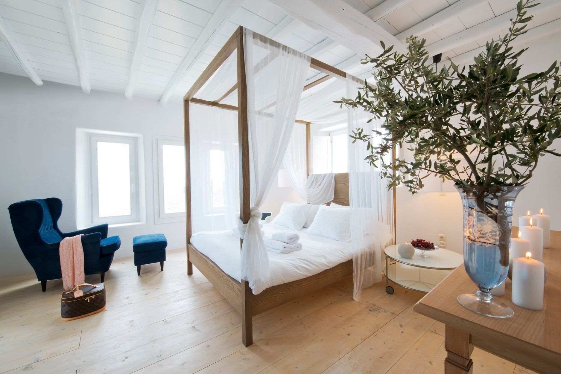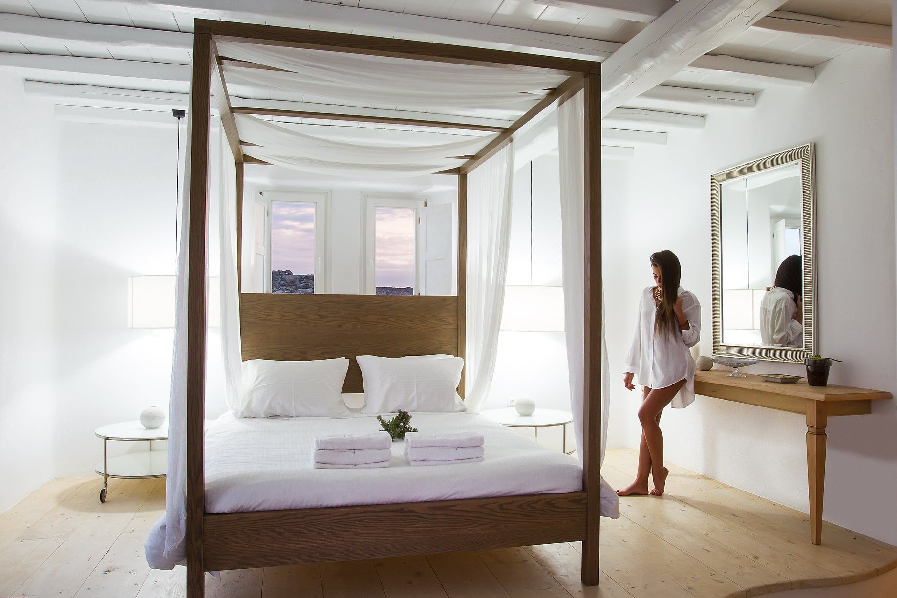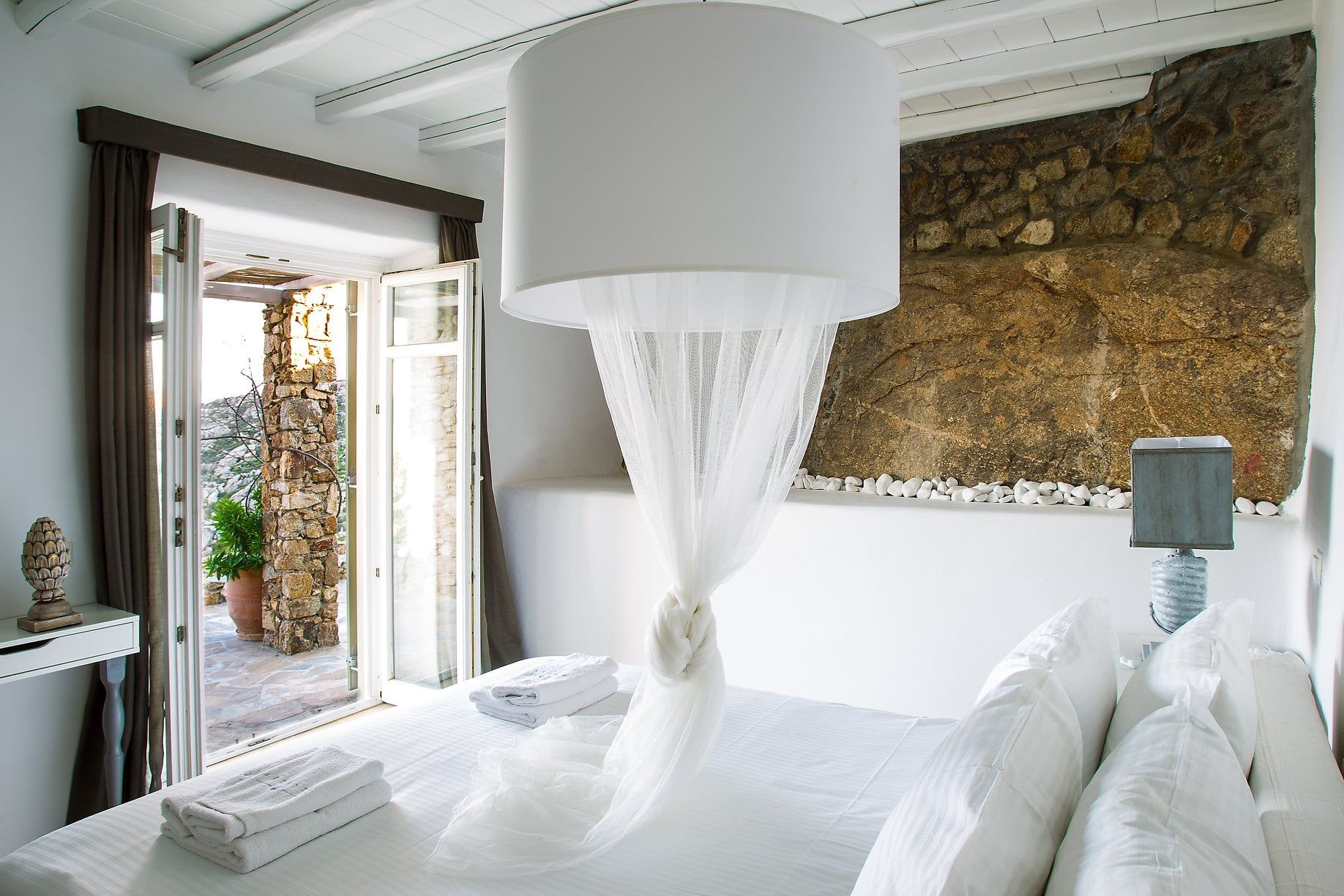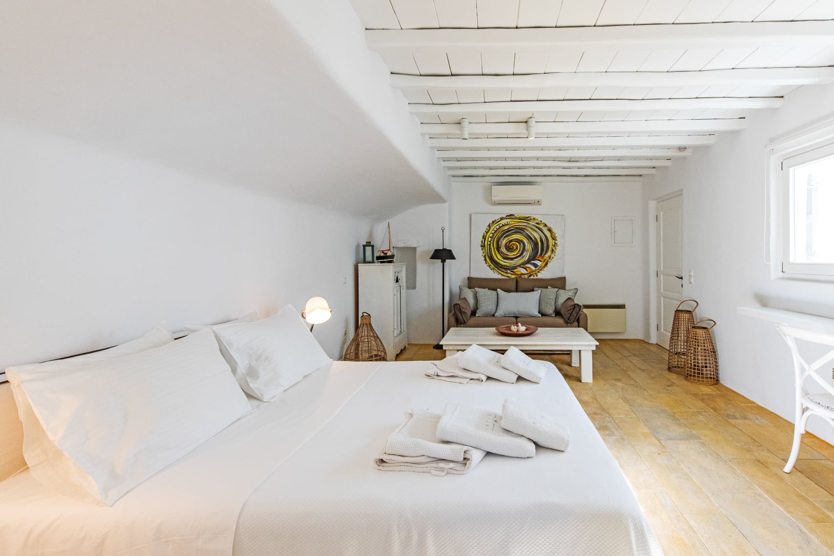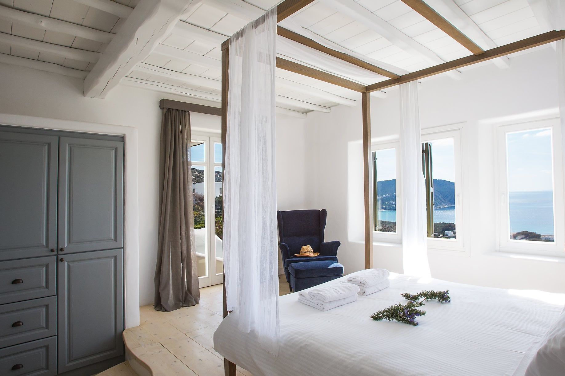 The wooden double bed with the white strips falling from the top, overlooks the crystal blue waters of Agrari Beach. From this room you have only to open your eyes to watch the sunrise from the bed.