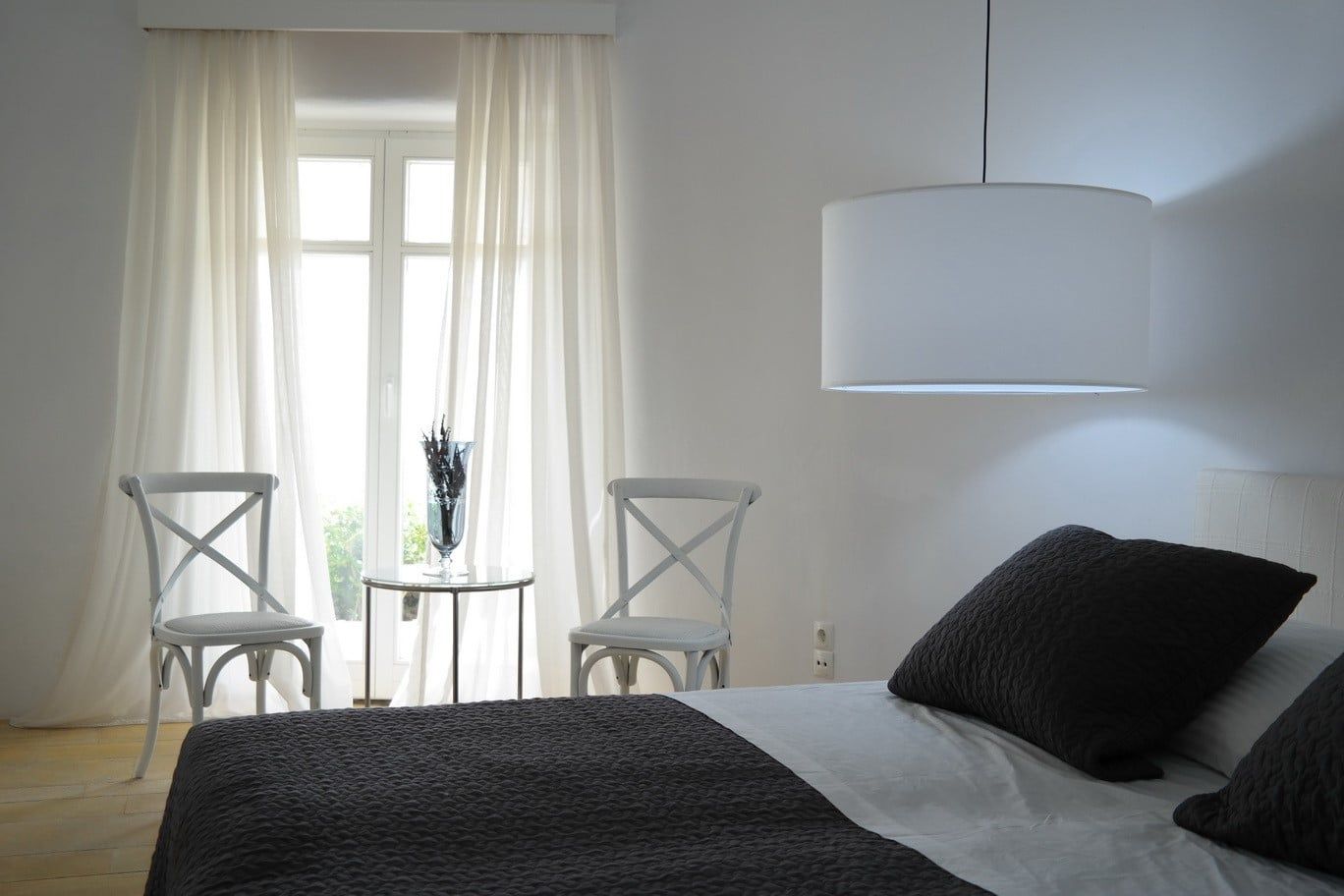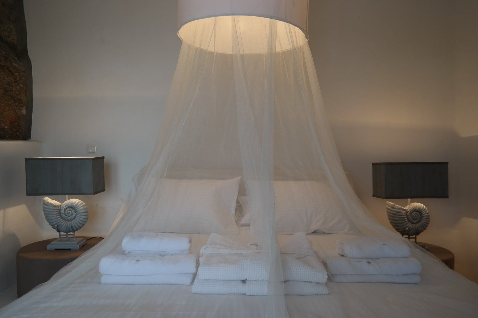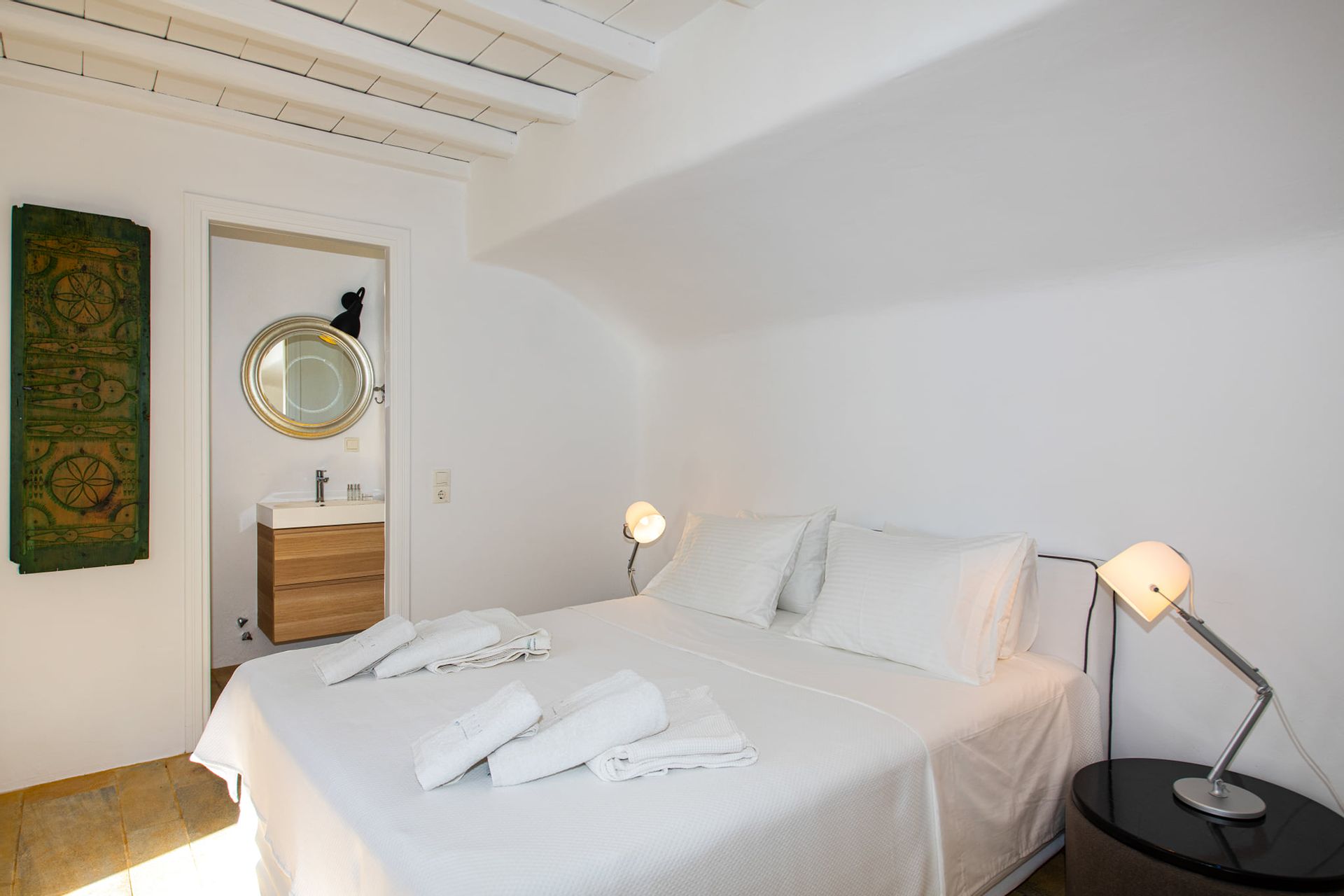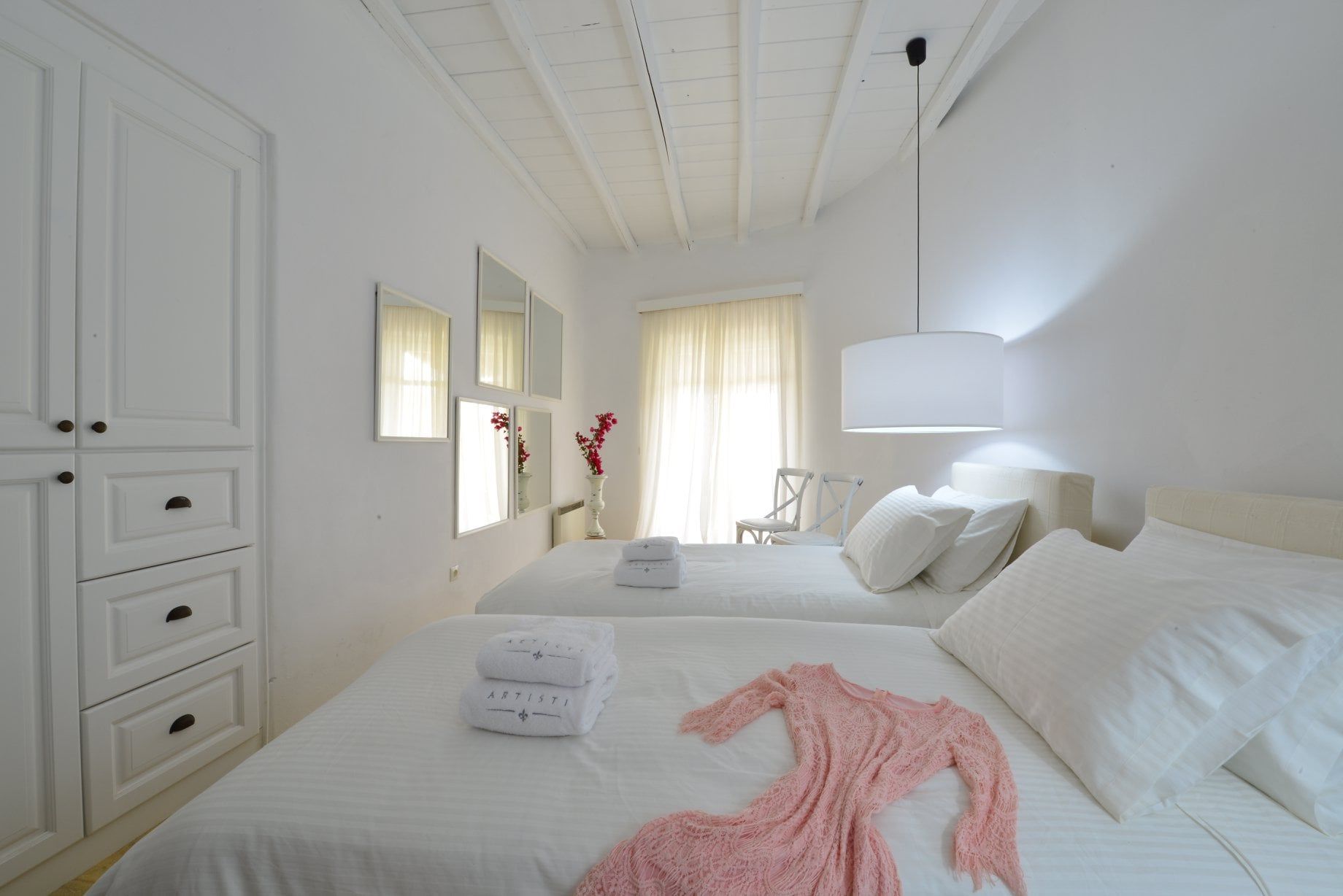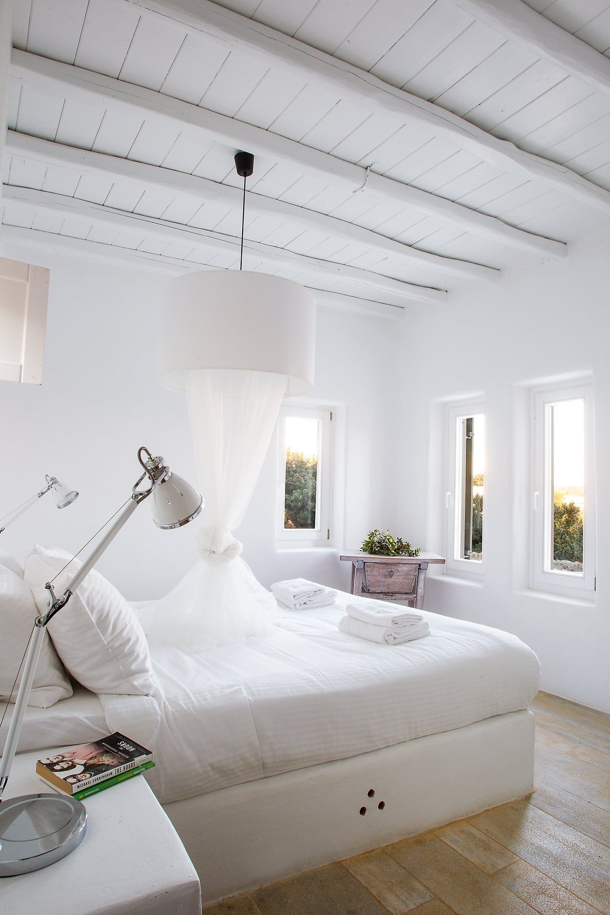 The wooden double bed with the white strips falling from the top, overlooks the crystal blue waters of Agrari Beach. From this room you have only to open your eyes to watch the sunrise from the bed.