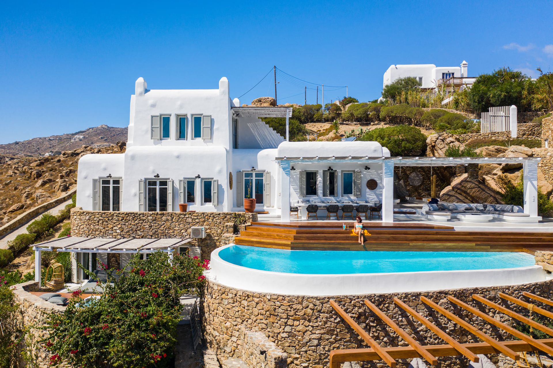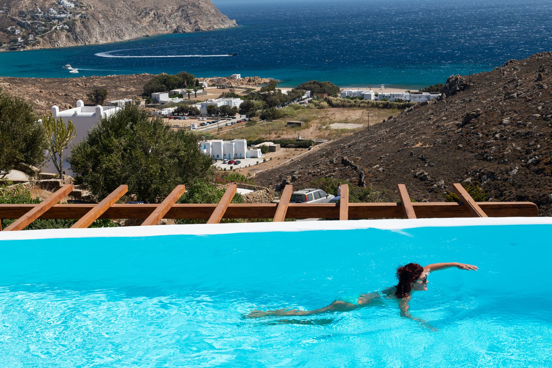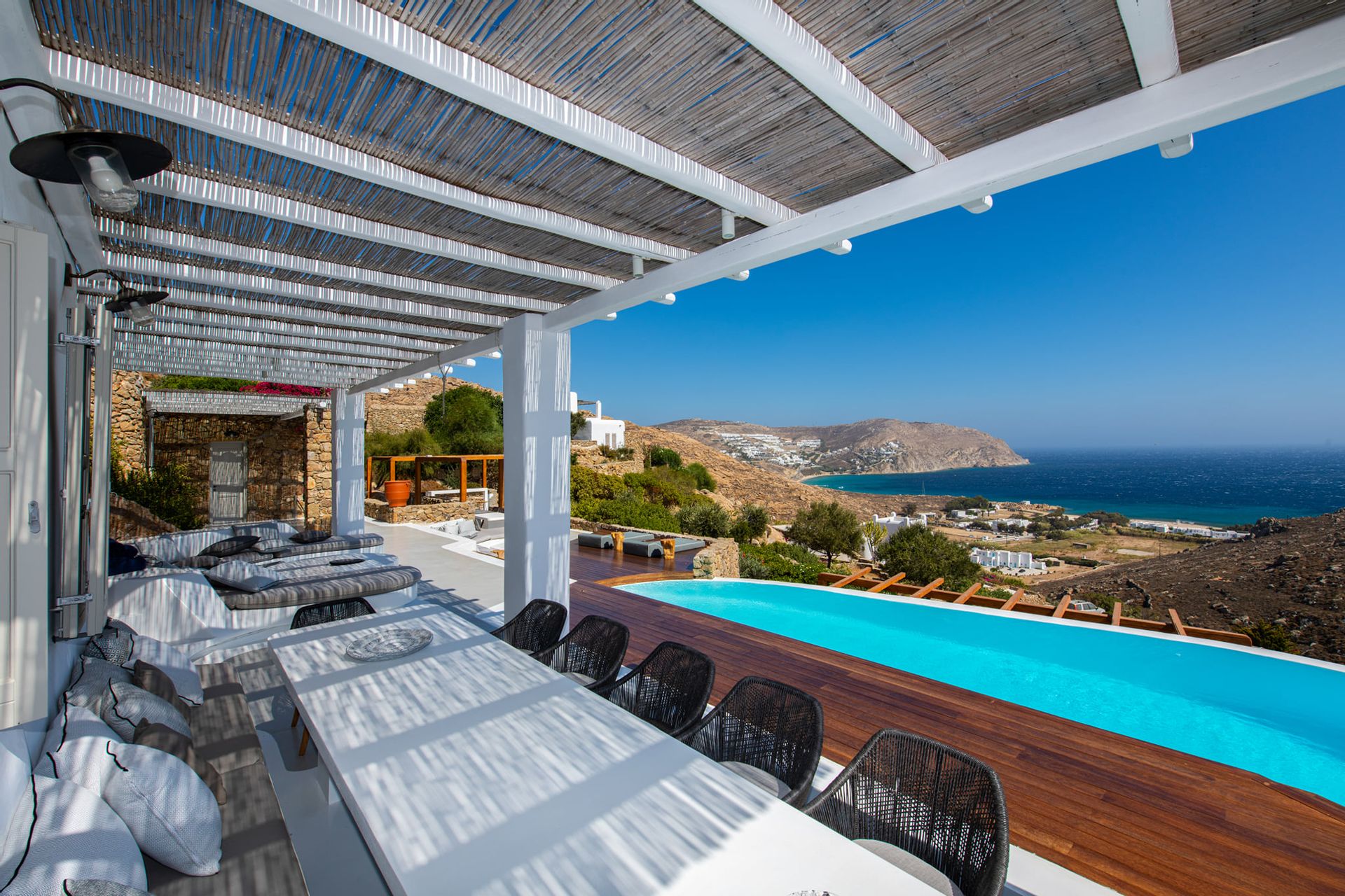 Villa Artisti offers spectacular views of the two southeast beaches, Agrari and Elia combined with the absolute privacy you have ever desired. Even more its special location capitalizes on the glorious sunrises which you can see even while you are in bed. The outside terrace will lead you to the large swimming pool area supplied with comfortable beds.