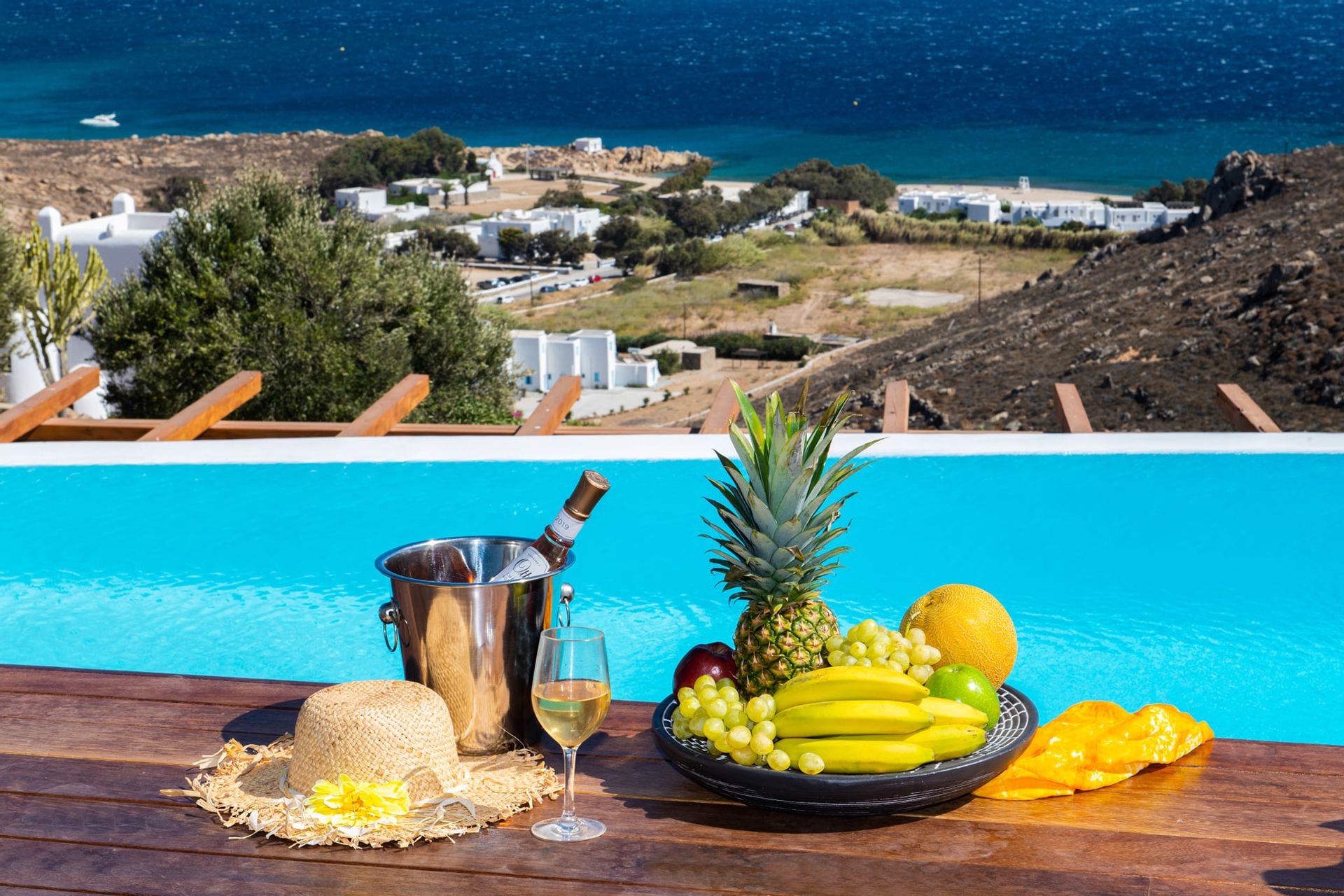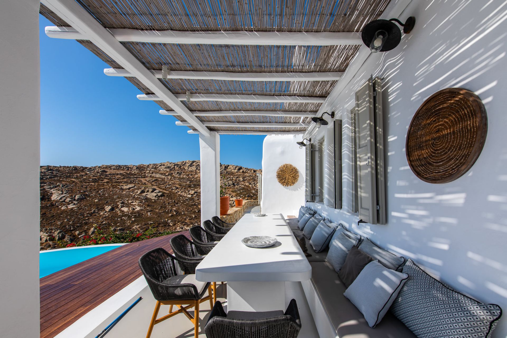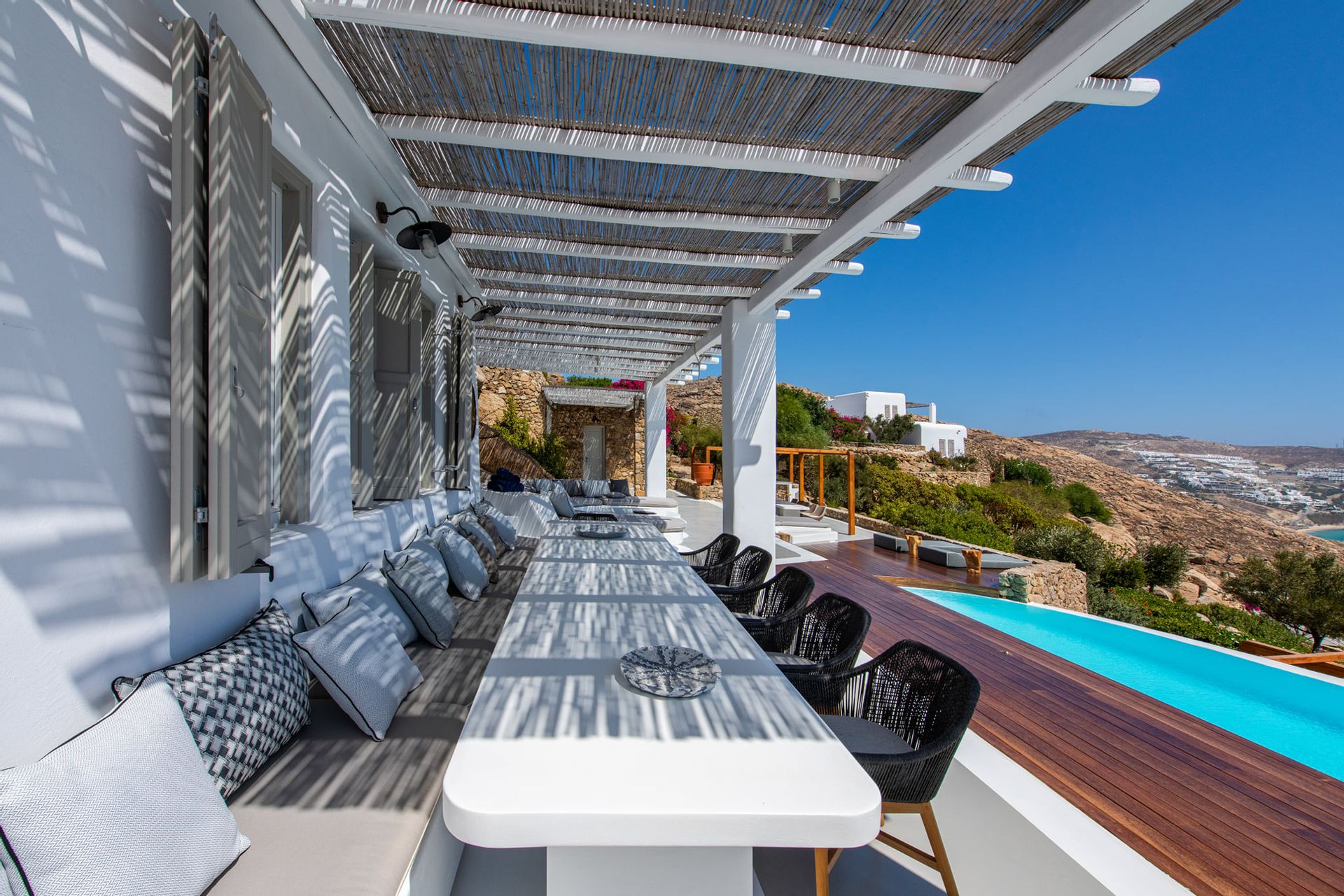 Villa Artisti offers spectacular views of the two southeast beaches, Agrari and Elia combined with the absolute privacy you have ever desired. Even more its special location capitalizes on the glorious sunrises which you can see even while you are in bed. The outside terrace will lead you to the large swimming pool area supplied with comfortable beds.