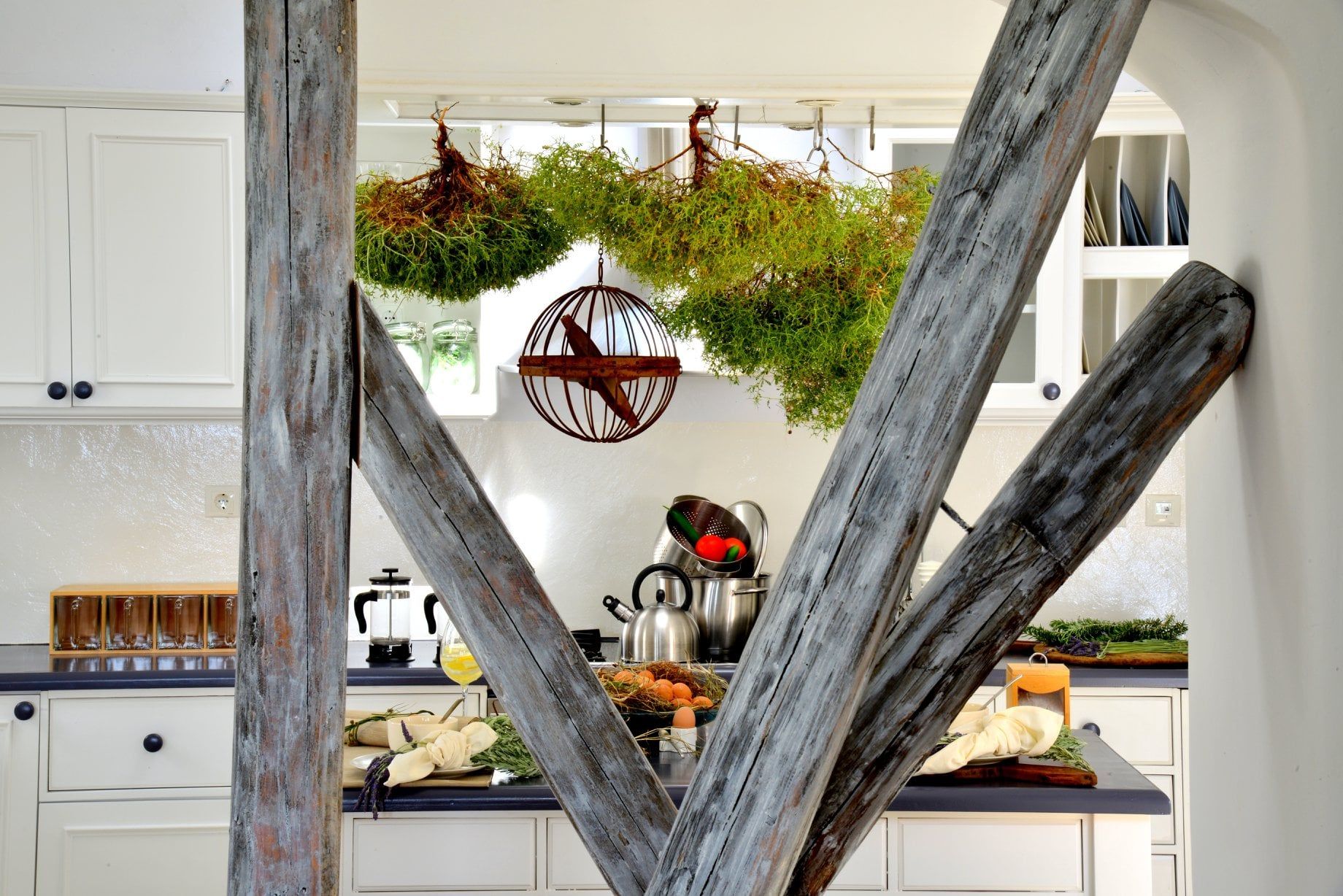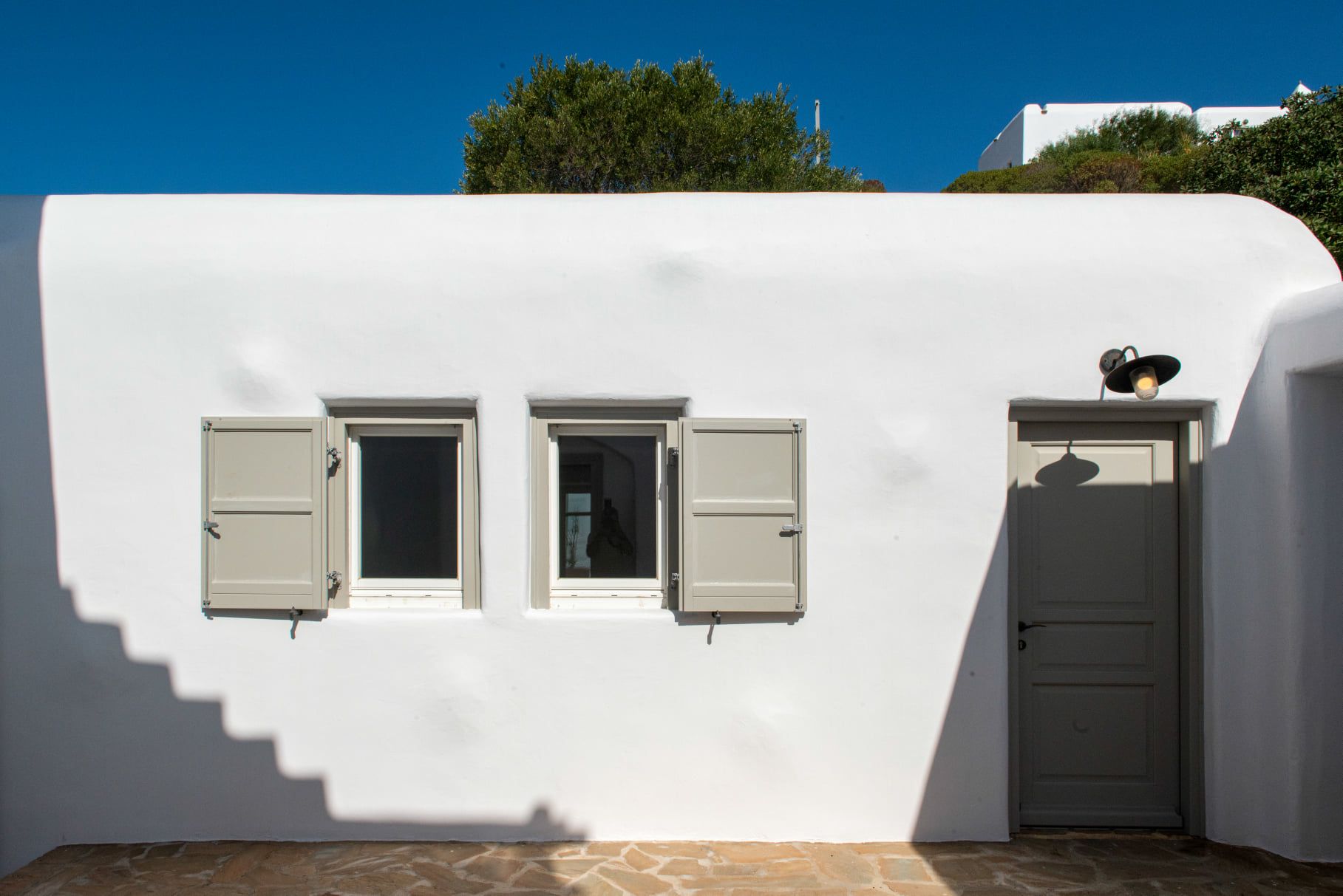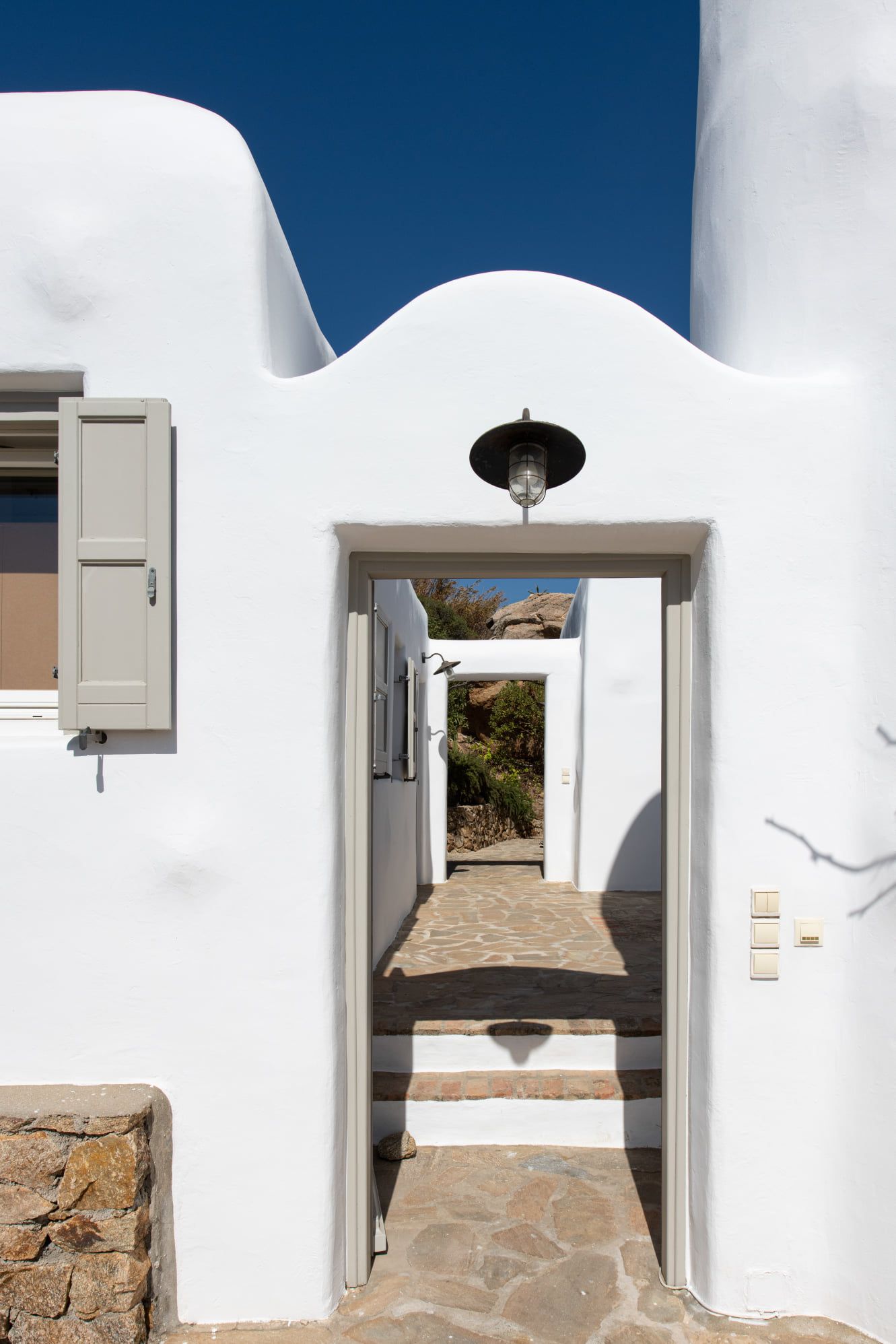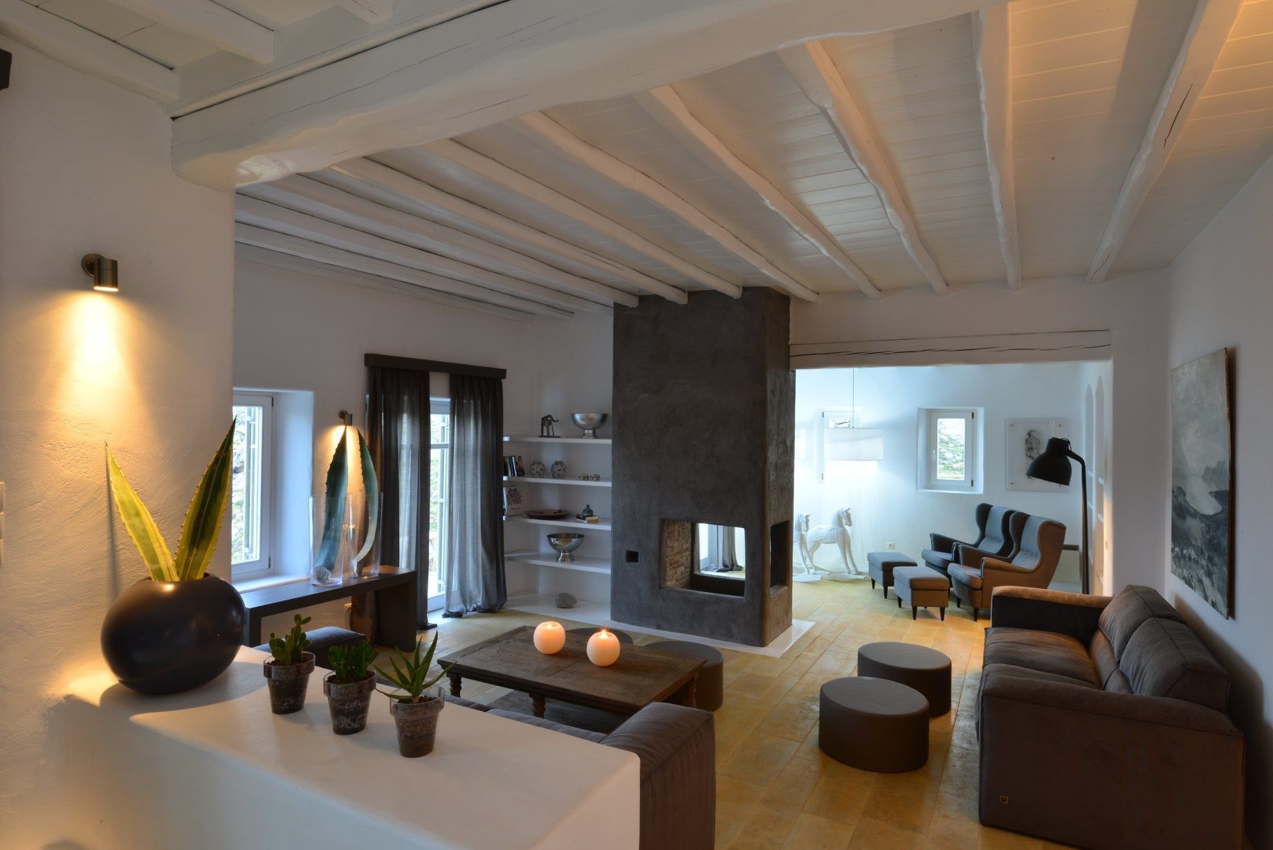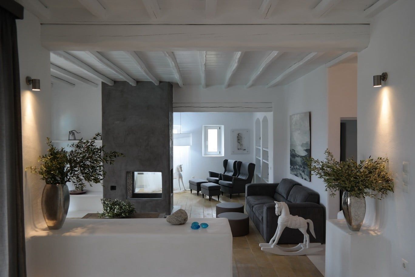 Artisti loves grey. It matches perfectly with the rocky scenery of Agrari area where Artisti is located. You will understand it as soon as you get in. The main house consists of three different levels.