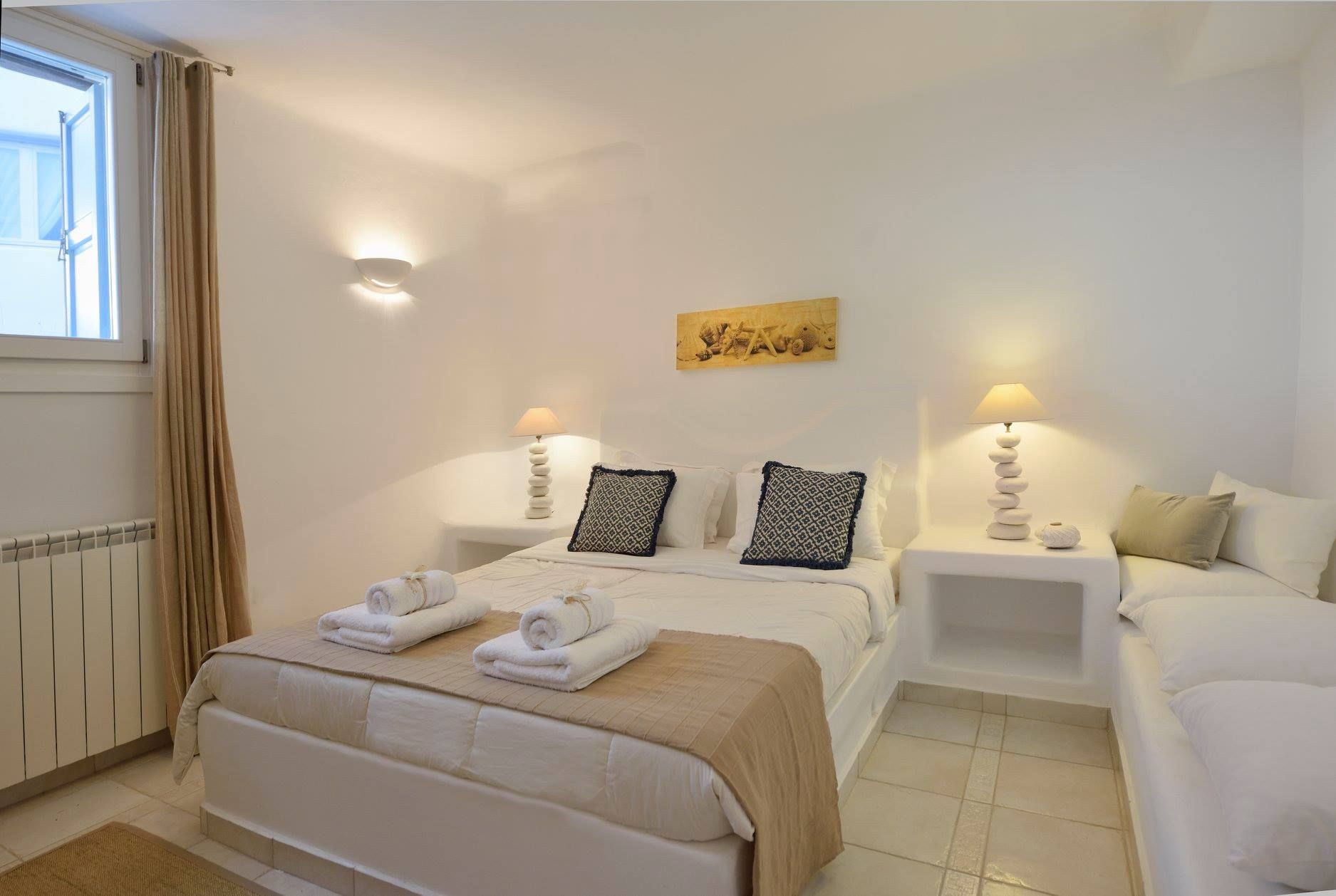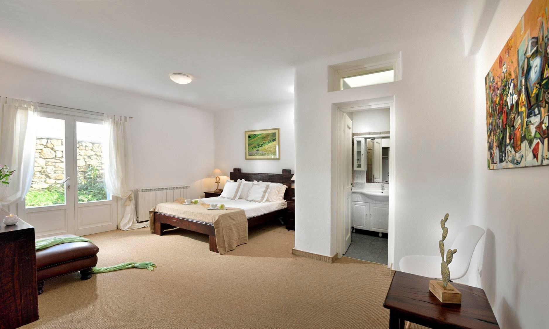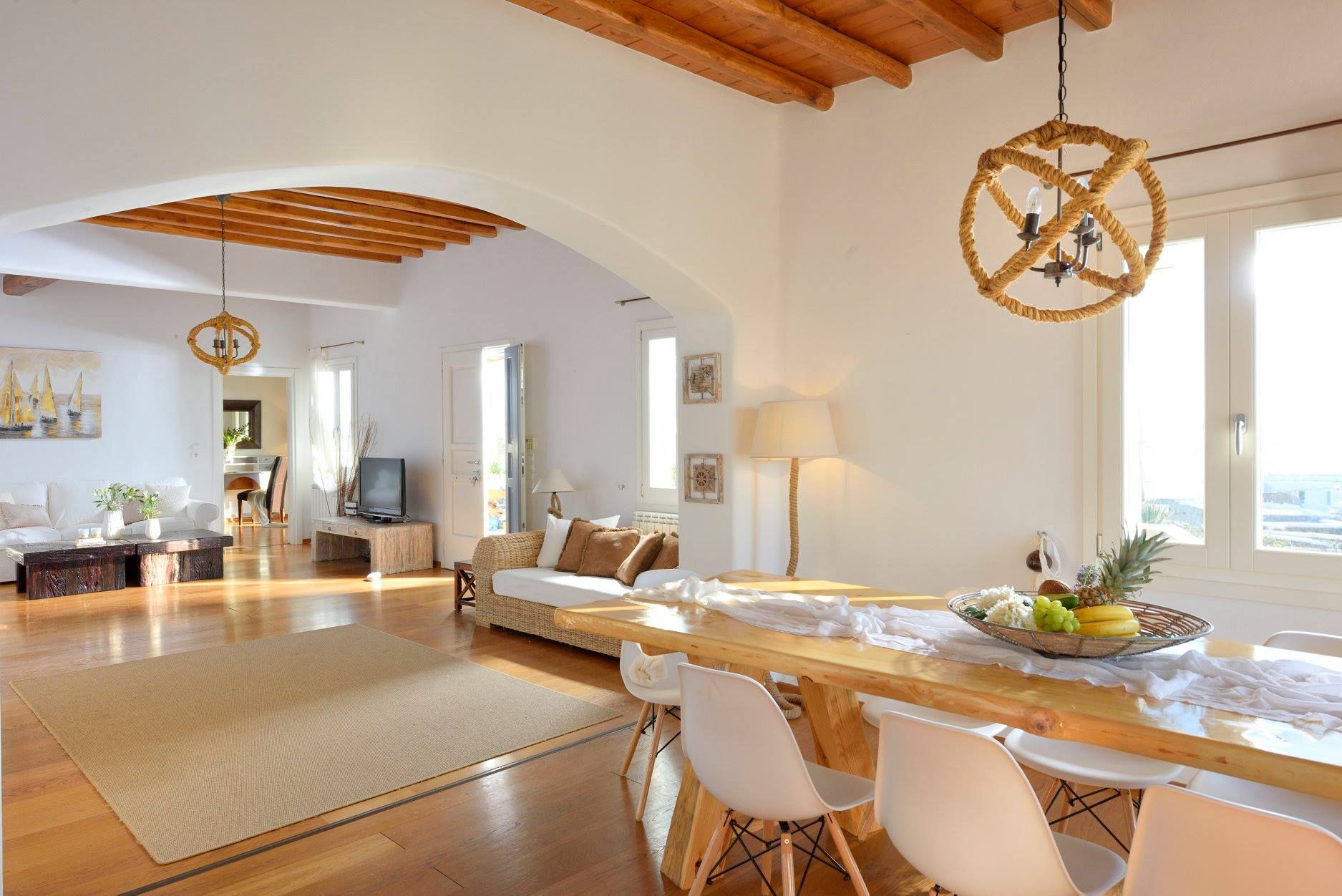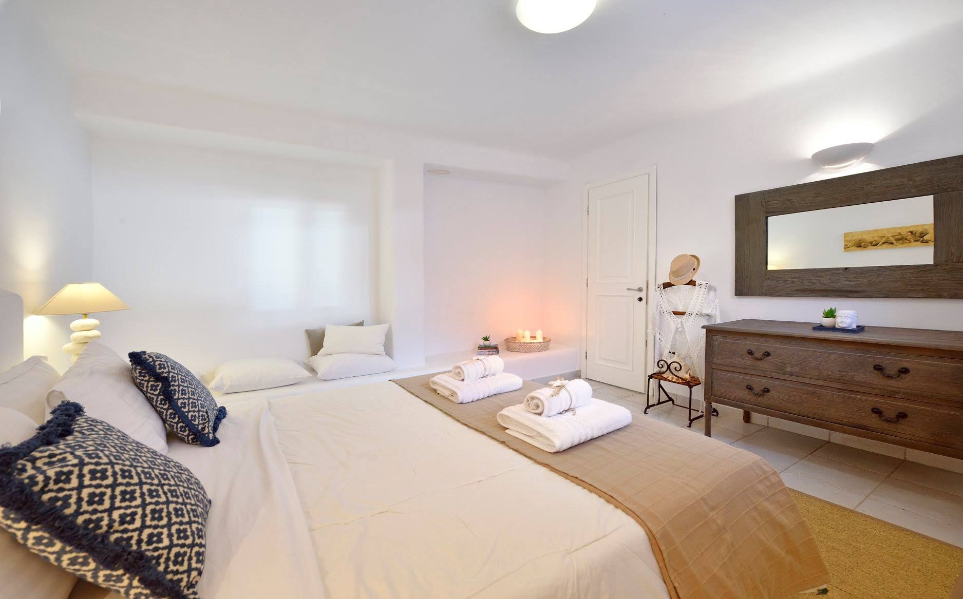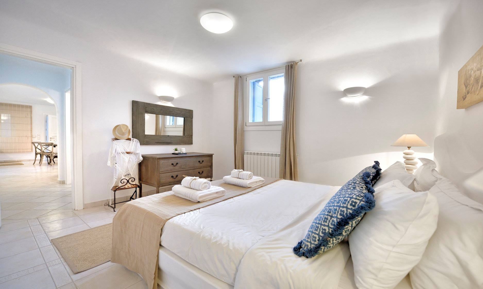 Tasteful furnishings and fabrics dress the villa in a simple yet elegant décor, rendering it relaxing on the eyes and the senses alike. The villa harbours 6 bedrooms and can accommodate up to 12 people, while providing all the amenities one could ever need. It’s the ideal villa for those who crave a getaway, but also desire proximity to the legendary Mykonian action as well as Mykonos airport. The world-renowned Super Paradise beach is but a 10-minute walk away, as are a series of lively bars and restaurants including: Super Paradise Club, Jackie’o, and Pinky Beach... within a 2-minute car ride.