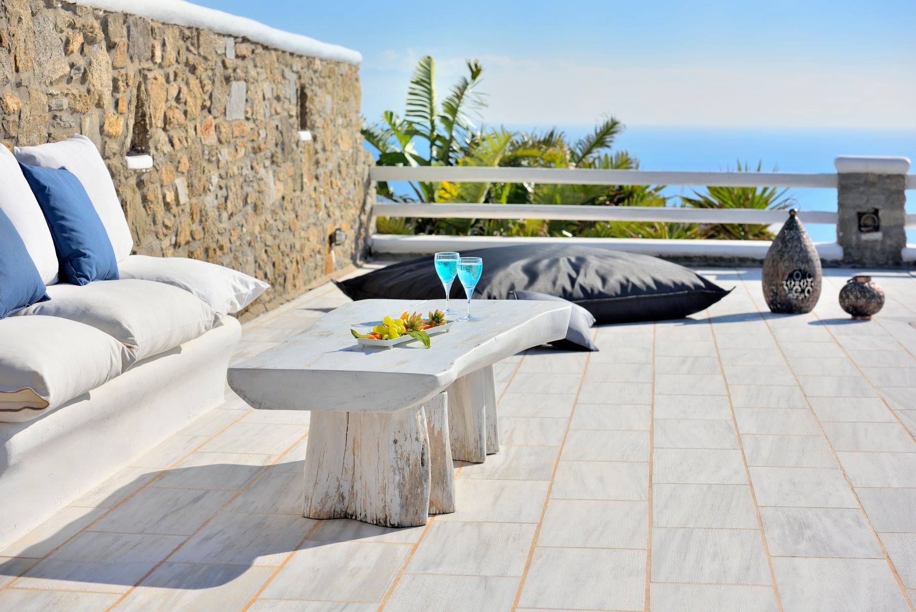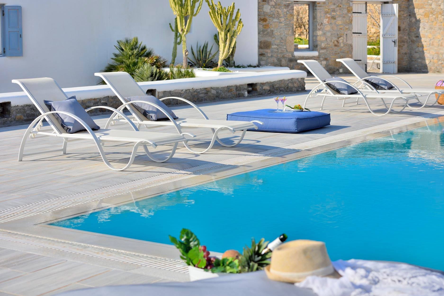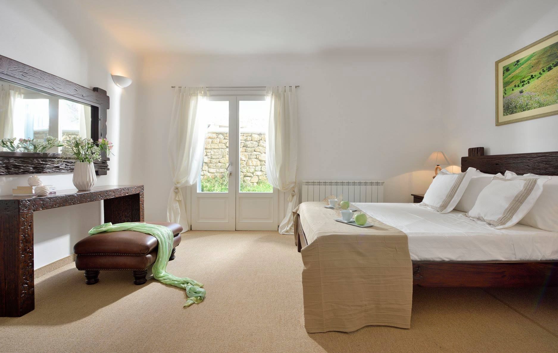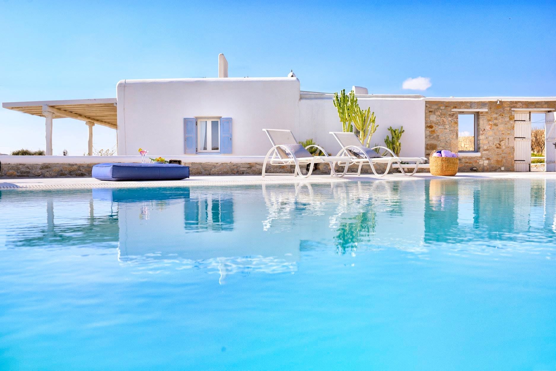 Tasteful furnishings and fabrics dress the villa in a simple yet elegant décor, rendering it relaxing on the eyes and the senses alike. The villa harbours 6 bedrooms and can accommodate up to 12 people, while providing all the amenities one could ever need. It’s the ideal villa for those who crave a getaway, but also desire proximity to the legendary Mykonian action as well as Mykonos airport. The world-renowned Super Paradise beach is but a 10-minute walk away, as are a series of lively bars and restaurants including: Super Paradise Club, Jackie’o, and Pinky Beach... within a 2-minute car ride.
