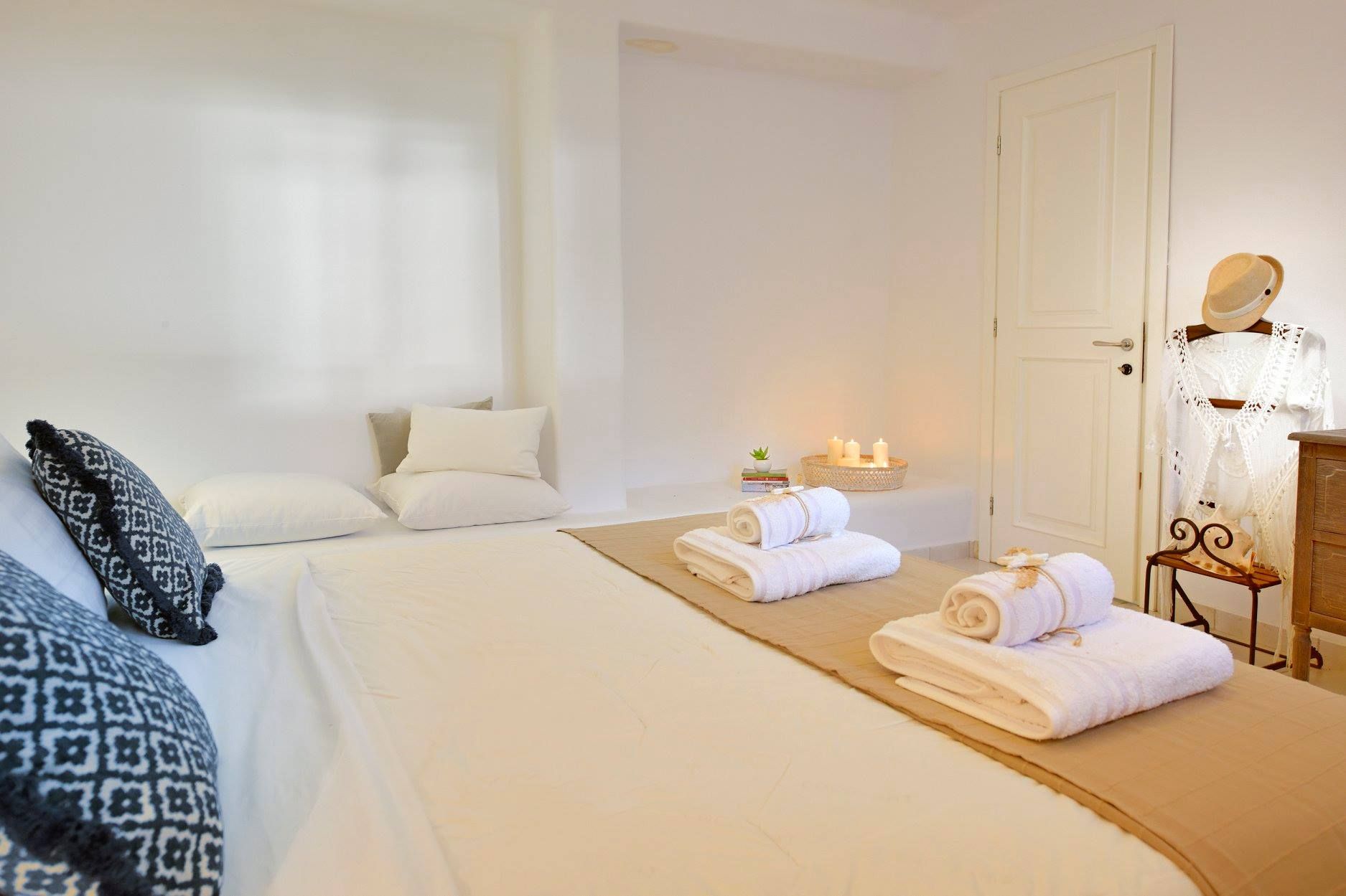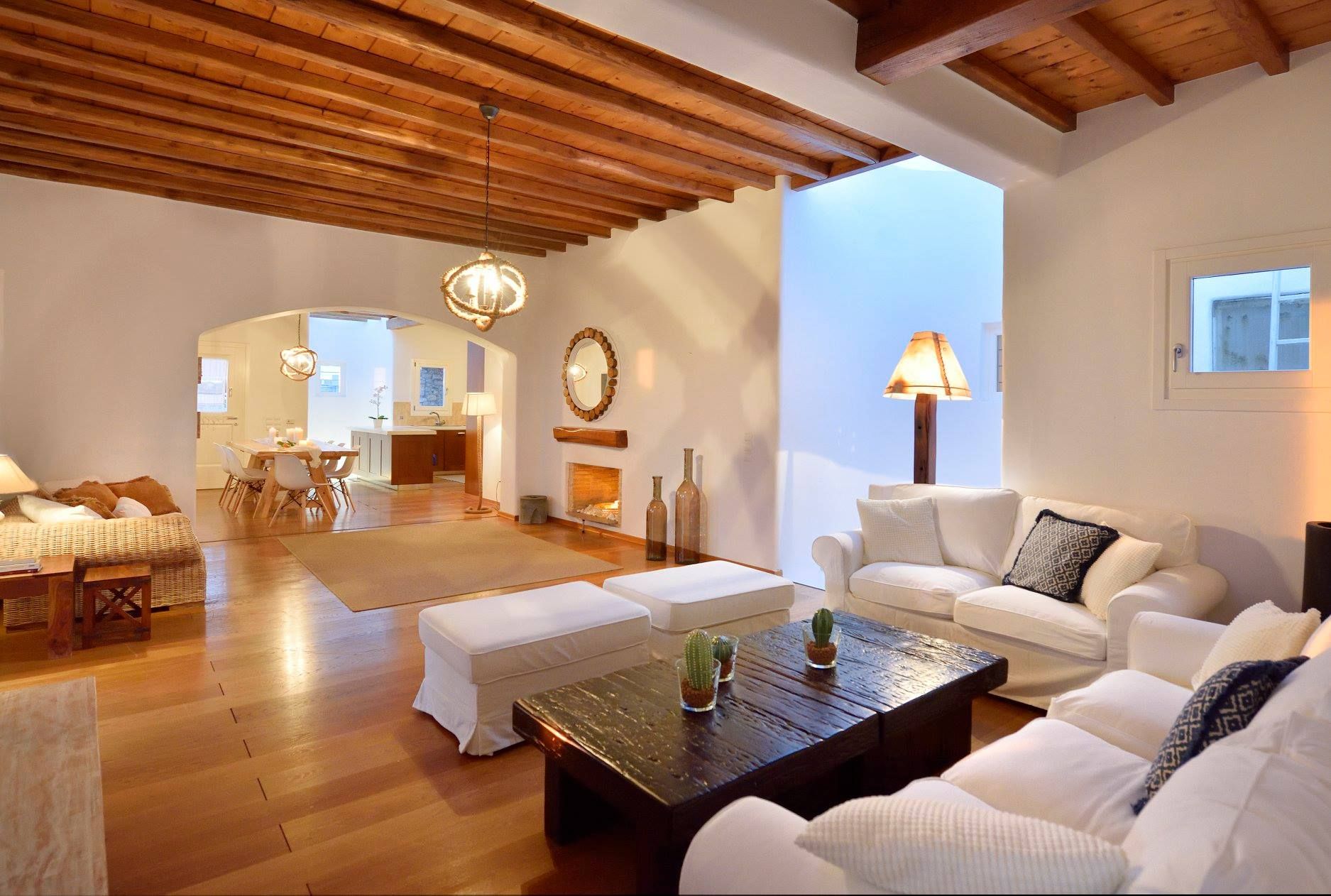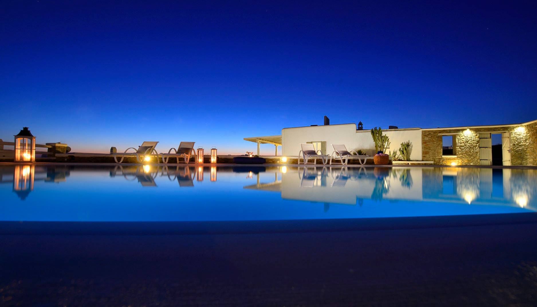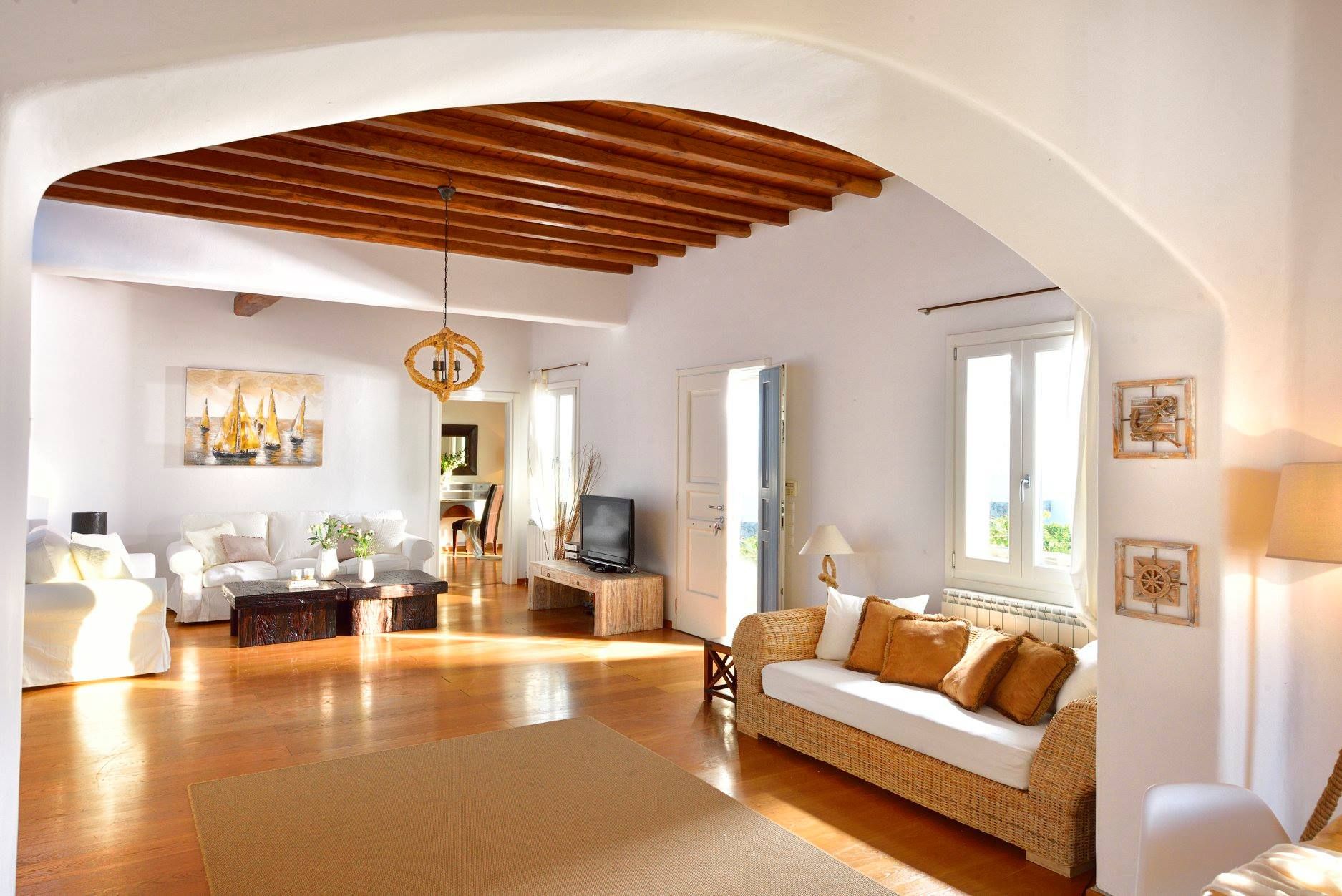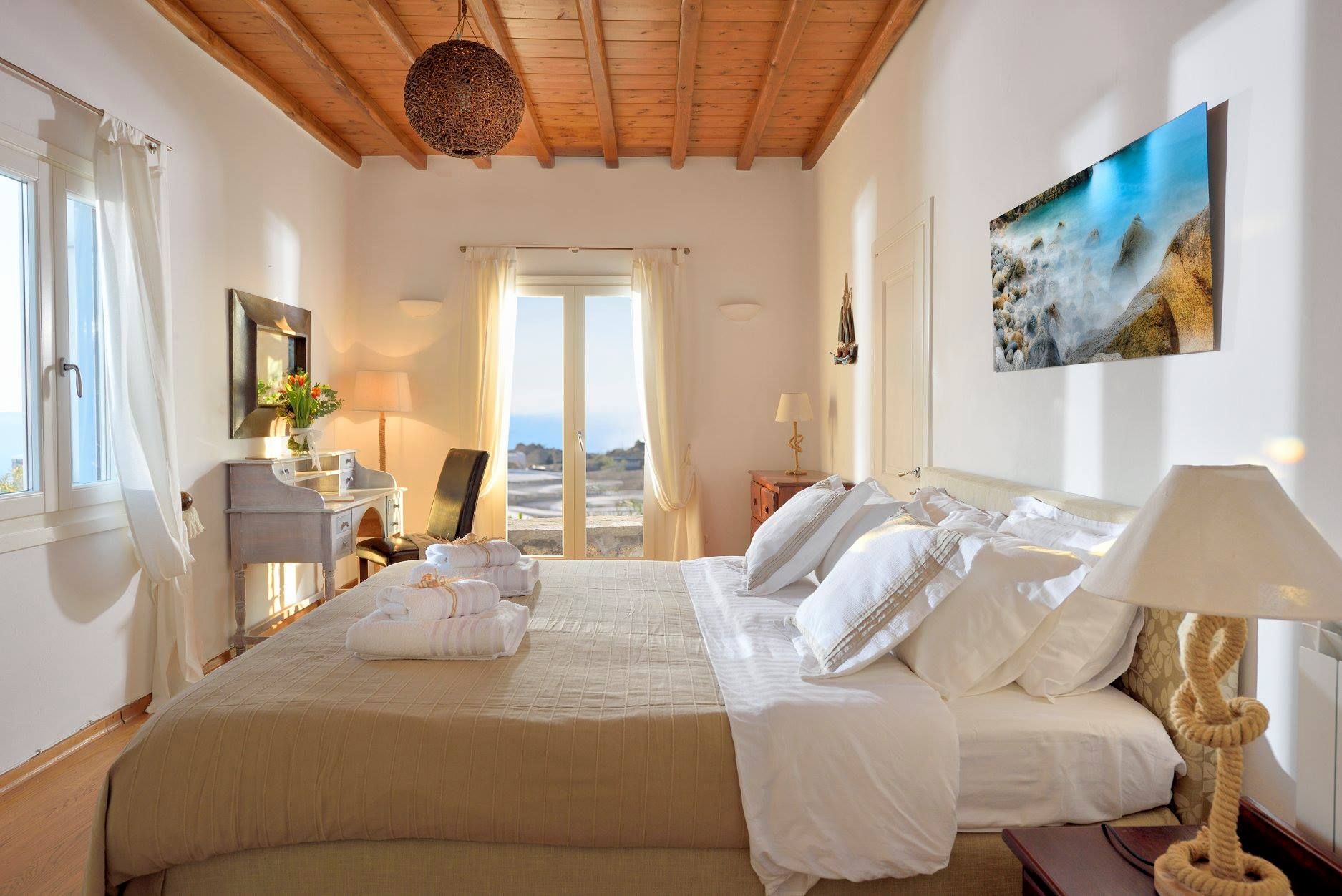 Tasteful furnishings and fabrics dress the villa in a simple yet elegant décor, rendering it relaxing on the eyes and the senses alike. The villa harbours 6 bedrooms and can accommodate up to 12 people, while providing all the amenities one could ever need. It’s the ideal villa for those who crave a getaway, but also desire proximity to the legendary Mykonian action as well as Mykonos airport. The world-renowned Super Paradise beach is but a 10-minute walk away, as are a series of lively bars and restaurants including: Super Paradise Club, Jackie’o, and Pinky Beach... within a 2-minute car ride.