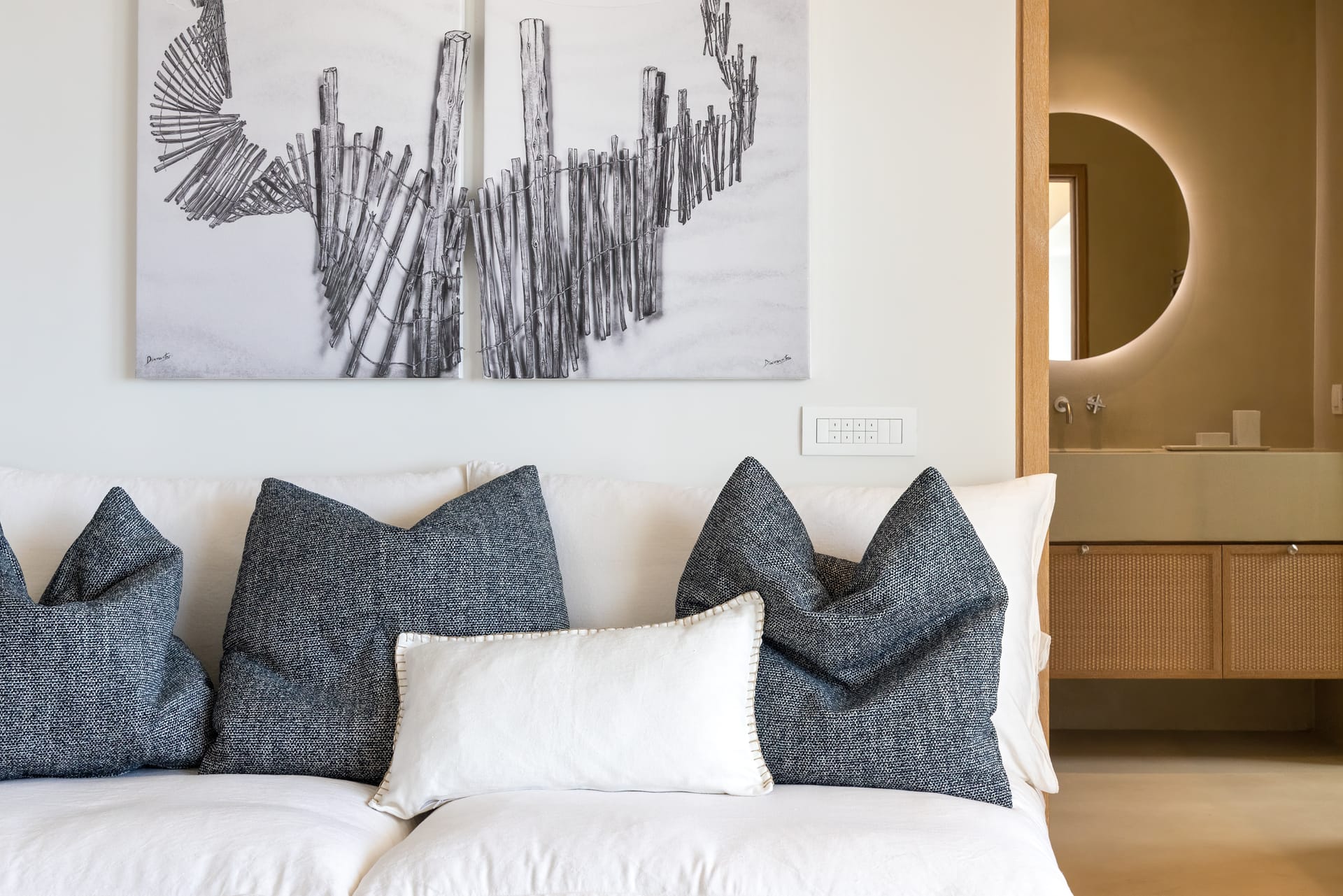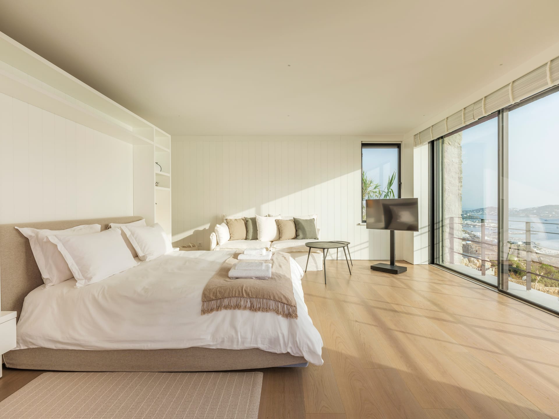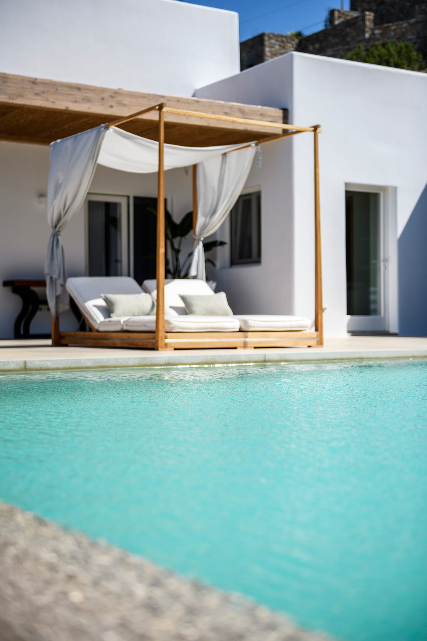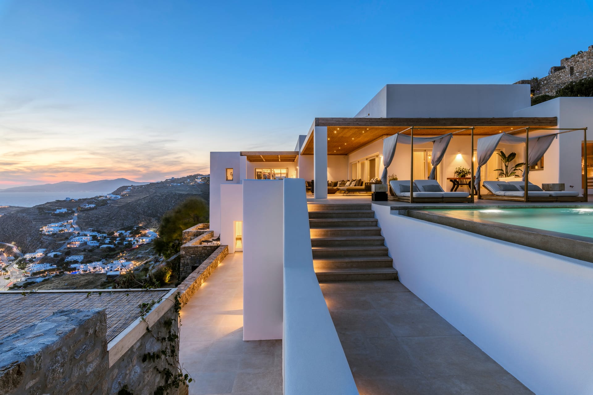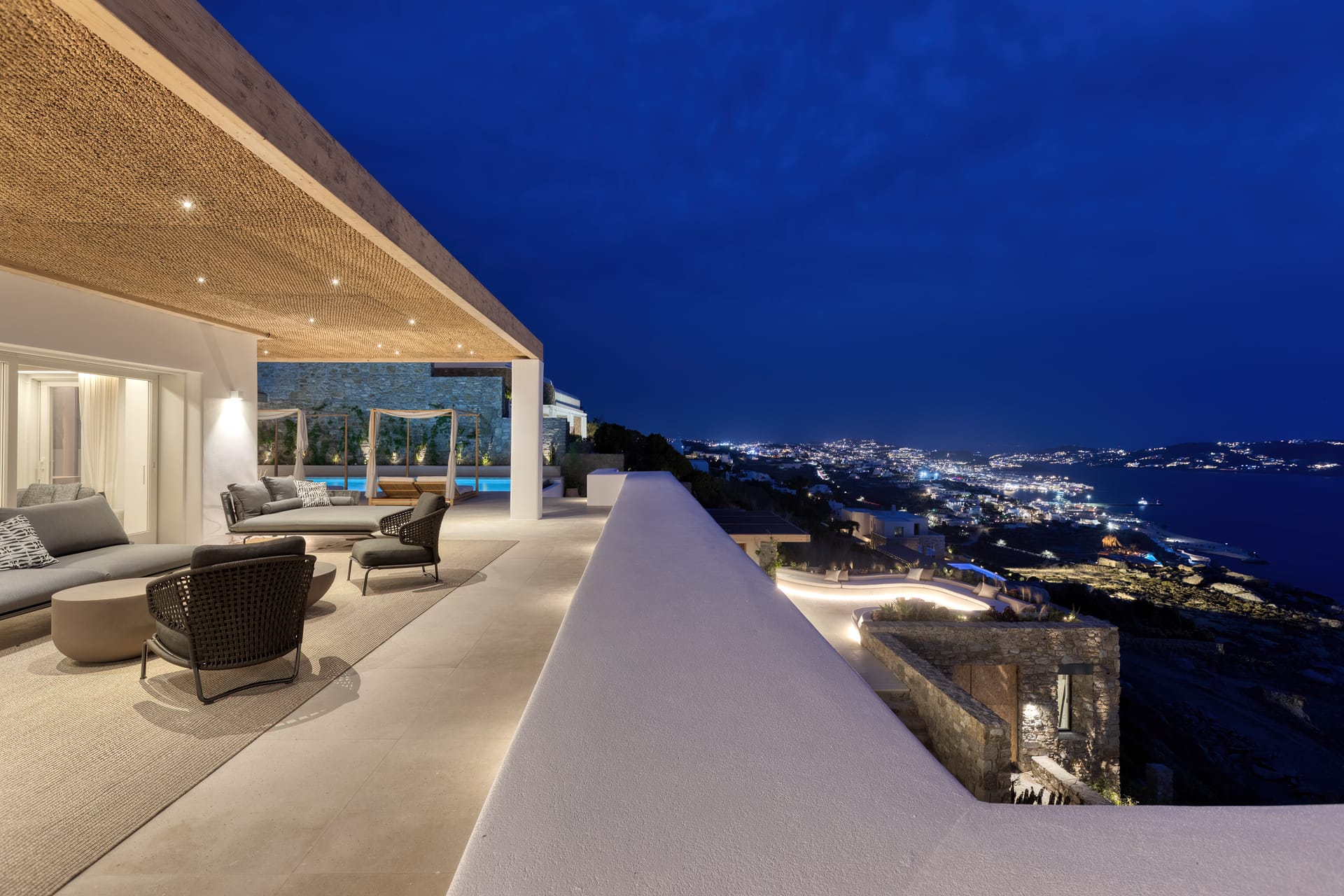 As dusk settles, Silvy truly comes to life. Relax on plush daybeds as you watch the silver moon rise in the cobalt sky and the sparkling lights of Mykonos Town painting a breathtaking scene that embodies the very essence of Greek elegance. Whether you're soaking in the azure beauty of the Aegean Sea or relishing the plush comforts of the villa, Silvy promises a luxurious experience that's as timeless as it's captivating.