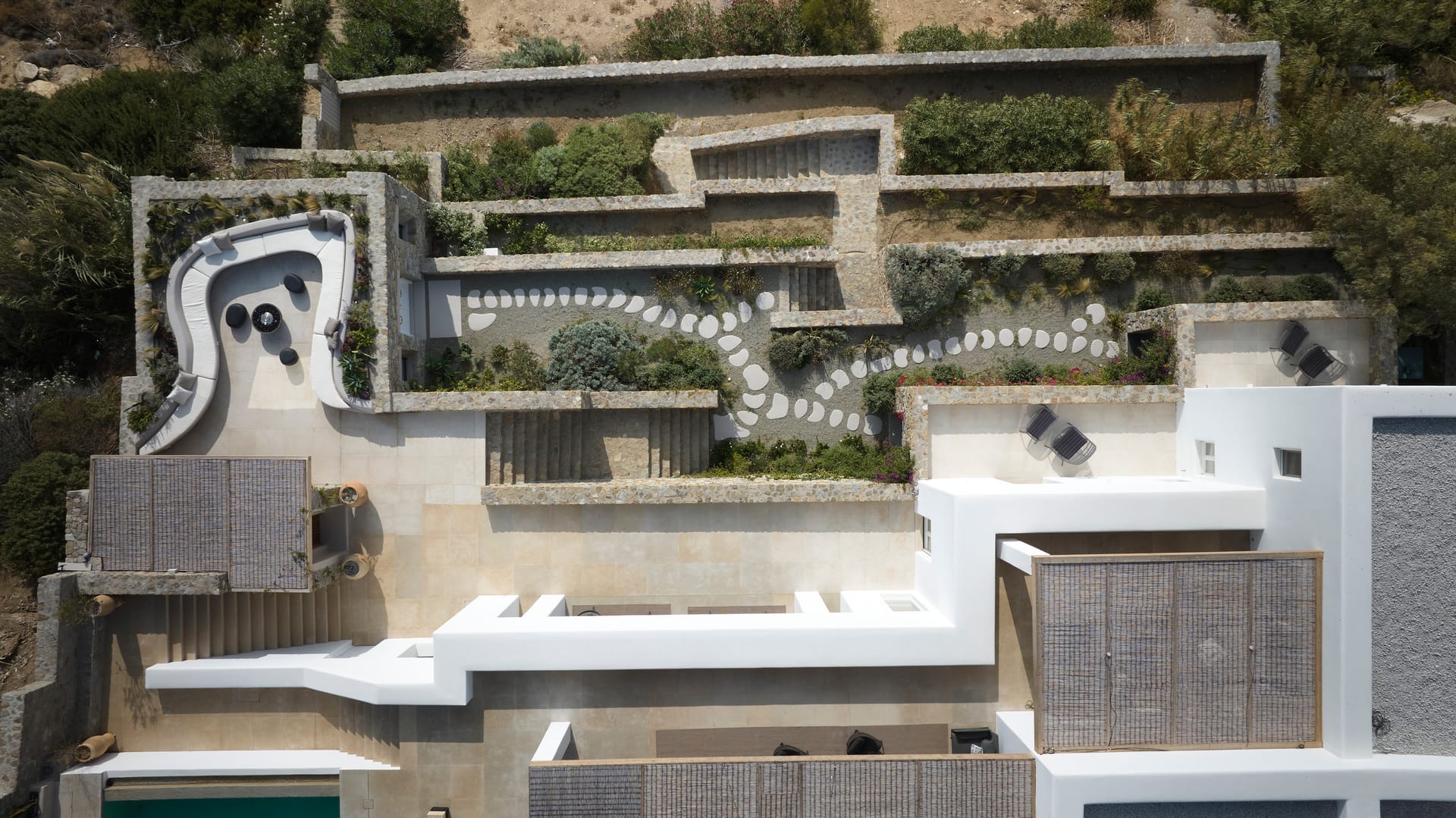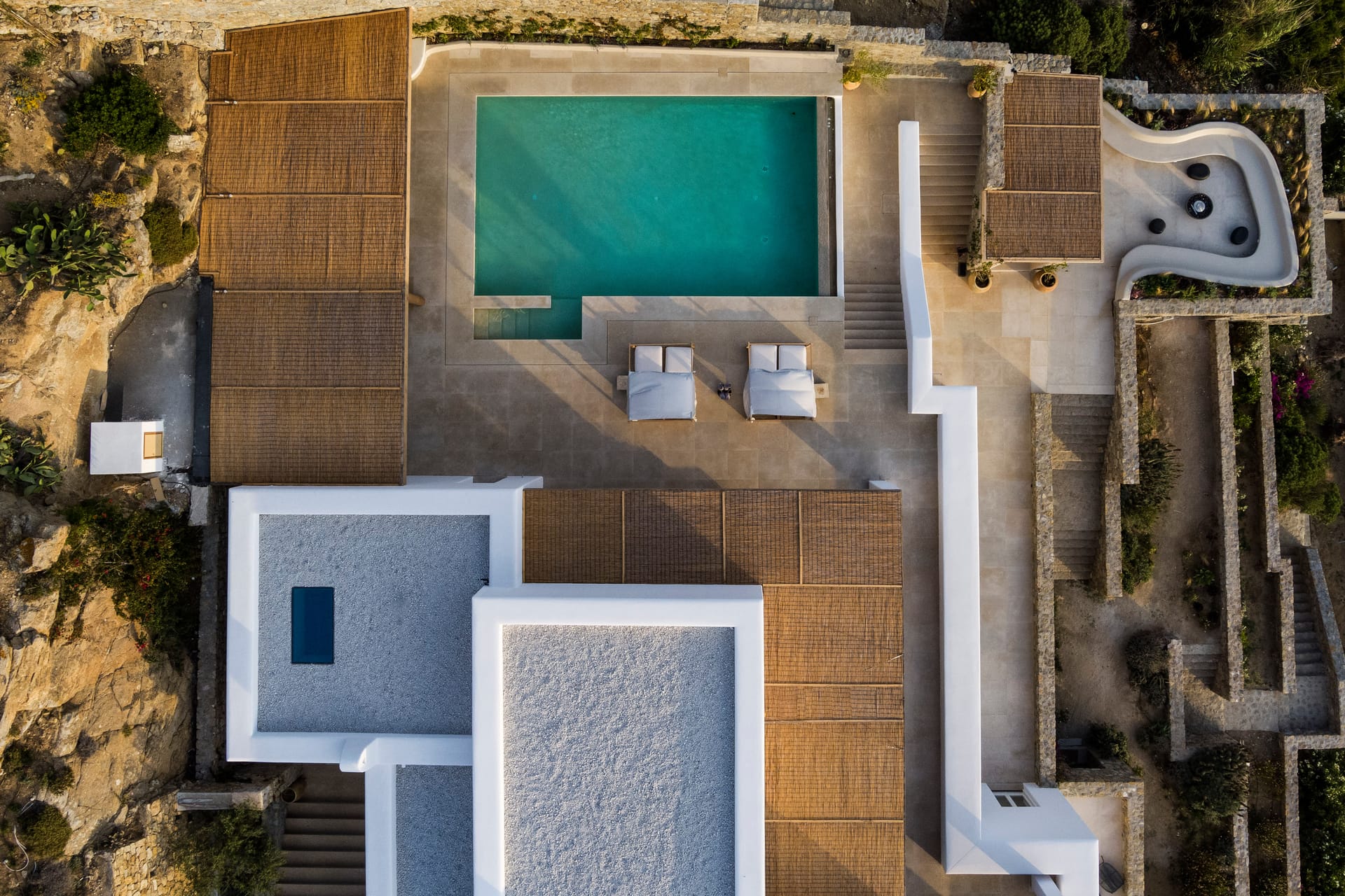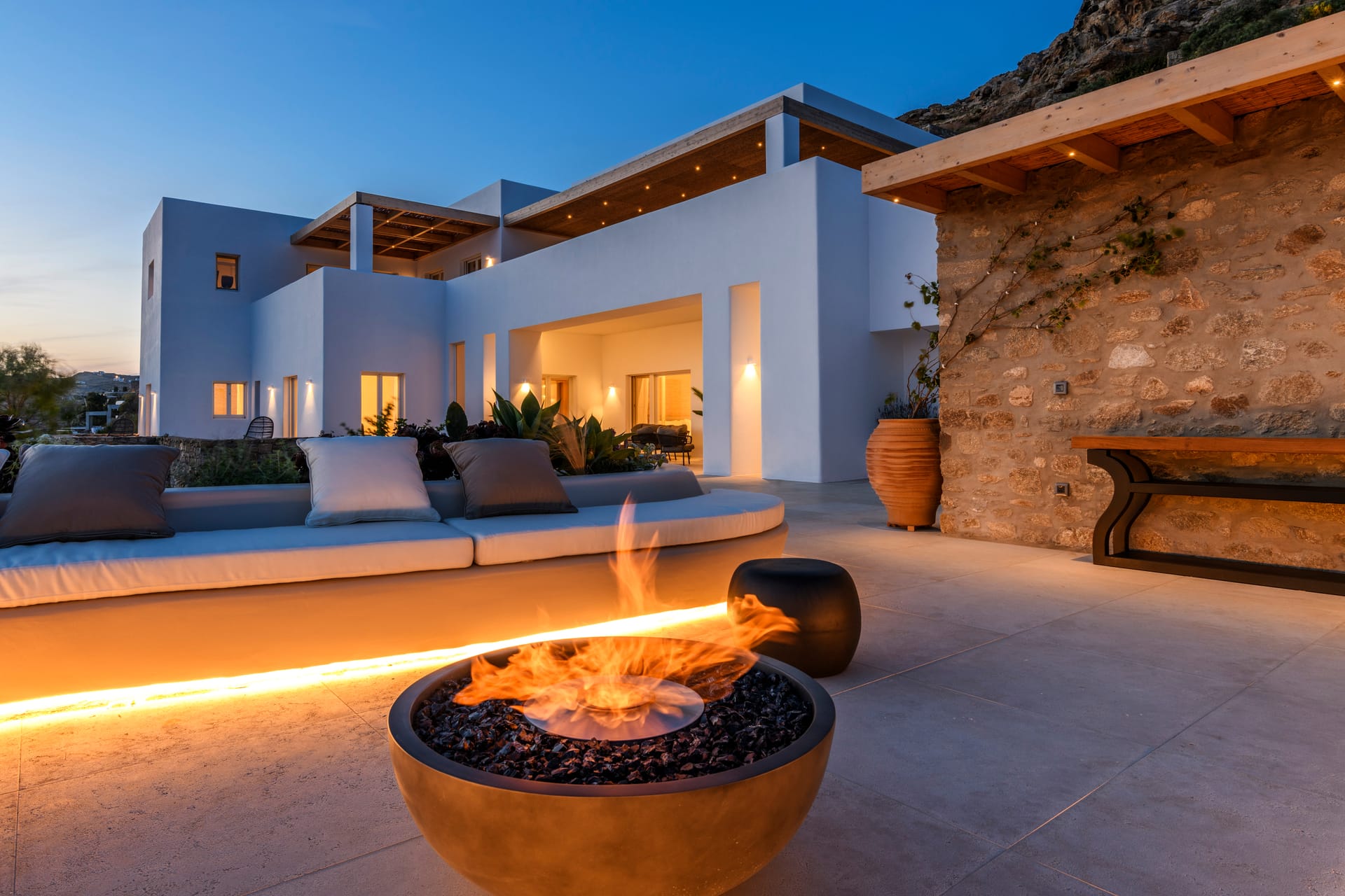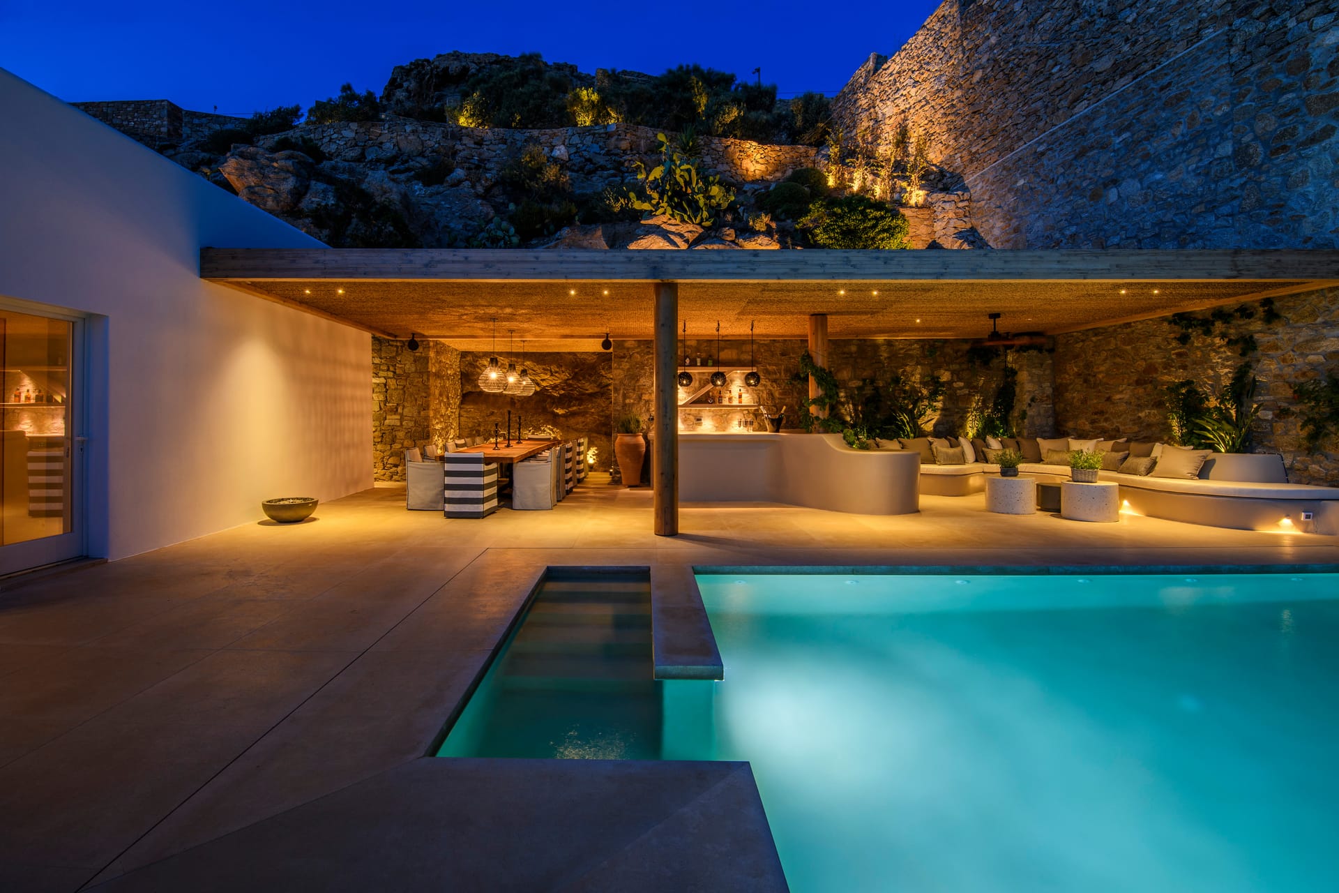 The outdoor areas of this villa truly encapsulate the essence of elegant Mykonian living, harmoniously blending private and shared spaces with striking views of the awe-inspiring sunset or the majestic moon in its various phases. A series of private spaces are thoughtfully dispersed throughout the exterior, offering privacy for guests to unwind.