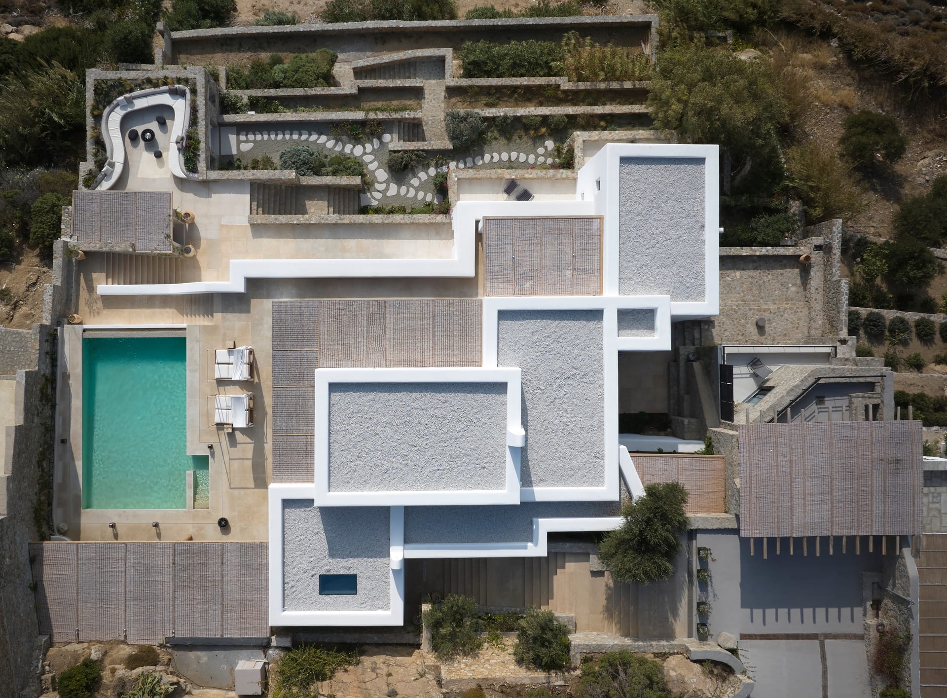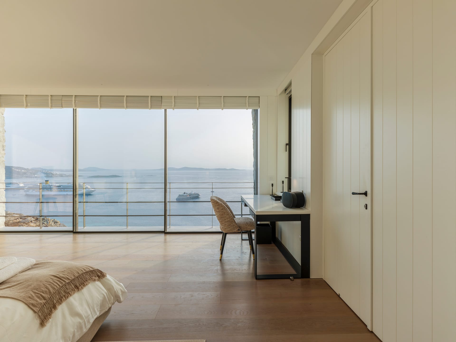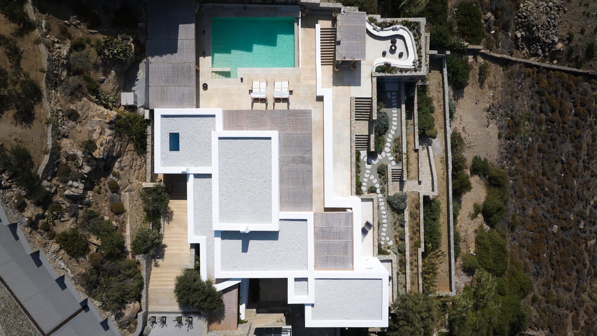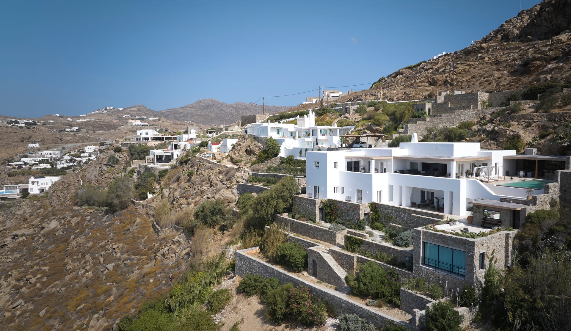 Nestled in the prime locale of Tourlos, Mykonos, a masterpiece villa perches on a picturesque hillside, exuding an aura of timeless elegance and effortless chic. This is Villa Silvy, a luxurious retreat spread over 4.5 acres of pristine Mykonian landscape. The villa, primely located, offers a stunning panoramic view of Mykonos Town, the port and the islands of Delos, Rhenia, Tinos, Syros, and Paros. This unforgettable tableau captivates and enchants, providing uninterrupted vistas of the Aegean Sea. Far from fleeting trends, Silvy stands as a testament to a design ethos that embraces timelessness. The villa is not about being fashionable; it's about creating a space that'll never feel dated, a minimalist delight wrapped in the elements of the Aegean Sea. This approach is evident in every corner of this luxurious abode, a space that embodies the simplicity of a Greek summer while offering the modern comforts of a high-end residence.