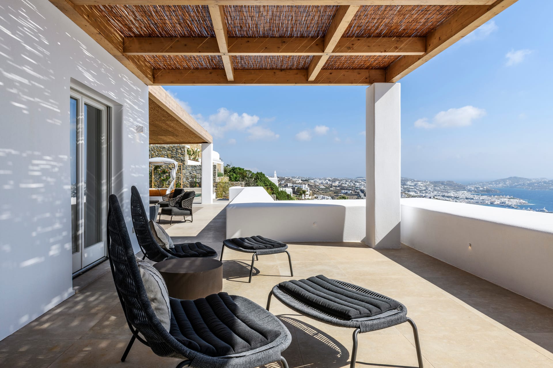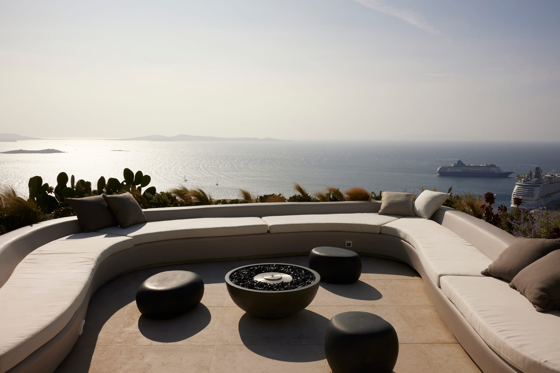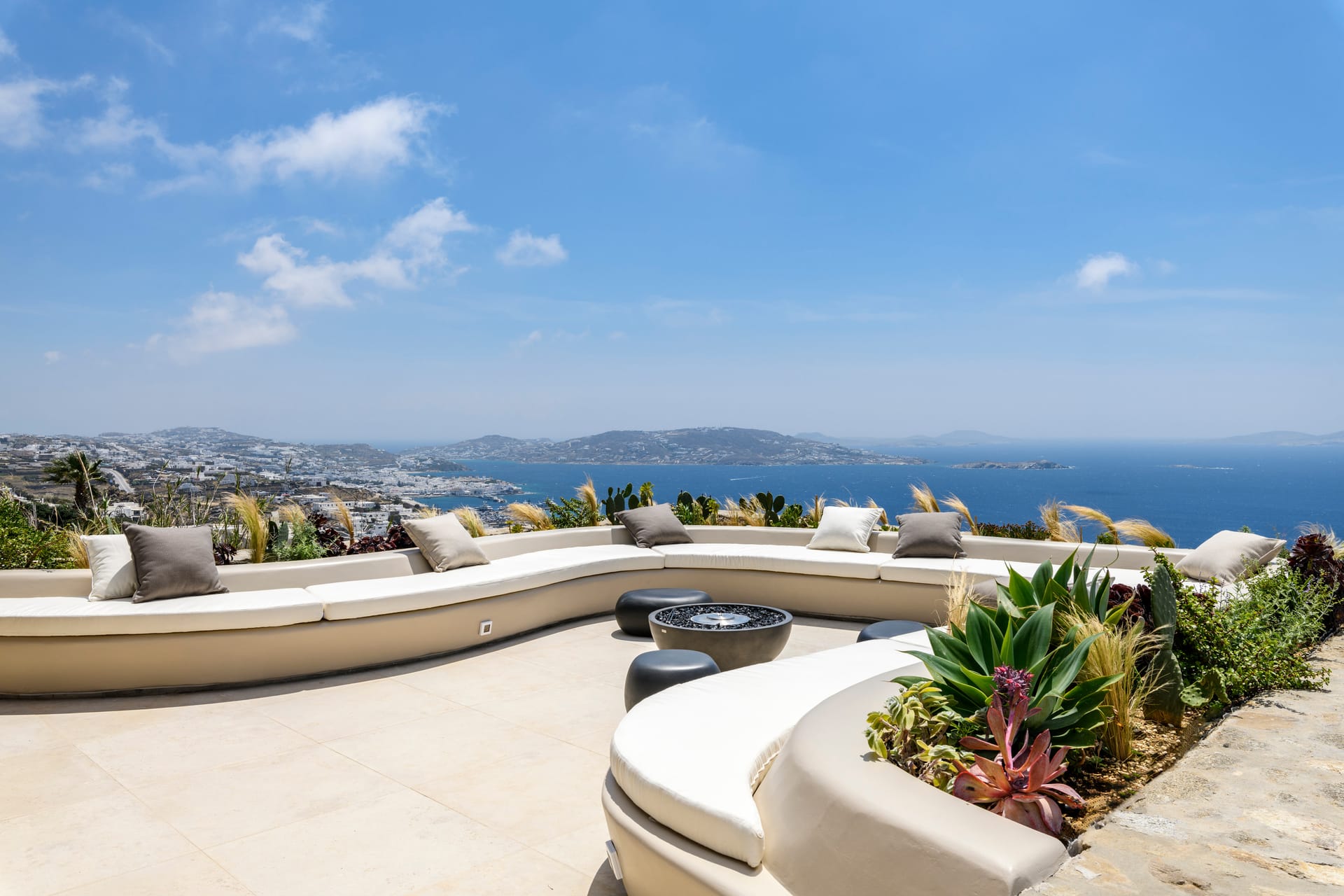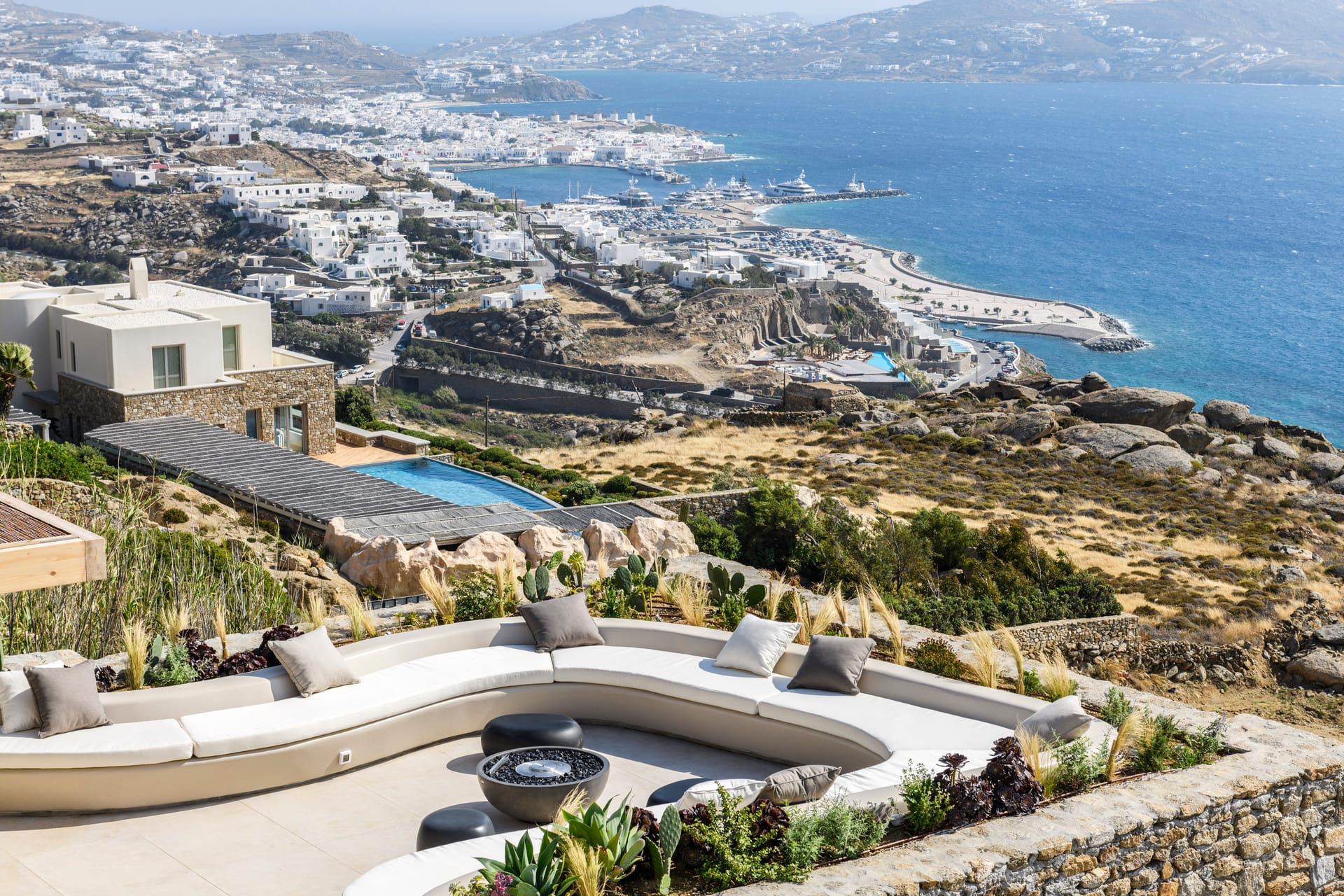 Step outside into the uniquely captivating outdoor spaces of Silvy, thoughtfully designed to offer breathtaking views of Mykonos Town, the port, and the surrounding islands of Delos, Rhenia, Tinos, Syros, and Paros. Seamlessly blending architecture with nature, the transition from the indoors to the outdoors is effortlessly smooth, showcasing the expansive Aegean Sea as the perfect backdrop.