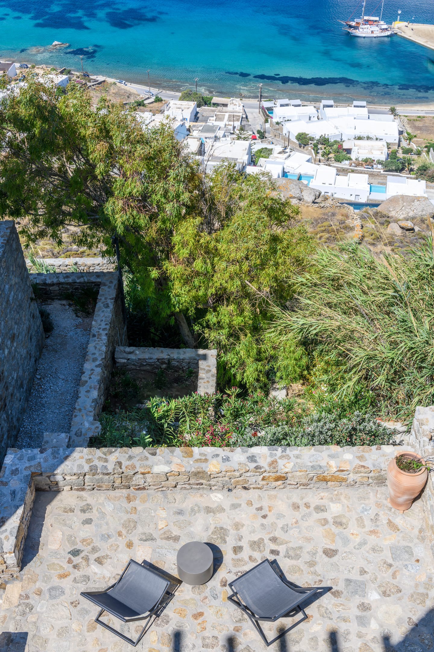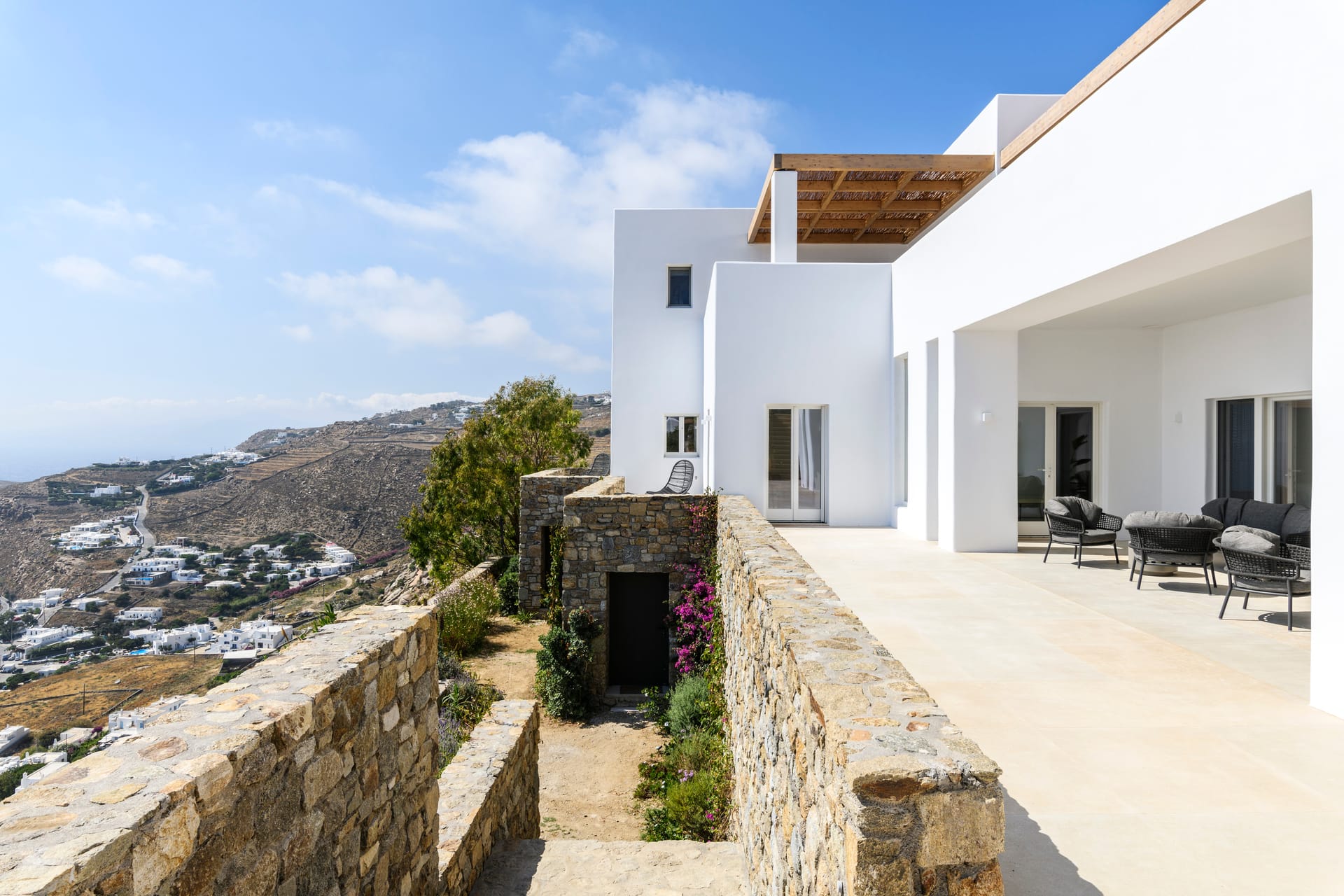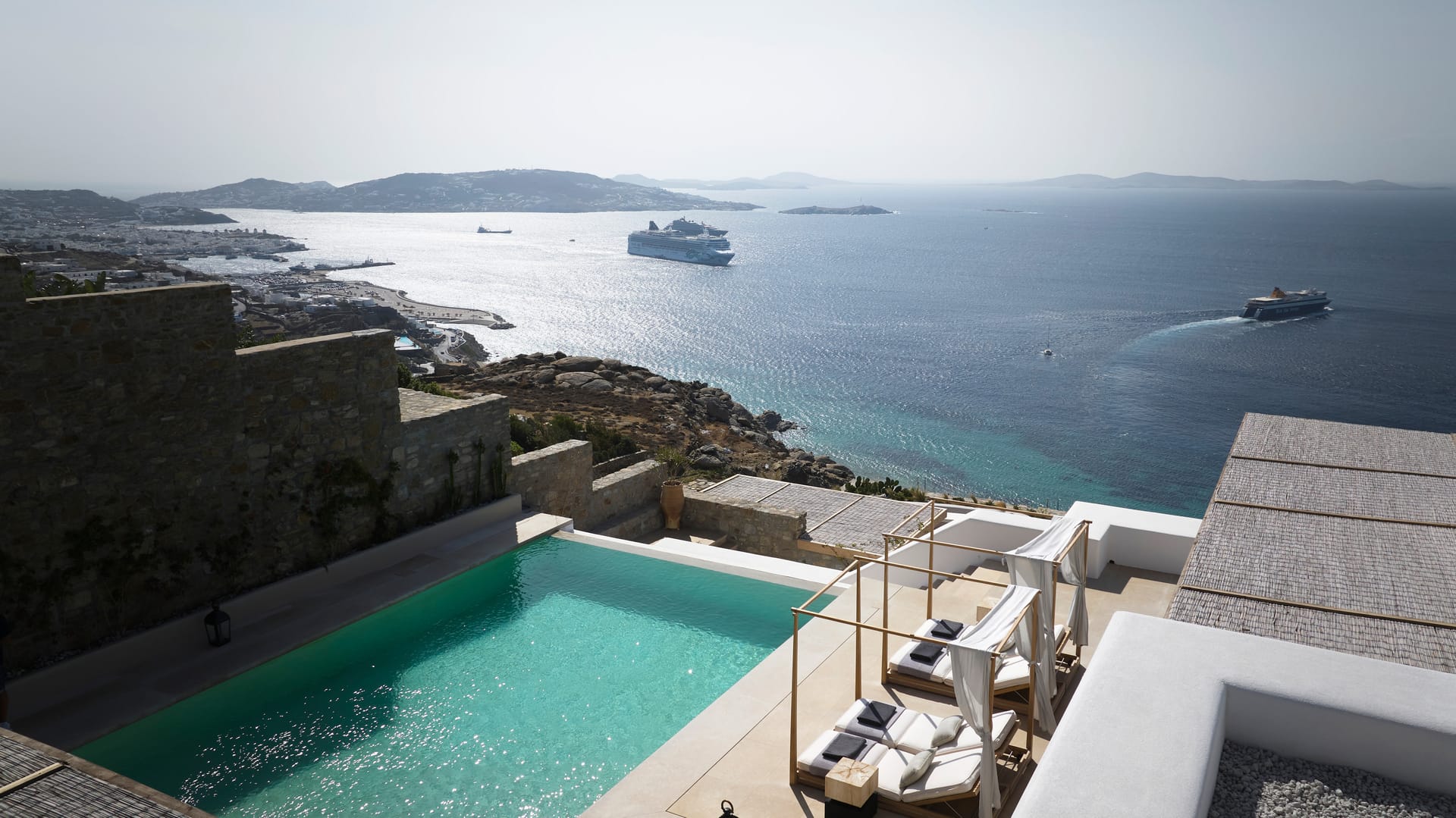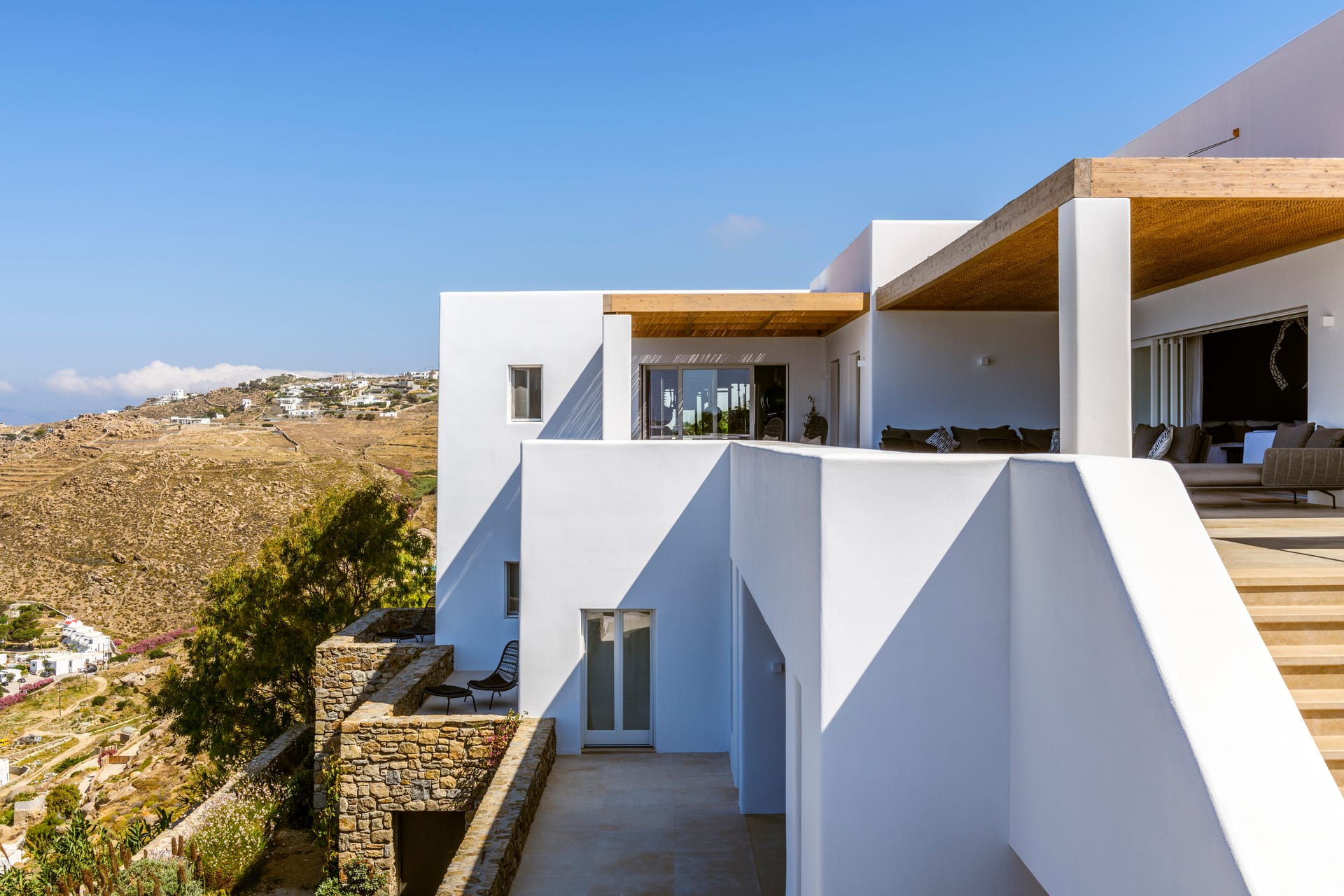 Step outside into the uniquely captivating outdoor spaces of Silvy, thoughtfully designed to offer breathtaking views of Mykonos Town, the port, and the surrounding islands of Delos, Rhenia, Tinos, Syros, and Paros. Seamlessly blending architecture with nature, the transition from the indoors to the outdoors is effortlessly smooth, showcasing the expansive Aegean Sea as the perfect backdrop.