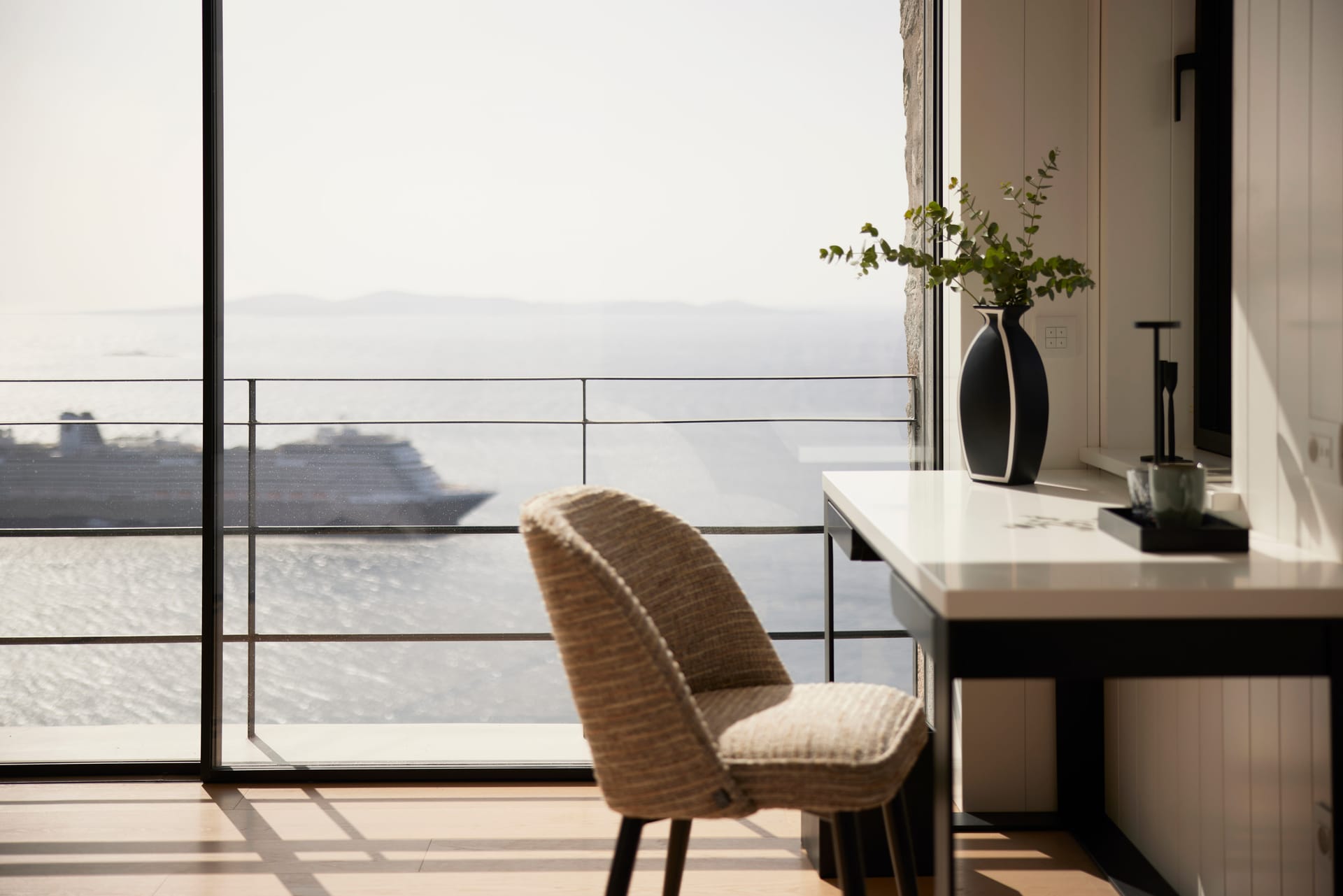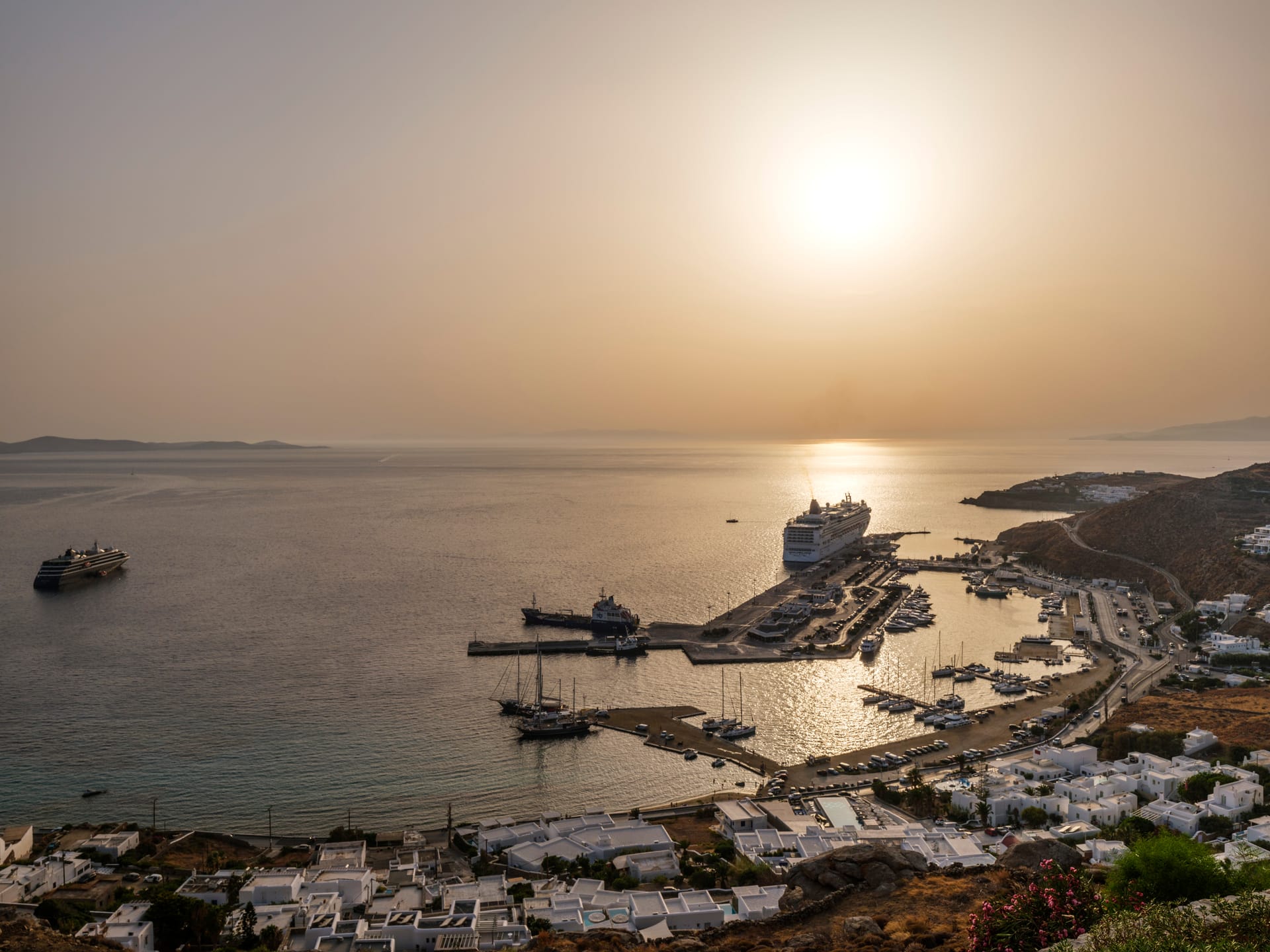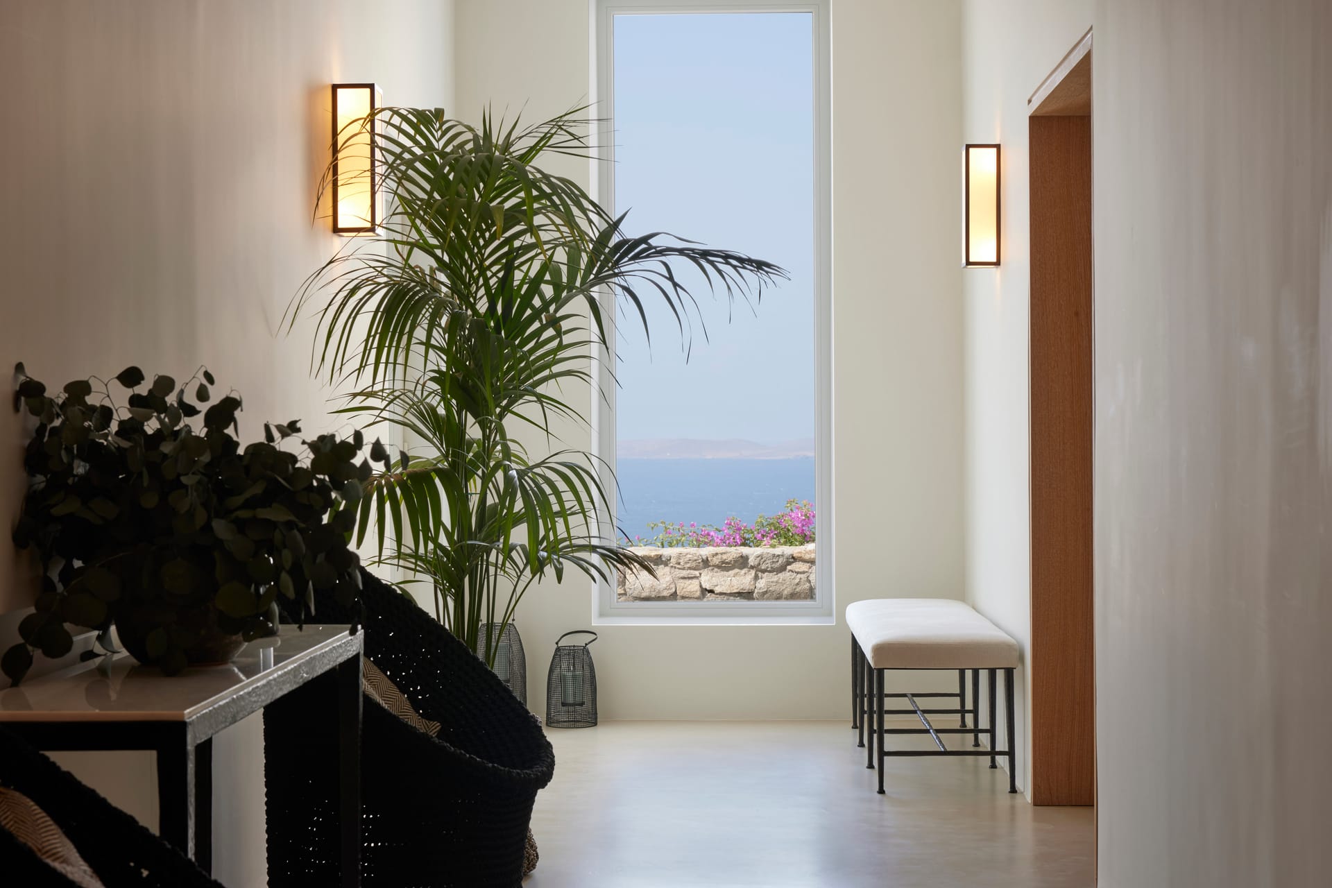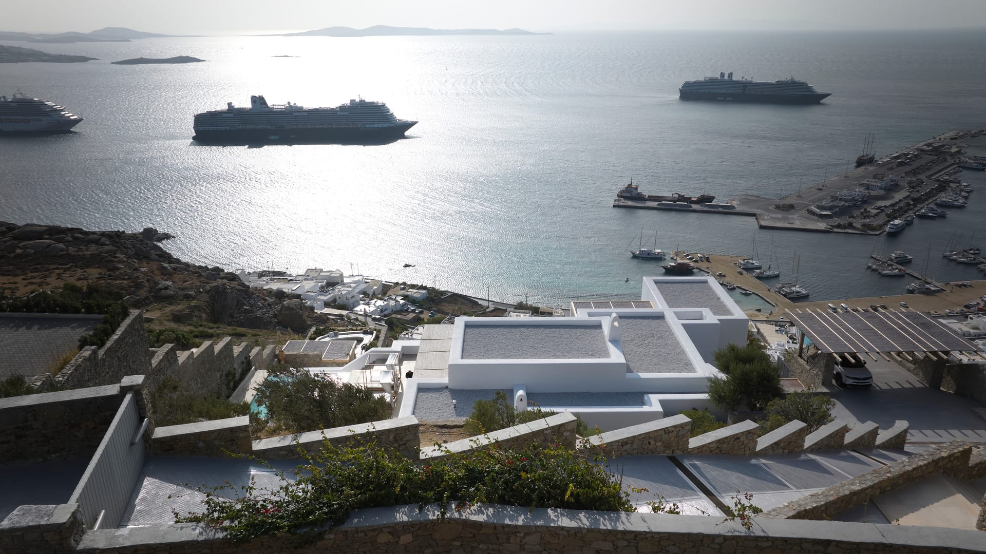 Step outside into the uniquely captivating outdoor spaces of Silvy, thoughtfully designed to offer breathtaking views of Mykonos Town, the port, and the surrounding islands of Delos, Rhenia, Tinos, Syros, and Paros. Seamlessly blending architecture with nature, the transition from the indoors to the outdoors is effortlessly smooth, showcasing the expansive Aegean Sea as the perfect backdrop.