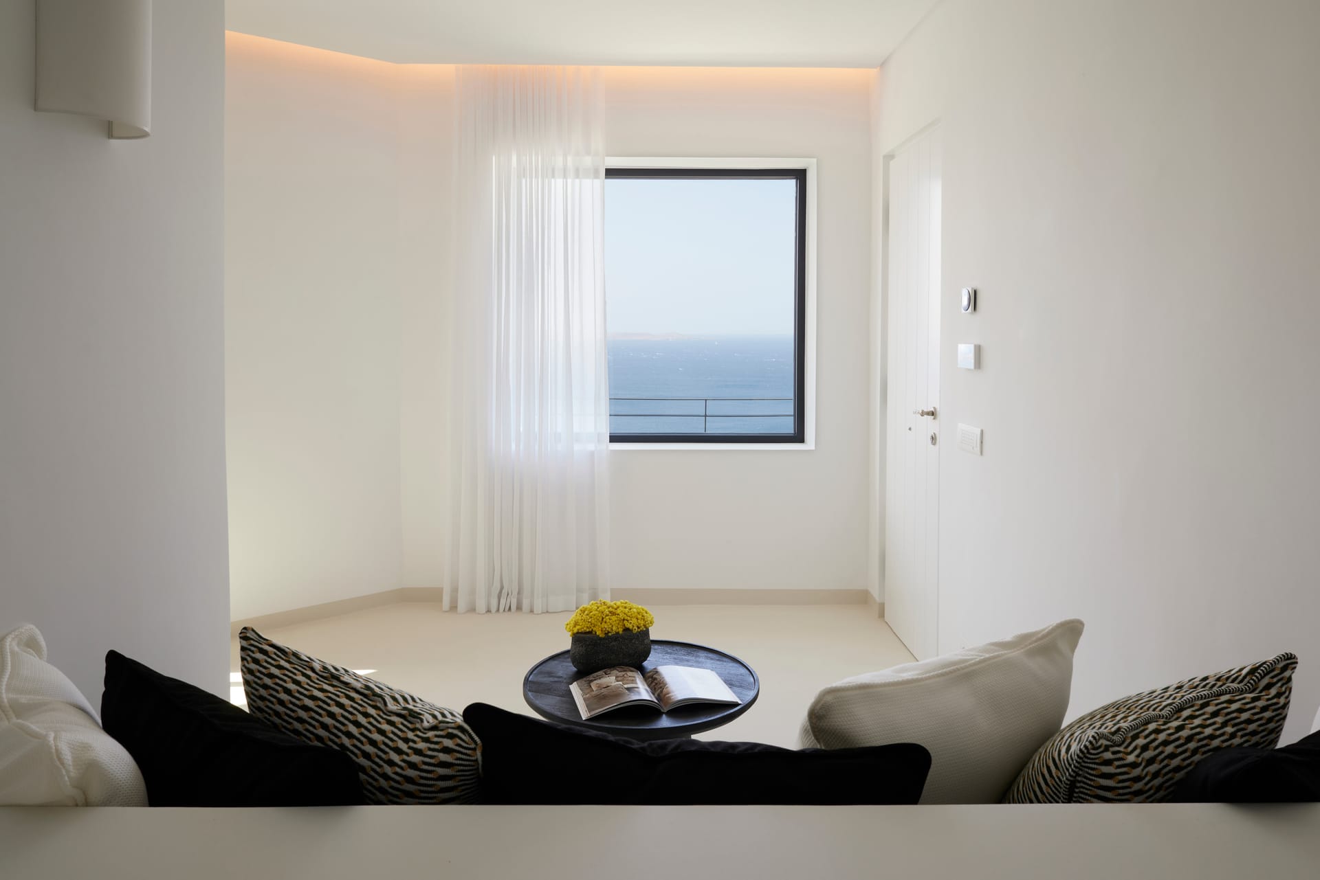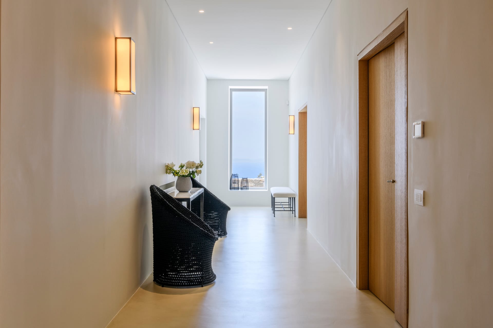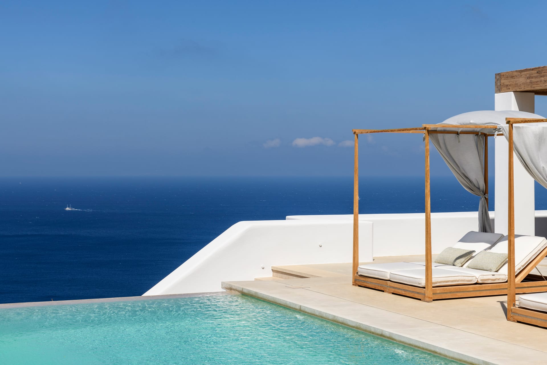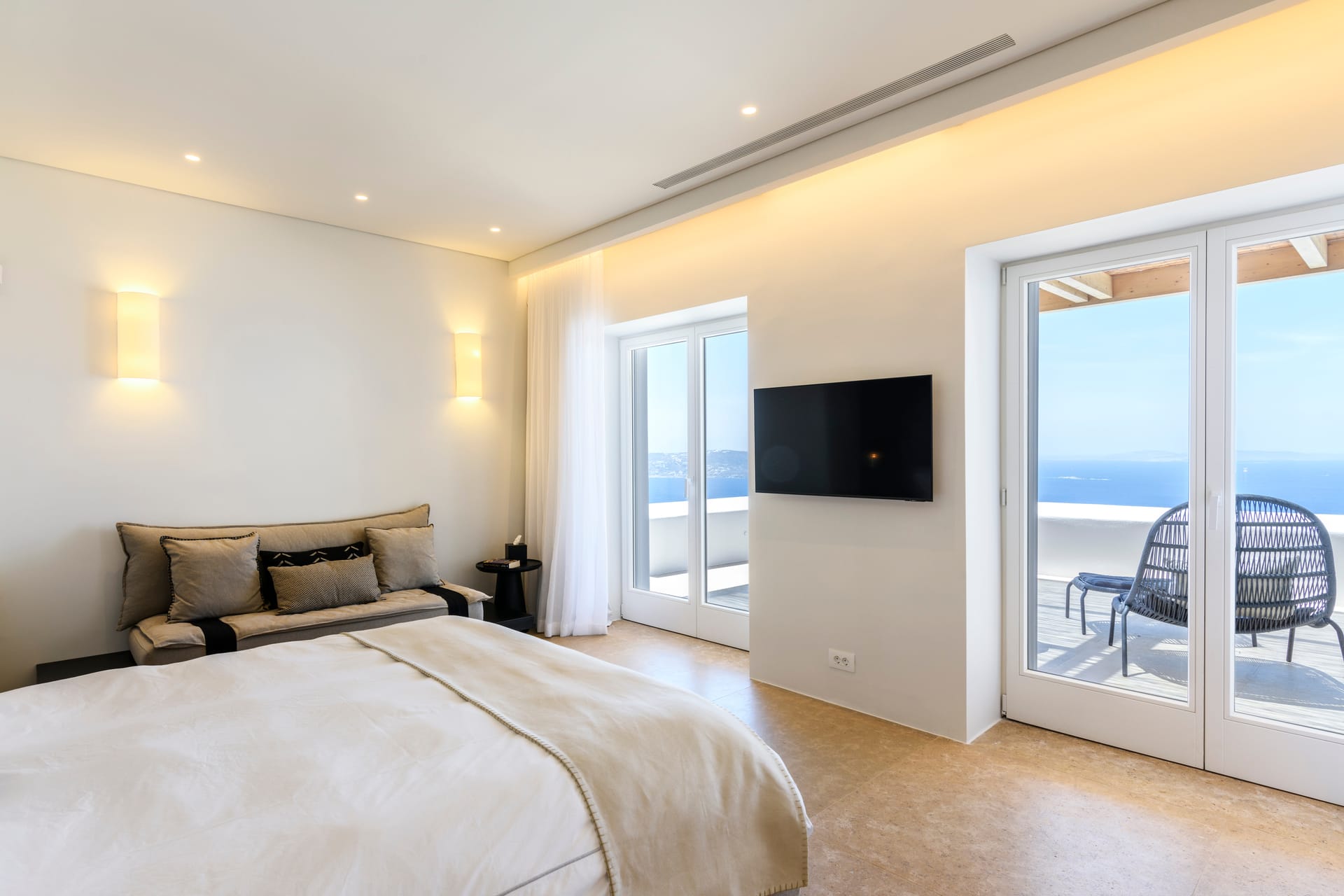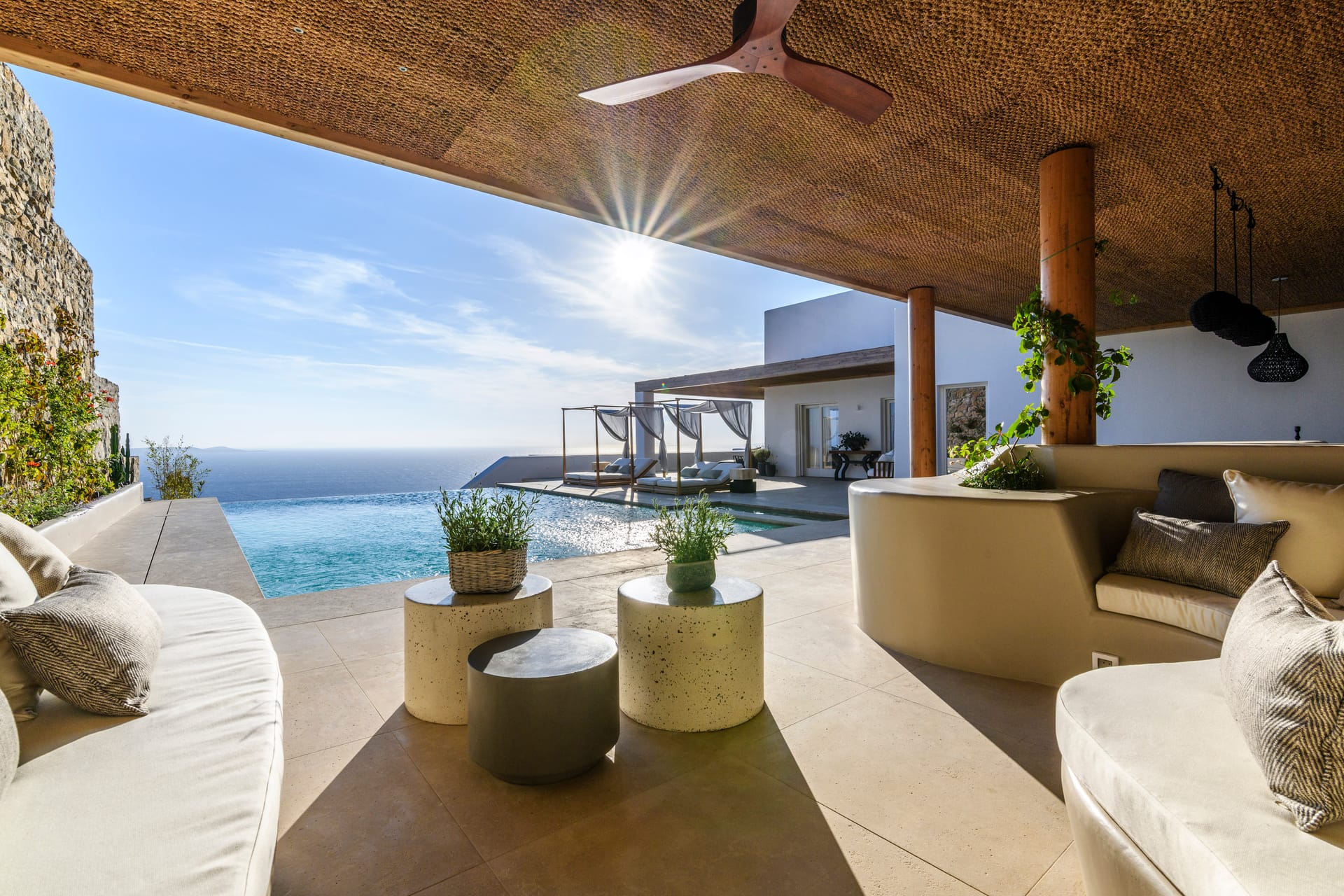 The outdoor area's centerpiece, a pristine infinity pool, extends seemingly into the horizon, crafting an illusion of oneness with the mesmerizing Aegean Sea. This vista becomes a dynamic piece of art, changing with the time of day and the mood of the sea.