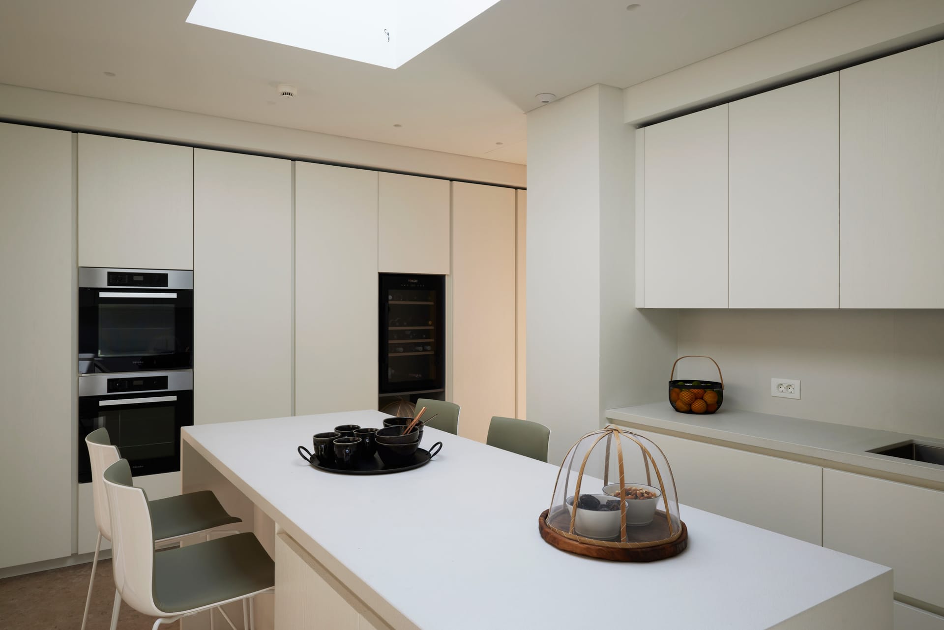 The heart of this magnificent villa beats in its kitchen, an ode to both functionality and aesthetic brilliance. The design features thoughtfully chosen accents, demonstrating a harmonious blend of form and function. The skylight, a testament to architectural creativity, bathes the space in abundant natural light, fostering a warm and inviting atmosphere that will inspire culinary masterpieces.