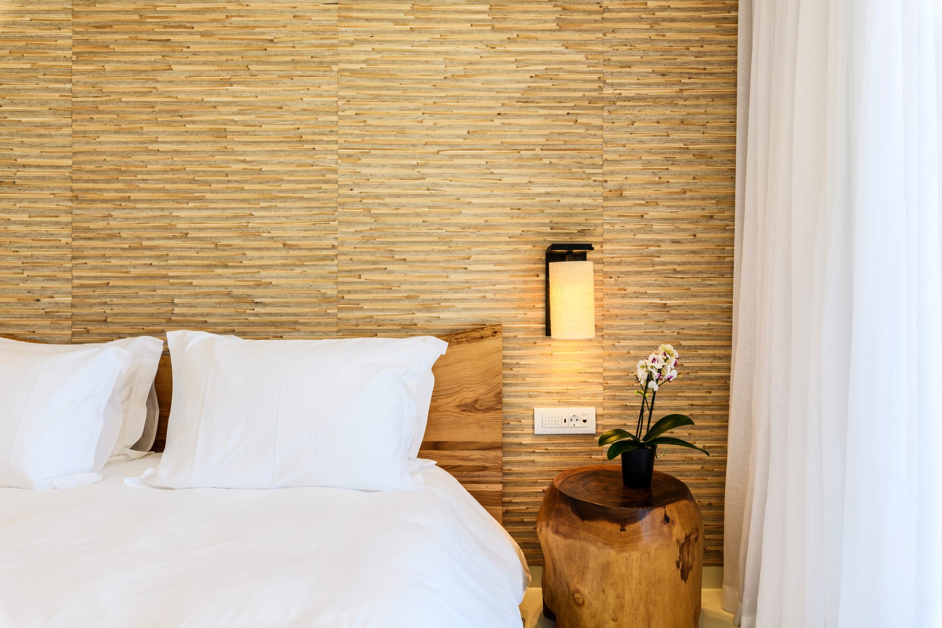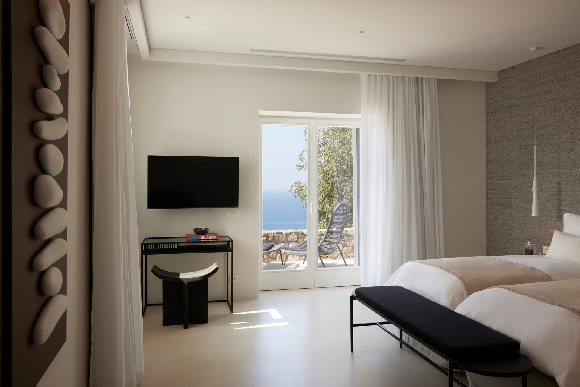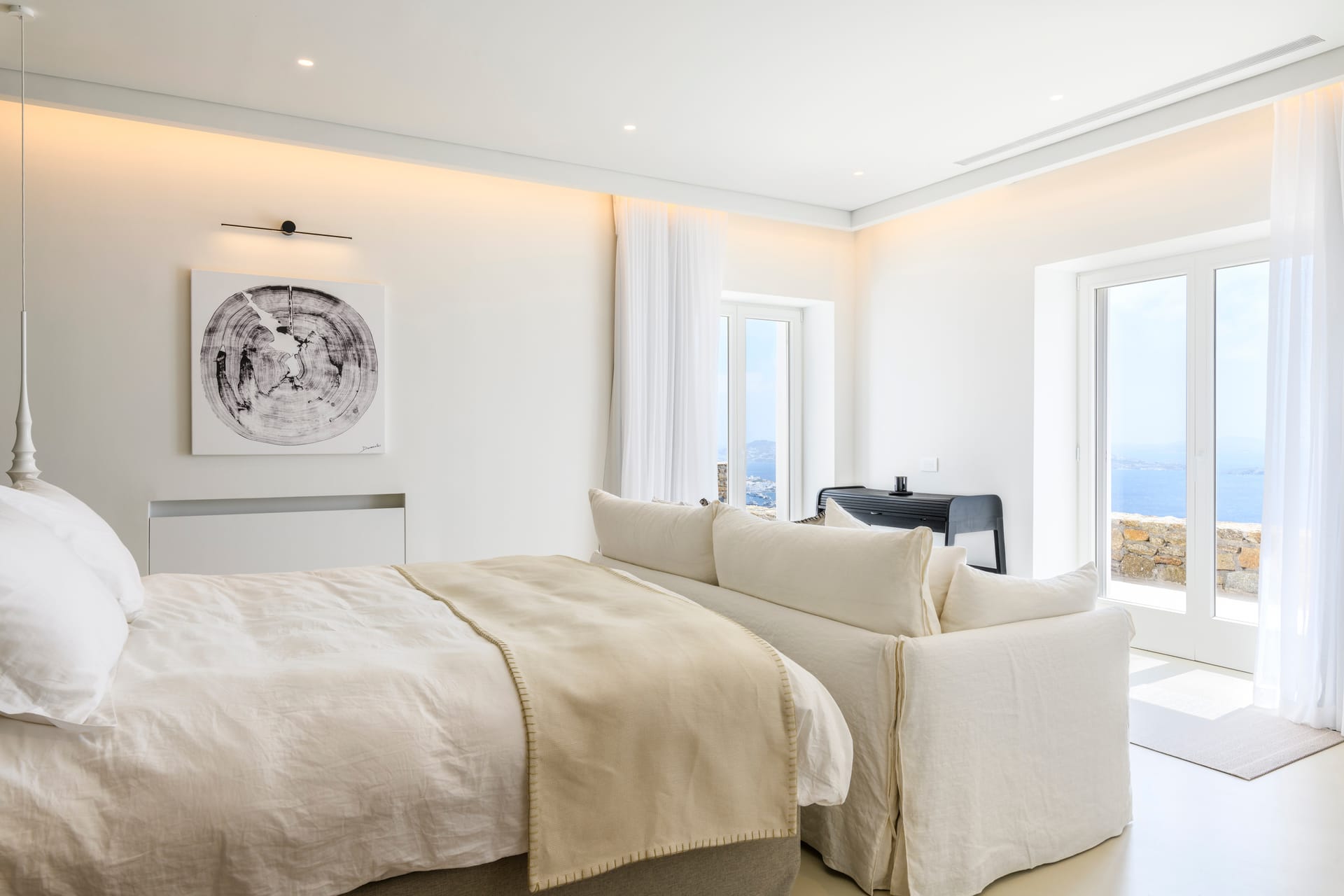 The design team has interwoven Cycladic architectural elements into Silvy's DNA, creating a tasteful mélange that stands as a homage to Mykonos' unique natural landscape. The villa's walls, painted in pristine white, are contrasted perfectly with warm natural tones, forming an intimate, luxurious Mykonian setting. The color palette resonates with the natural landscape, featuring hues of earth and sea, harmonizing the indoors with the outdoors, and forming an interconnected, organic living experience. Eight elegantly and spacious appointed en-suite bedrooms await at the heart of the villa, each a serene cocoon of tranquility. The contemporary bespoke pieces of furniture provide a touch of modern sophistication, perfectly complementing the timeless ambiance. The rooms are adorned with carefully selected objet d'art, each piece reflecting a keen artistic eye. Their timeless beauty enhances the villa's minimalist aesthetic, embodying the same relaxed elegance that defines Mykonos itself. Soft textures, organic linens, and sculptural shapes complete the scene, adding to the sense of serene luxury that pervades every corner of this extraordinary property.