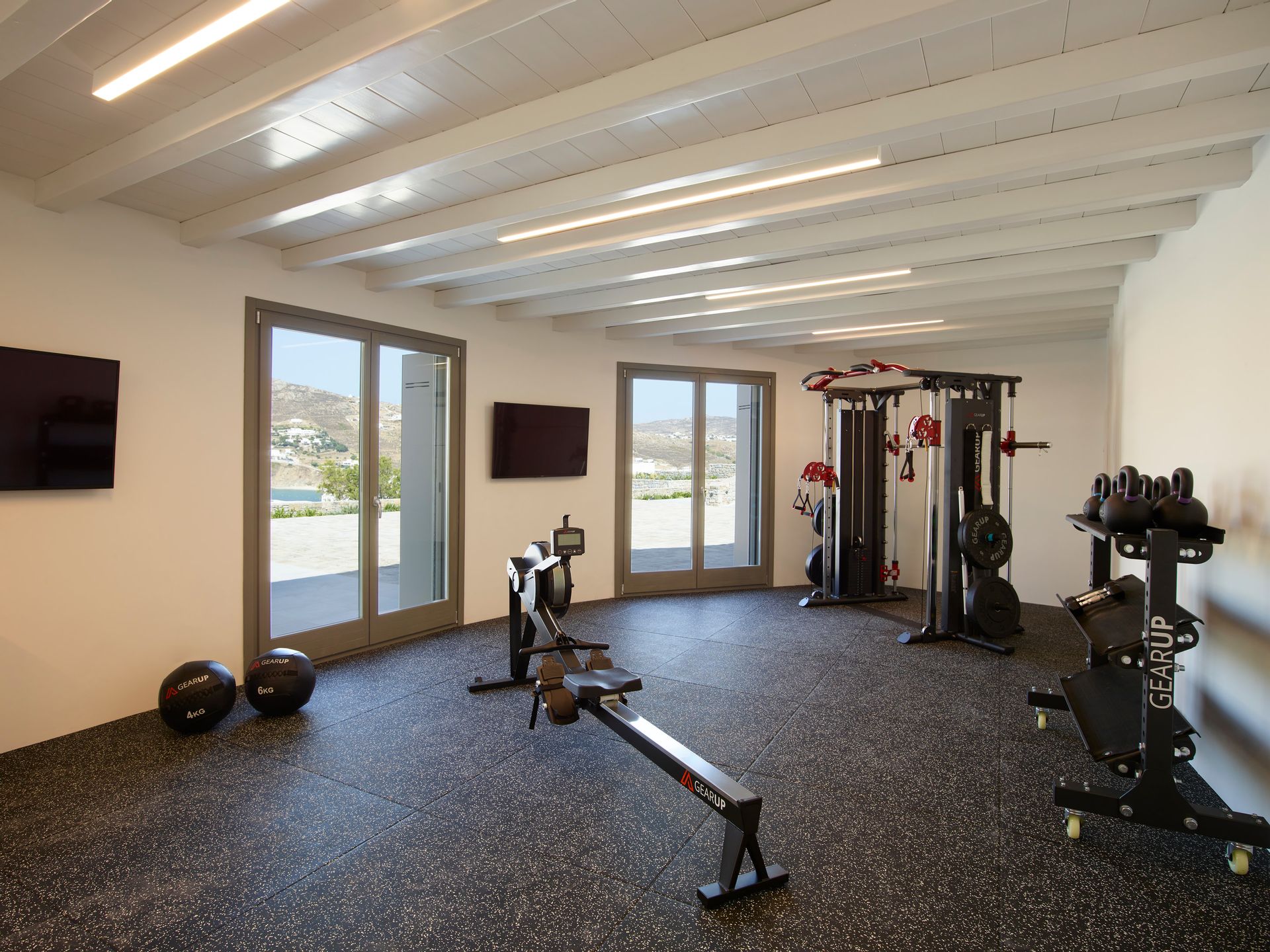- fully equipped with 1 treadmill, 2 steady bicycles, 1 rowing machine, fitness dumbbells, TRX equipment and gym mats