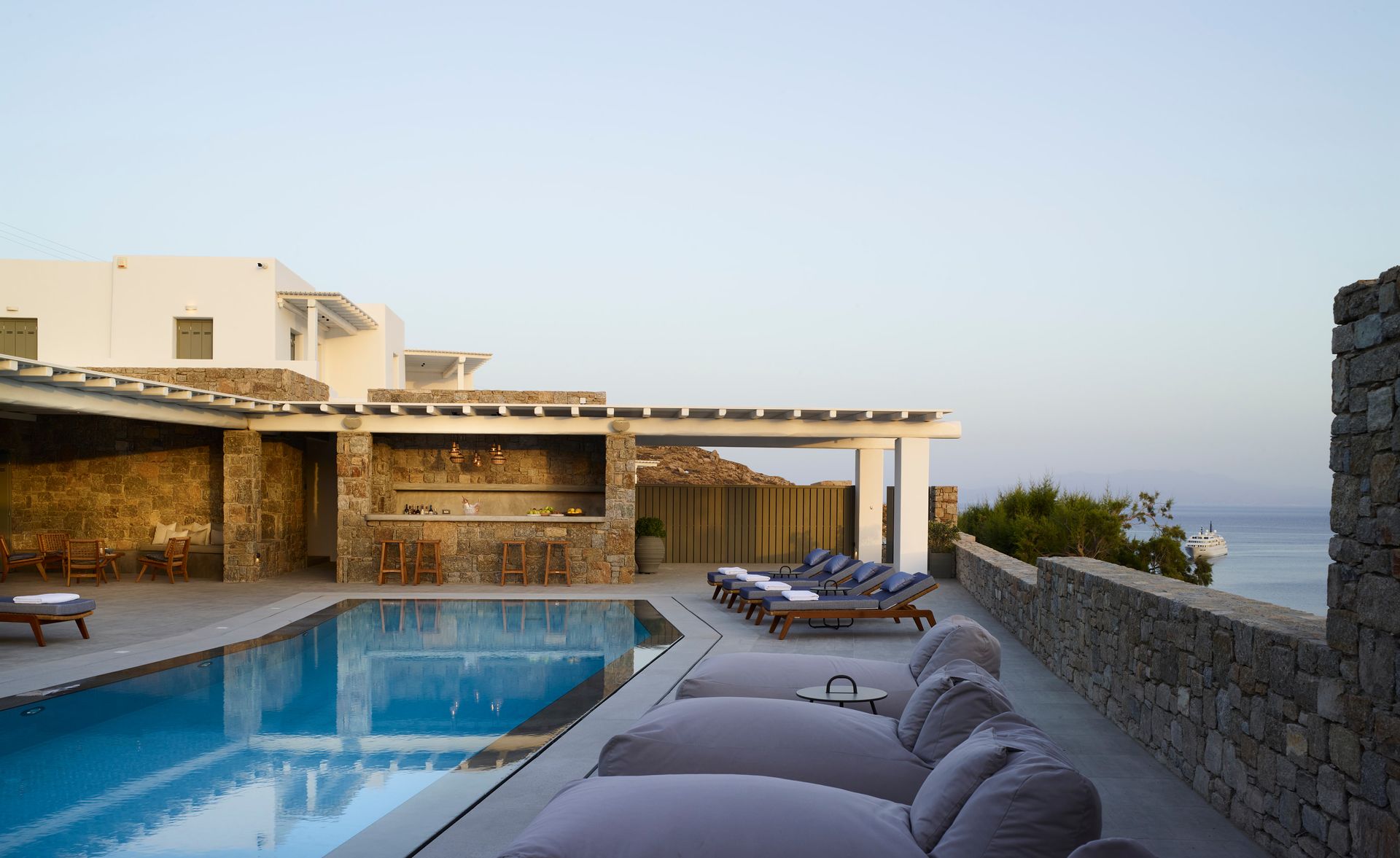 Blue Pearl Villa is the ideal holiday resort to house family groups in the most comfortable way. This astonished estate is built on top of the sea in walking distance 1-3 minutes, from the seaside and the most beautiful beaches of Kalo Livadi Mykonos with a magnificent sea view.