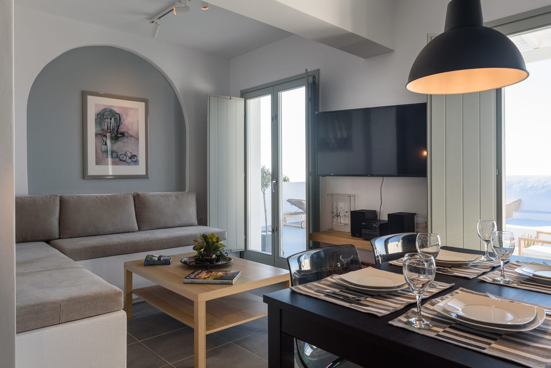 - Large living room with fireplace, 55’ Android TV, air condition, Wi-Fi, amazing sea view to Kalafatis beach and access to the outdoor shaded sitting area via balcony doors