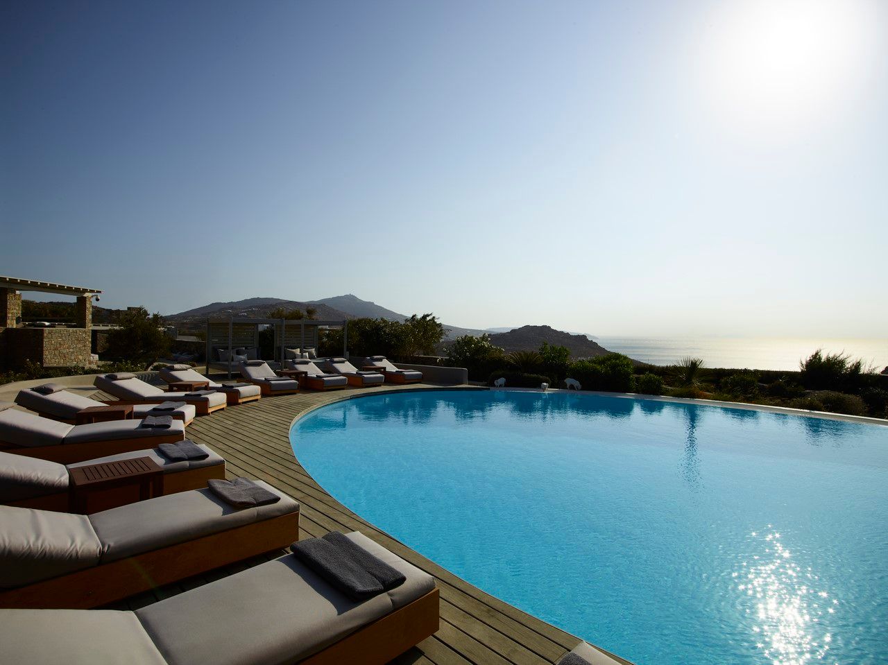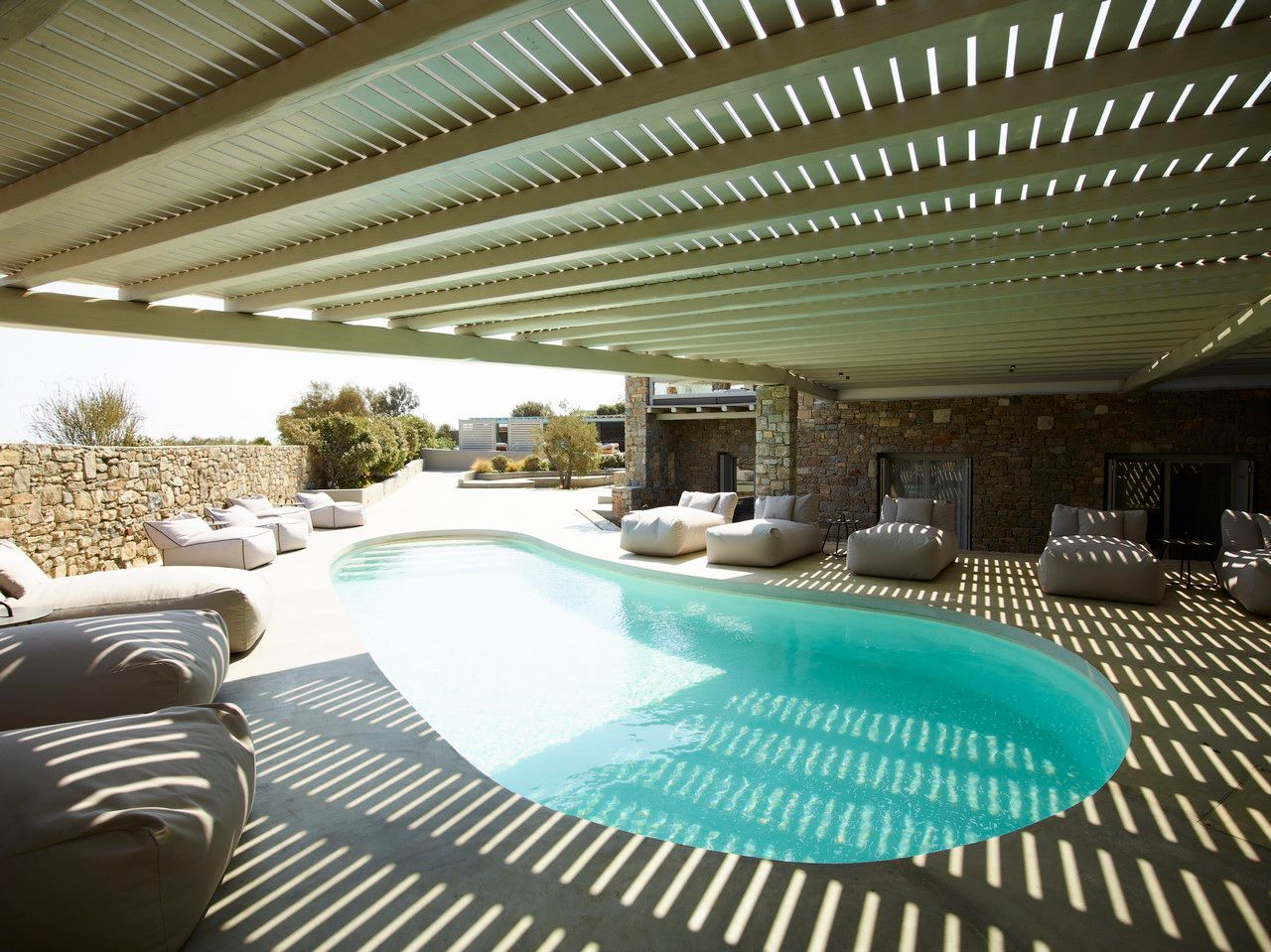 - 2 Large infinity swimming pools of 100 and 50 sqm with deck and amazing view to Kalafatis beach, 24 sunbeds and poufs, 3 double sunbeds, and 1 large hammock while a massive corner pergola offers lavishly the shadow that guests are enjoying in front of swimming pool, the bar and the dining area and another pergola specially designed for quitter moments surrounded by olive trees.