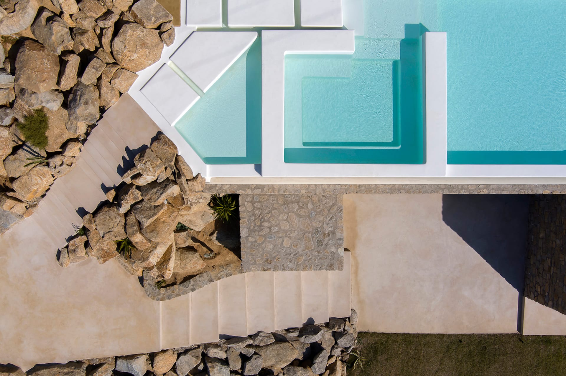 Expansive interiors span 840 square meters, offering generous open-concept living spaces bathed in natural light. Floor-to-ceiling windows reveal uninterrupted sea views, while multiple lounge areas—both indoors and outdoors—encourage relaxation and connection with the surroundings. A unique cave lounge provides an atmospheric retreat, ideal for enjoying the island’s dramatic sunsets.