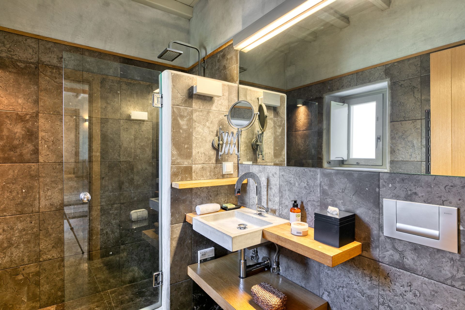 The flagship suite is called the “keli”. It was originally a modest stone shelter built for shepherds and has been enlarged and transformed into a fabulous 3 room suite of 120 m2. All the balcony doors are able to be opened from inside and out allowing a great flow in the space. Once you park your car at the entrance pergola, you enter from the principle balcony door into the living room with a wood burning fireplace. To the right is the guest WC and a sleek pantry and bar counter. To the left is the double bedroom and beyond that a vast bathroom with brushed marble WC and shower stalls, 2 large vanities with basins with huge counter space and 2 spacious open closets. There is also a large white Boffi bathtub with views onto the terrace. The terrace has sunbathing areas and a shaded pergola for outdoor dining. The keli sleeps two.