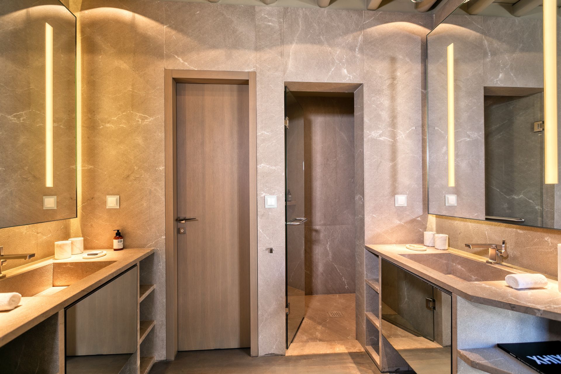 Next door to Suites 1 & 2 are Suites 3 and 4. You enter through a courtyard, which can be shared by Suites 1 & 2, with a delightful dining area and icemaker. You enter into Suites 3 and 4 through a living area with a sofa and table plus a full pantry with hob, food warming drawer and a half refrigerator. To the left is Suite 3 at 48 m2 which boasts a sunny double bedroom with a wide marble desk and spacious bathroom with twin marble sinks and vanities and WC and shower stalls and spacious hanging closets.