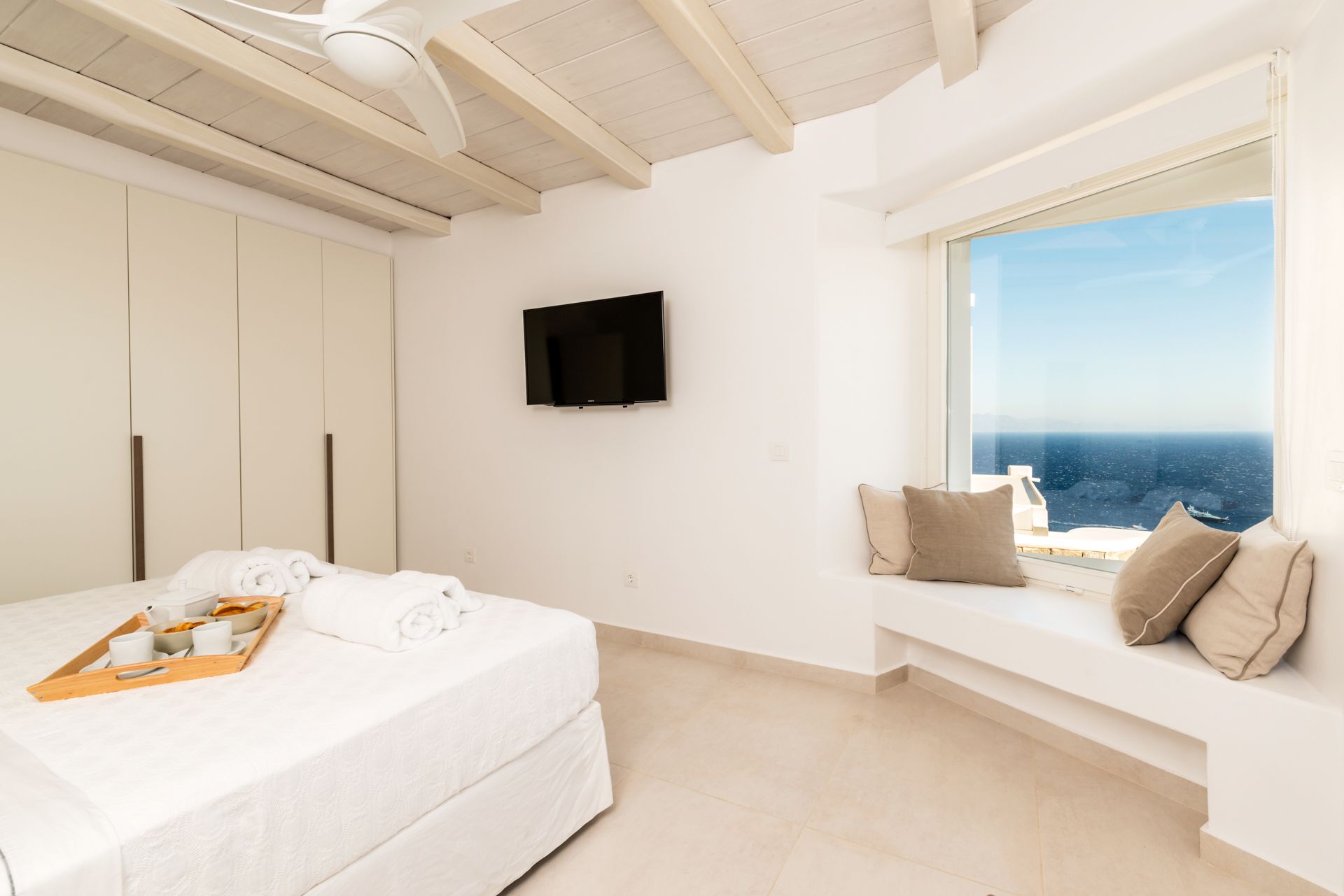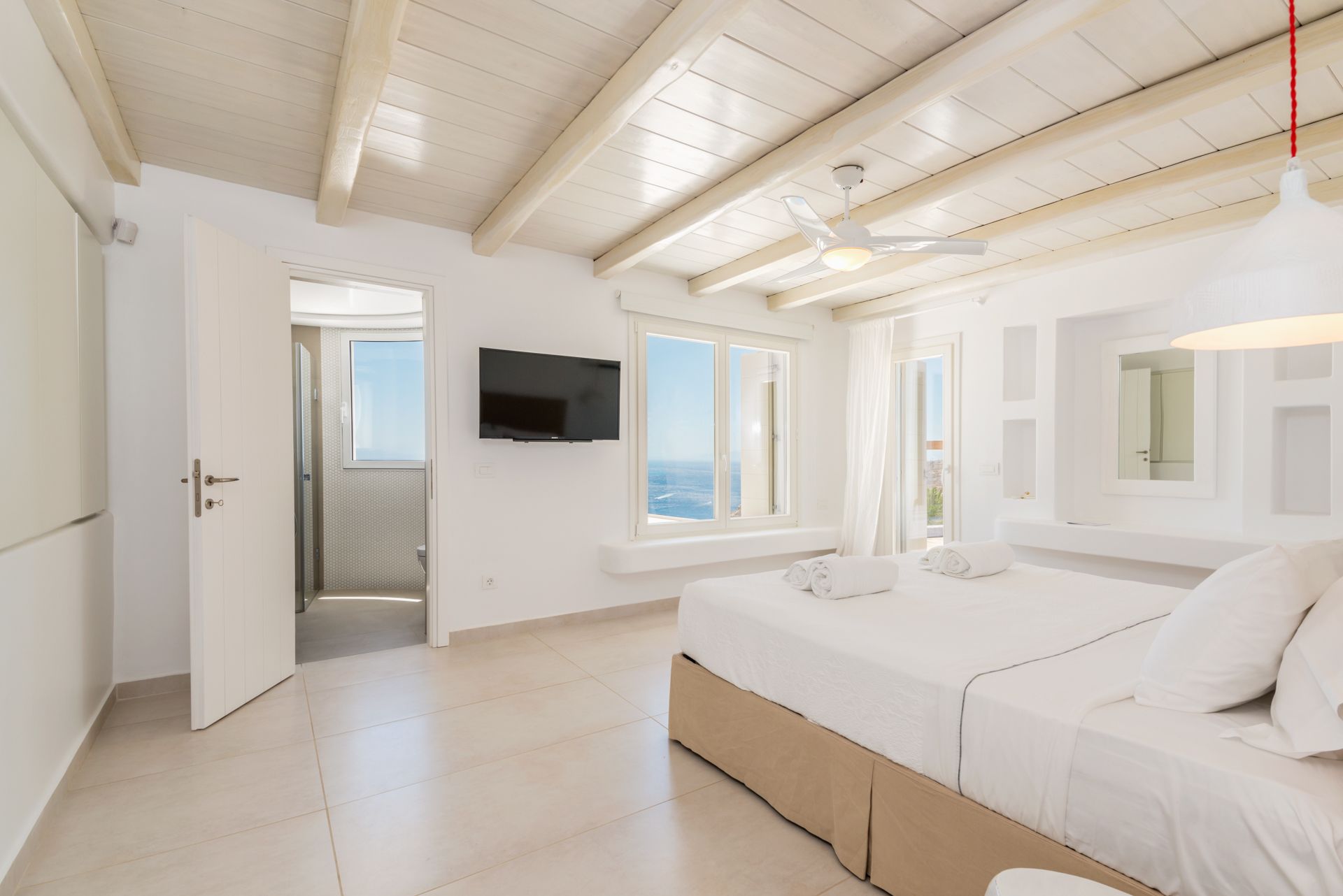The upper level of the Eleanor Villa sports three sumptuously appointed master bedrooms with en-suite bathrooms, their own A/C and TV and incredible sea views. One of the master bedrooms also has a walk in closet. There is moreover a fourth, luxuriously laid out double bedroom with a separate private bathroom, as well as its own A/C and TV.