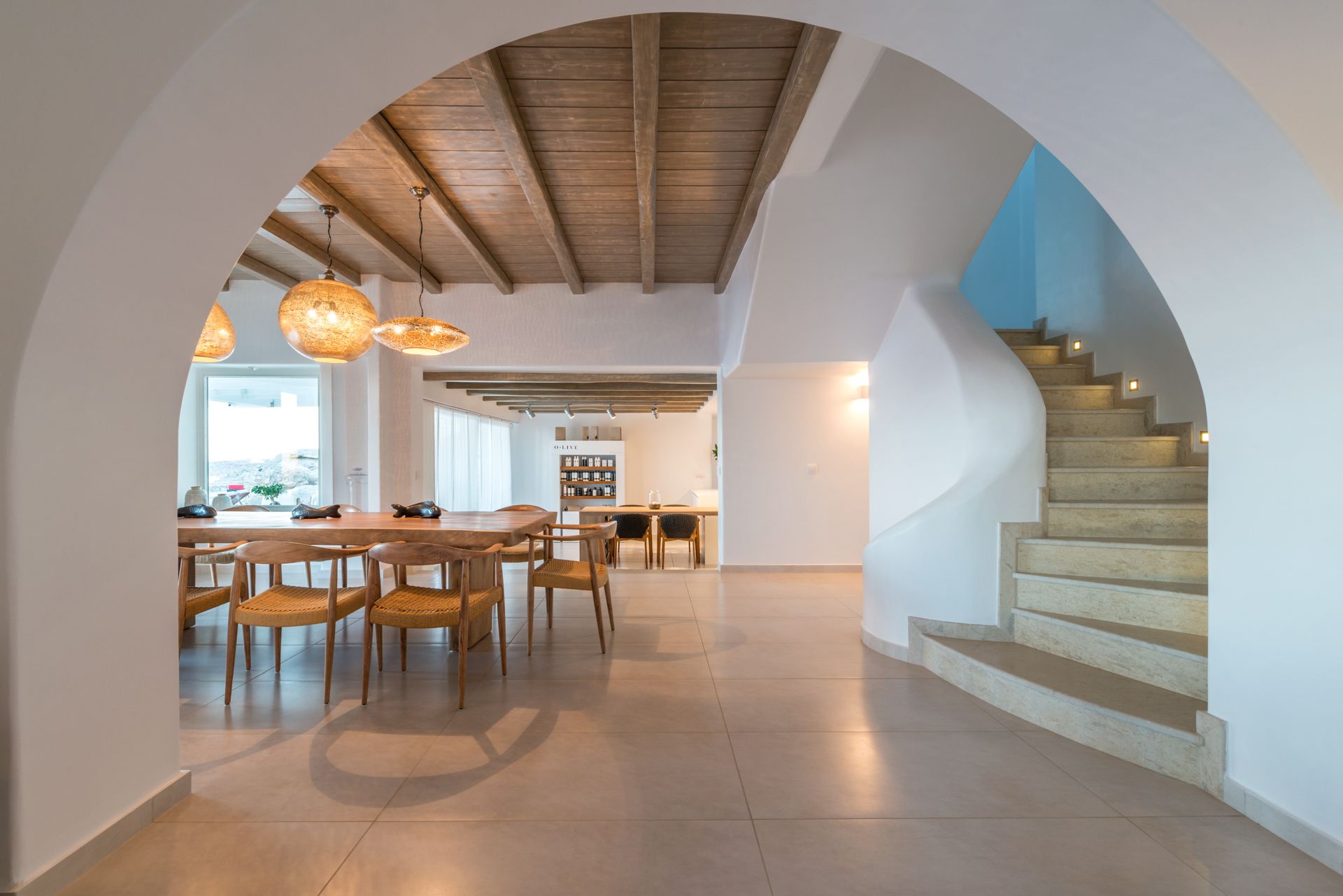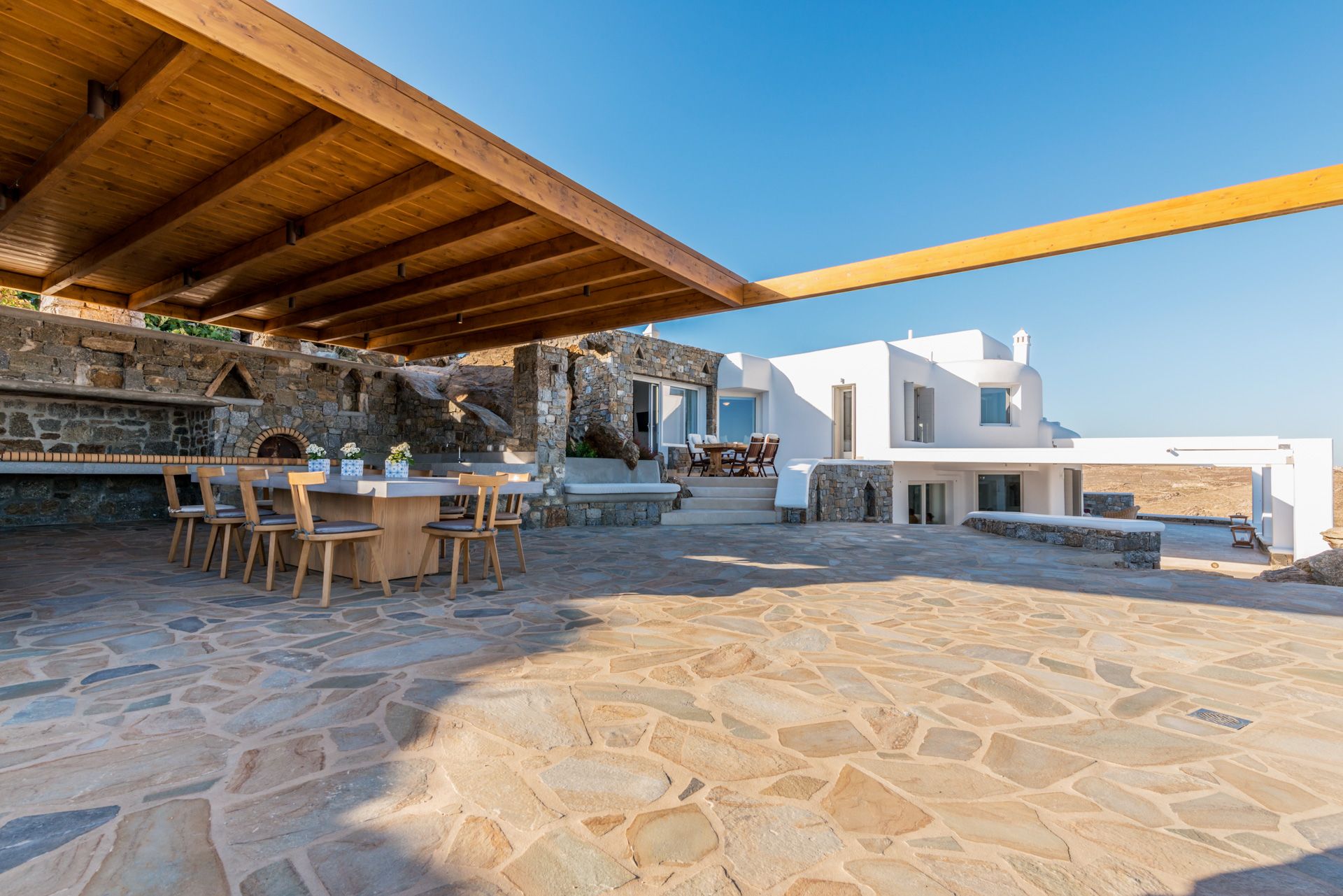 Perched above the cosmopolitan, boho chic Elia beach, the Eleanor Villa affords a to die for 360o panorama of the Aegean Sea and the cerulean sky stretching infinitely beyond, along with mesmerizing sunsets views. Paying tribute to the local vernacular architecture, the villa’s vast 600 sqm, are seamlessly integrated into the surroundings, whilst are lavishly appointed with state of the art features and amenities. Natural materials -stone, wood, marble, wicker and linen- have been extensively used throughout the Eleanor Luxury Villa, setting the tone in the interior and exterior grounds. Expansive, ample openings ensure the unobstructed flow of light, while designer furniture, original artwork and one off pieces complement the picture. At the Eleanor Villa, haute but unpretentious aesthetic blends with utmost privacy and maximum luxury to create an enticing environment for total relaxation, pampering and indulgence.