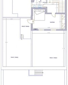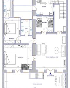 - Size ----Spacious 250.00m2 (or 2,700 f2). Two Floors, sleeps 9 persons 4 bedrooms-3 baths, living room, fully equipped kitchen, 2 terraces with dining –relaxing areas. Biggest house in Mykonos town. Very quiet (sound proof windows). A/C all areas.